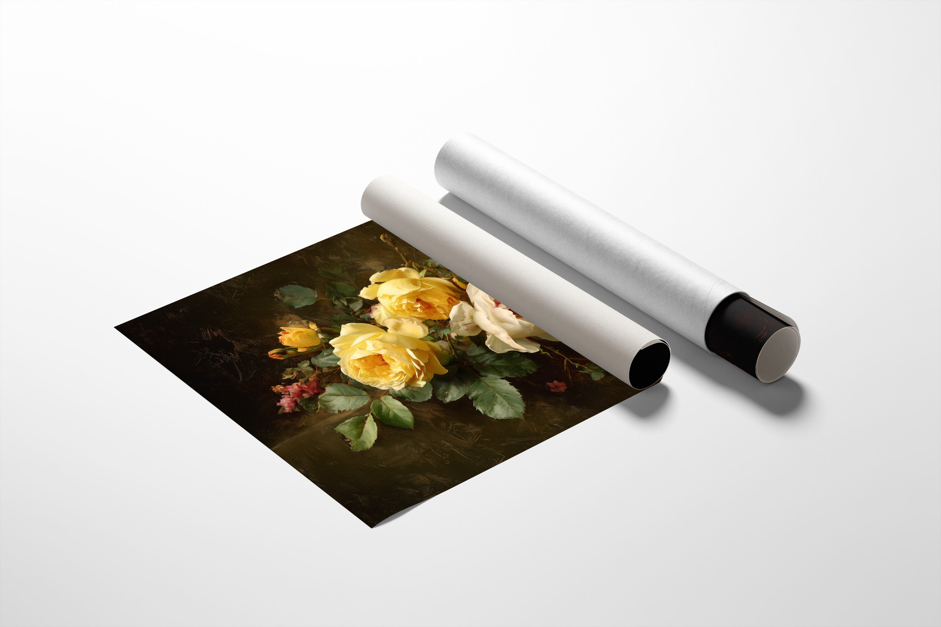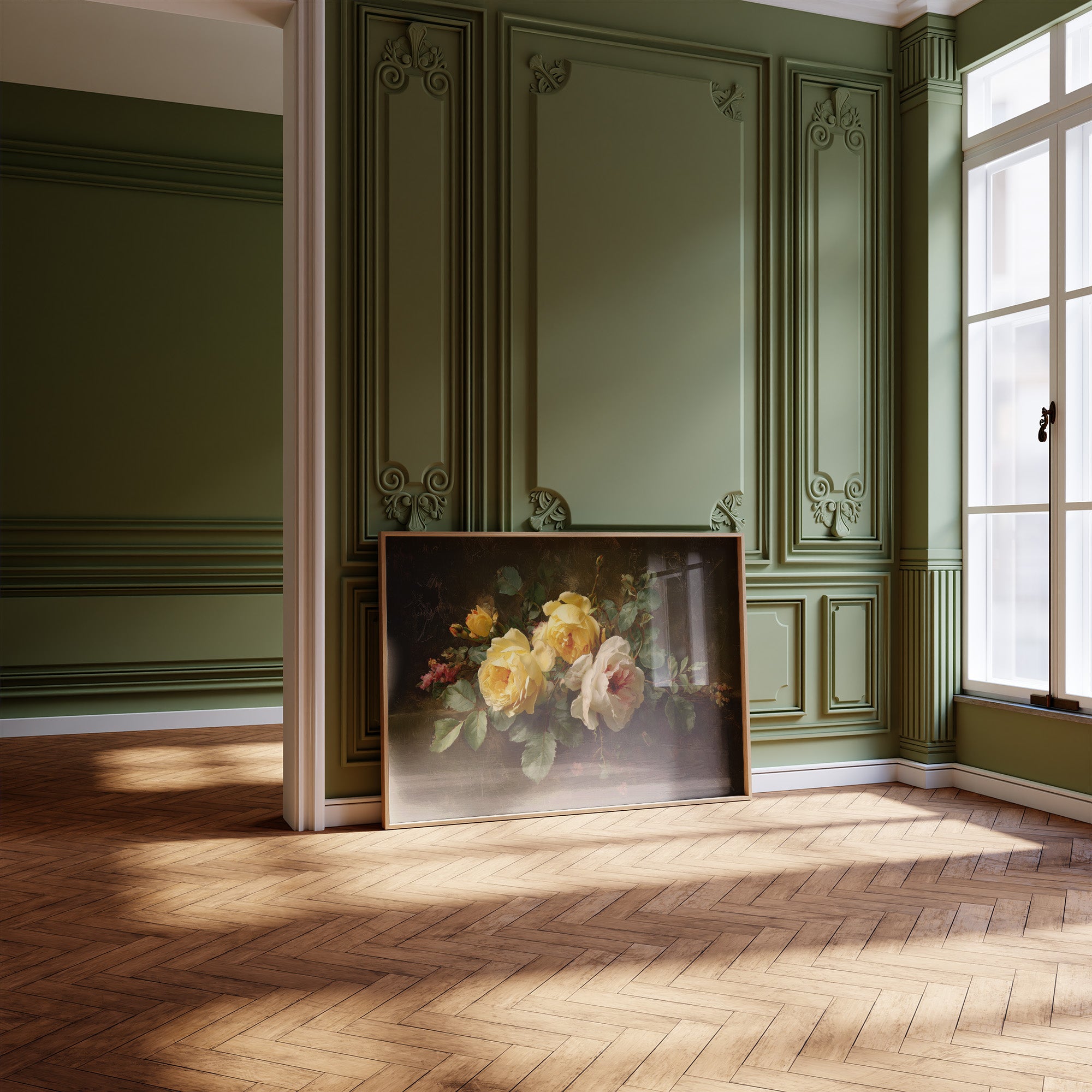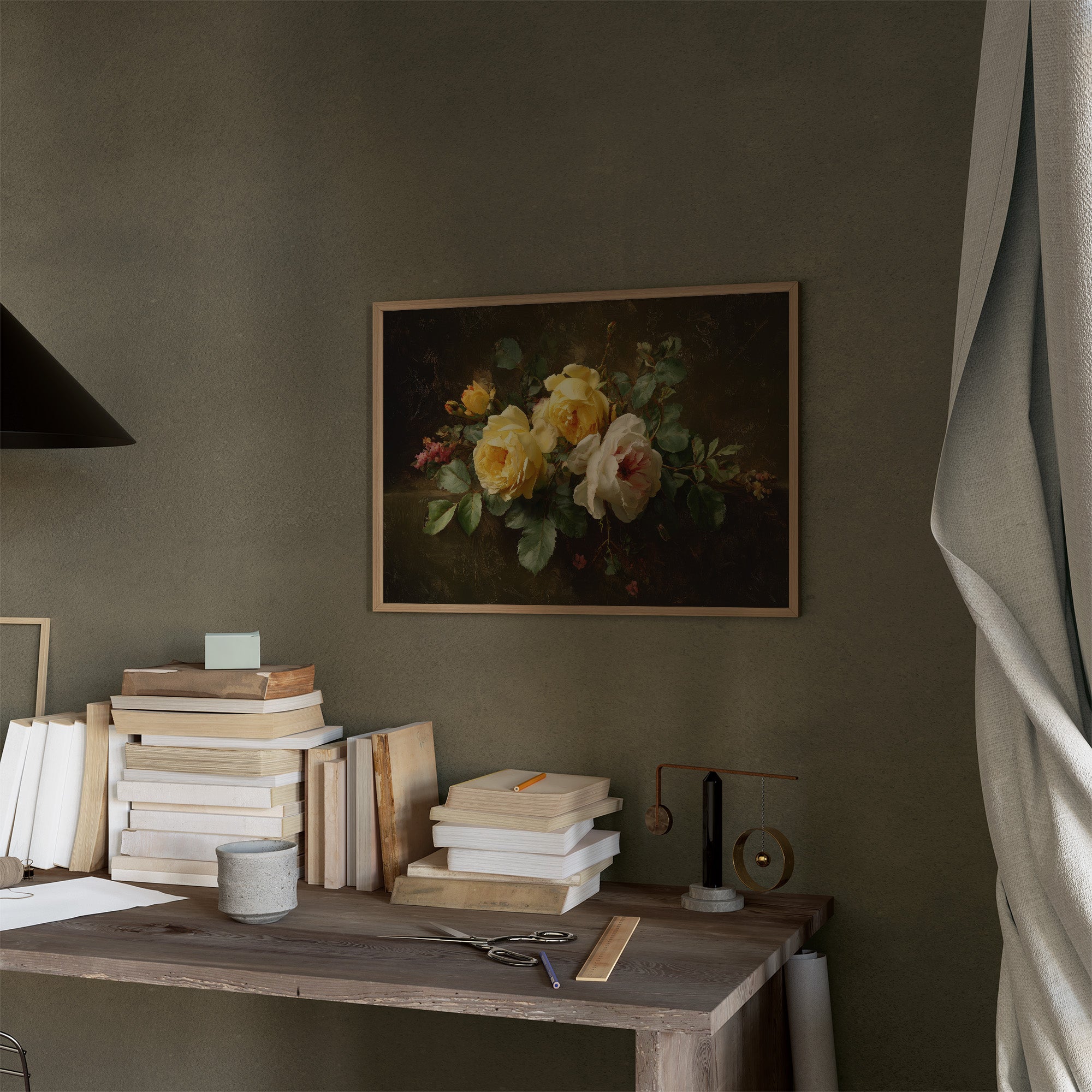 A classical floral painting rests against a backdrop of countless stories waiting to be told. The luminous yellow and cream roses emerge from their dark canvas, creating a moment where past and present beauty converge. Rich wooden bookshelves filled with leather-bound volumes and contemporary titles form a perfect sanctuary for this timeless still life, while a subtle olive plant echoes the painting's verdant elements. This piece brings sophisticated warmth to a home office, reading nook, or any space where literary and artistic traditions are celebrated.
