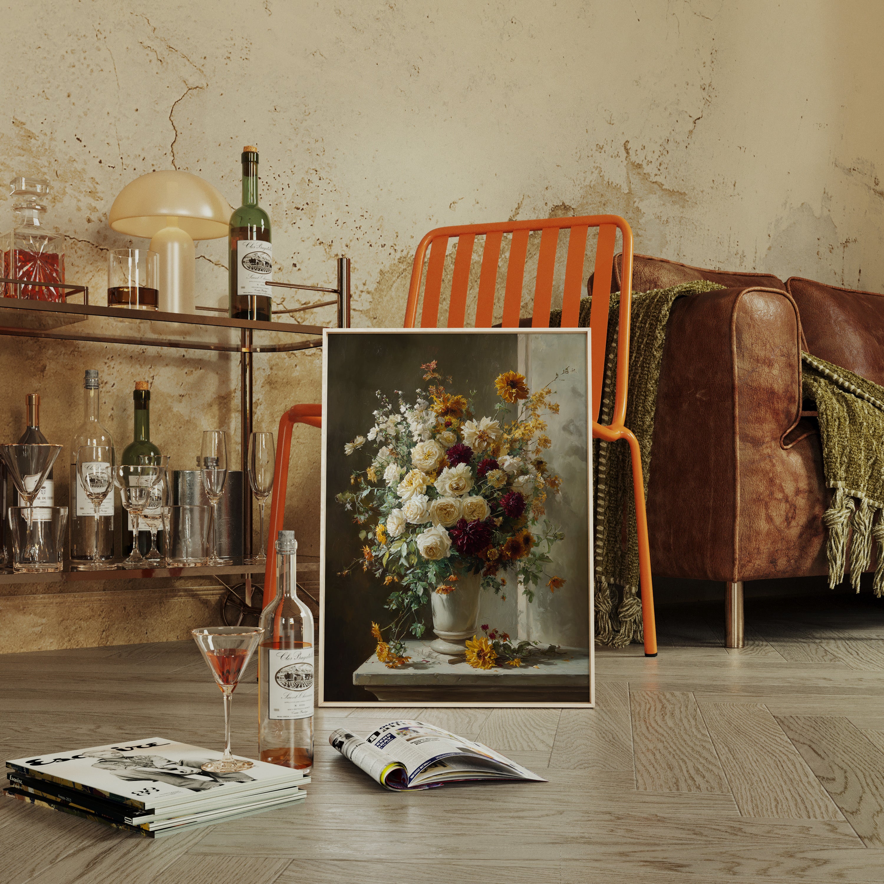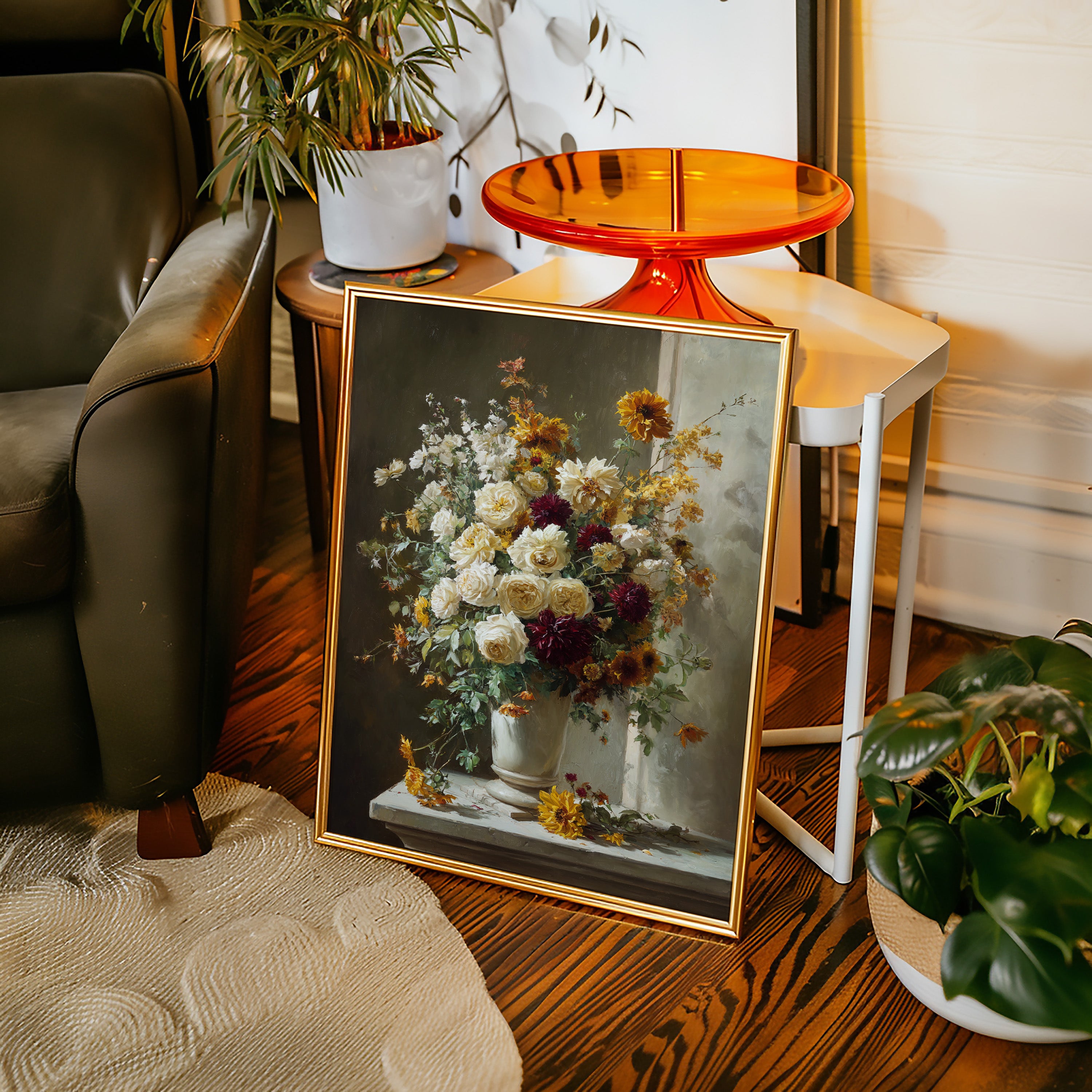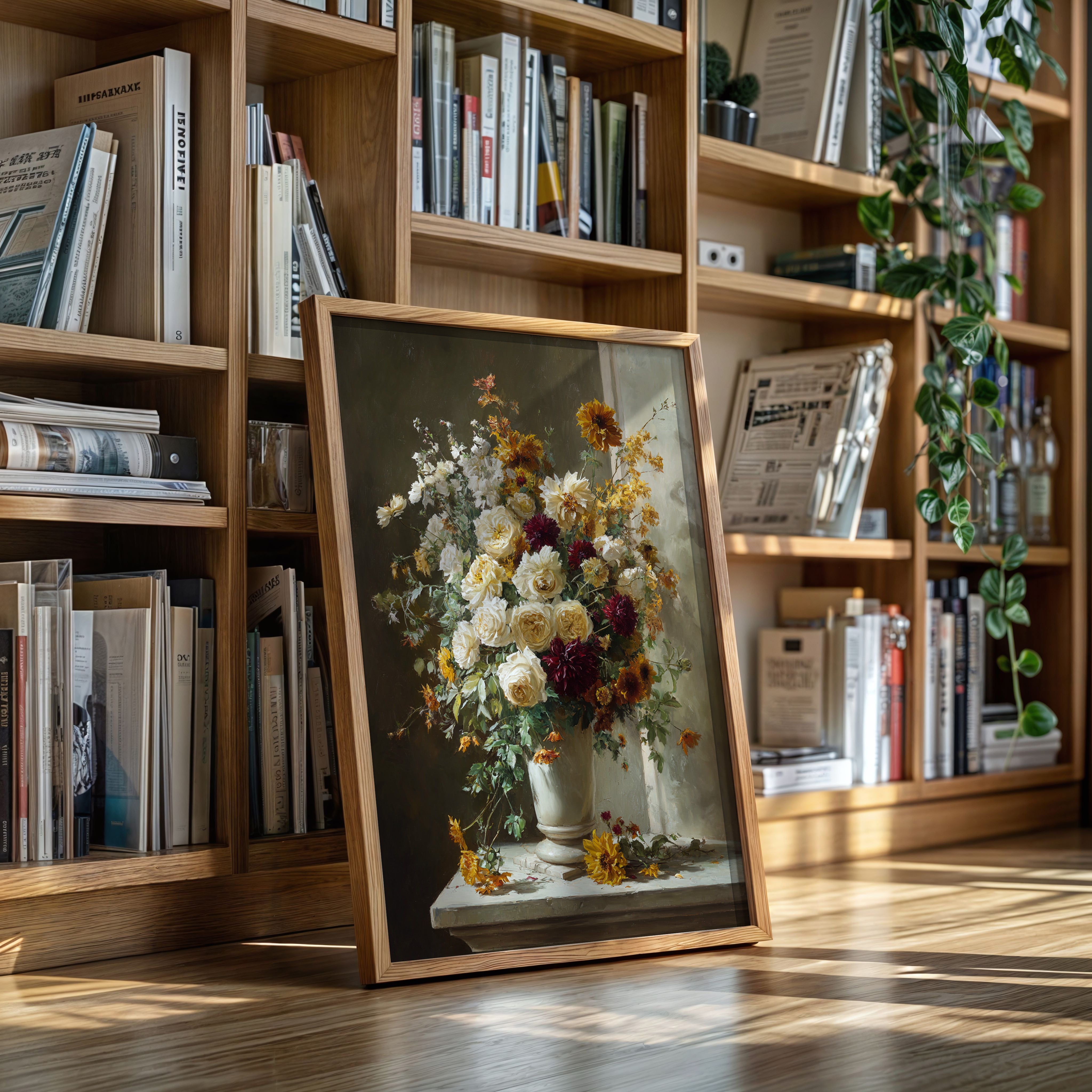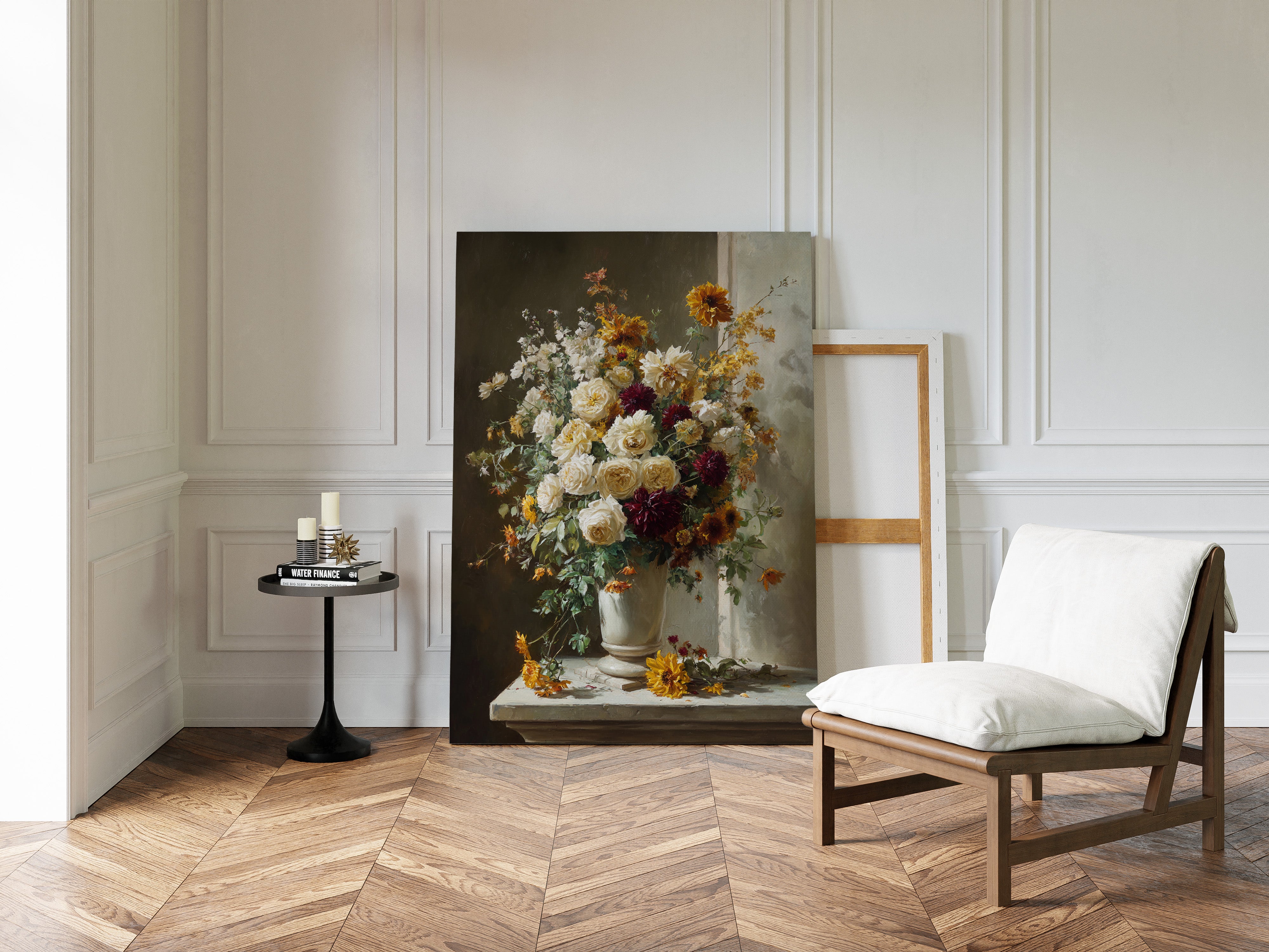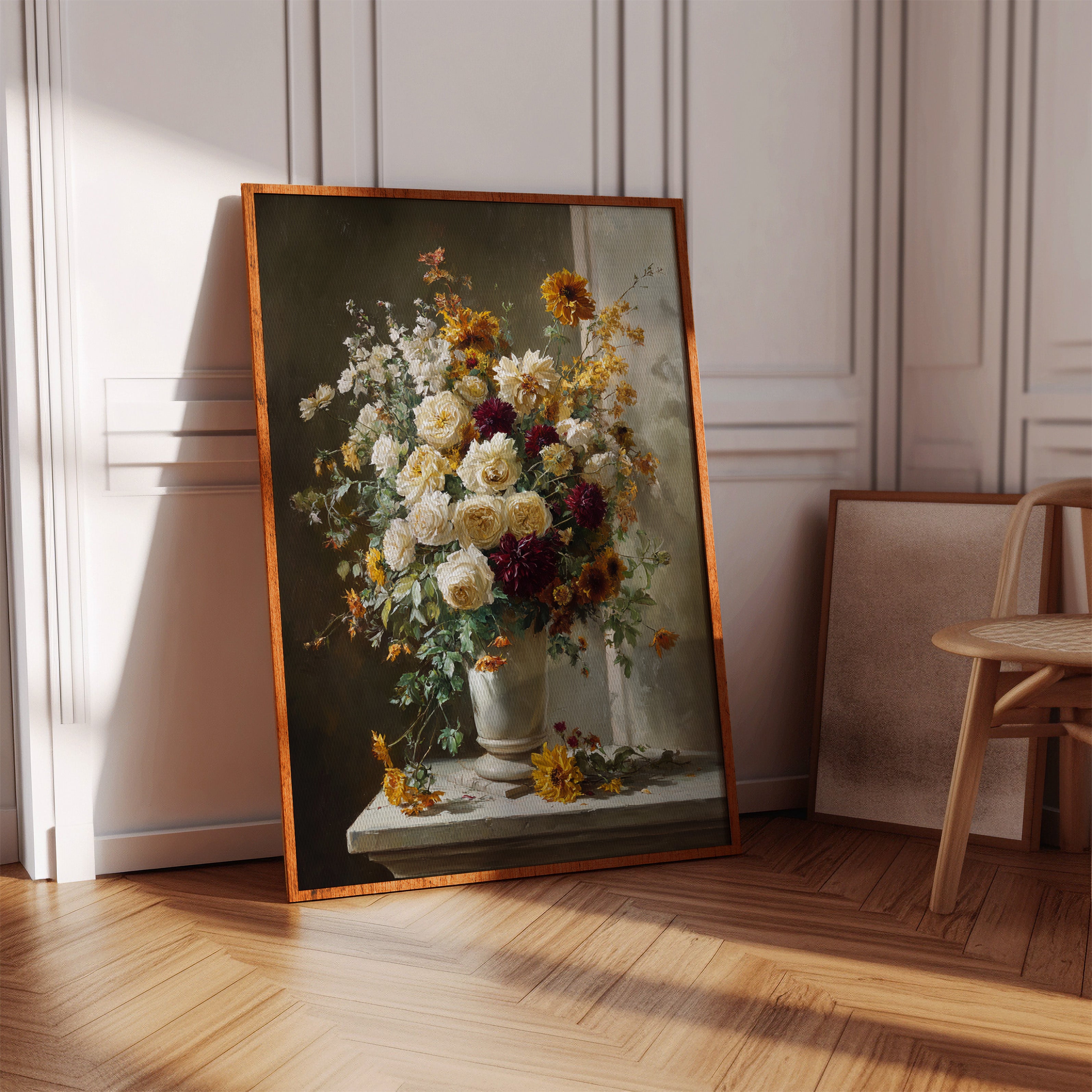 Soft light caresses a masterful arrangement where cream-colored garden roses mingle with deep burgundy dahlias and golden sunflowers. The composition speaks of late summer's abundance, with flowers spilling gracefully from a classical white vase. Rich shadows play against delicate petals, while trailing foliage adds movement and wild beauty to the structured arrangement. The interplay of formal and natural elements creates a timeless scene that captures both the refinement of traditional still life and the untamed spirit of a garden harvest. This piece would bring classical elegance to a formal dining room or add sophisticated charm to a living space where traditional and contemporary styles meet.