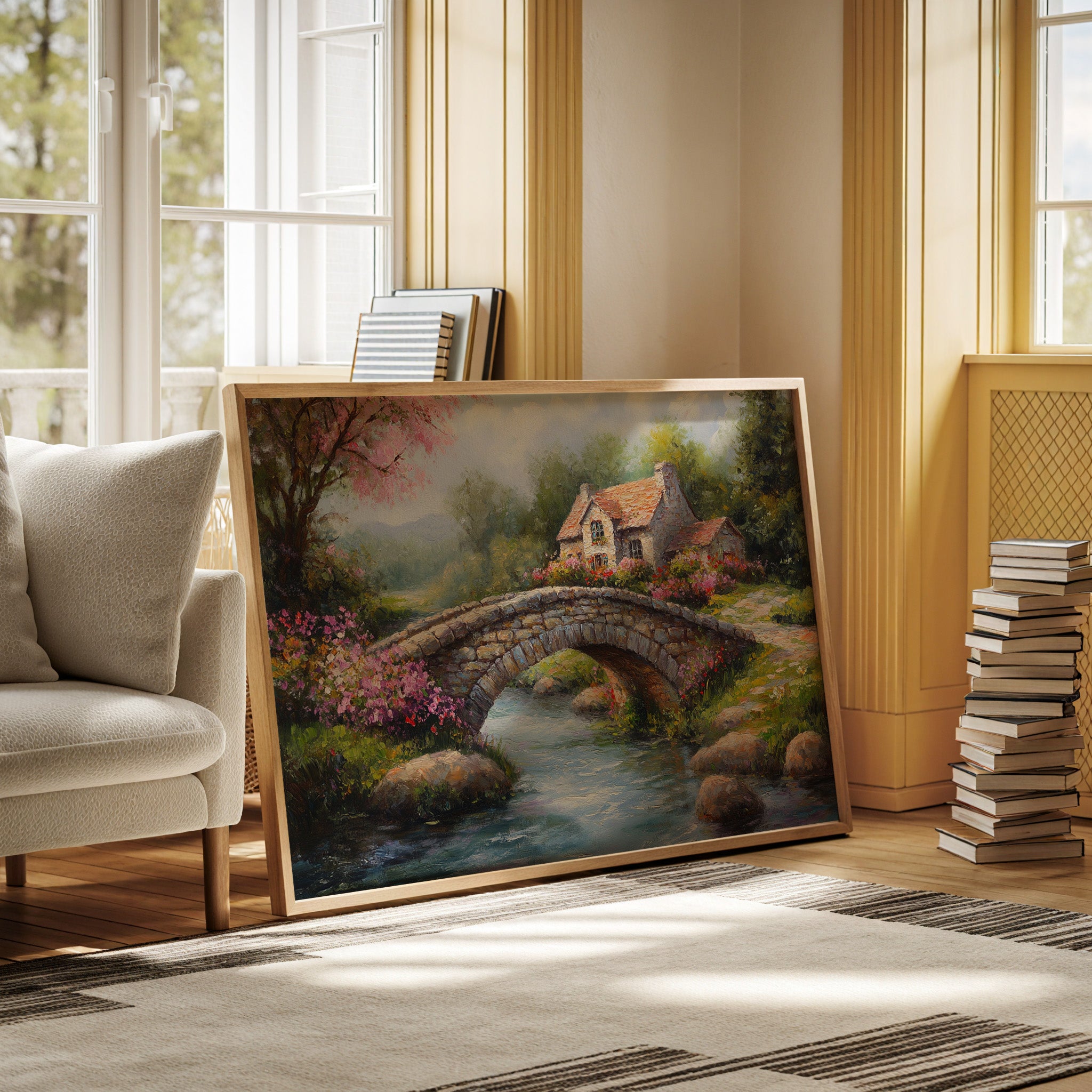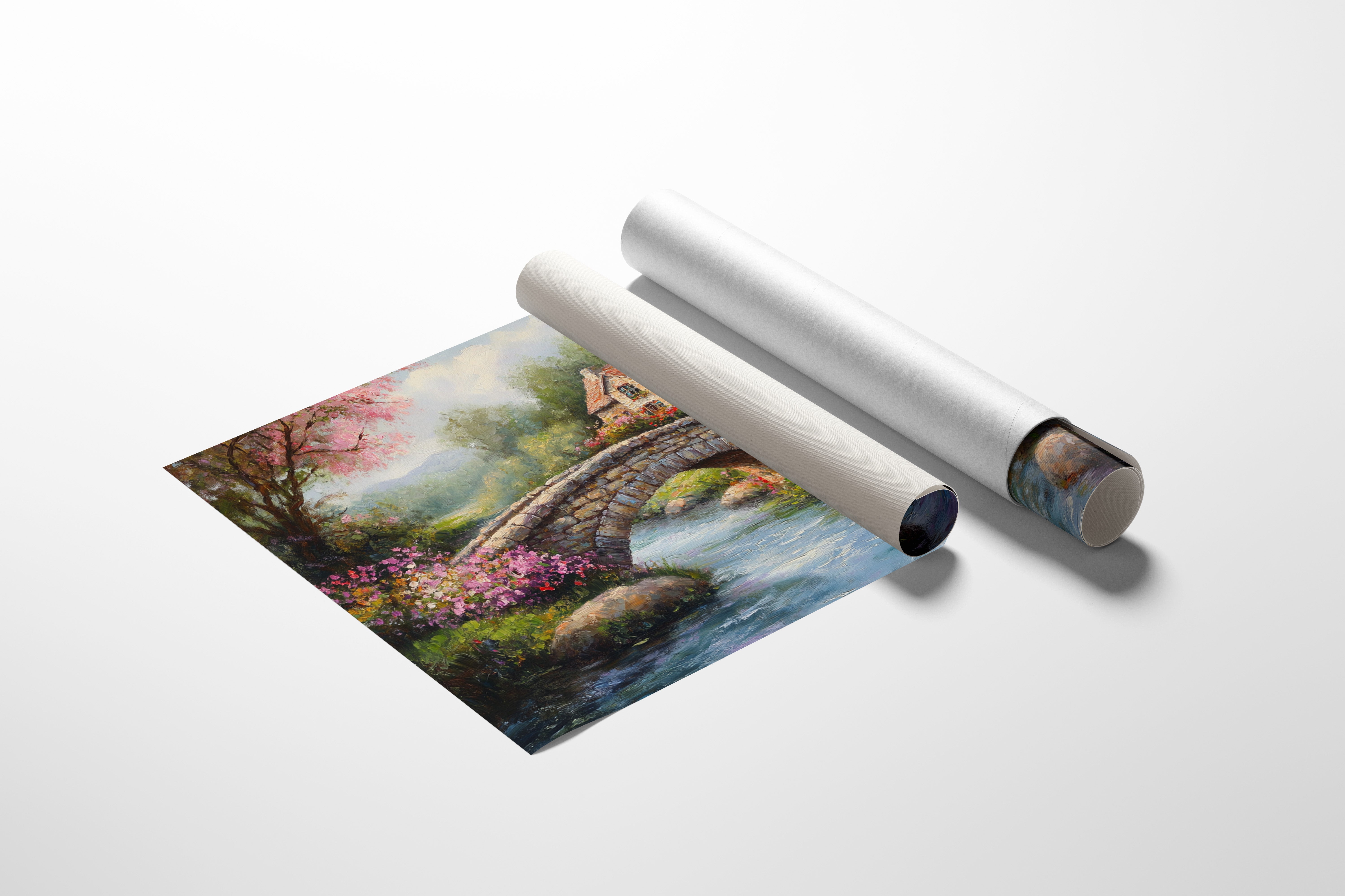 Morning mist drifts across a tranquil stream where an old stone bridge stands as a testament to time. Delicate pink cherry blossoms and vibrant roses frame the scene, their petals catching the soft springtime light. A quaint cottage with weathered stone walls and terra cotta roof tiles nestles into the verdant hillside, its windows warmly reflecting the day's gentle sunshine. This pastoral scene captures the essence of a timeless countryside, where flowing water meets carefully laid stone and wild gardens flourish in natural abundance. Perfect for bringing a sense of storybook charm and peaceful contemplation to a reading nook or bedroom sanctuary.