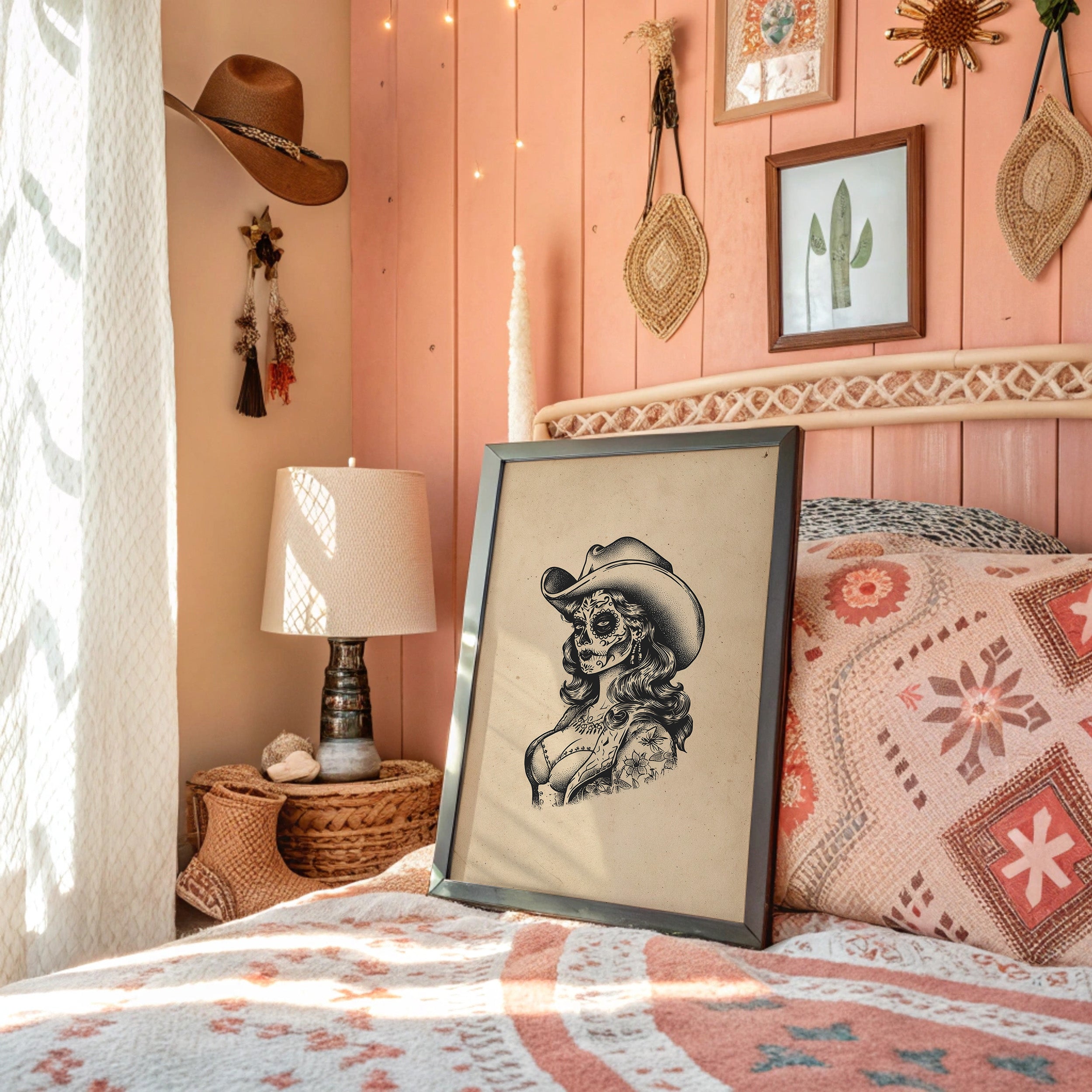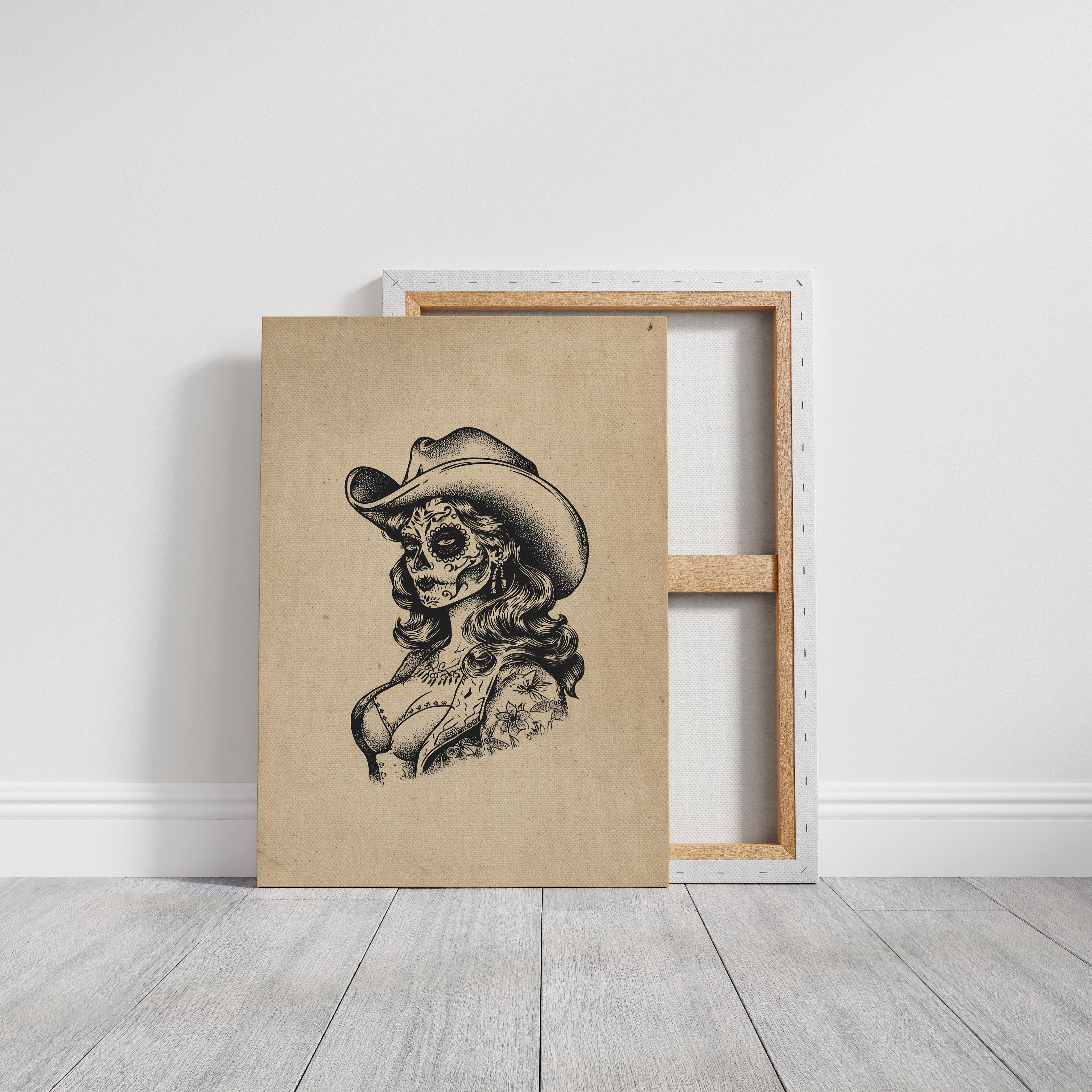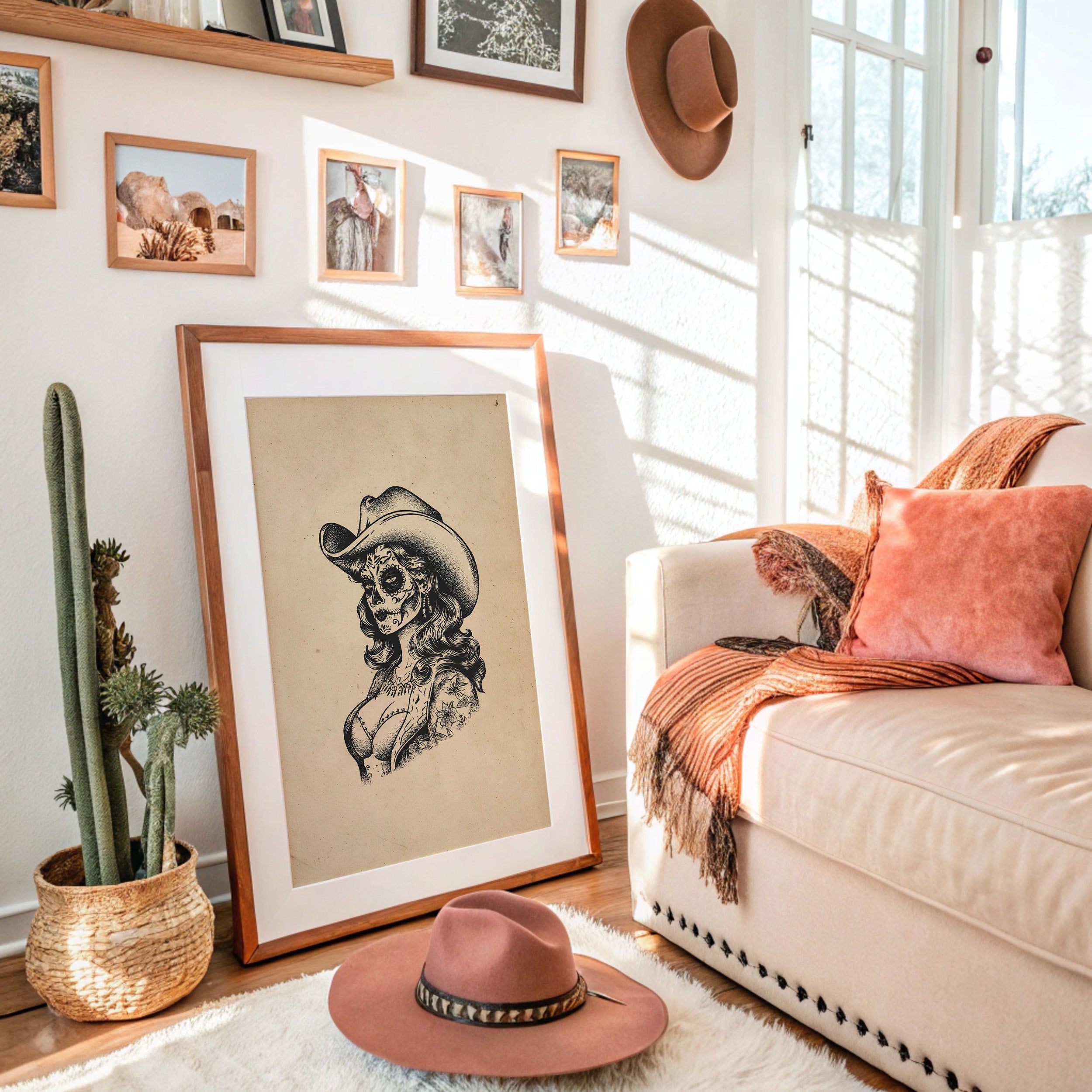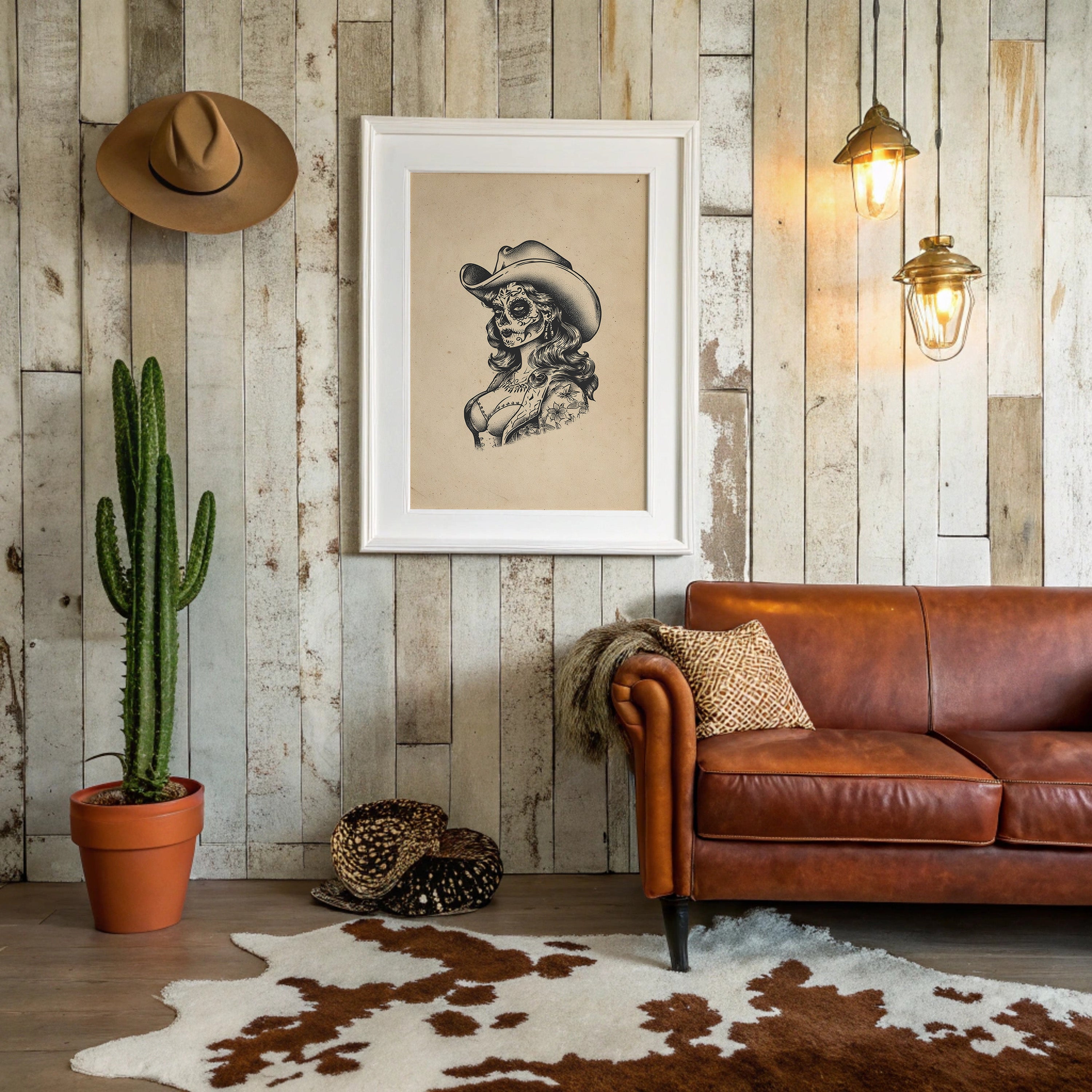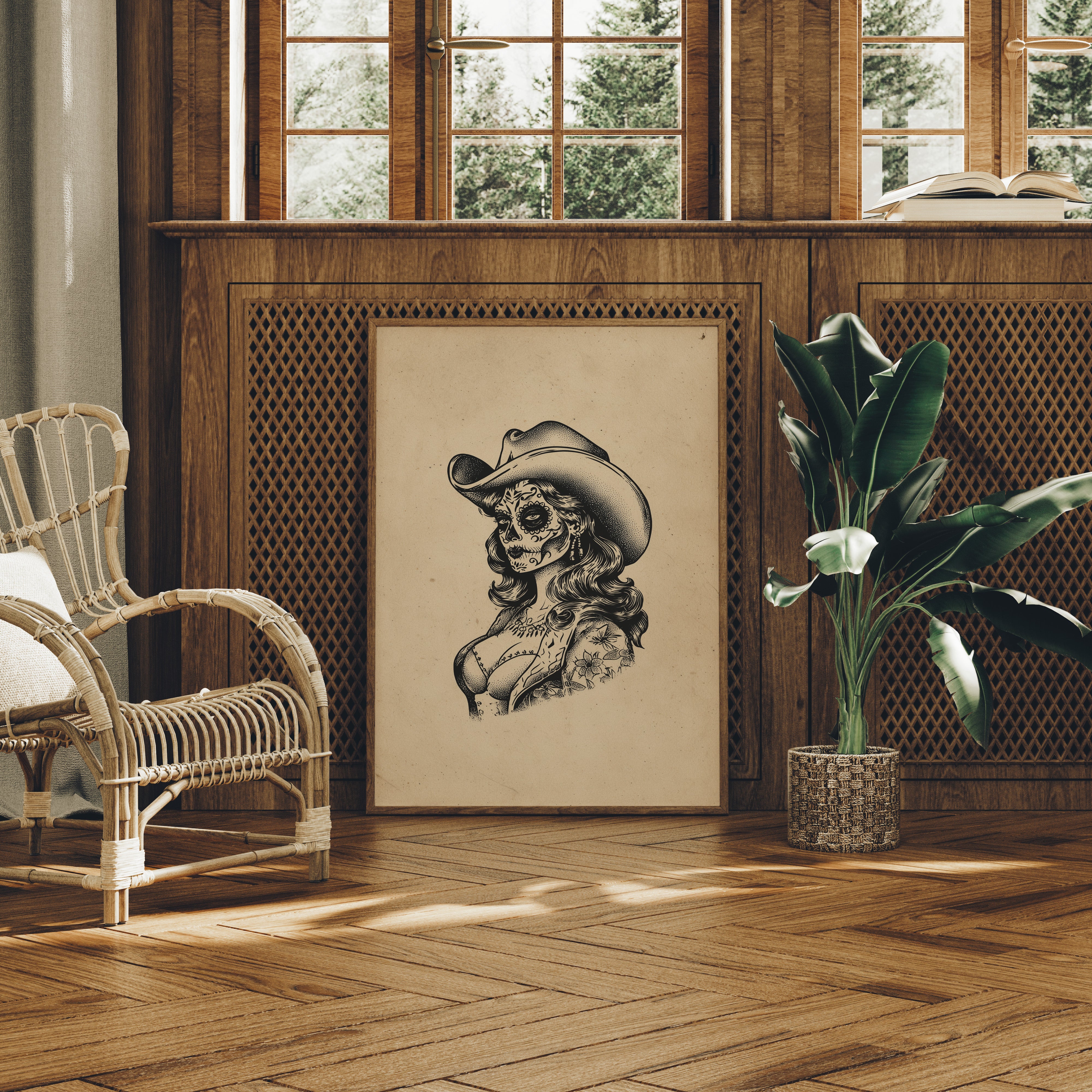In the heart of the Southwest, tradition meets edge in this striking portrait where beauty dances with mortality. The detailed illustration captures a haunting fusion of feminine grace and skeletal artistry, adorned with delicate roses and crowned with a classic cowboy hat. The monochromatic design speaks volumes through its intricate linework and bold contrast, creating a mesmerizing narrative of life, death, and eternal beauty. Perfect for adding a sophisticated yet edgy statement to a modern ranch house, urban loft, or any space seeking to blend Western charm with contemporary art sensibilities.