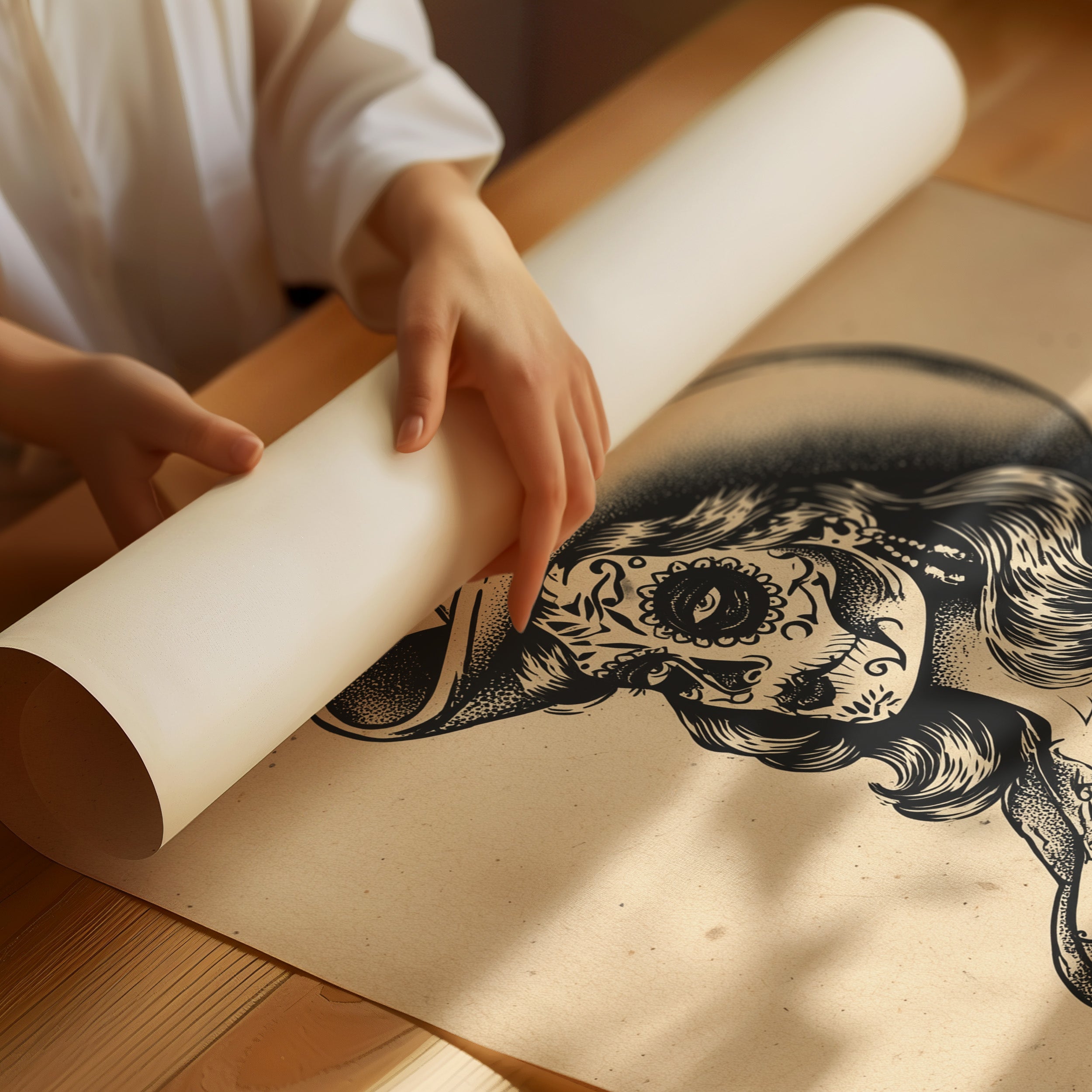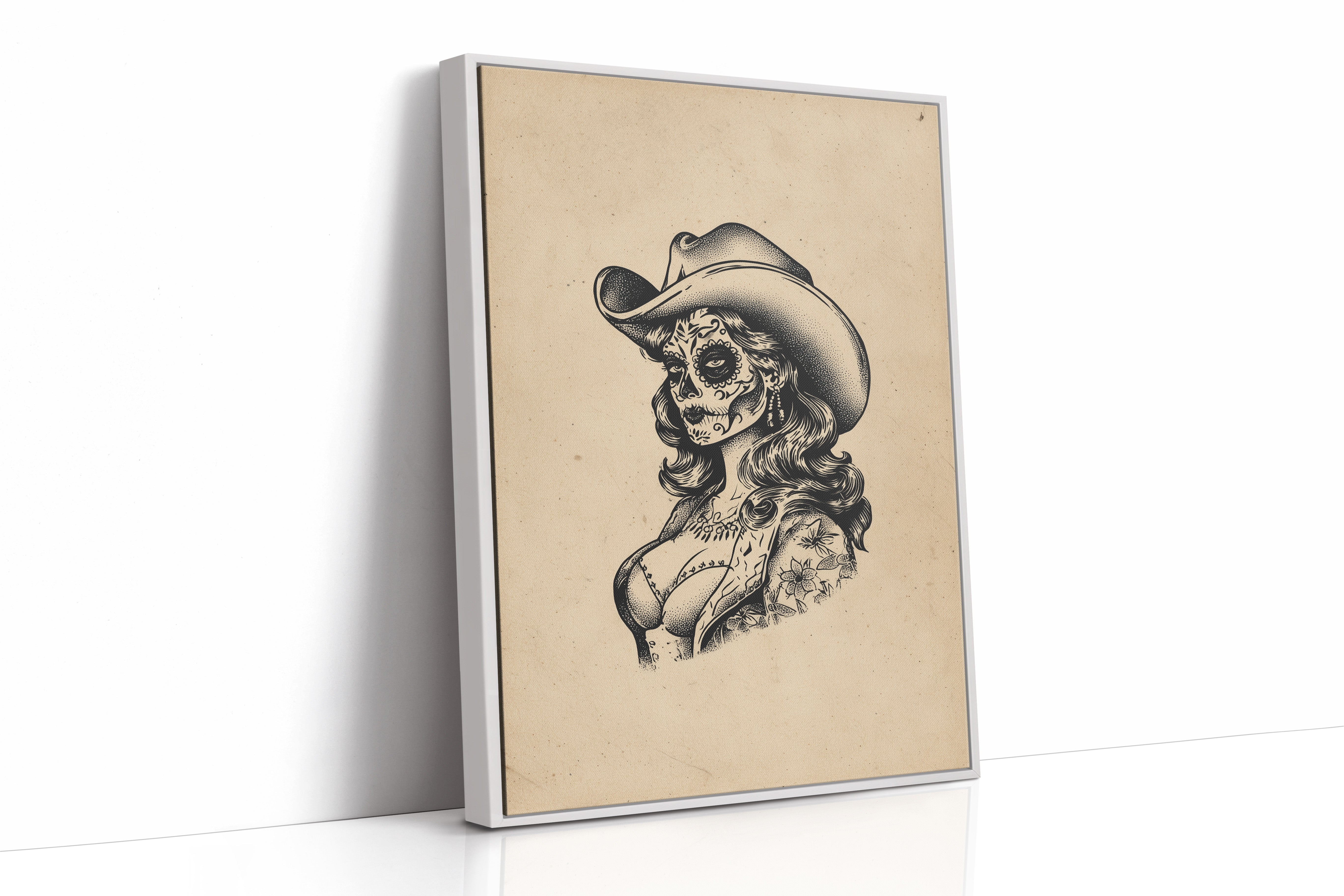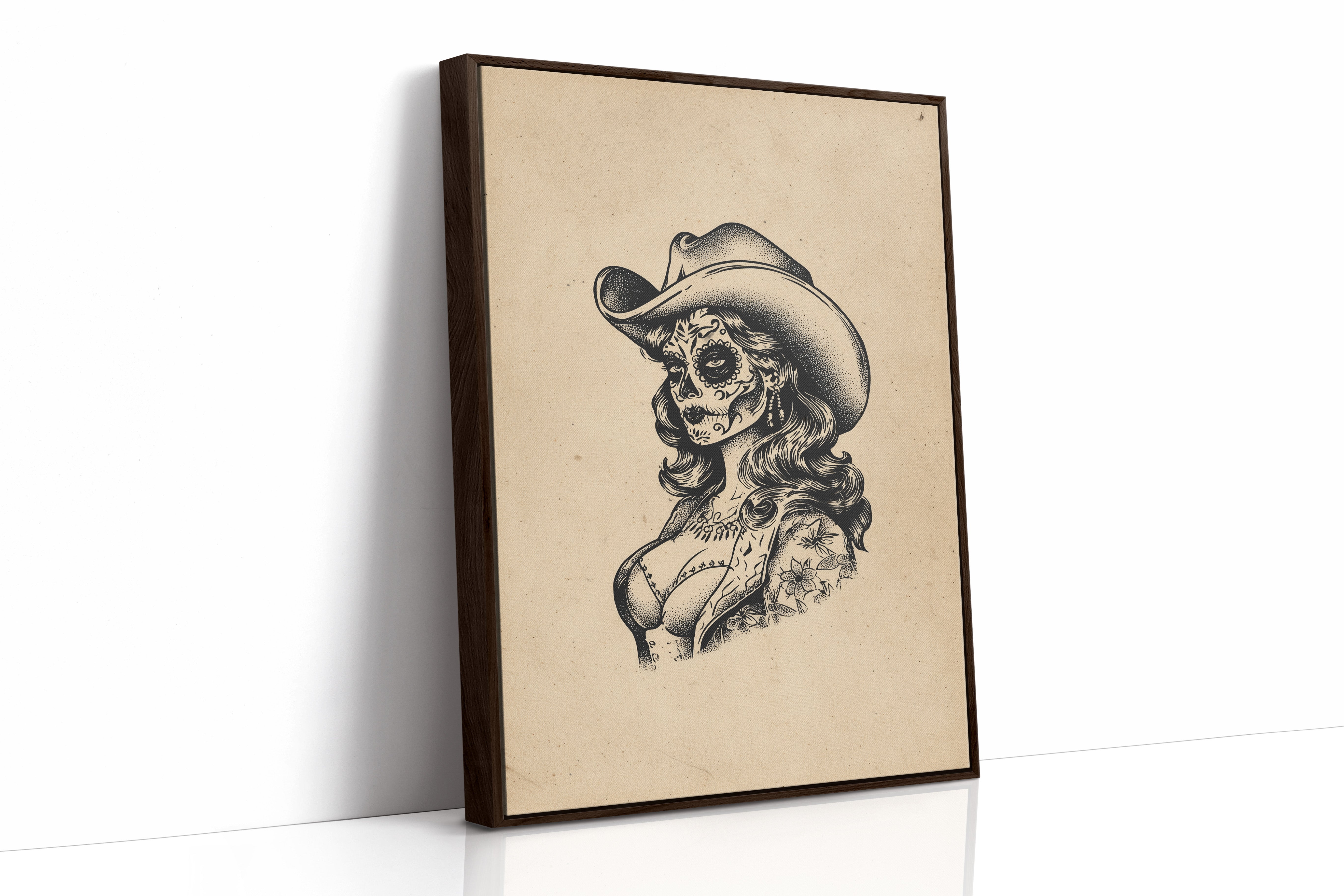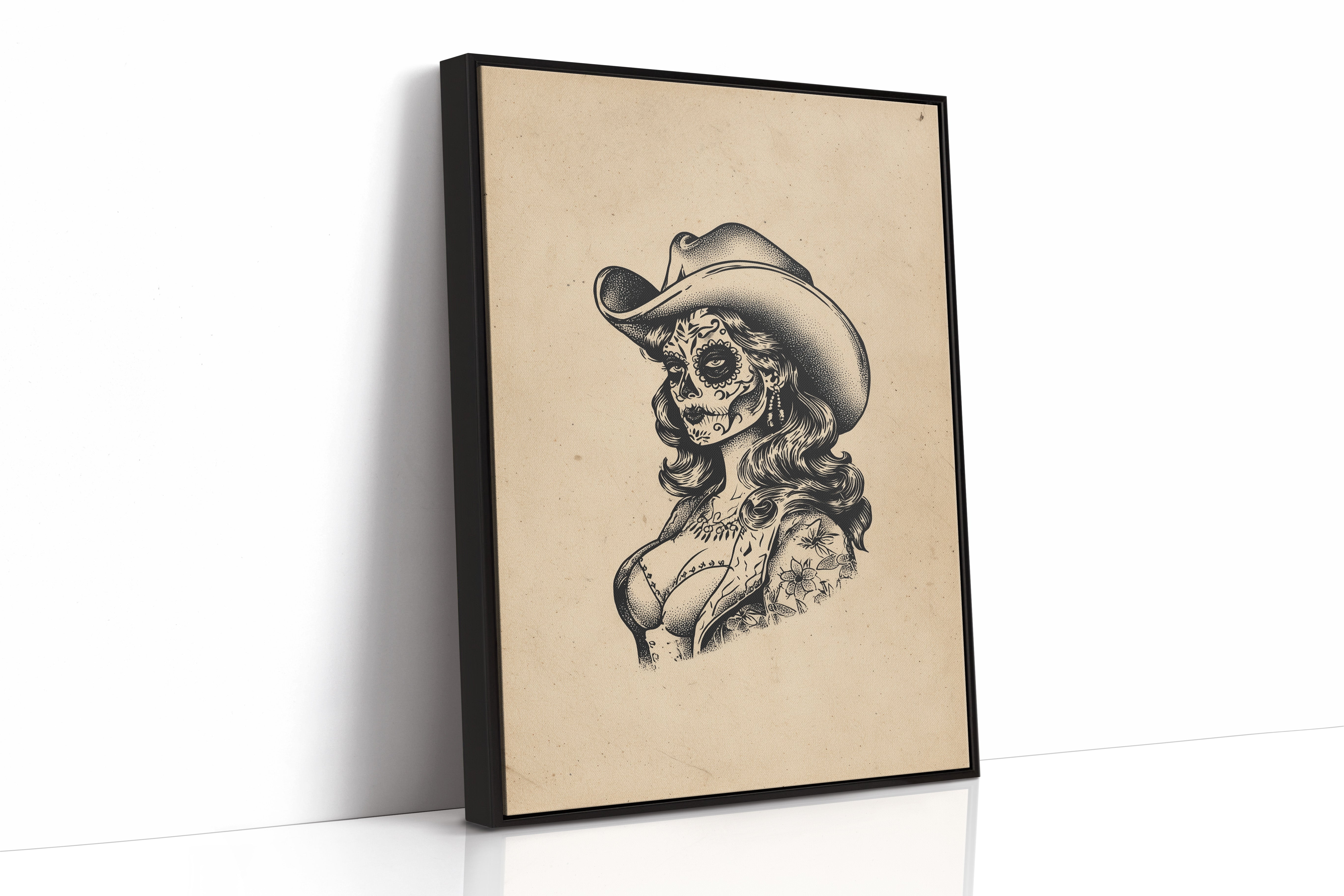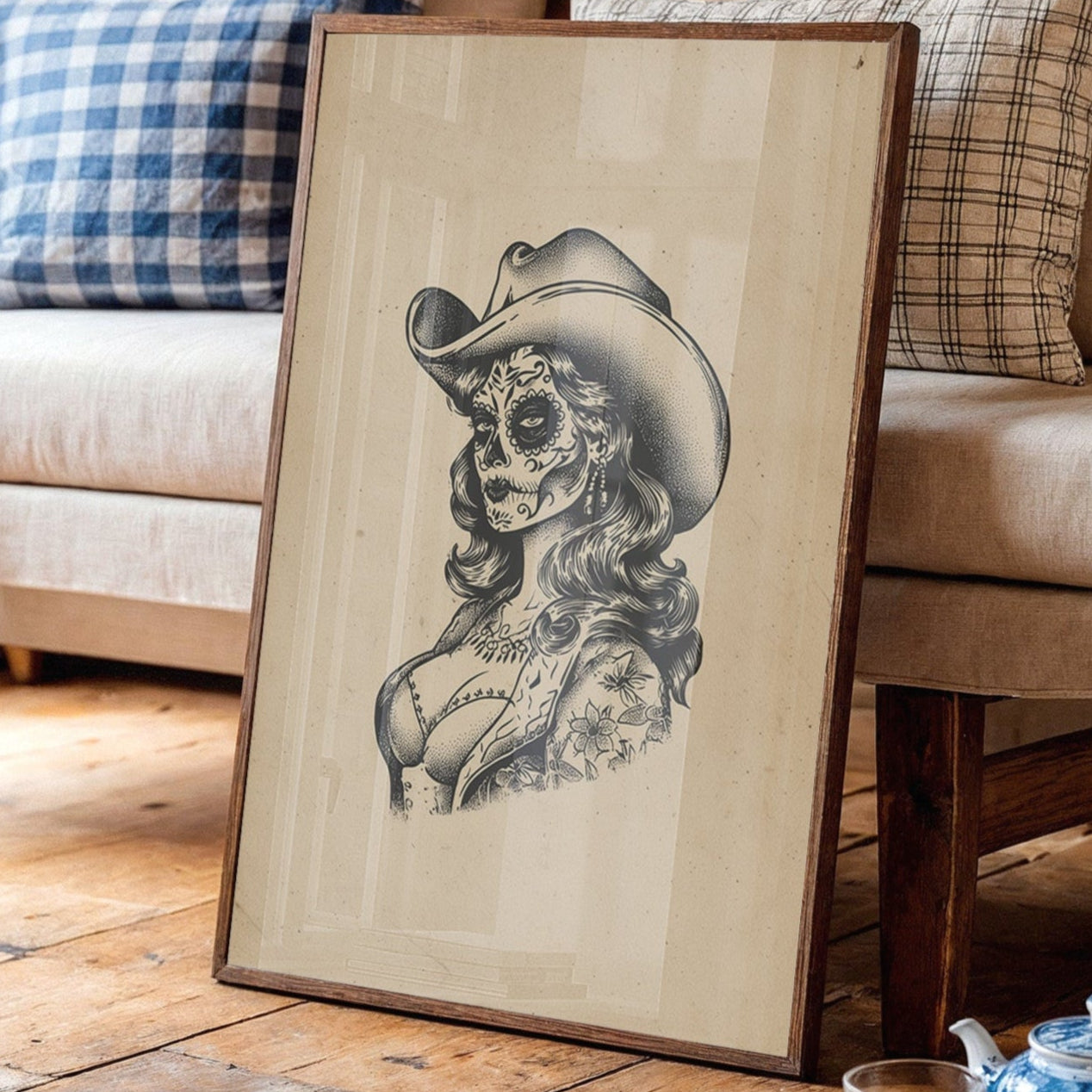 In the heart of the Southwest, tradition meets edge in this striking portrait where beauty dances with mortality. The detailed illustration captures a haunting fusion of feminine grace and skeletal artistry, adorned with delicate roses and crowned with a classic cowboy hat. The monochromatic design speaks volumes through its intricate linework and bold contrast, creating a mesmerizing narrative of life, death, and eternal beauty. Perfect for adding a sophisticated yet edgy statement to a modern ranch house, urban loft, or any space seeking to blend Western charm with contemporary art sensibilities.