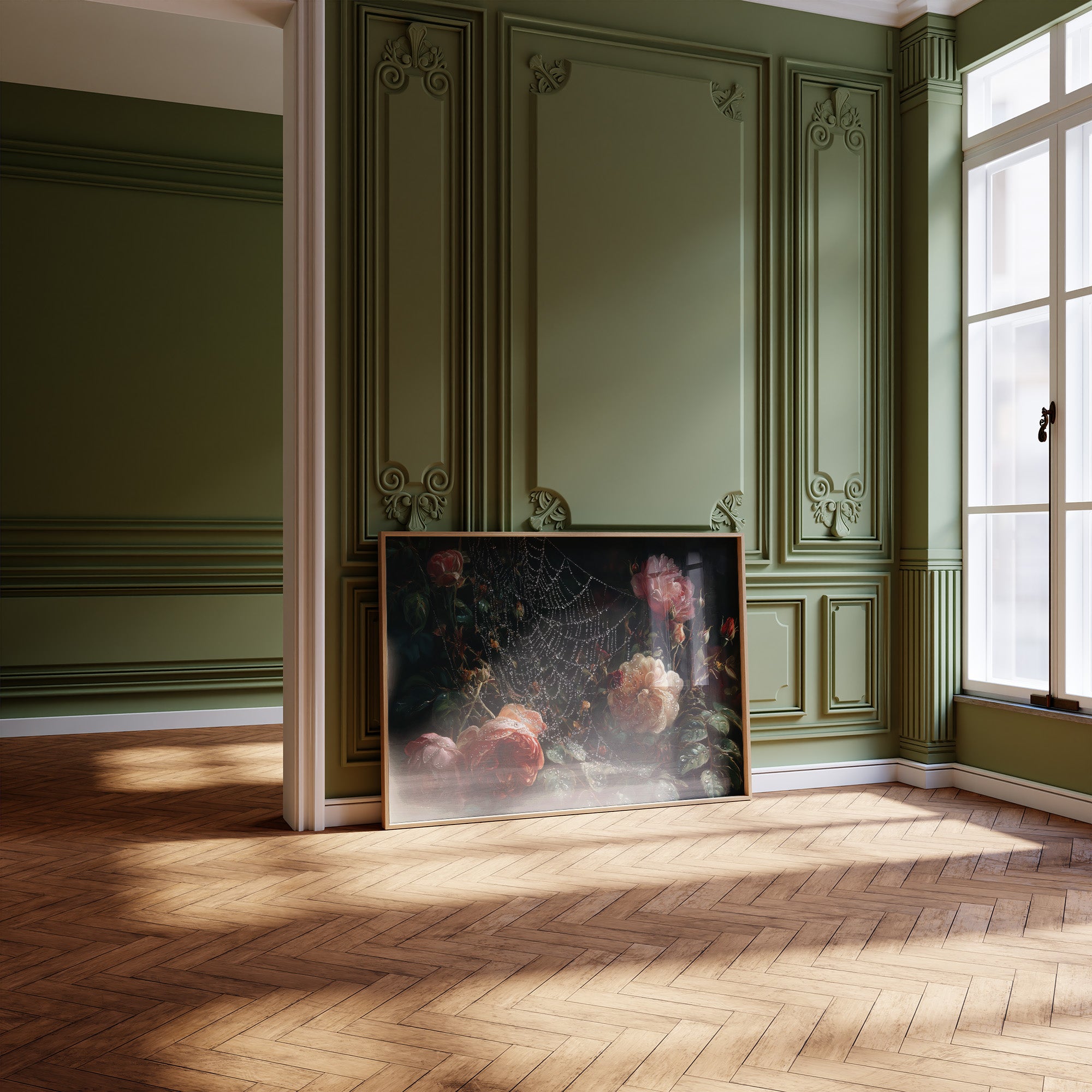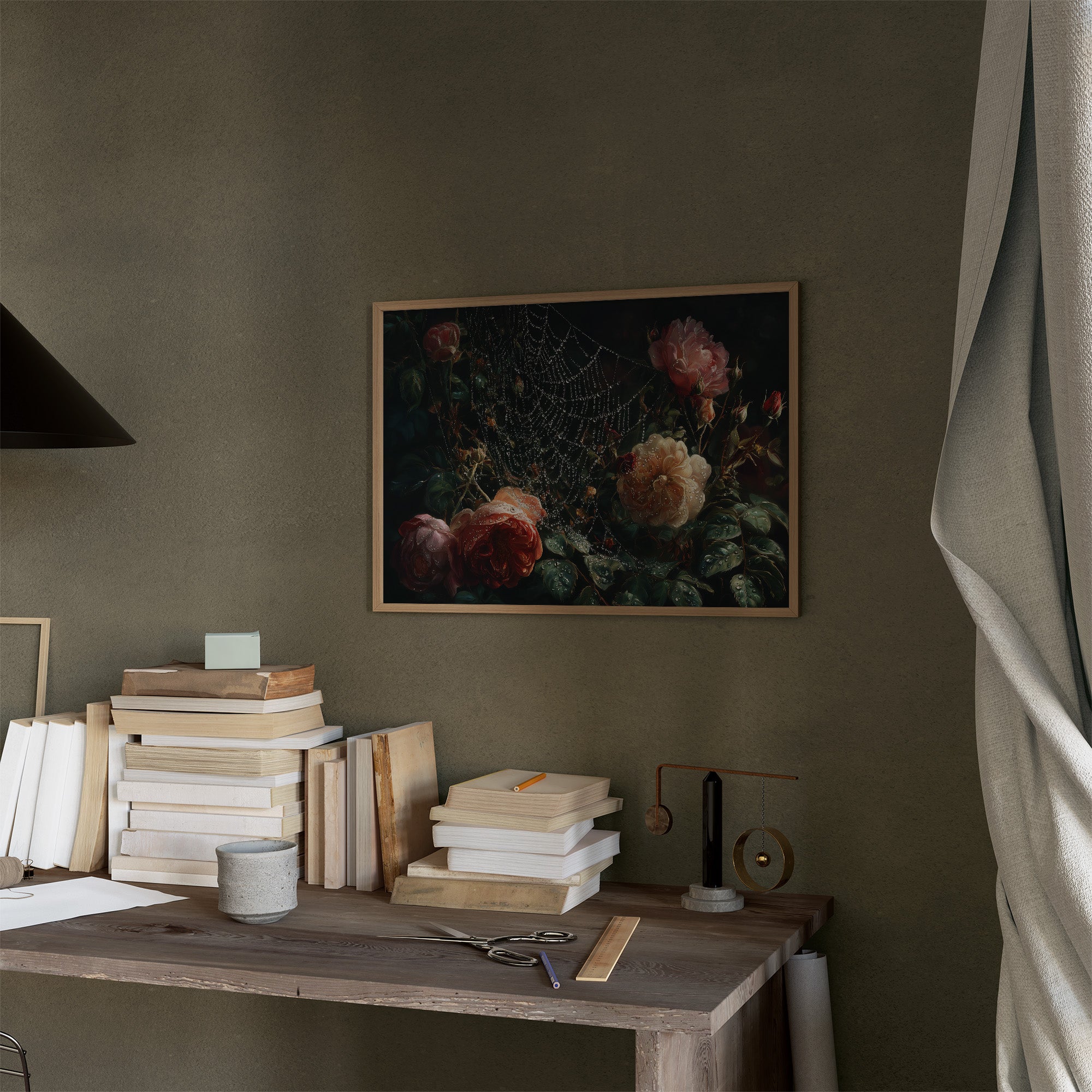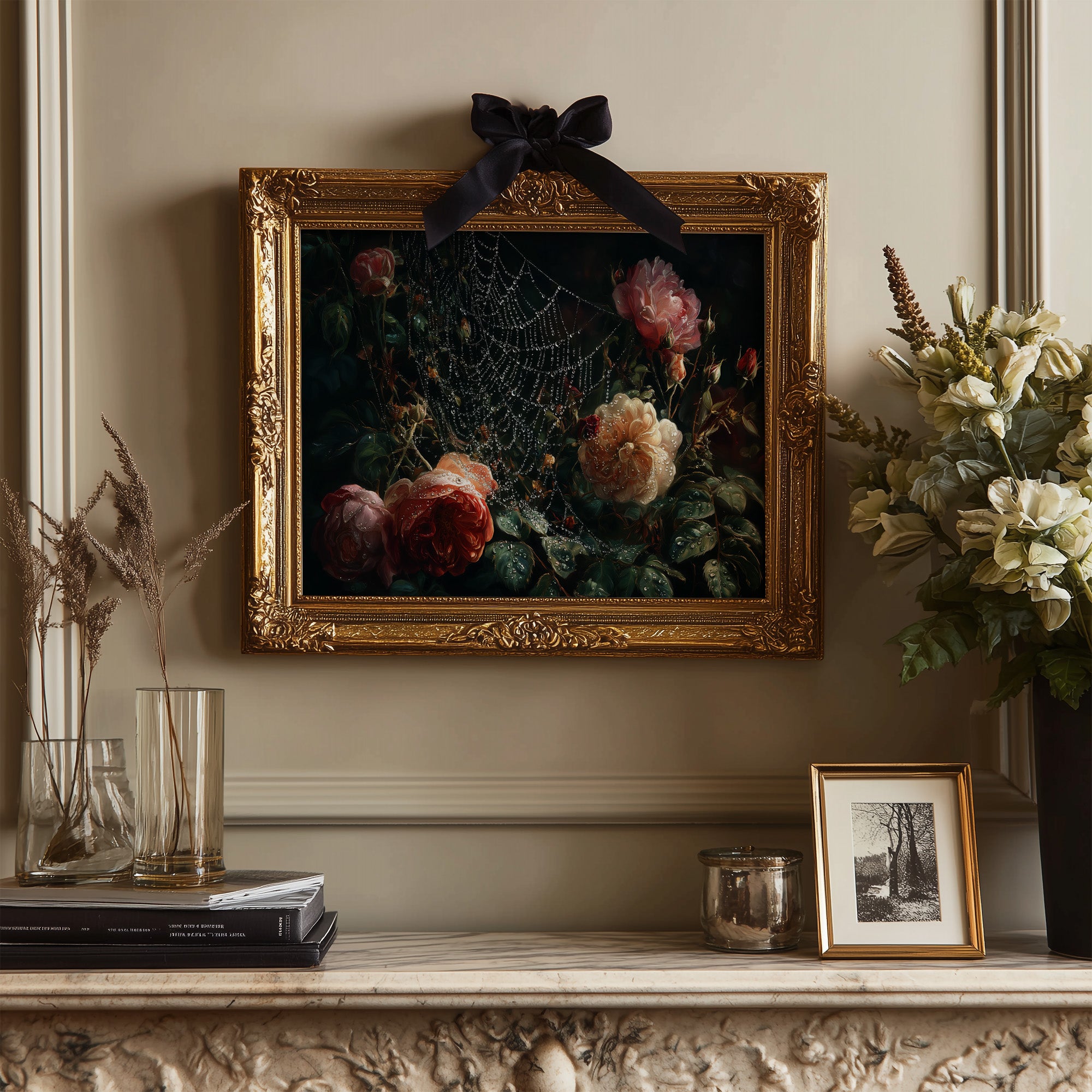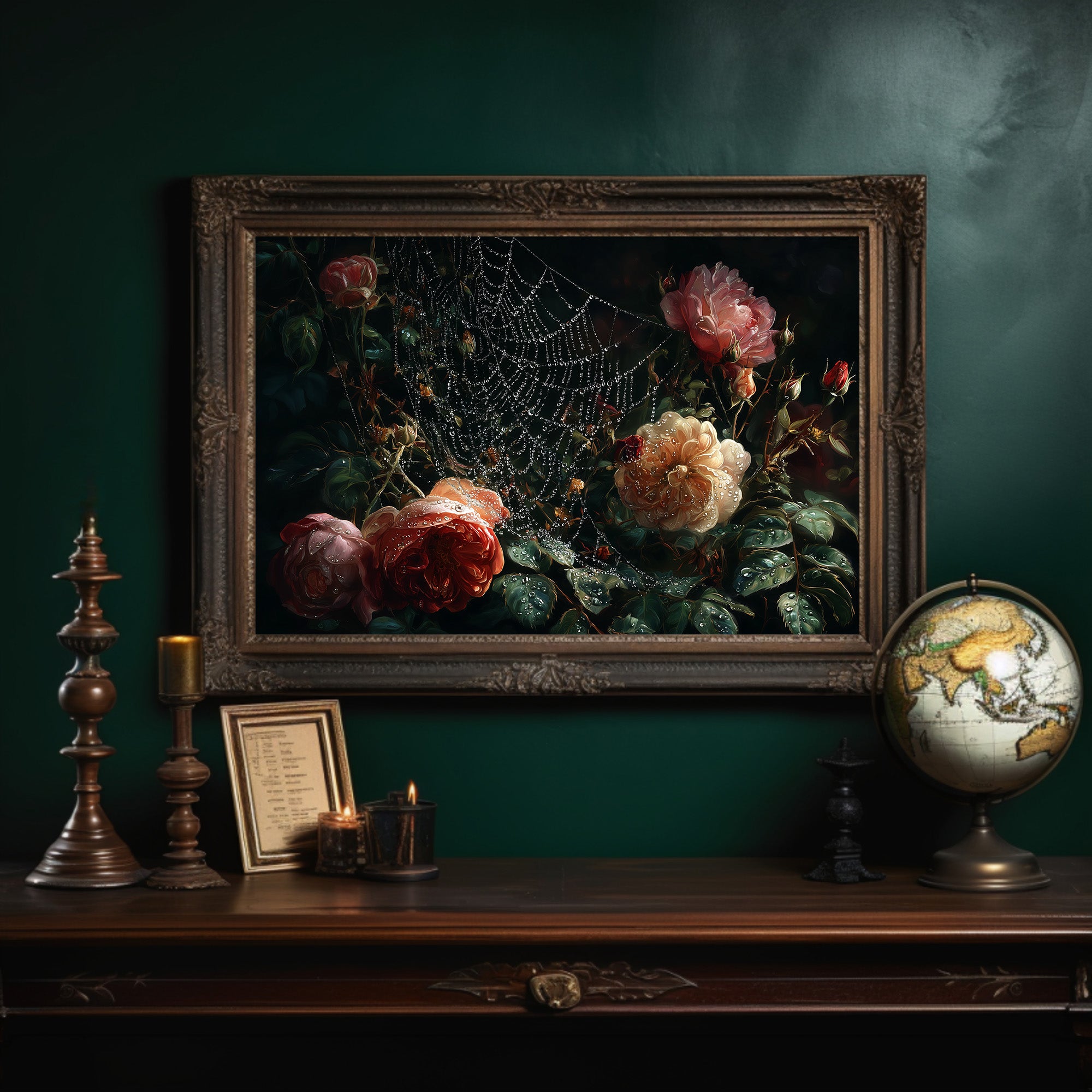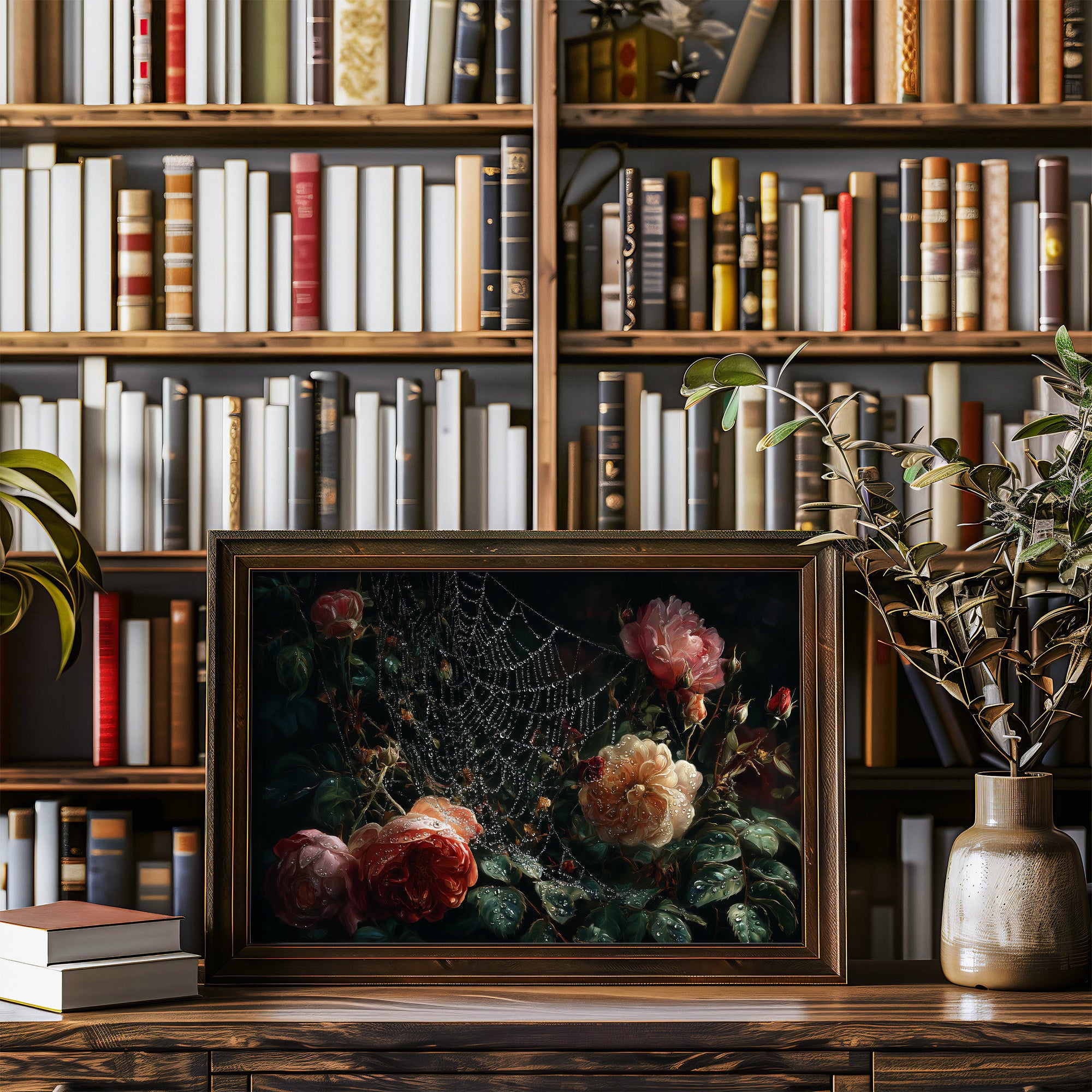 Delicate droplets of dew cling to an intricate spider's web, framing lush roses in a moment of suspended beauty. The painting captures the romance of vintage floralsrich peach and coral blooms emerging from deep shadows, their petals glistening with morning moisture. Against the backdrop of countless books, this dramatic still life creates a perfect dialogue between literature and visual artistry. This piece would bring timeless elegance to a home library, reading nook, or any space where contemplative beauty is cherished.