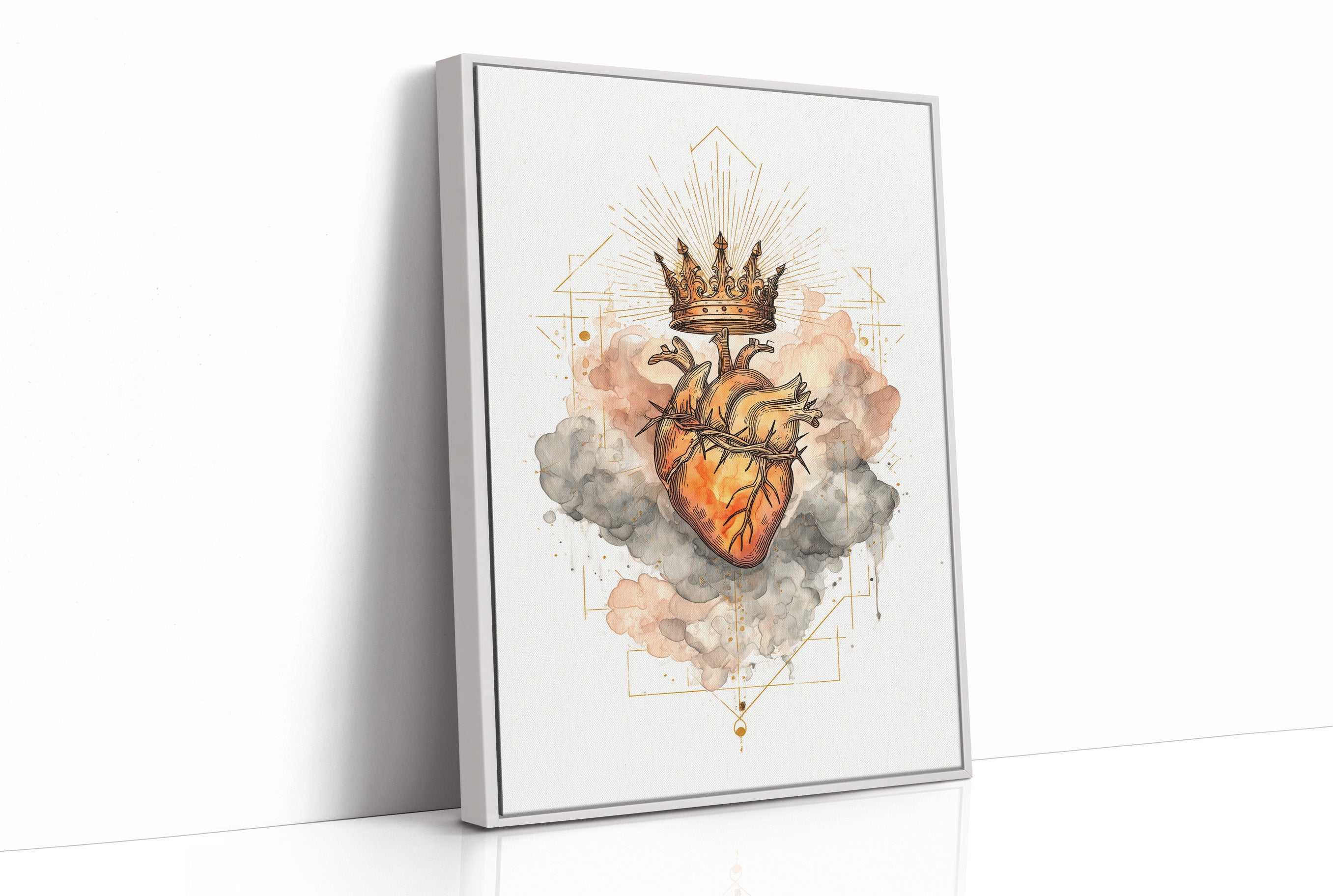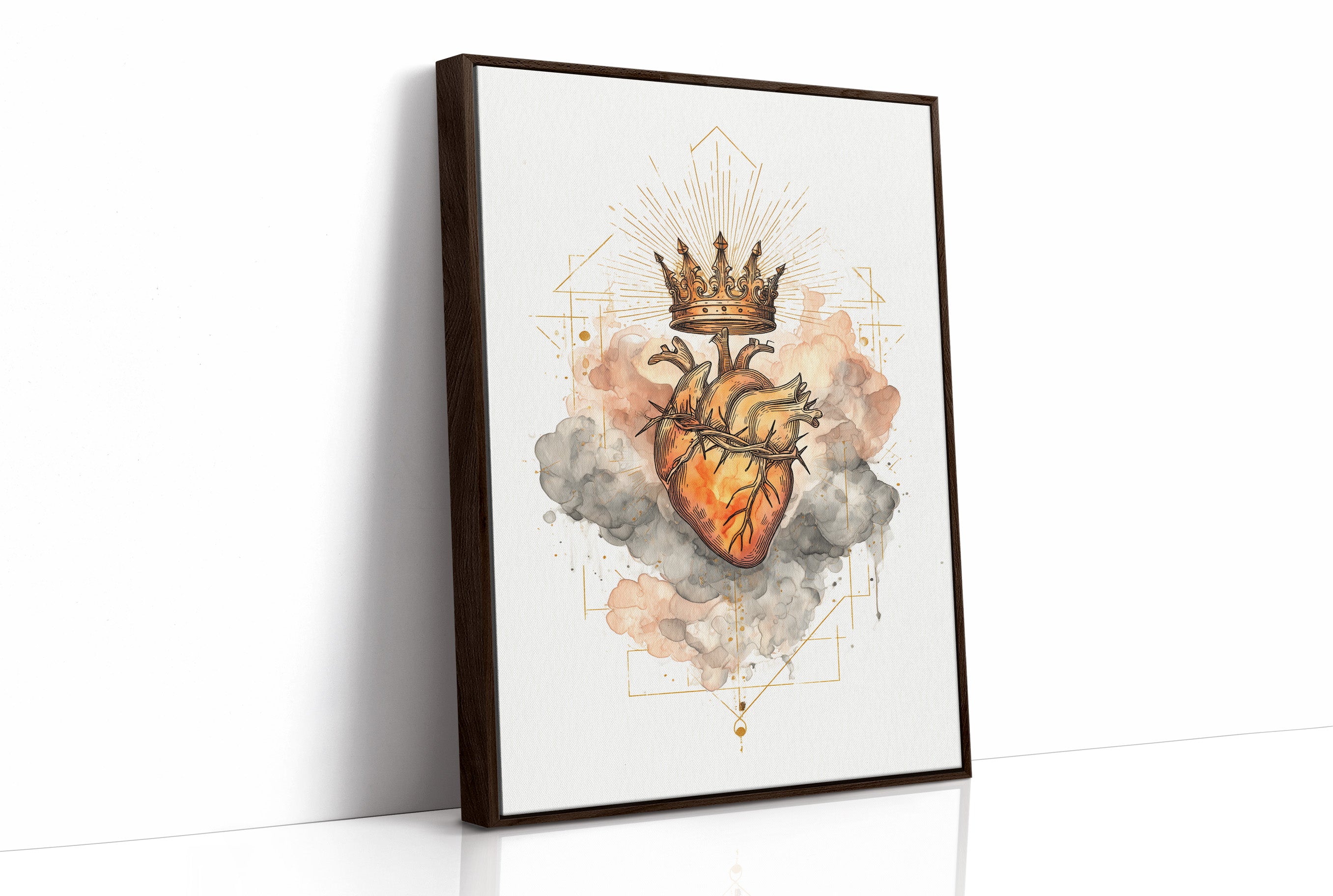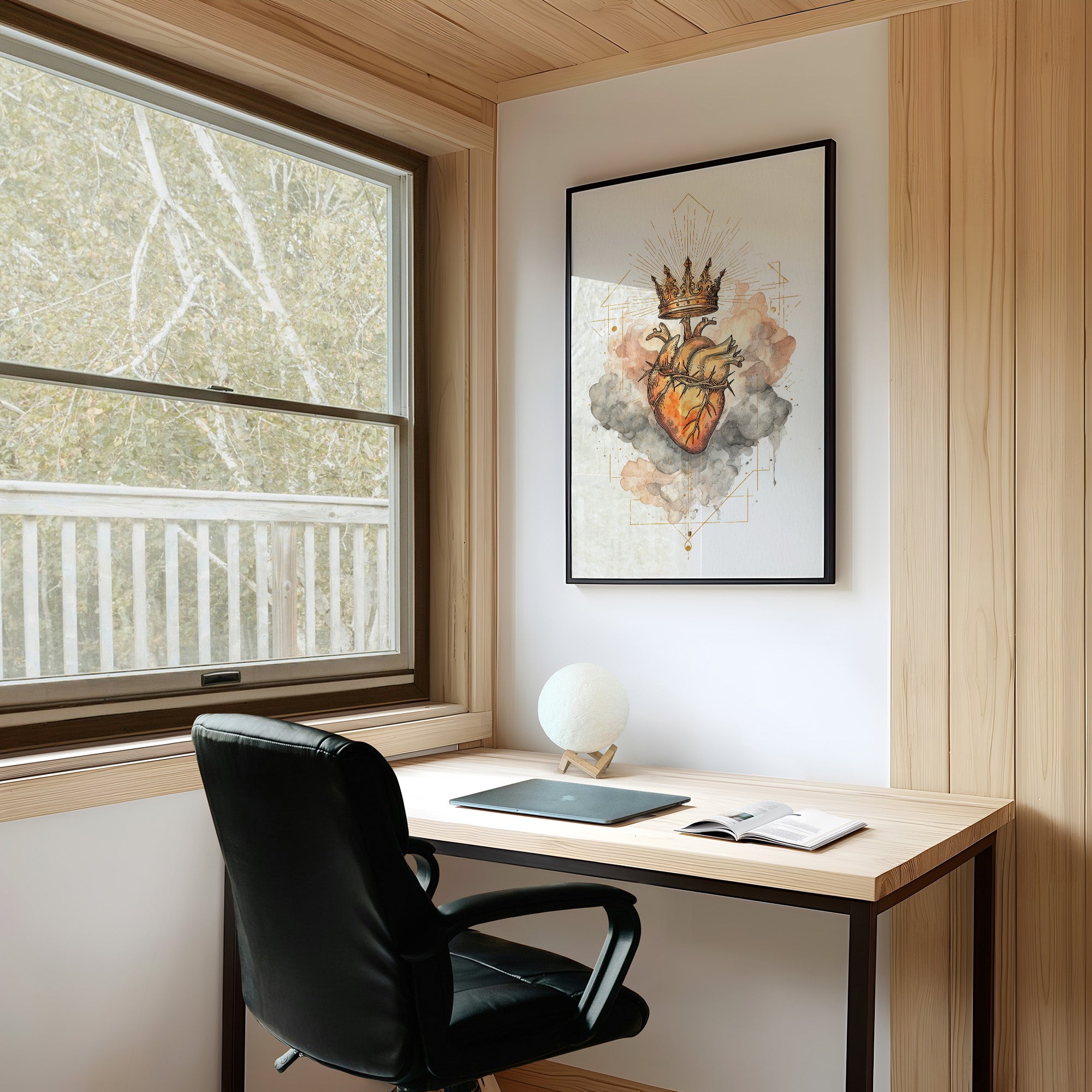 Sunlight catches on gilded edges where anatomy meets artistry. The anatomical heart crowned in gold rests amid watercolor clouds of peach and gray, its detailed veins and chambers rendered with scientific precision yet artistic soul. Golden geometric lines frame the composition, creating a modern sacred geometry that elevates the organic form to regal status. This piece brings contemplative elegance to a study space, creative corner, or as a statement in a minimalist bedroom where it invites reflection on what truly rules our lives.