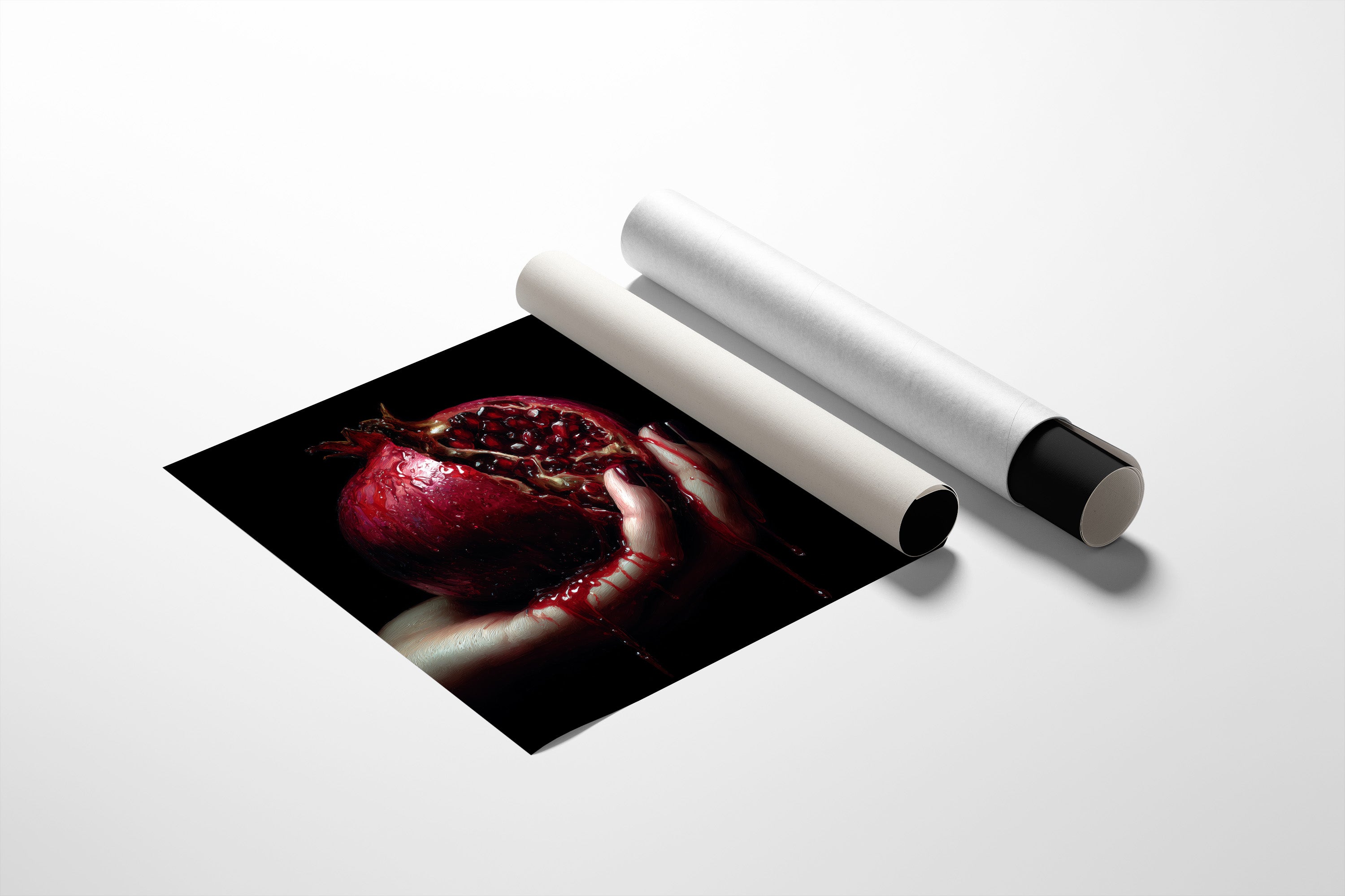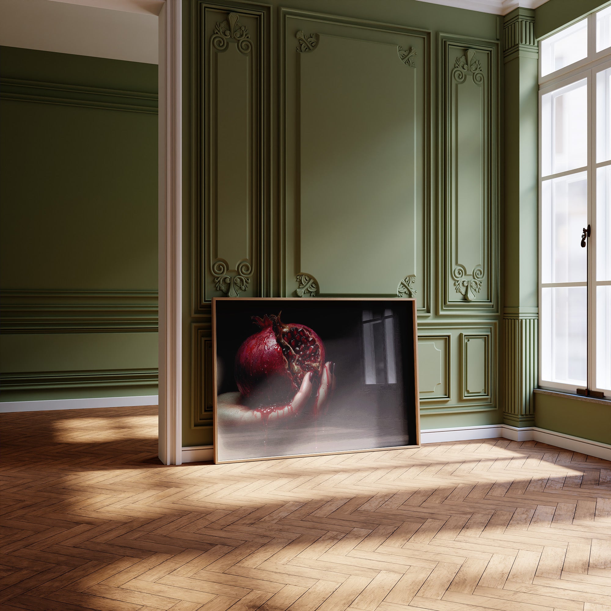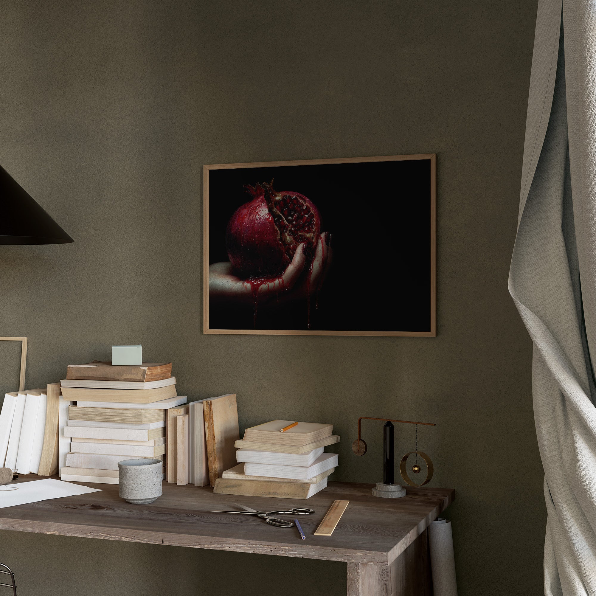Crimson juice cascades between pale fingers, a forbidden fruit surrendering its treasures. The pomegranate's split skin reveals a constellation of glistening seeds against the void of perfect darkness, each translucent aril catching light like tiny rubies. The dramatic contrast between the fruit's vivid scarlet and the black backdrop creates a moment suspended between beauty and violence, temptation and consequence. This striking piece would command attention in a modern dining space or kitchen where its rich colors and provocative imagery invite contemplation of nature's exquisite brutality.