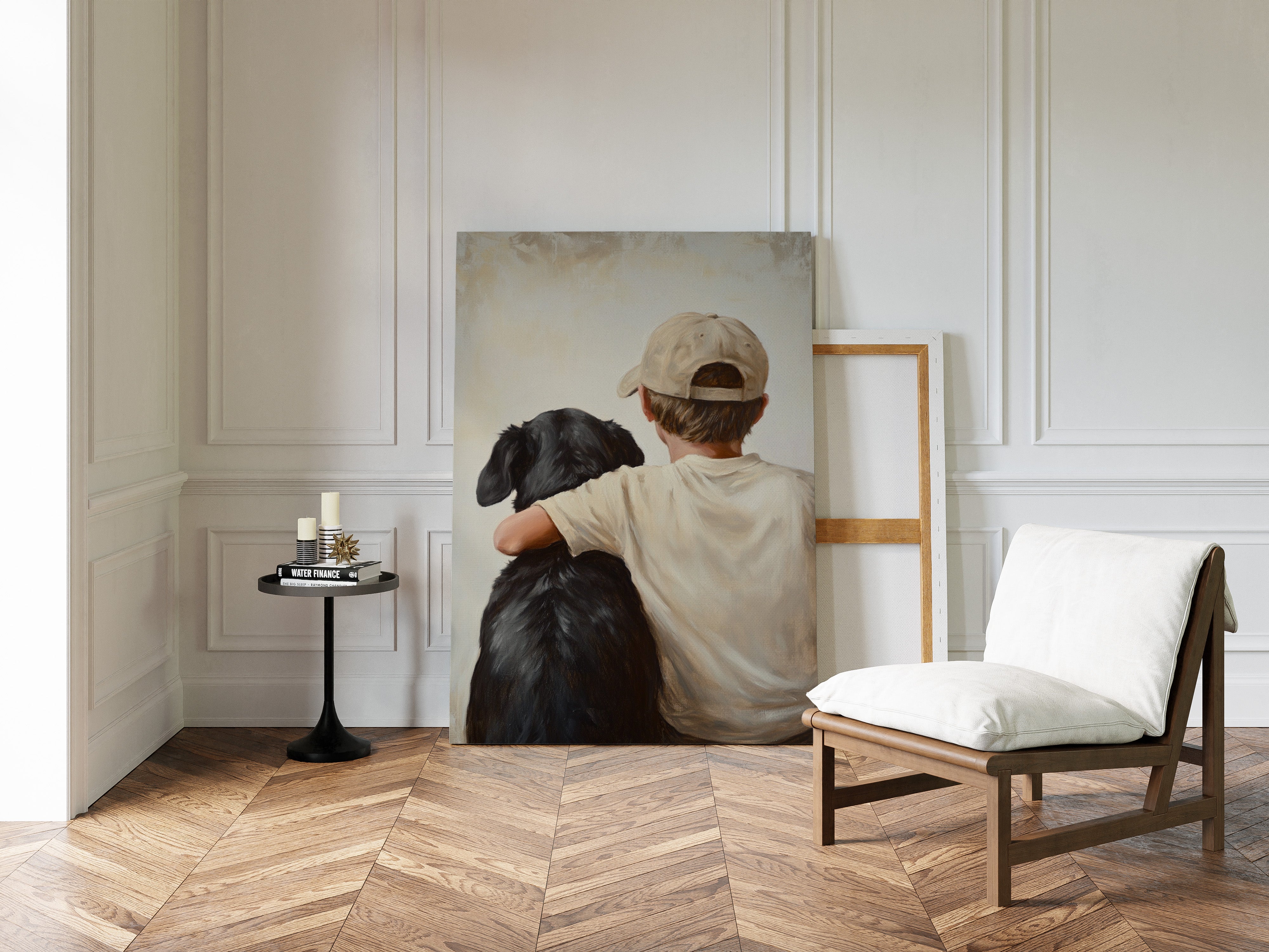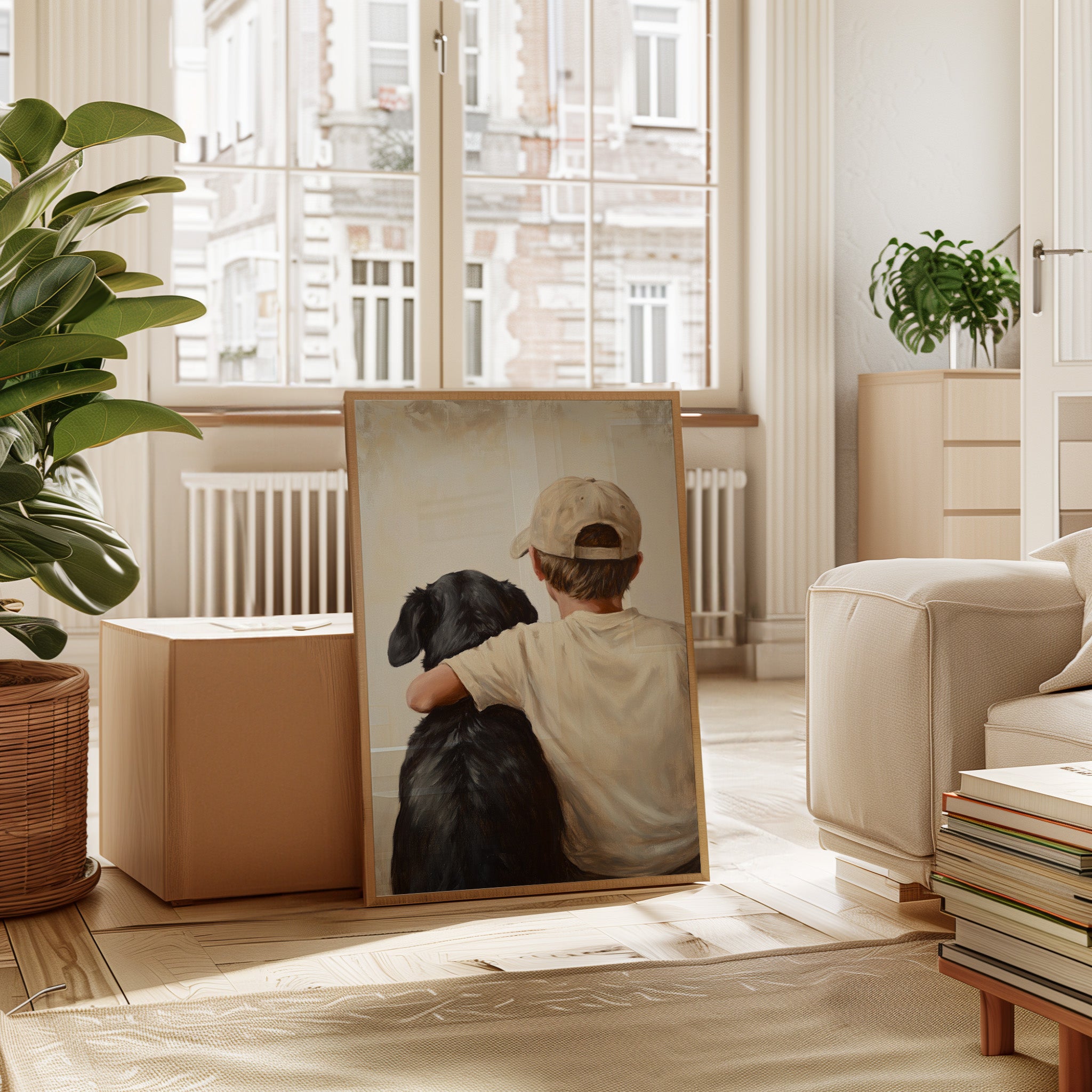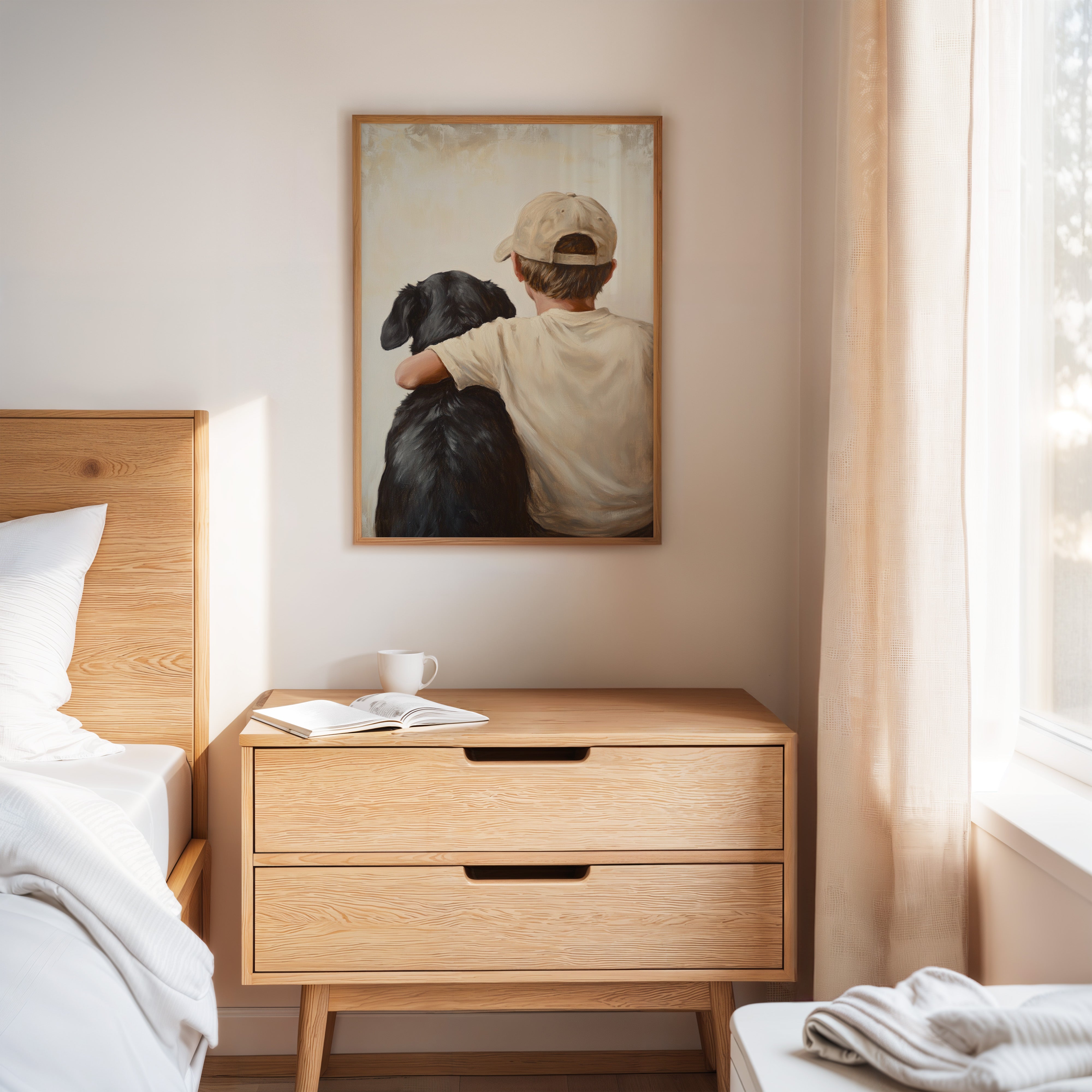 Step into a world where nostalgia meets warmth with 'Rustic Companionship Reverie.' This evocative piece captures the serene bond between a boy and his loyal canine friend, set against a backdrop of cozy, earthy tones. Perfect for those who cherish moments of simplicity and heartfelt connections, this artwork brings a sense of tranquility and timelessness to any space. Let it grace your living room or study, inviting contemplation and a touch of rustic charm.