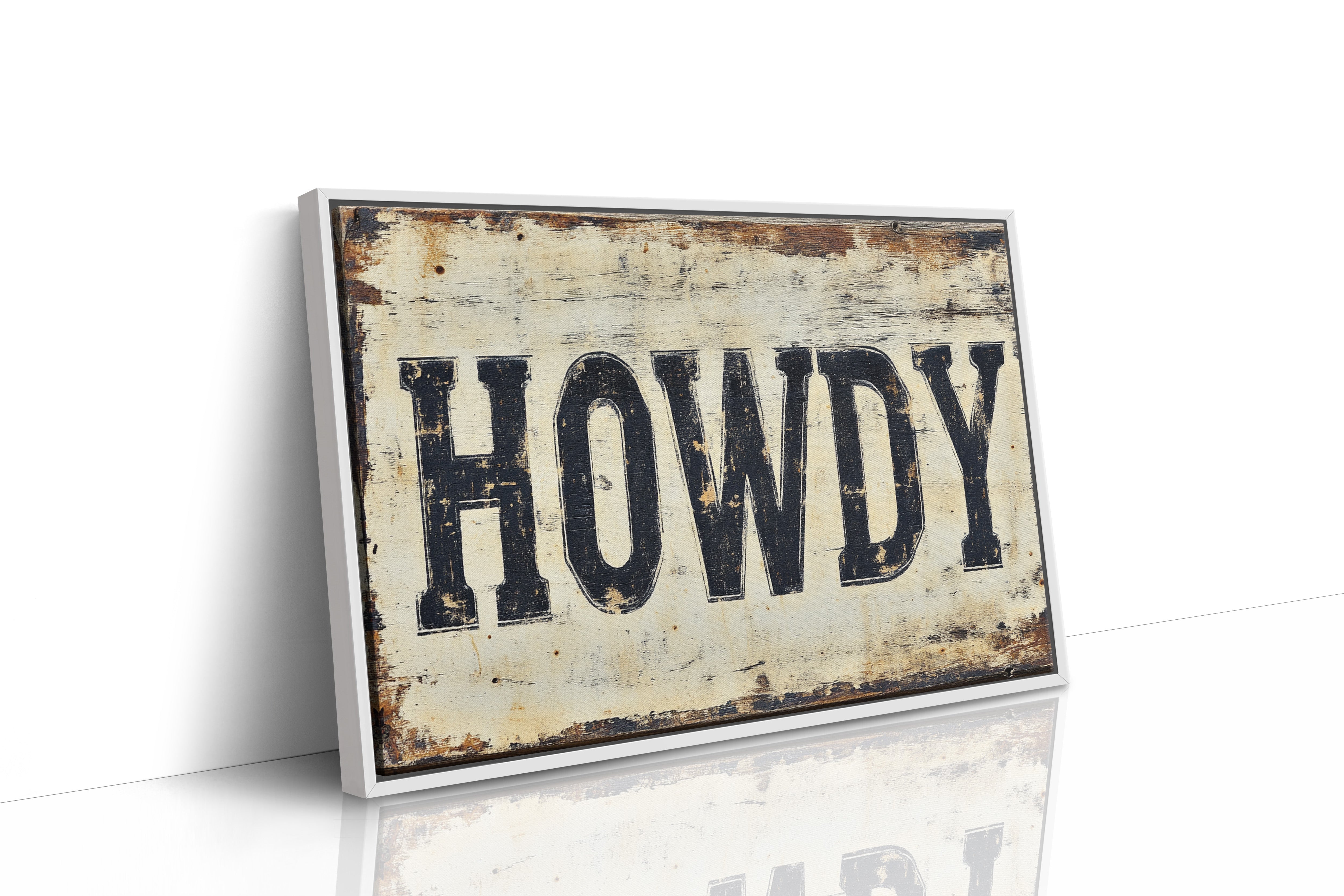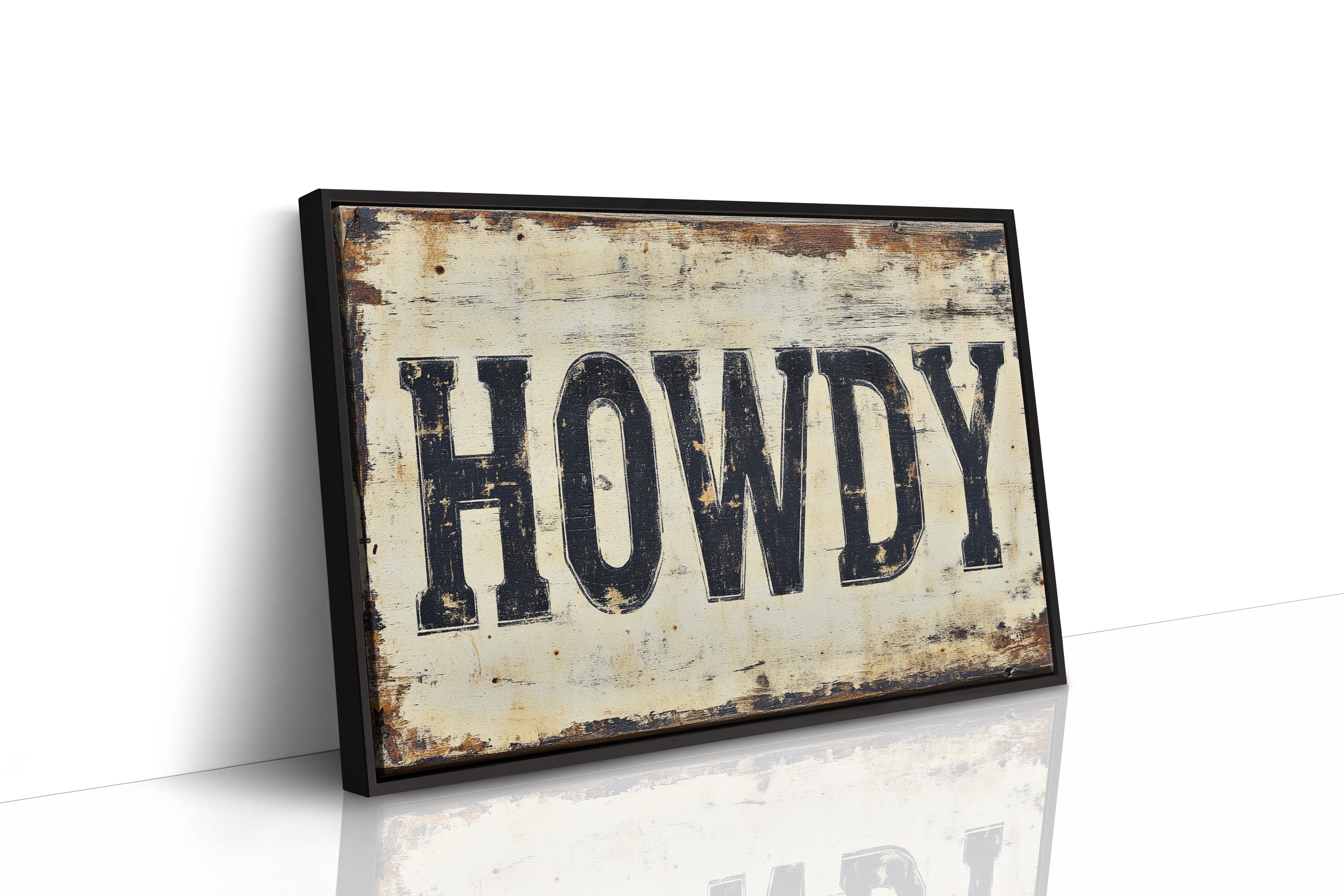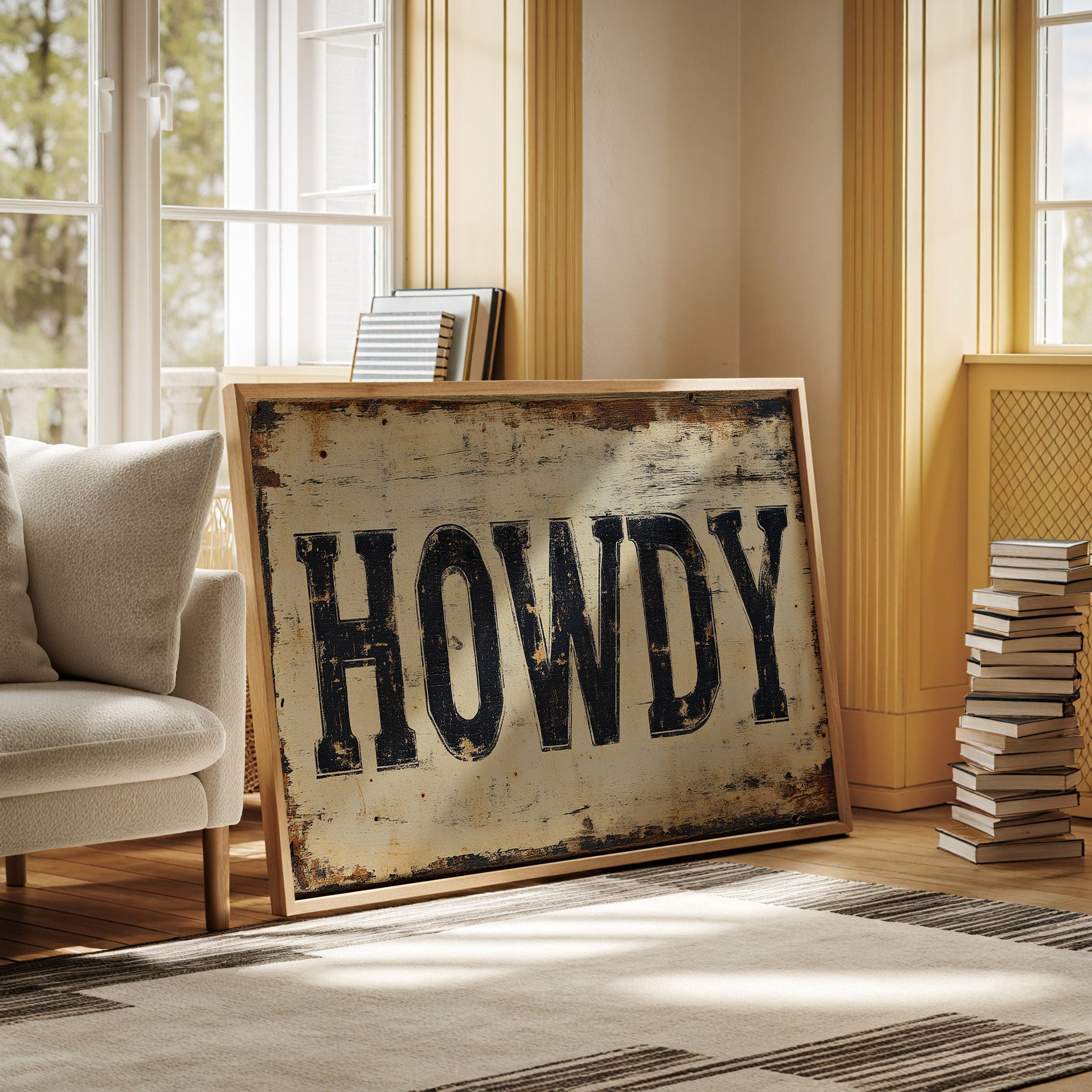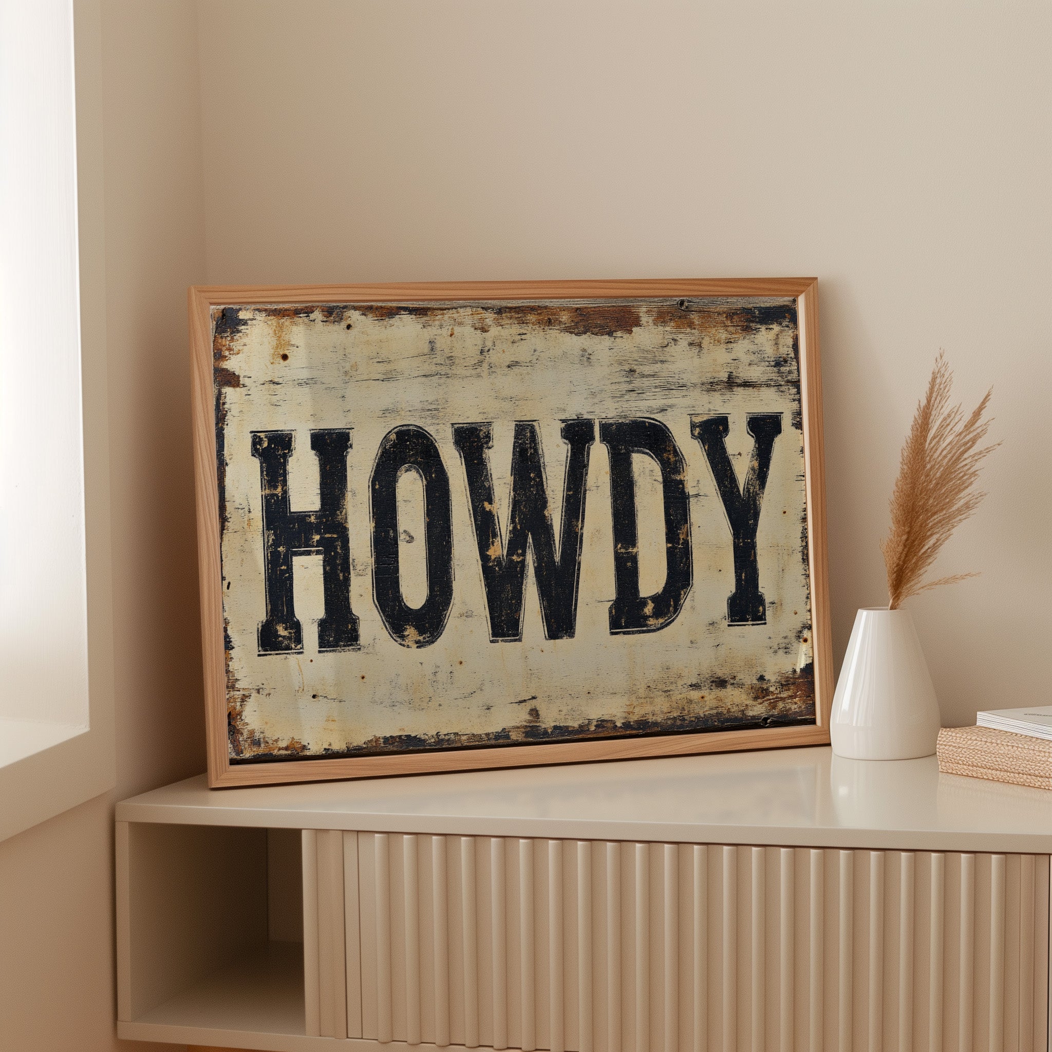 Greet guests with cowboy flair using this bold and rustic “Howdy” sign artwork. Featuring distressed black lettering on a weathered cream background, this vintage-style piece is bursting with Wild West personality. Whether you're decorating a farmhouse, a western-themed space, or simply adding a friendly touch to your walls, this print delivers warmth and character in spades.