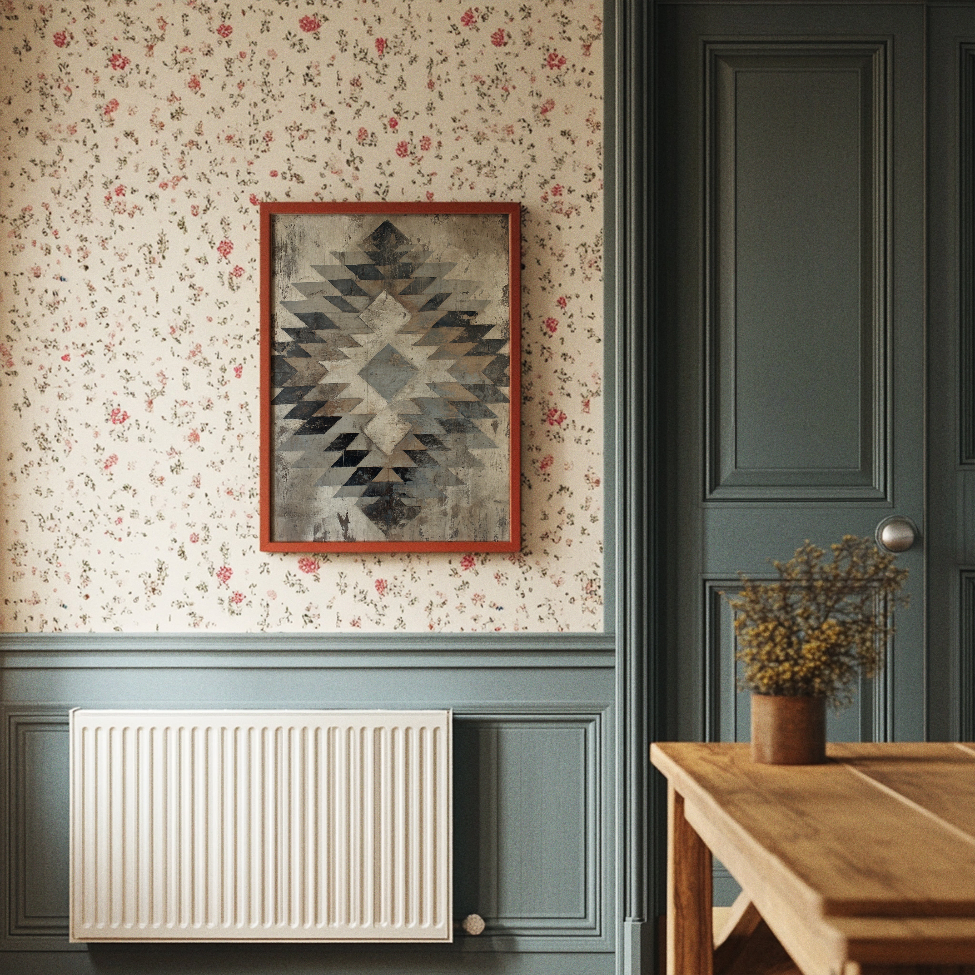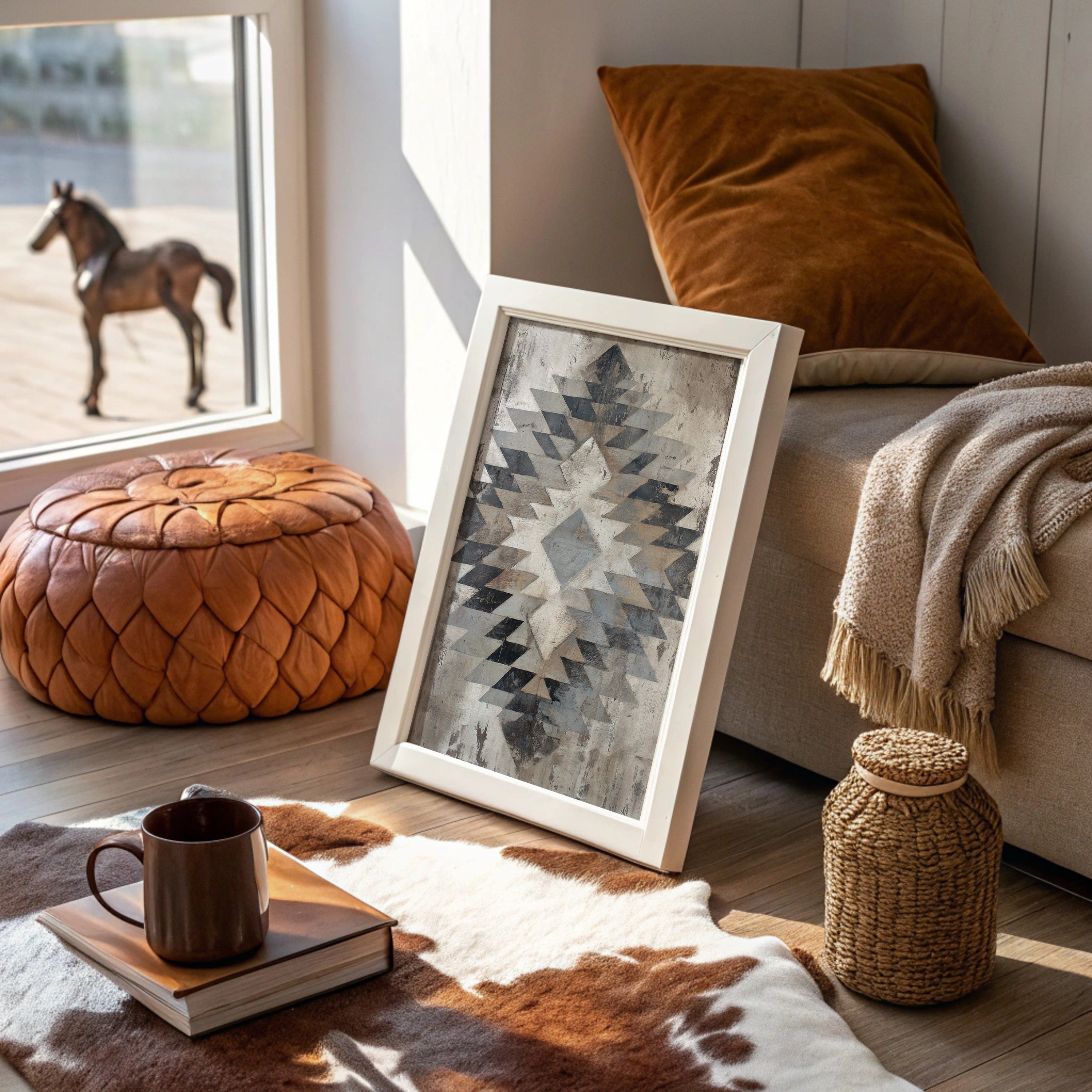 Where weathered wood meets geometric grace, a modern southwestern story unfolds. The distressed planks provide a perfect backdrop for the striking angular artwork, while a stately leather sofa and towering cactus add authentic desert charm. Industrial pendant lights cast a warm glow across the space, creating an inviting atmosphere that balances rugged and refined elements. This contemporary southwestern aesthetic would elevate a living room, home office, or creative studio space seeking to capture that perfect blend of modern comfort and desert authenticity.