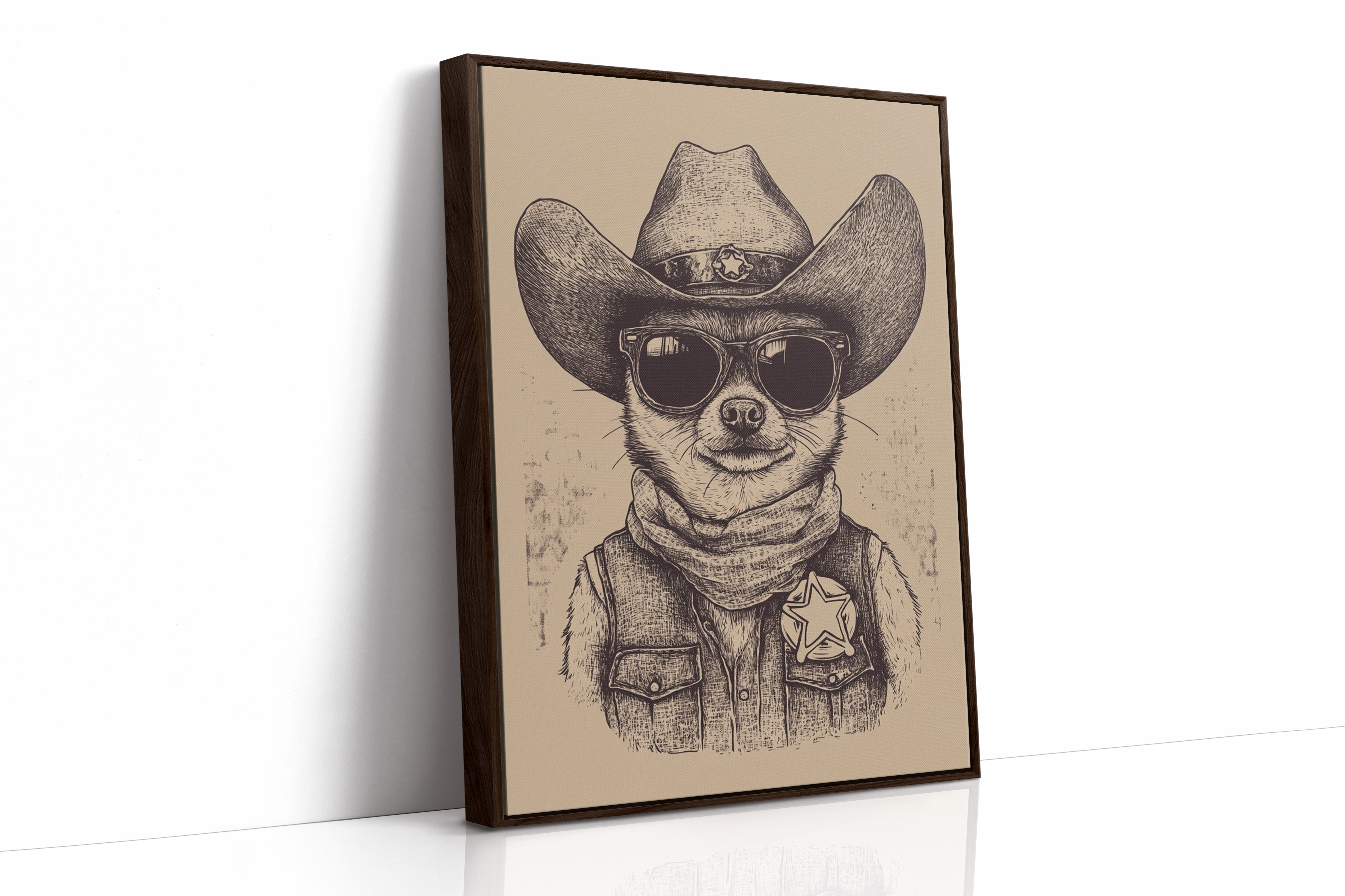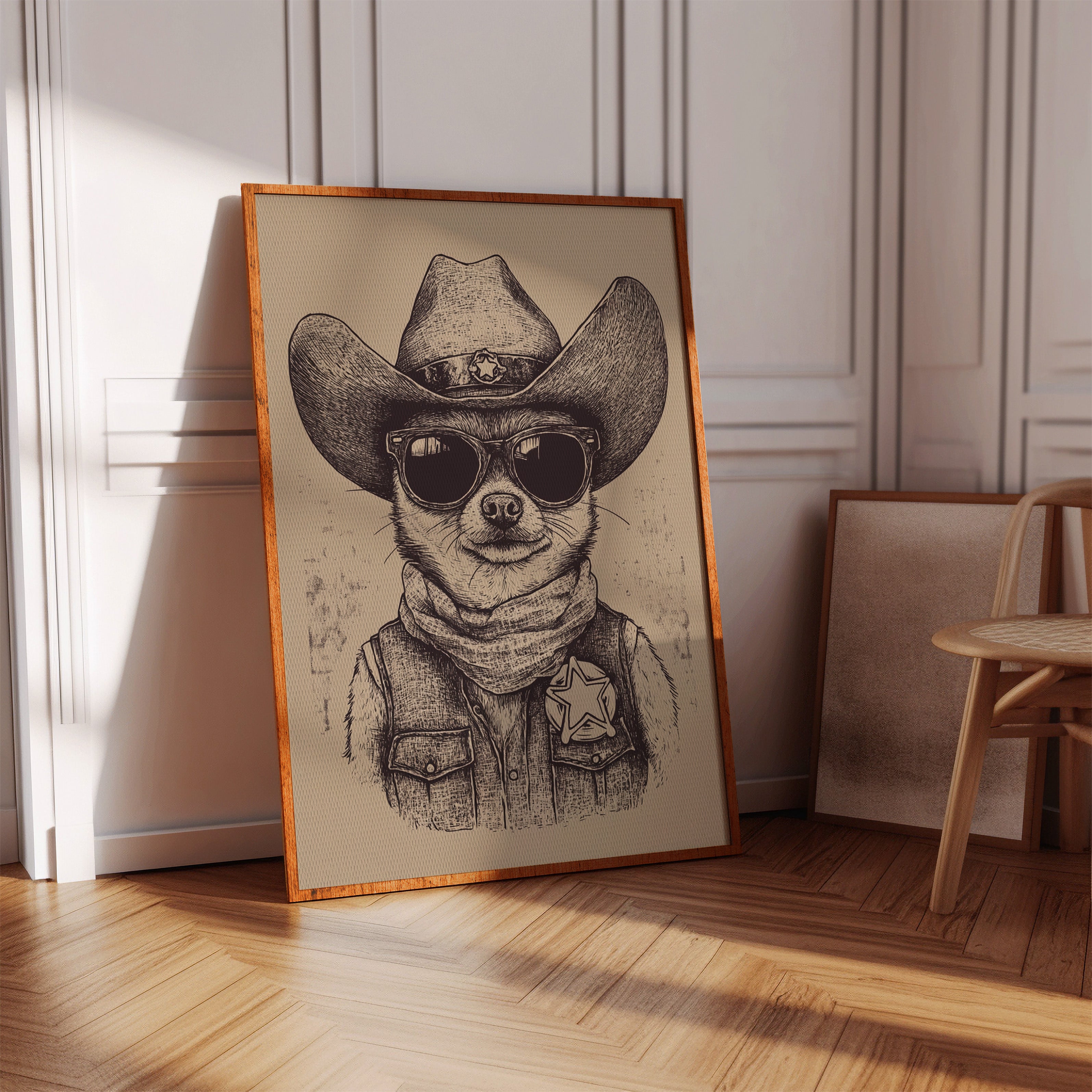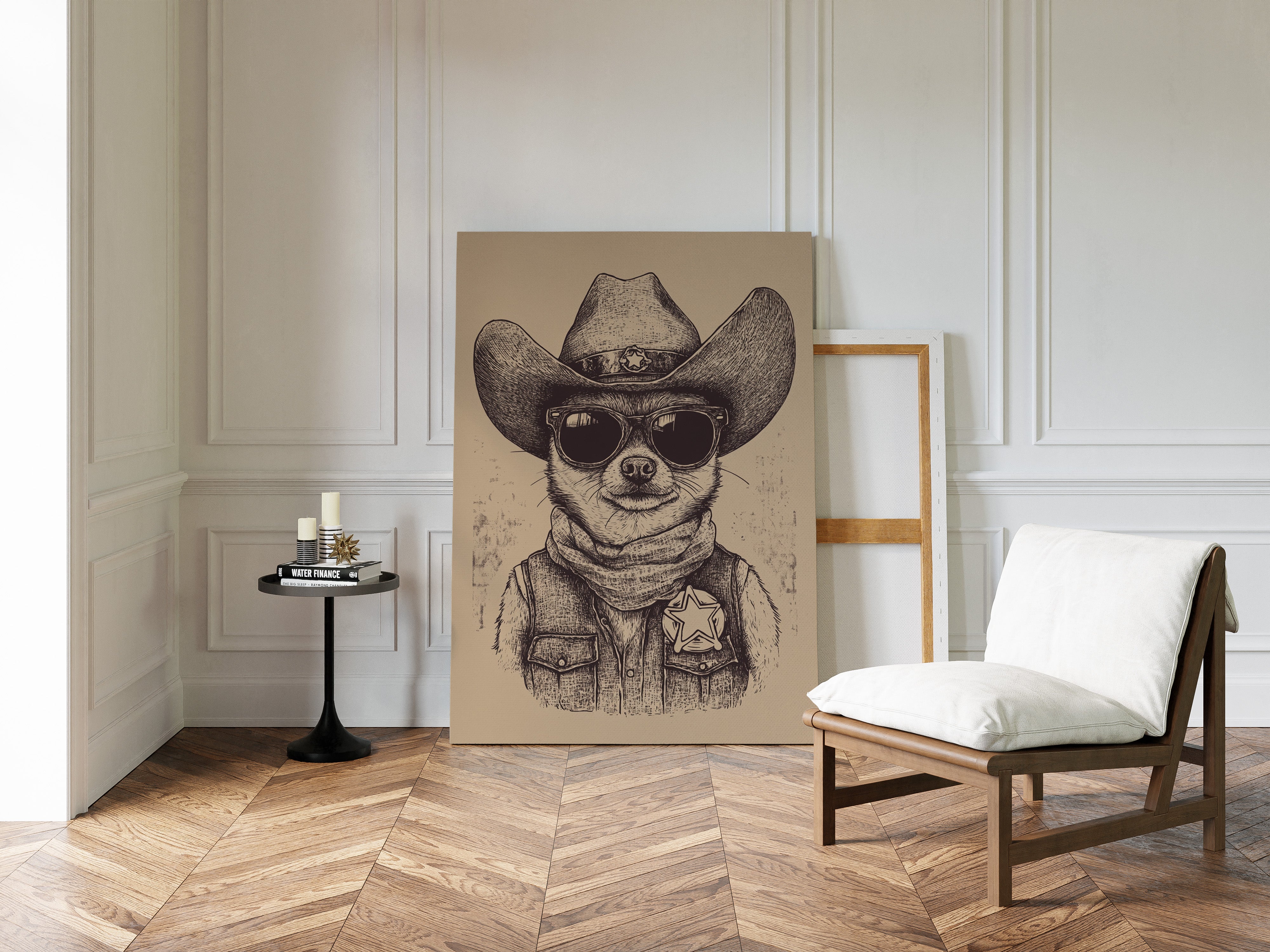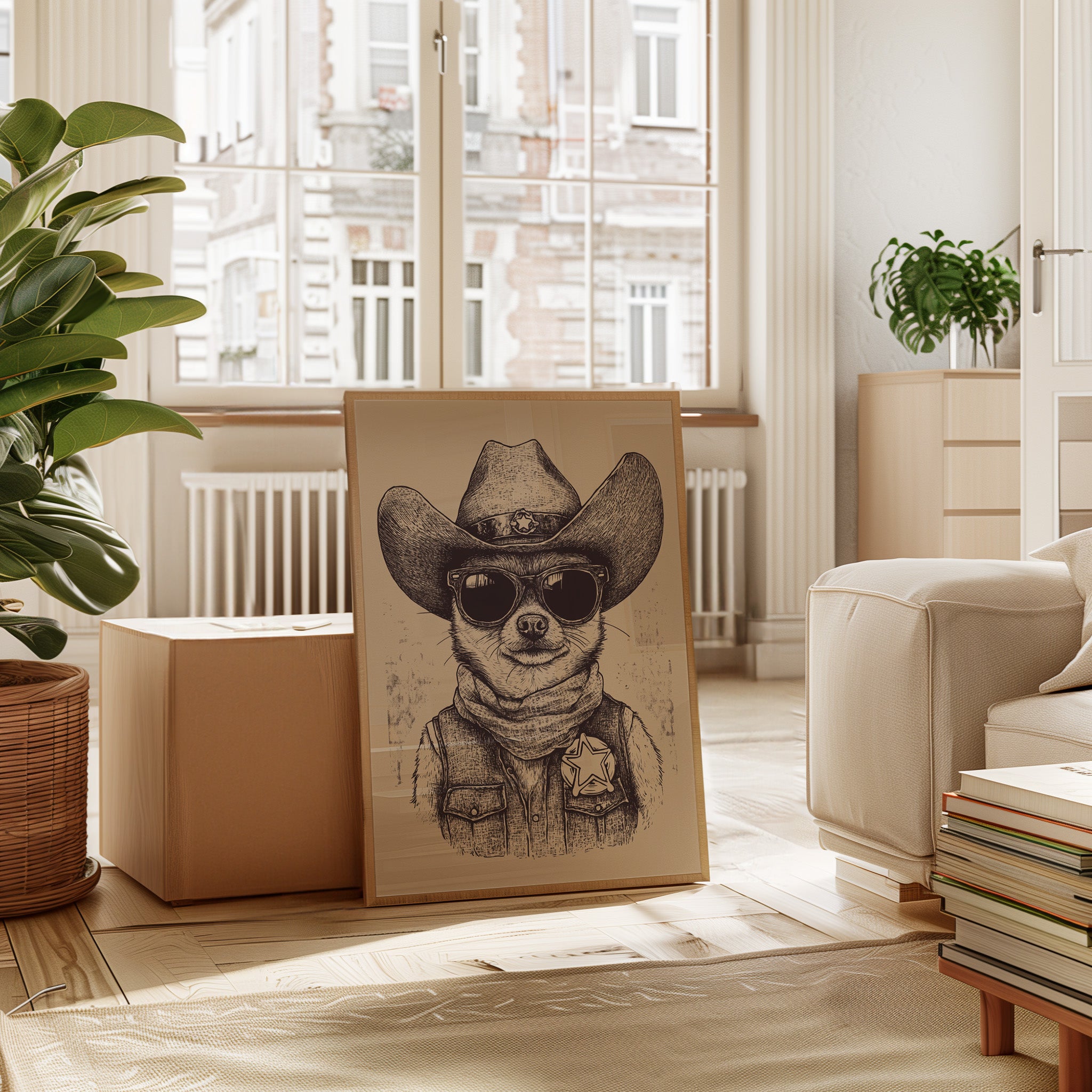 Step into a whimsical world where the Wild West meets modern flair with this unique art piece, 'Rustic Sheriff Reverie.' Featuring a charming anthropomorphic animal dressed as a sheriff, complete with sunglasses and a cowboy hat, this artwork blends humor and nostalgia. The textured, monochrome line art on a rustic background adds a touch of rustic charm to any space, making it perfect for eclectic and maximalist decor lovers. Let this piece be the conversation starter in your living room, office, or creative space, offering a playful nod to both vintage and contemporary aesthetics.