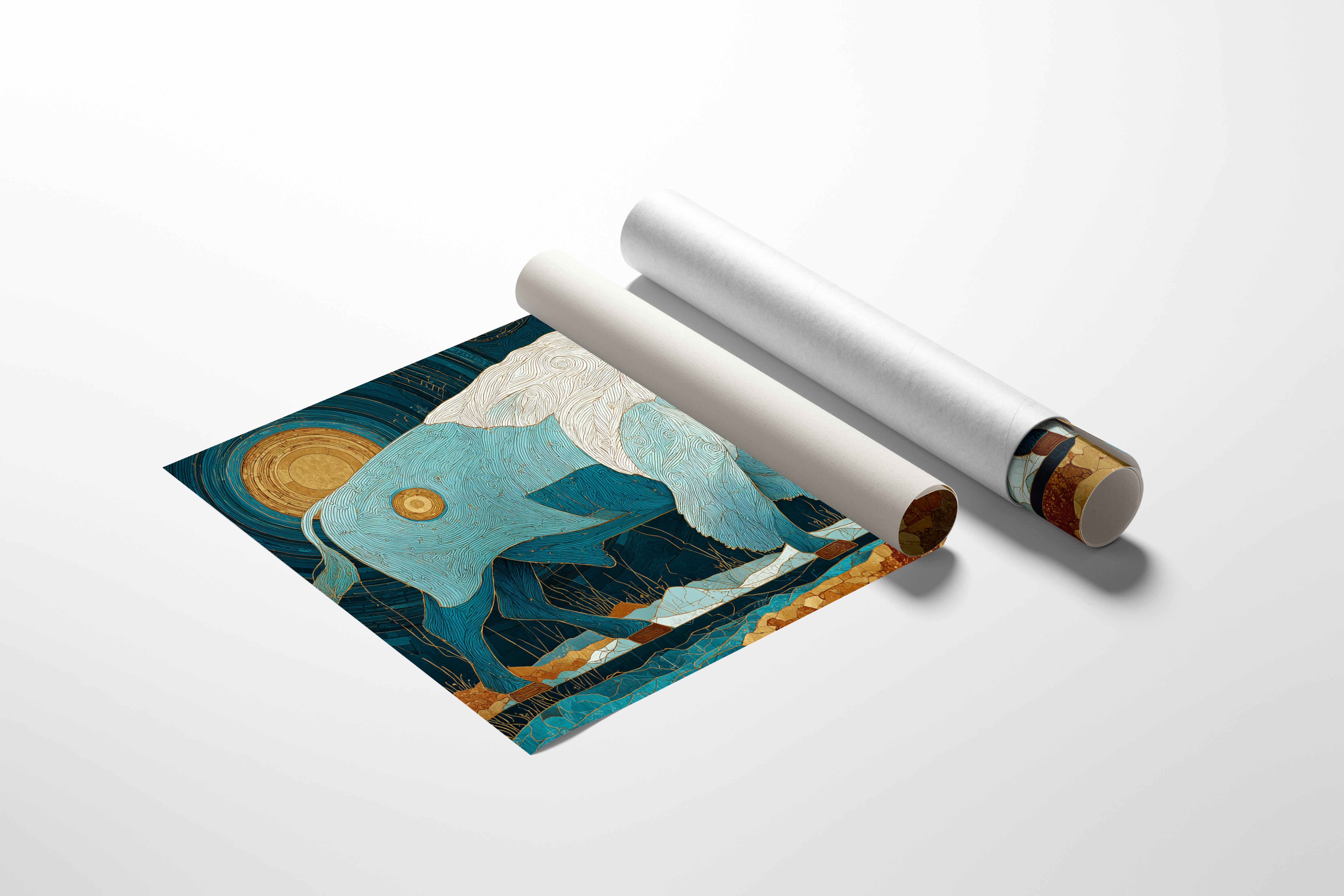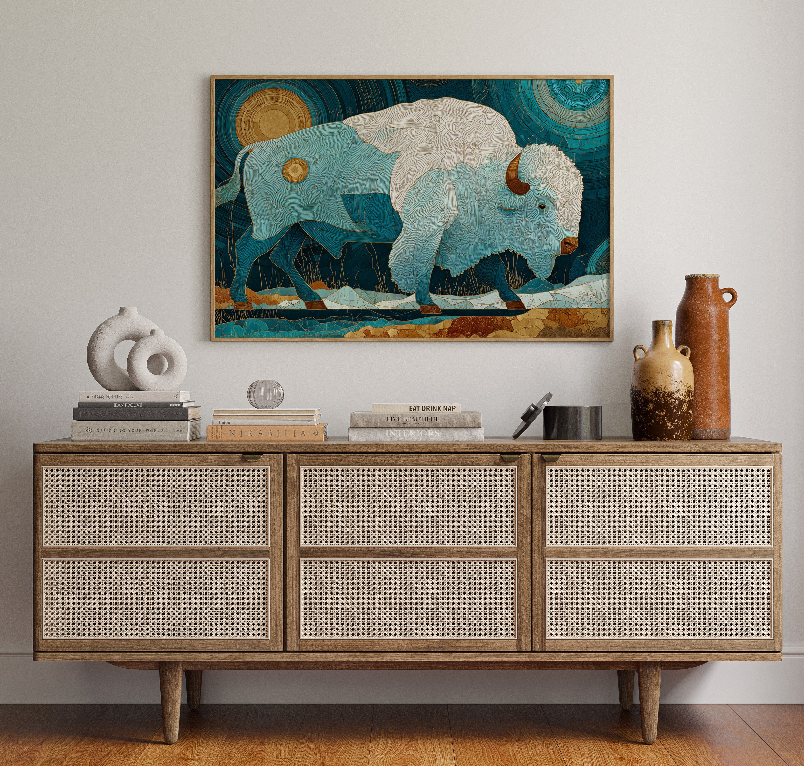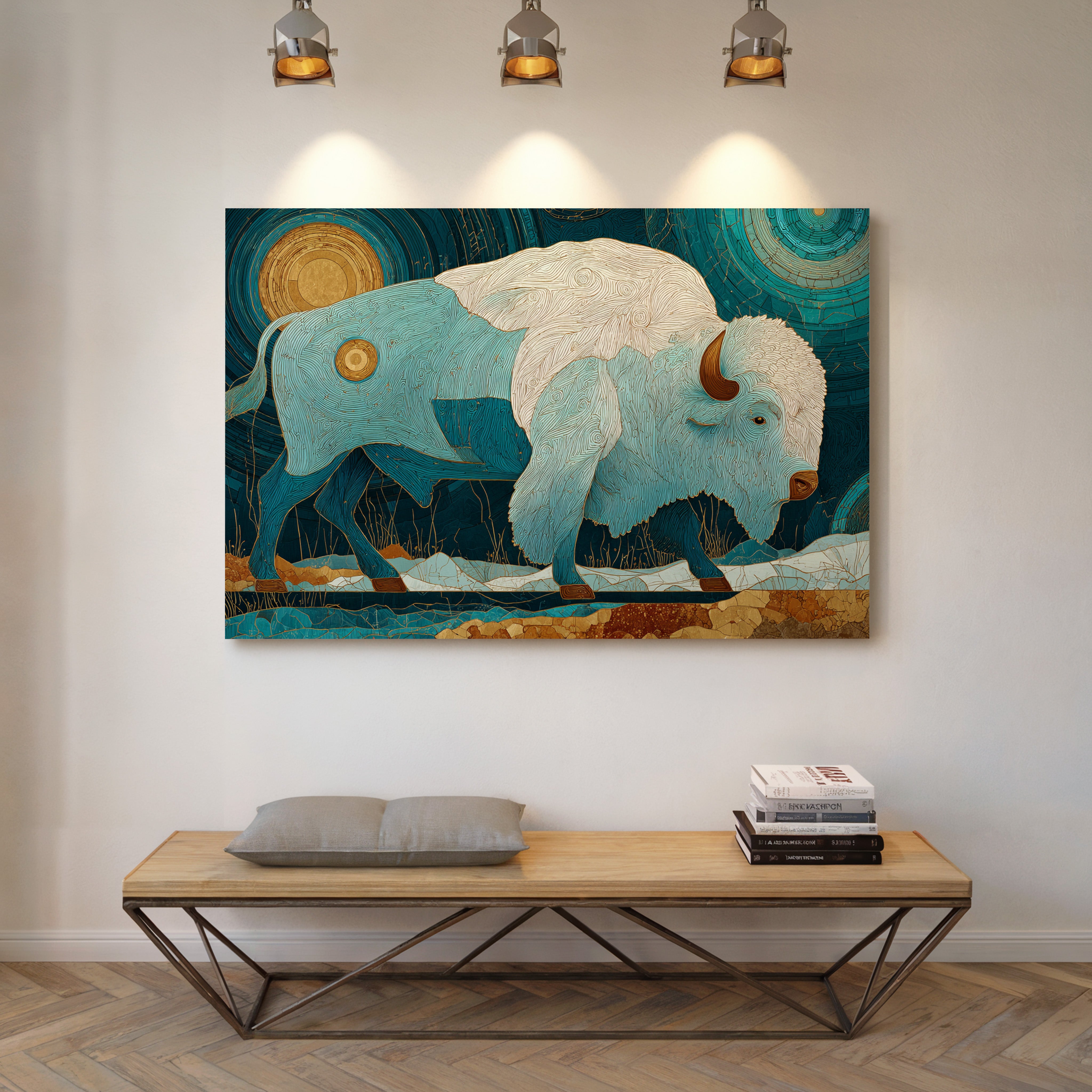 Against a star-studded night, two majestic bison move with ancient grace across a crystalline landscape. Their forms, rendered in ethereal turquoise and ivory, tell stories of wilderness and wisdom beneath golden celestial bodies. Intricate line work flows through their massive frames like topographic maps of unexplored territories, while the deep teal sky holds multiple moons in a mystical dance. This piece captures both the physical power and spiritual significance of these noble creatures.
