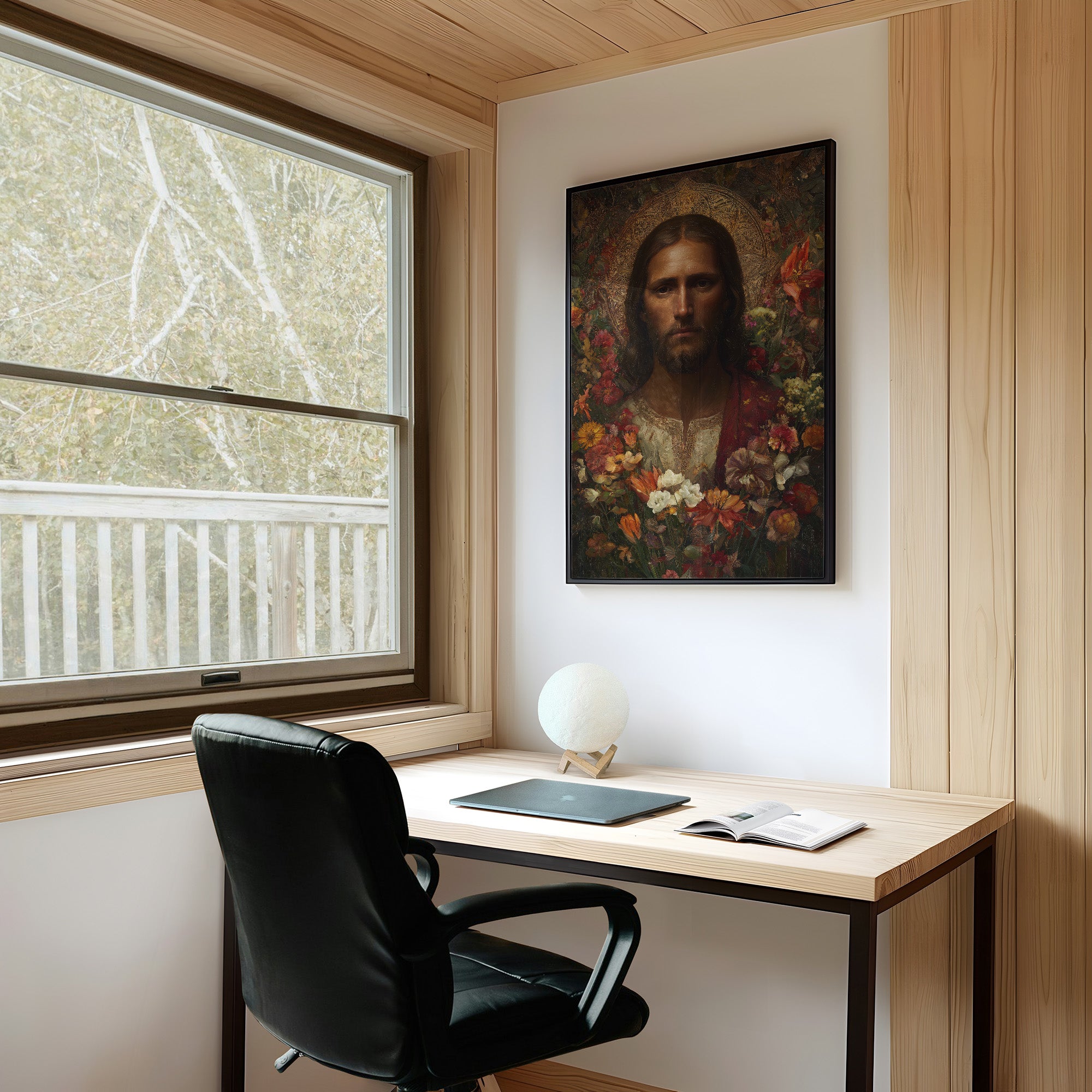 Warm light spills across weathered wood, illuminating a portrait where divinity meets nature's abundance. Rich floral elements in crimson, gold, and ivory encircle the central figure, creating a tapestry of reverence through botanical splendor. The ornate gold halo and thoughtful expression invite contemplation against the backdrop of vibrant blooms that seem to breathe with life.