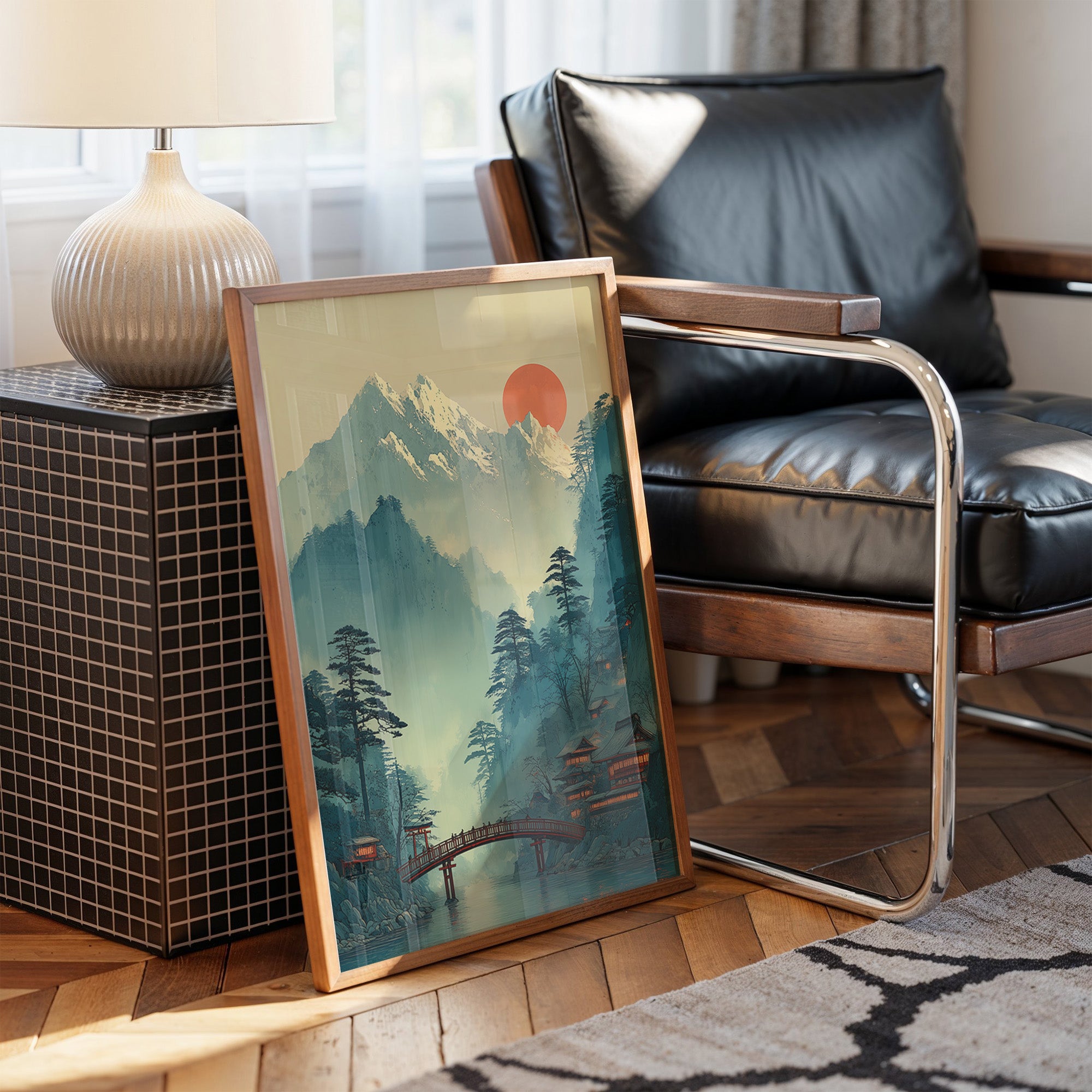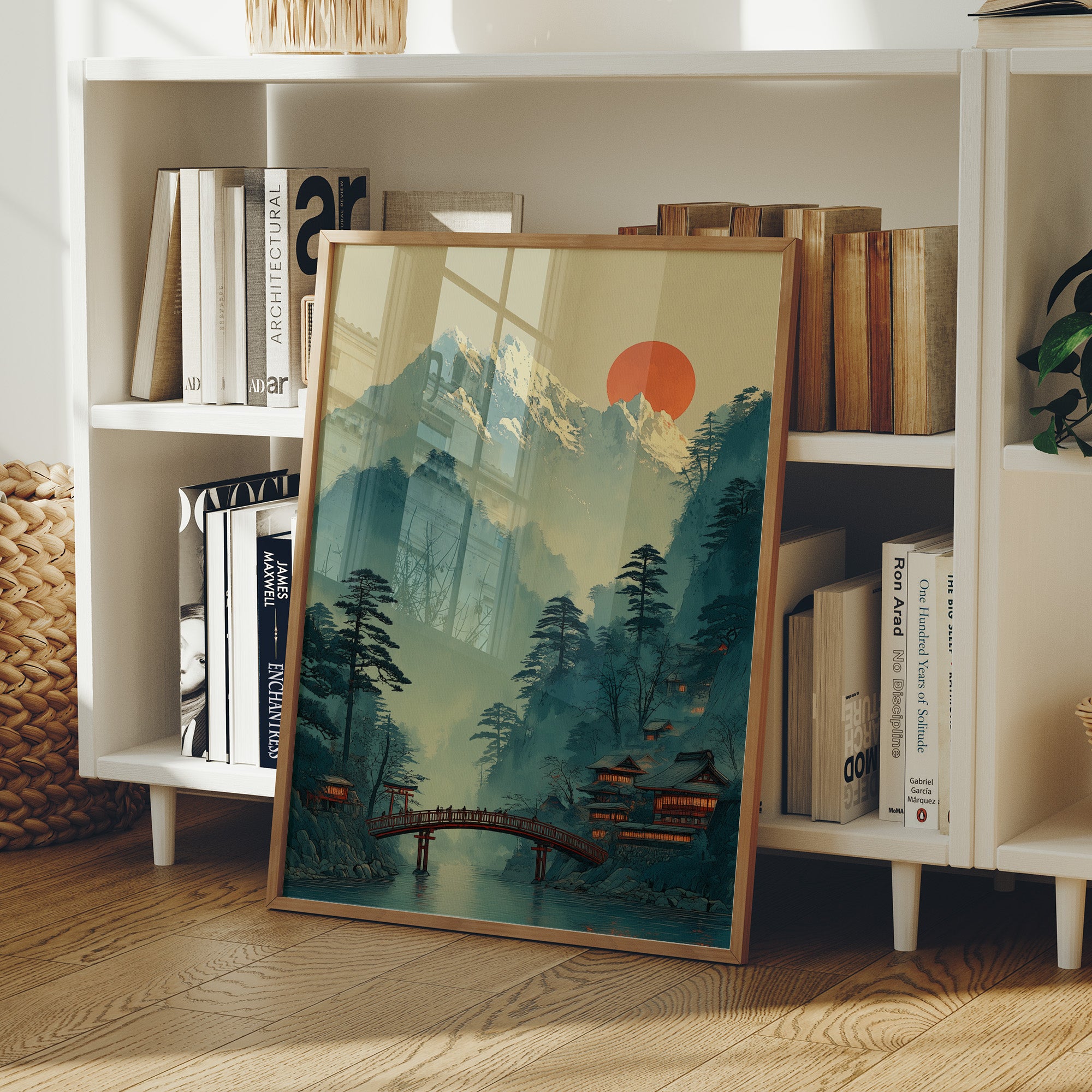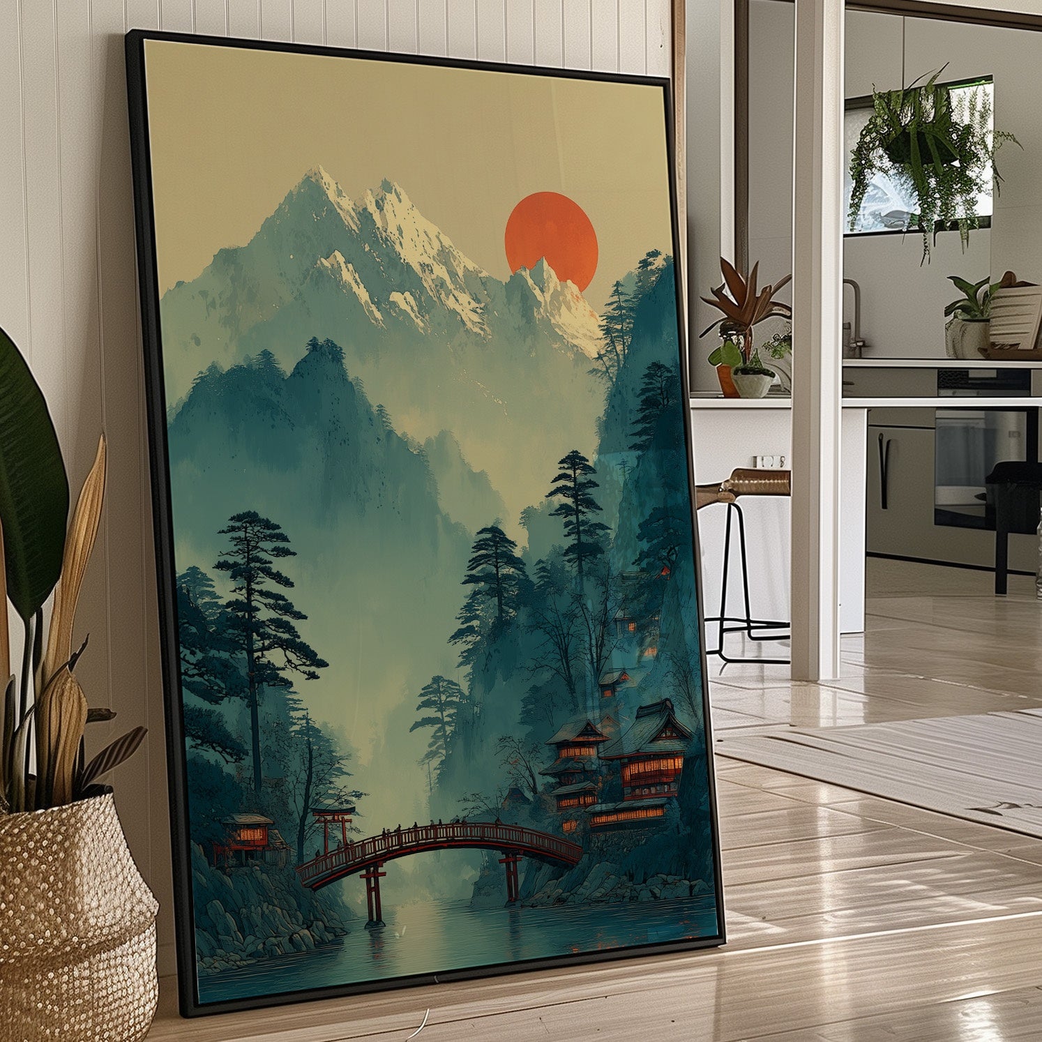 A tranquil Japanese landscape bathes in the ethereal glow of a crimson sun. Towering snow-capped mountains pierce through layers of azure mist, while ancient pine trees stand sentinel along rocky cliffs. The wooden bridge and traditional architecture nestled within the valley create a harmonious dialogue between human craft and nature's grandeur. The scene captures a perfect balance of serenity and majesty, rendered in rich teals and warm oranges that speak to both dawn and dusk. This serene piece would bring contemplative calm to a reading nook or meditation space, its balanced composition offering a window into a world where time moves more slowly.