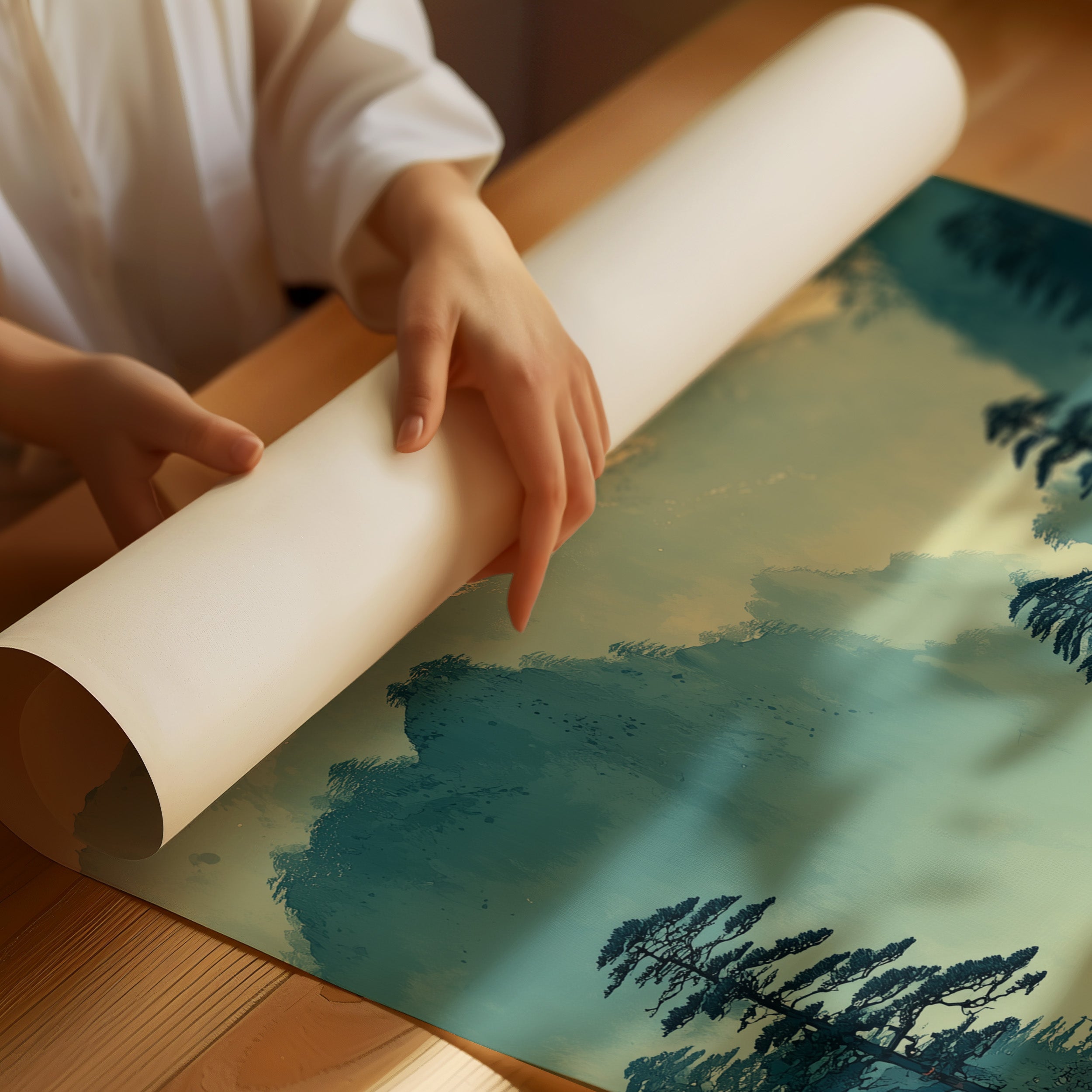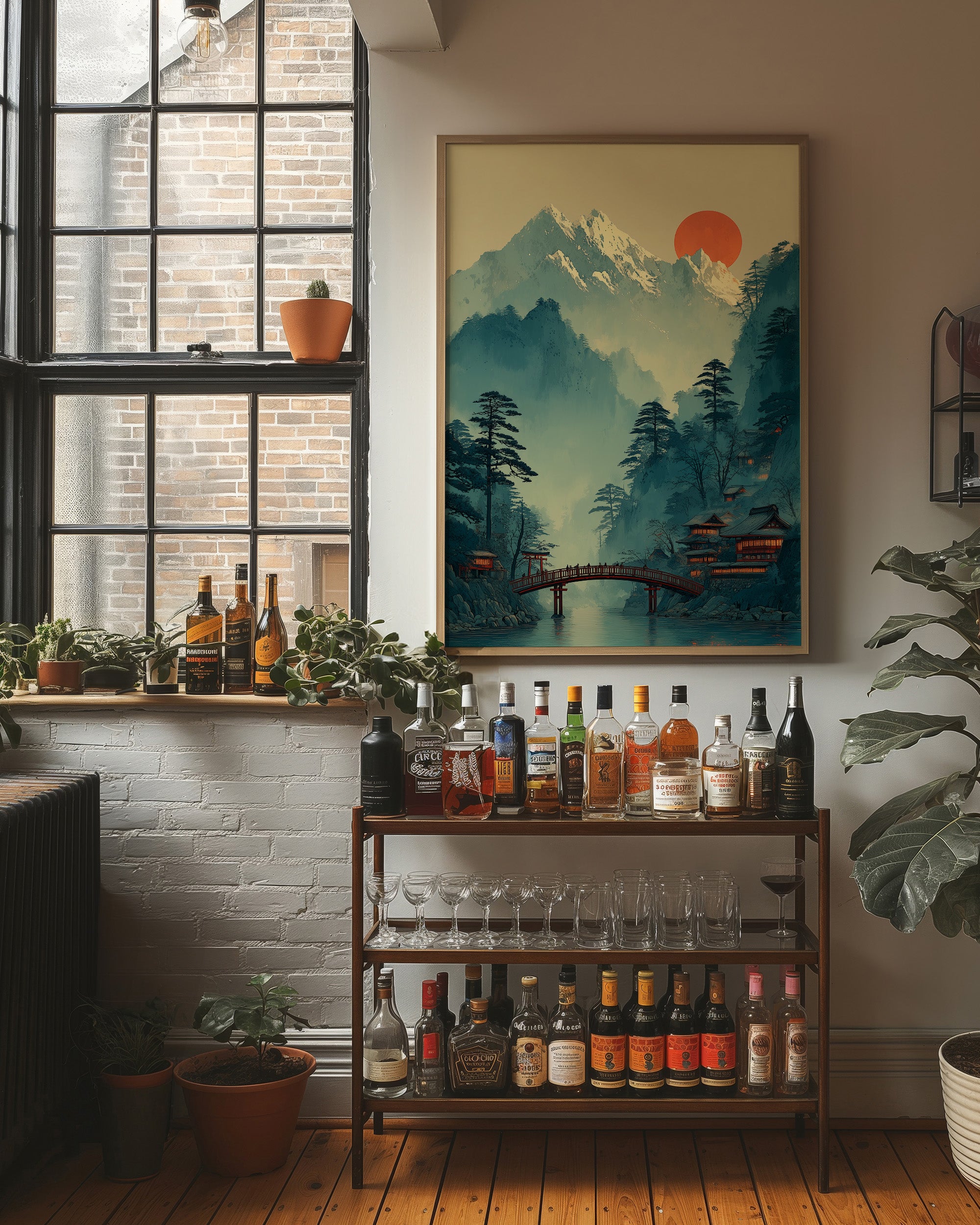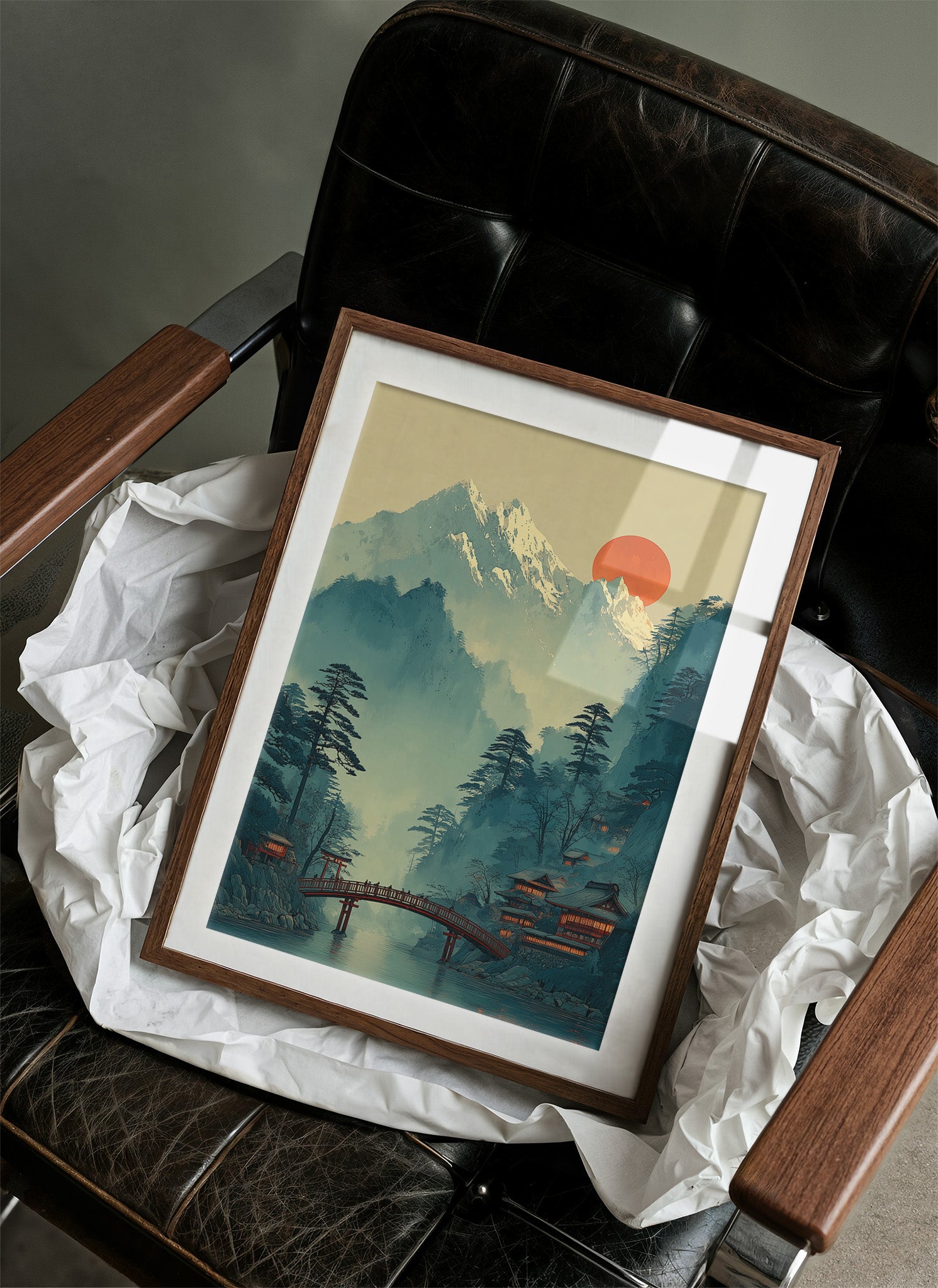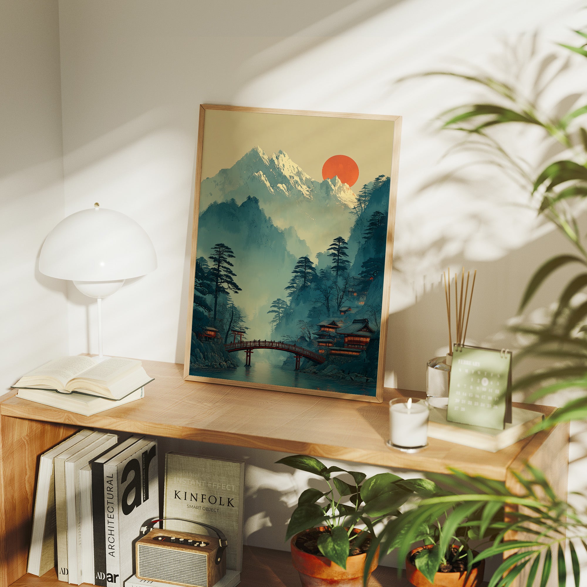 A tranquil Japanese landscape bathes in the ethereal glow of a crimson sun. Towering snow-capped mountains pierce through layers of azure mist, while ancient pine trees stand sentinel along rocky cliffs. The wooden bridge and traditional architecture nestled within the valley create a harmonious dialogue between human craft and nature's grandeur. The scene captures a perfect balance of serenity and majesty, rendered in rich teals and warm oranges that speak to both dawn and dusk. This serene piece would bring contemplative calm to a reading nook or meditation space, its balanced composition offering a window into a world where time moves more slowly.