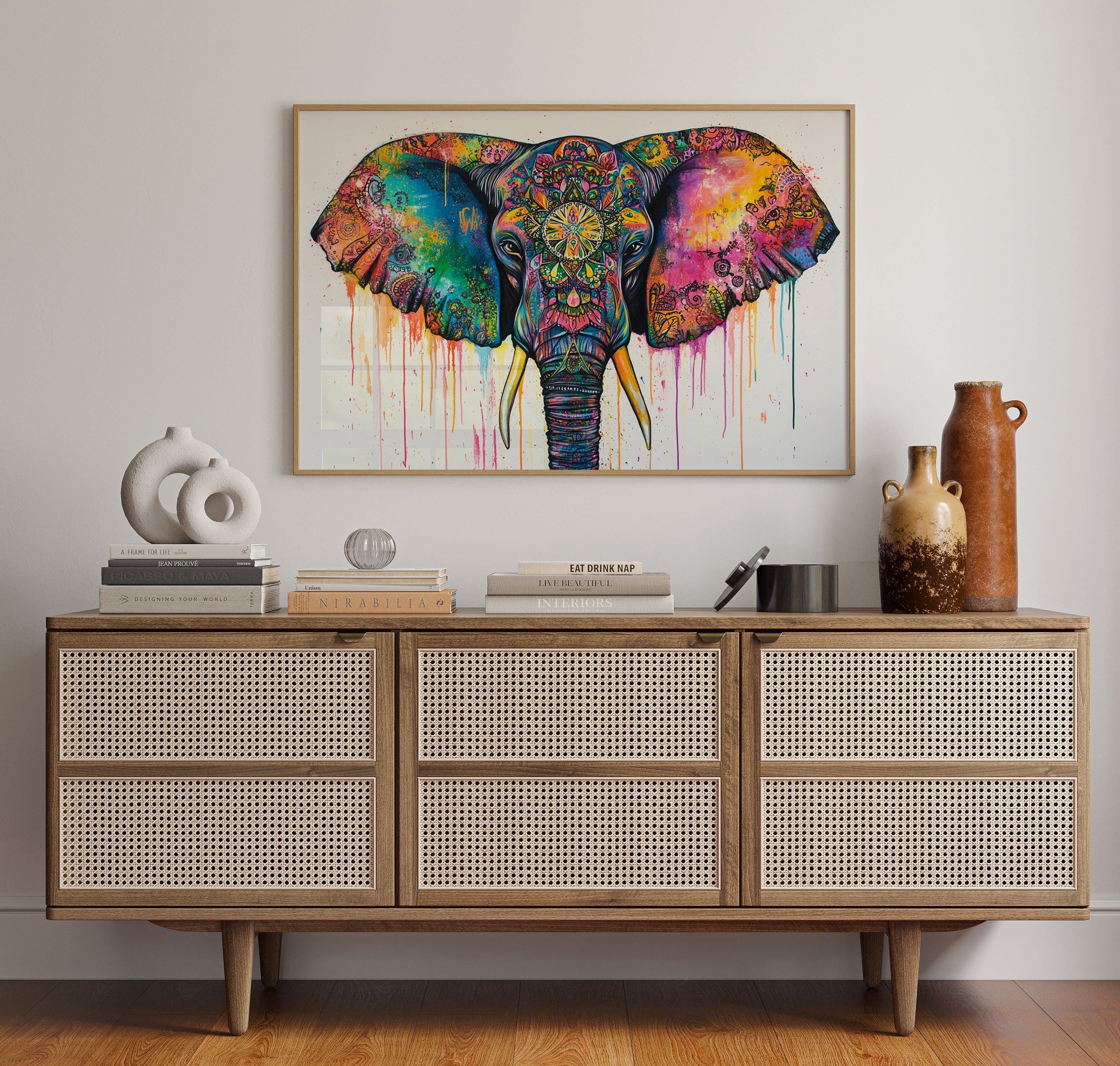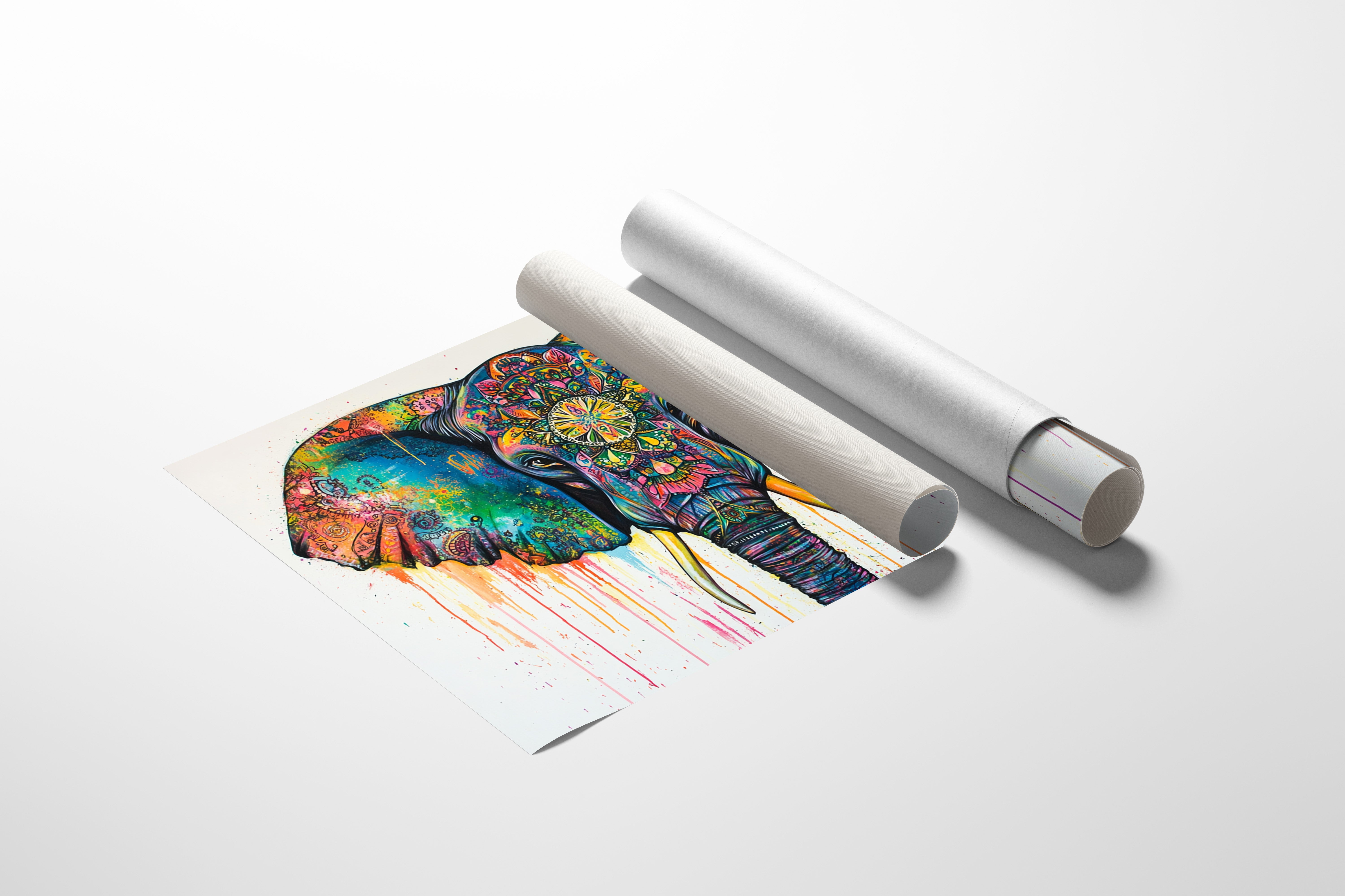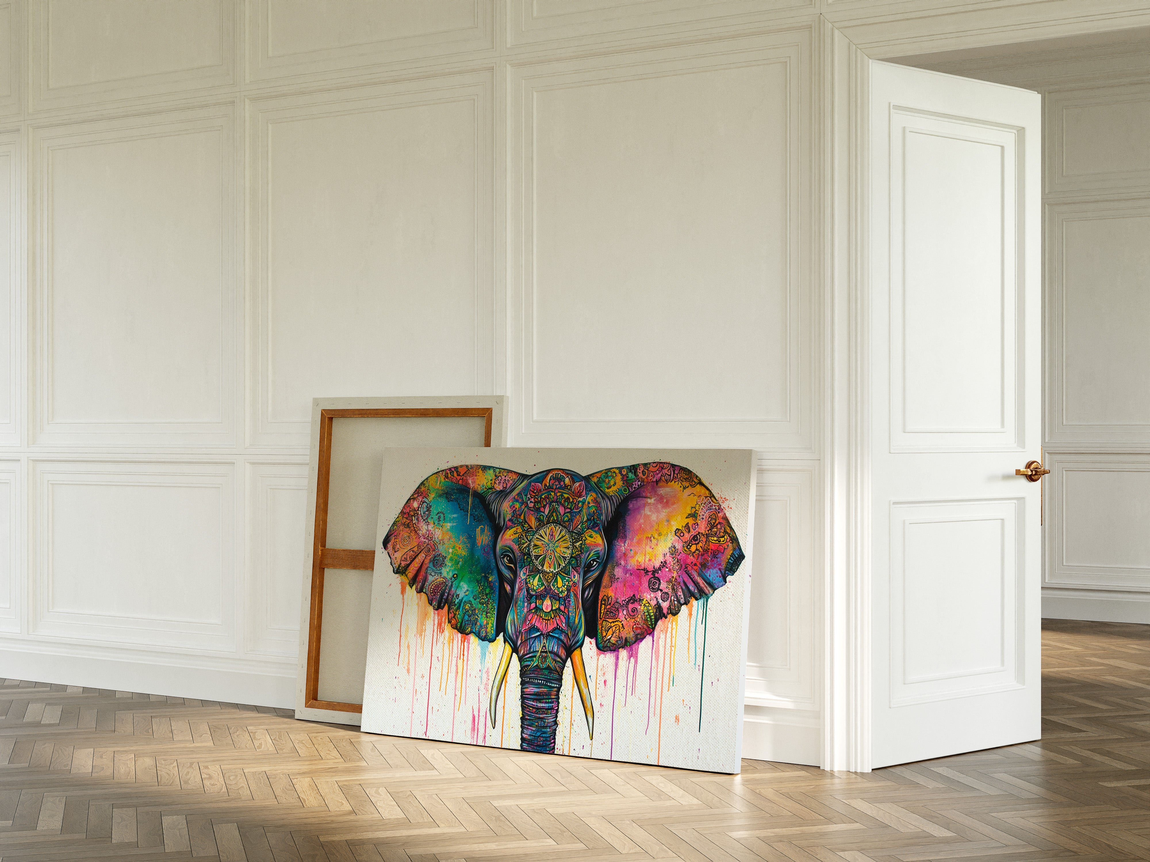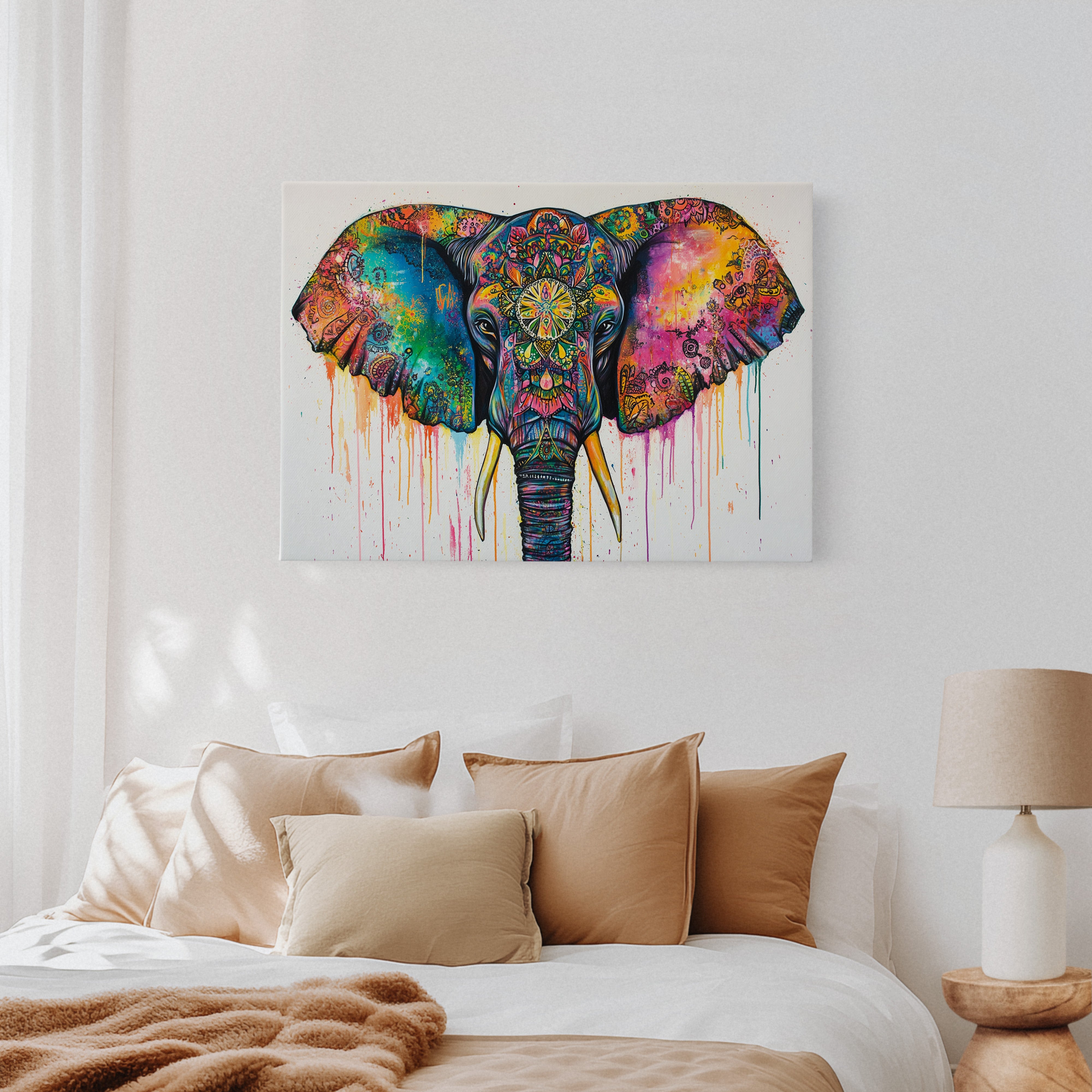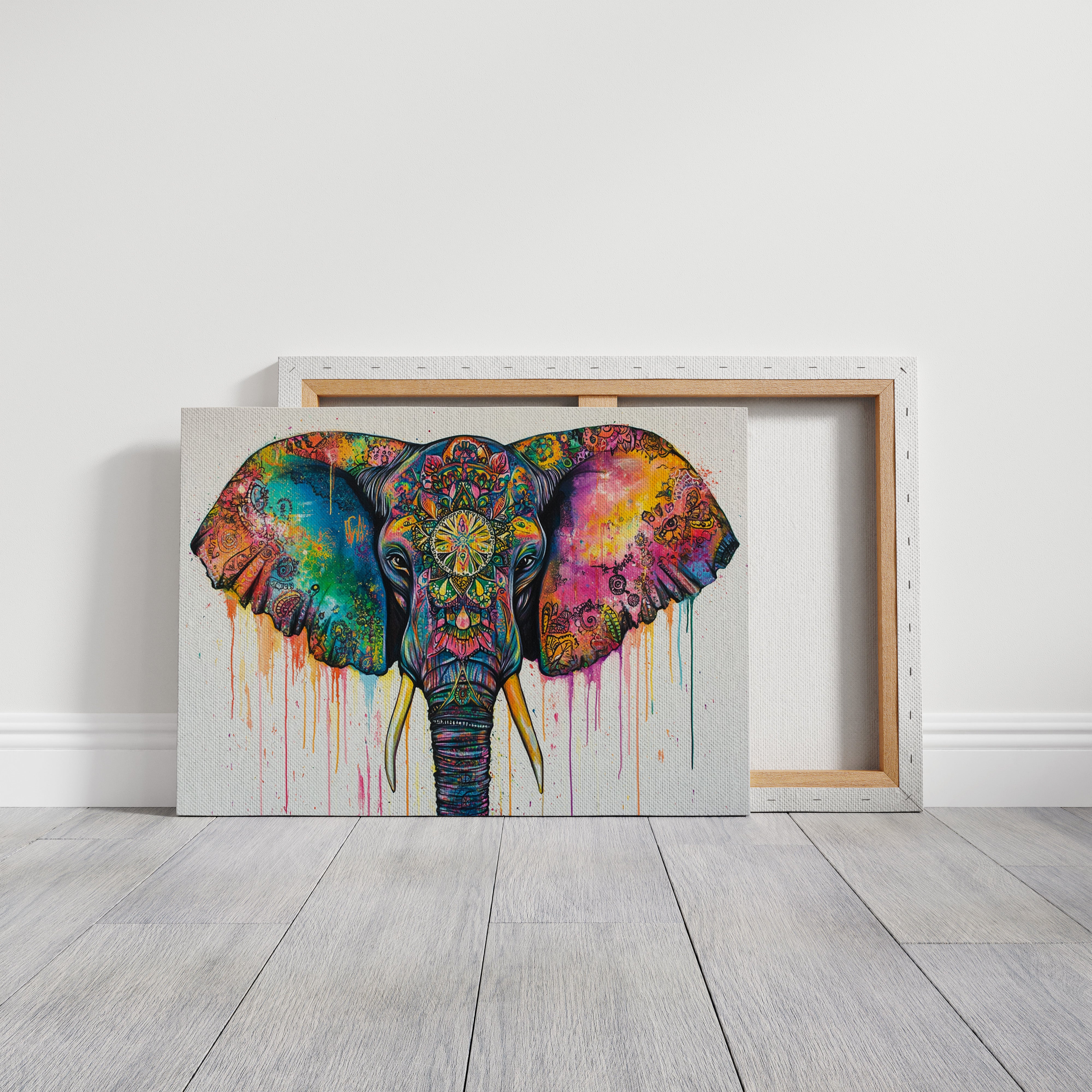 Vibrant hues cascade like liquid jewels across the majestic elephant's features, creating a kaleidoscope of spiritual energy. Intricate mandala patterns weave through the composition, transforming the elephant's face and ears into a canvas of cosmic storytelling. The dripping paint effect adds movement and fluidity, while the bold turquoise and magenta create dramatic contrast against the detailed sacred geometry. This piece would make a stunning focal point in a bohemian living space or meditation room, bringing both energy and peaceful presence to any wall it graces.