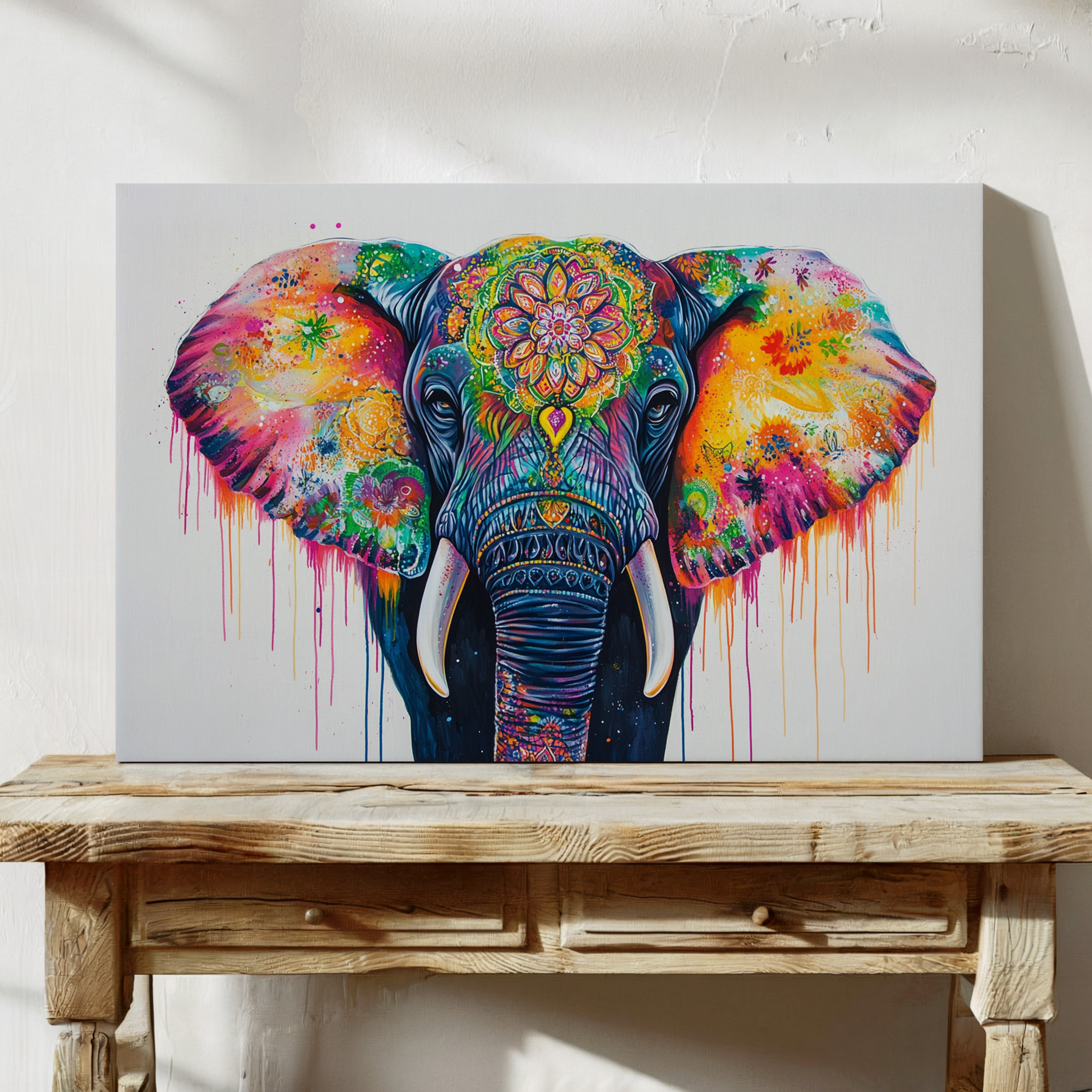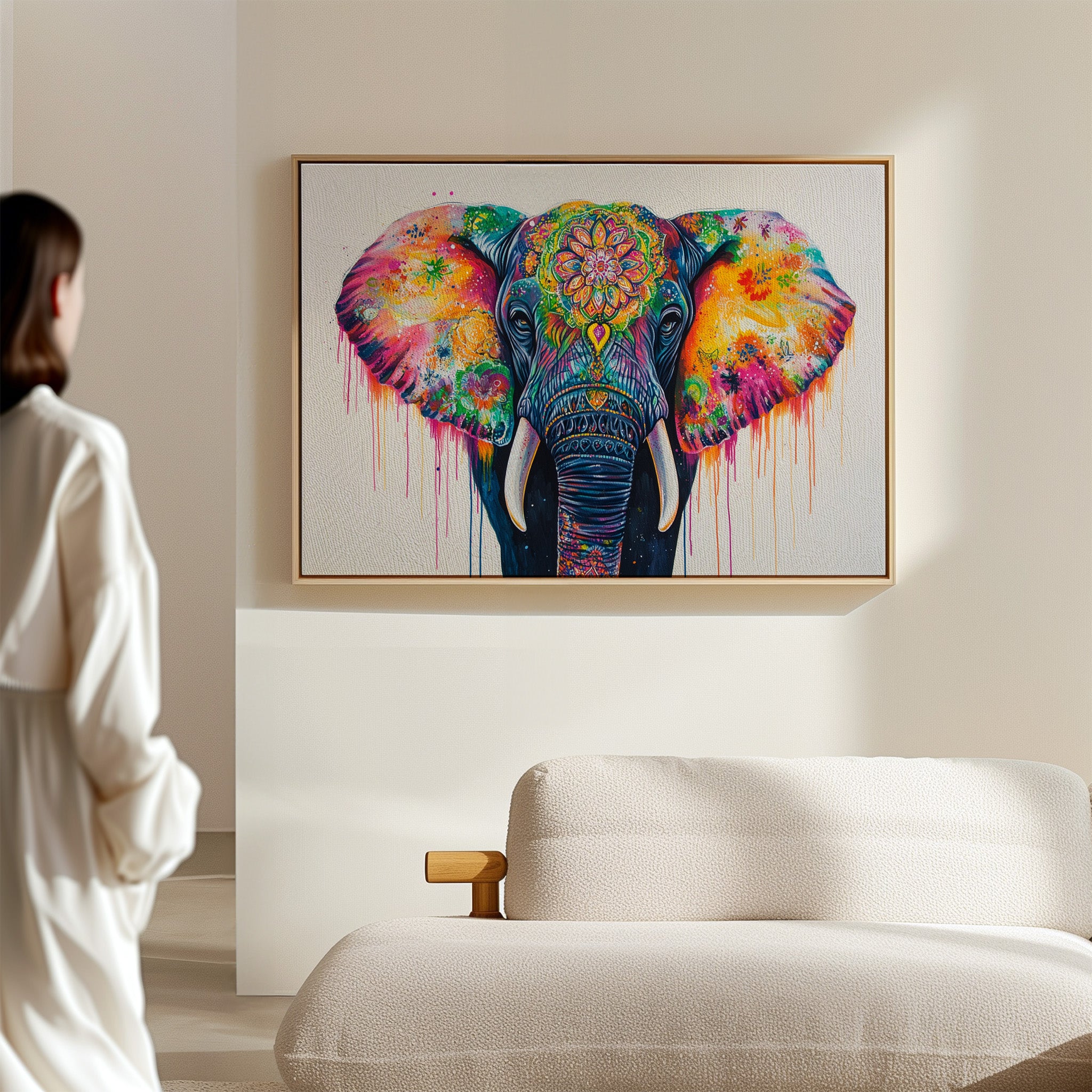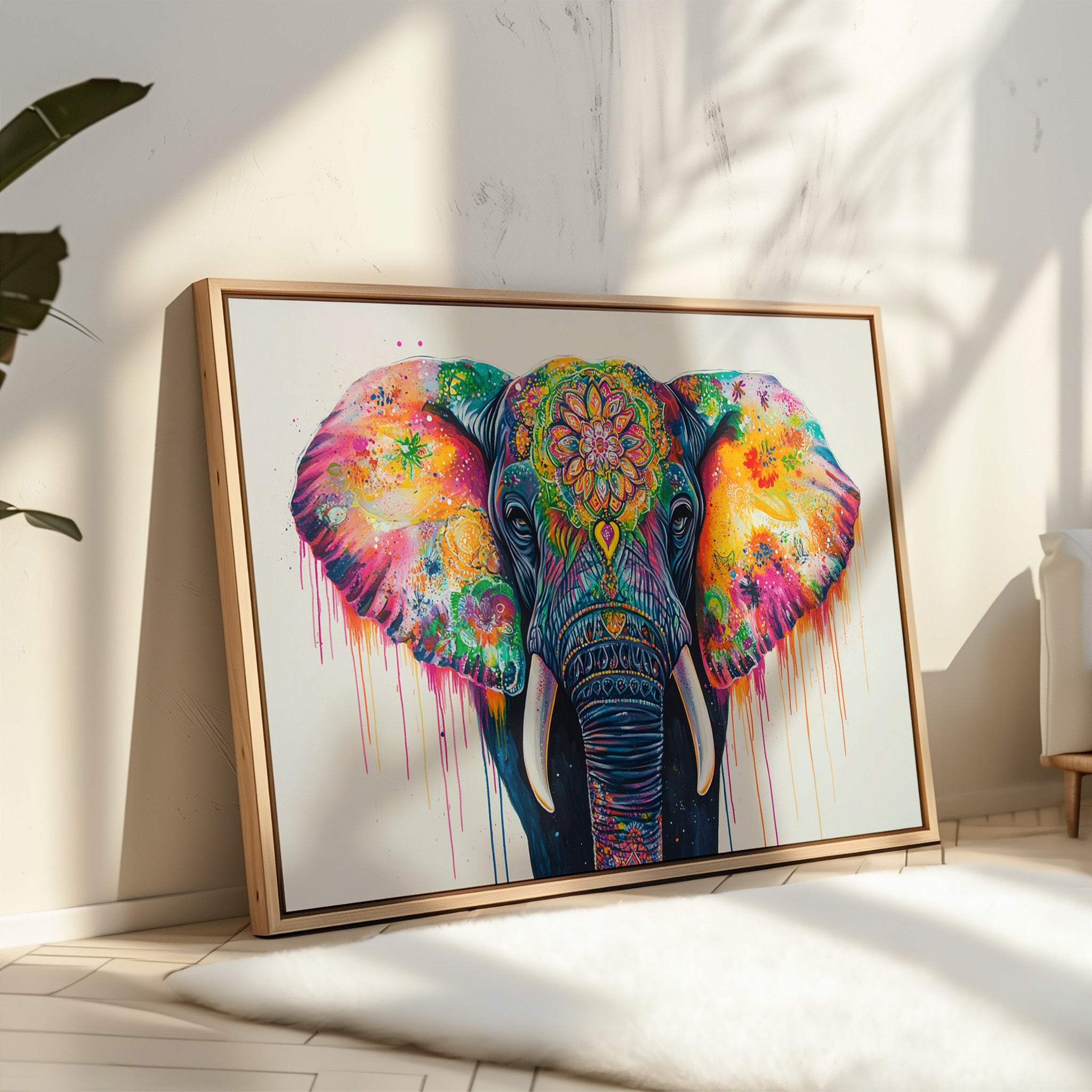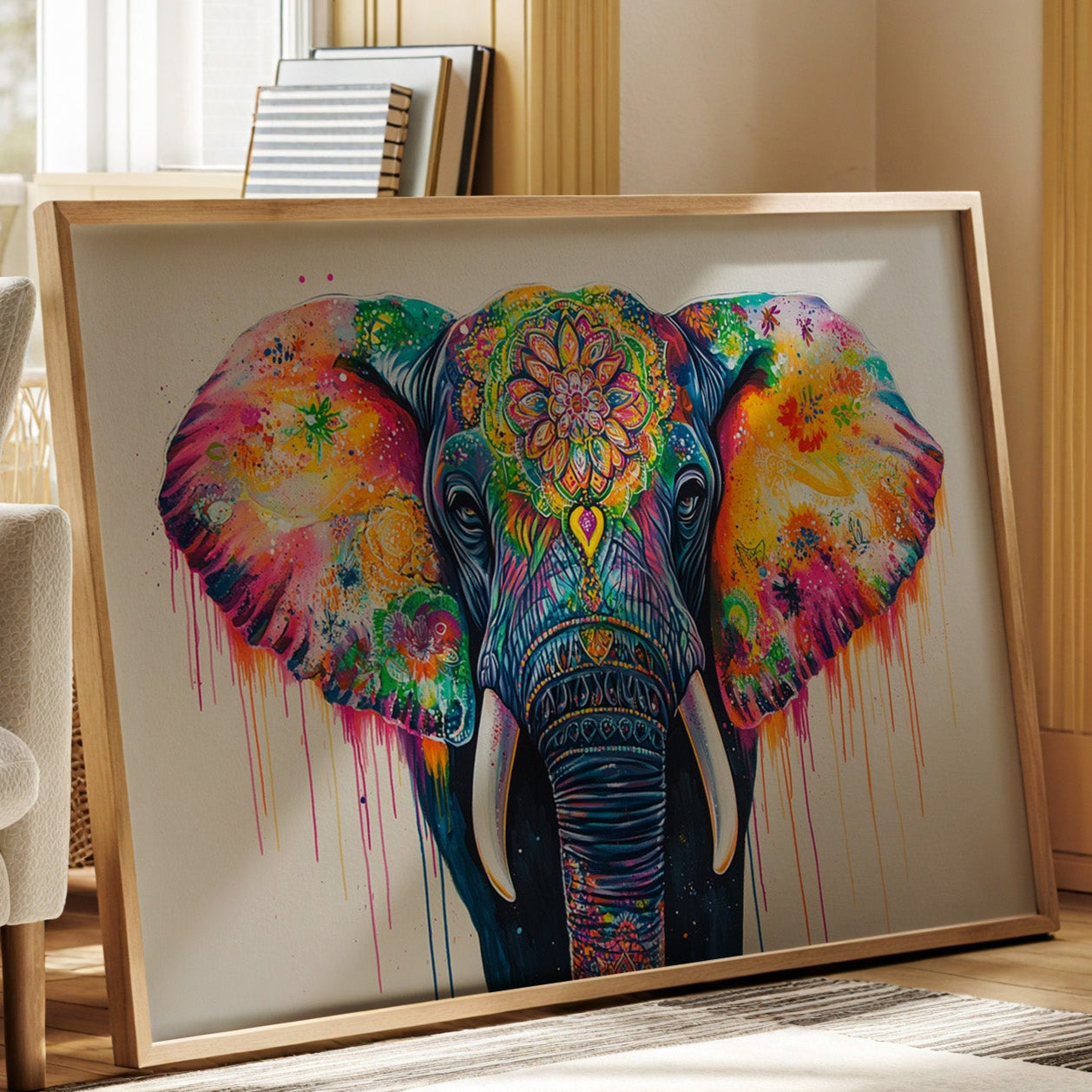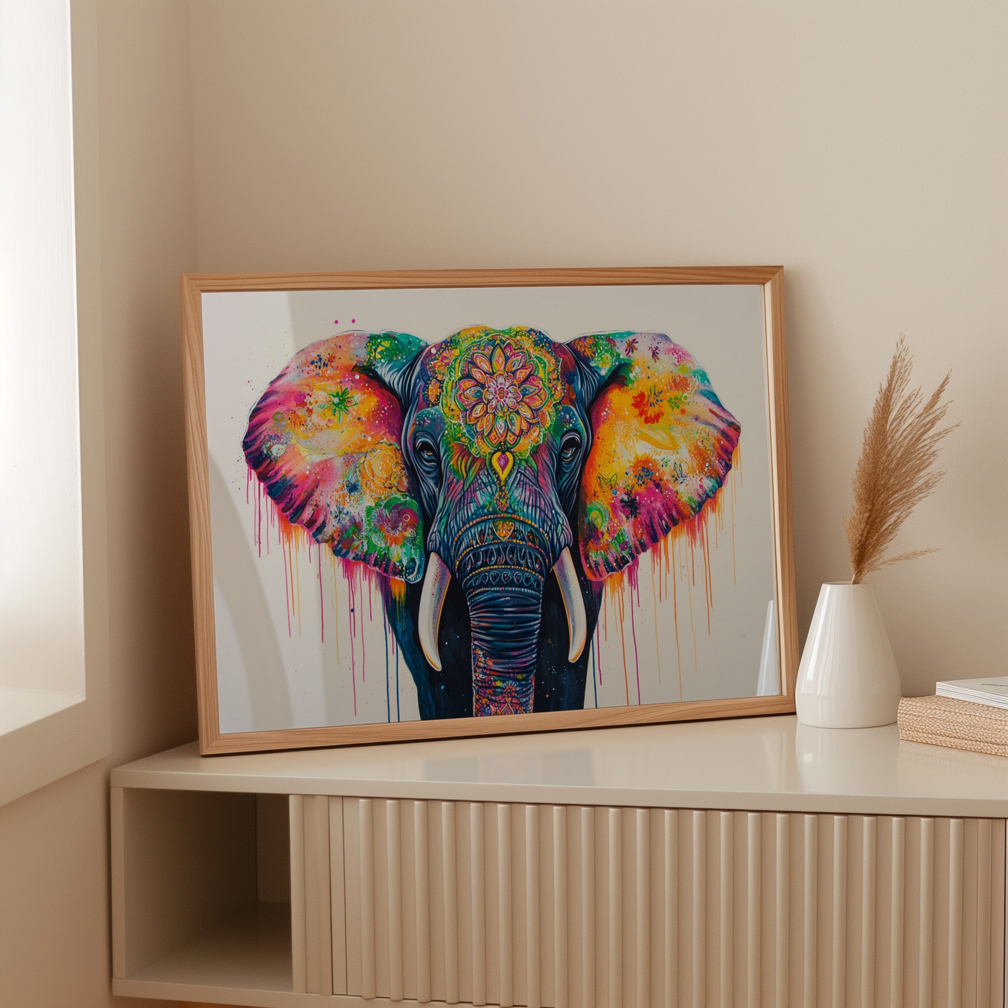 A majestic elephant emerges through an explosion of vibrant colors, its presence both powerful and ethereal. The intricate mandala adorning its forehead radiates spiritual energy, while watercolor-like splashes create cosmic ears that seem to hold entire universes within them. Dripping paint streaks cascade down the composition, suggesting the fluid nature of consciousness and creativity. The deep indigo base of the elephant's skin provides a stunning contrast to the kaleidoscope of pinks, oranges, and emerald greens that dance across its form.