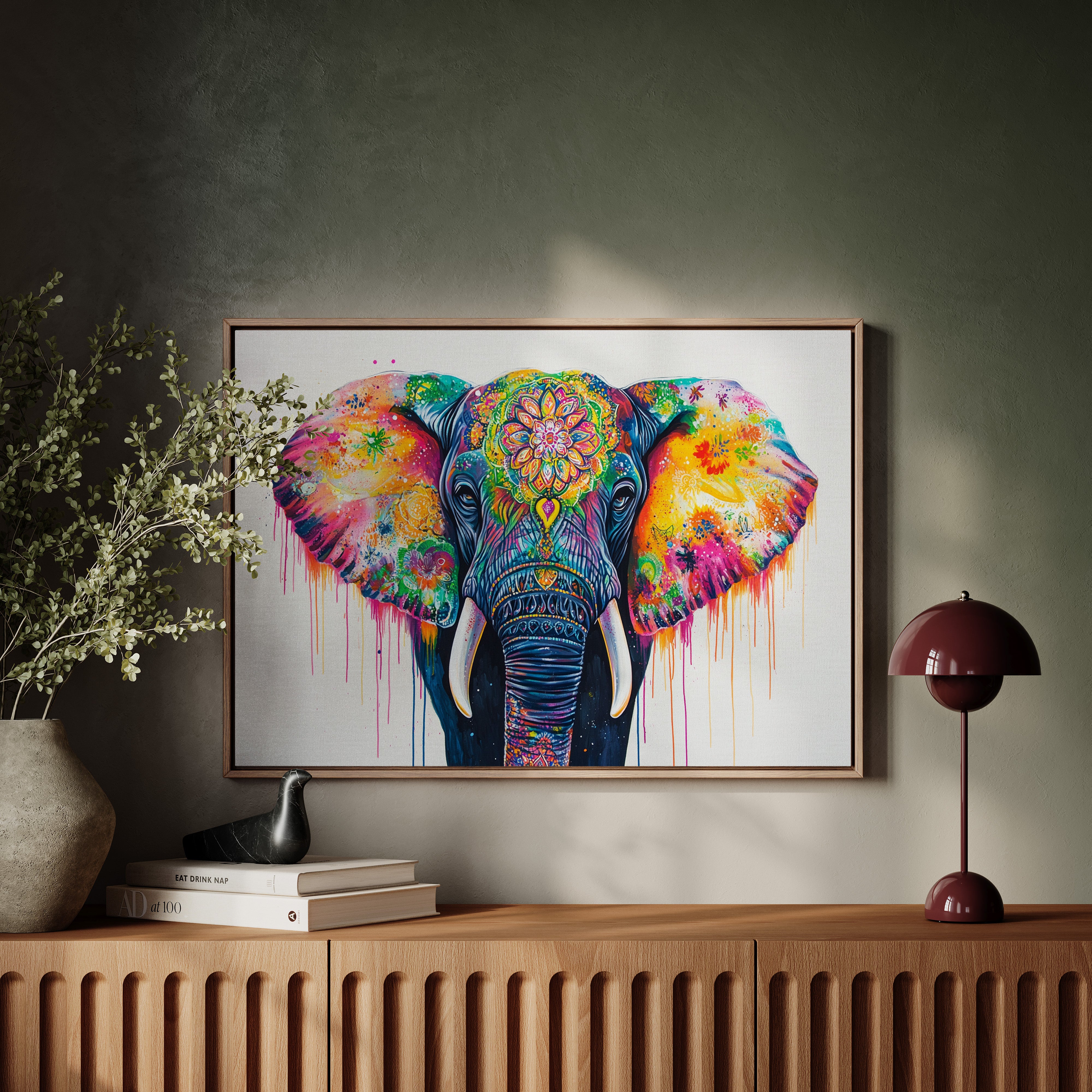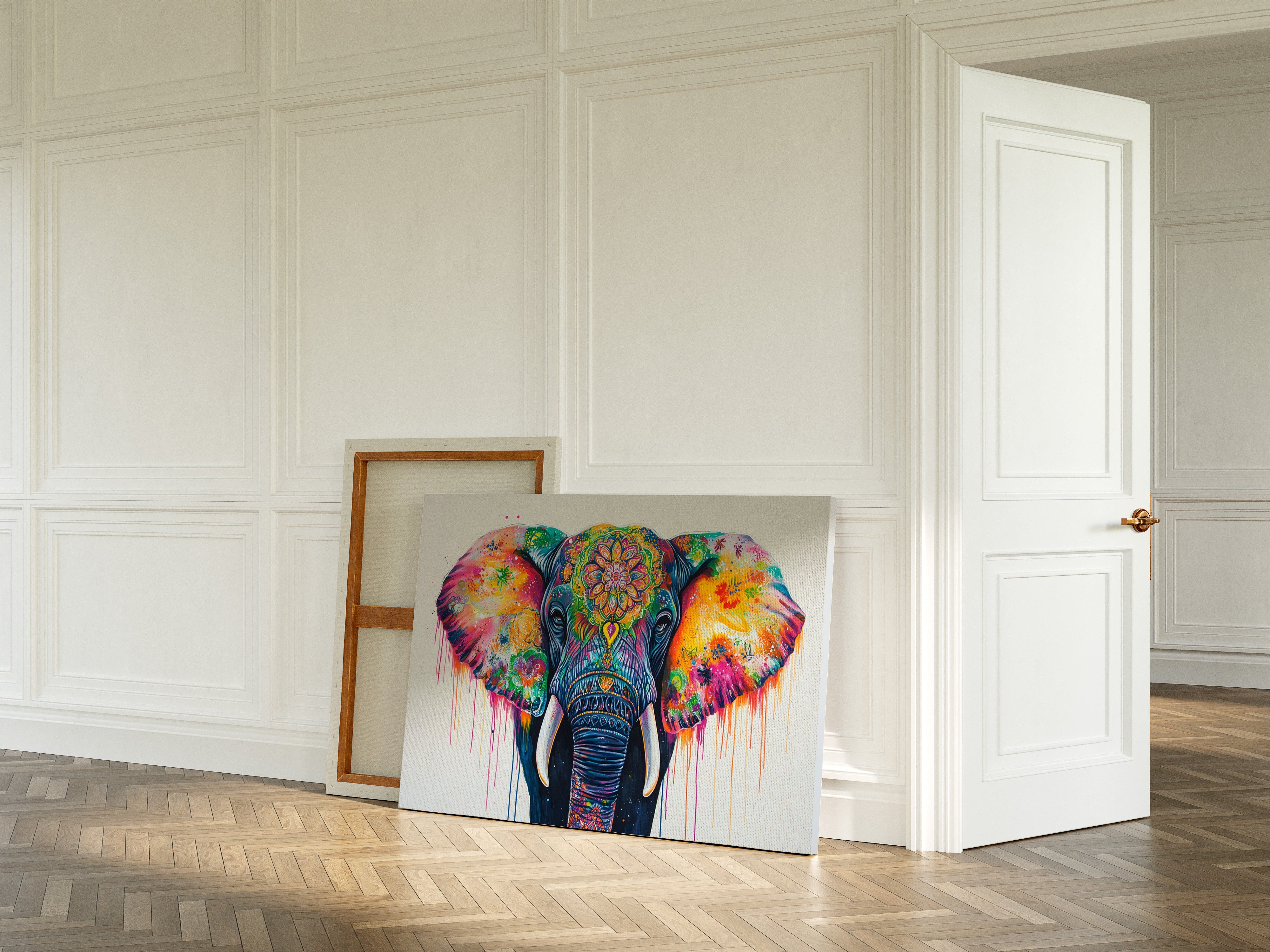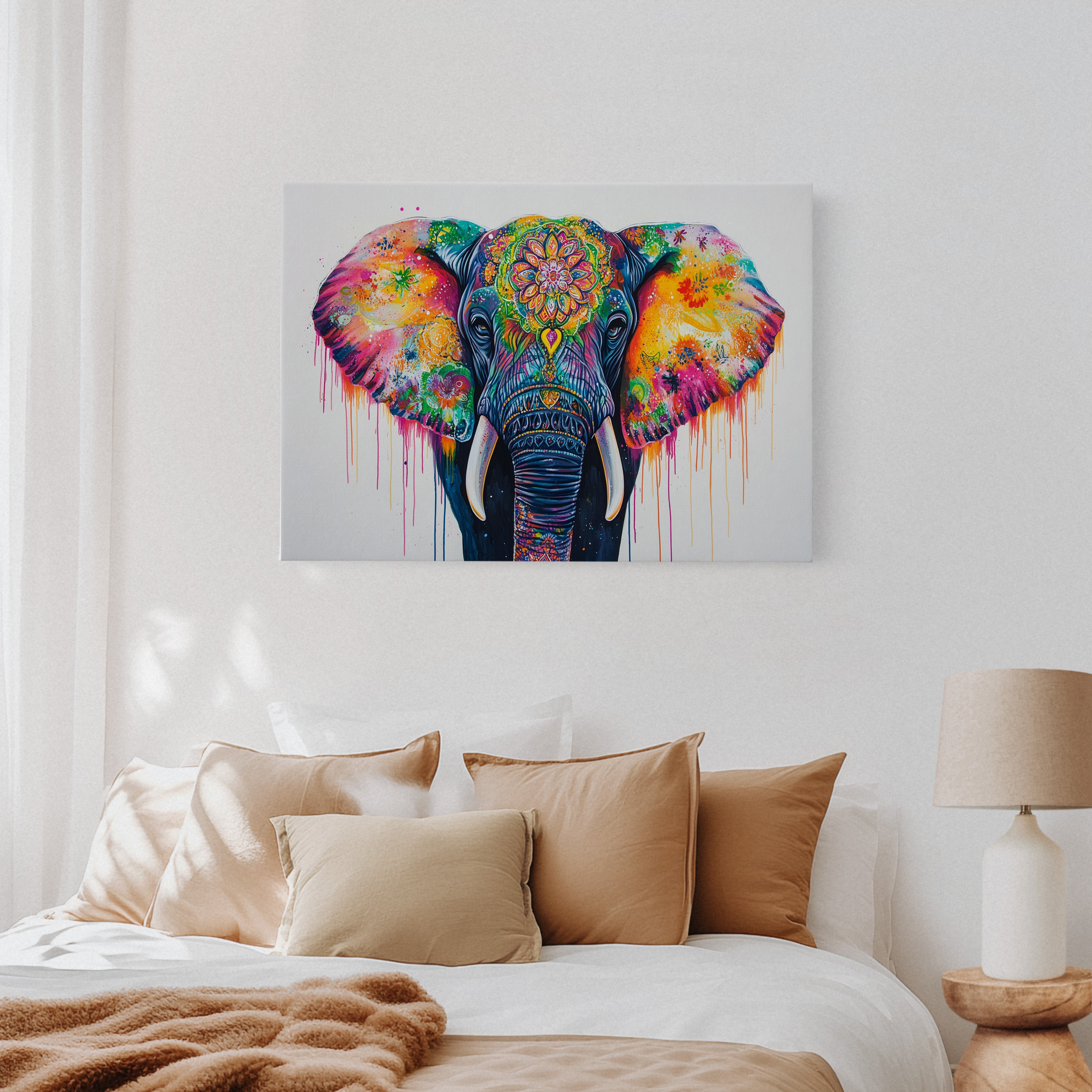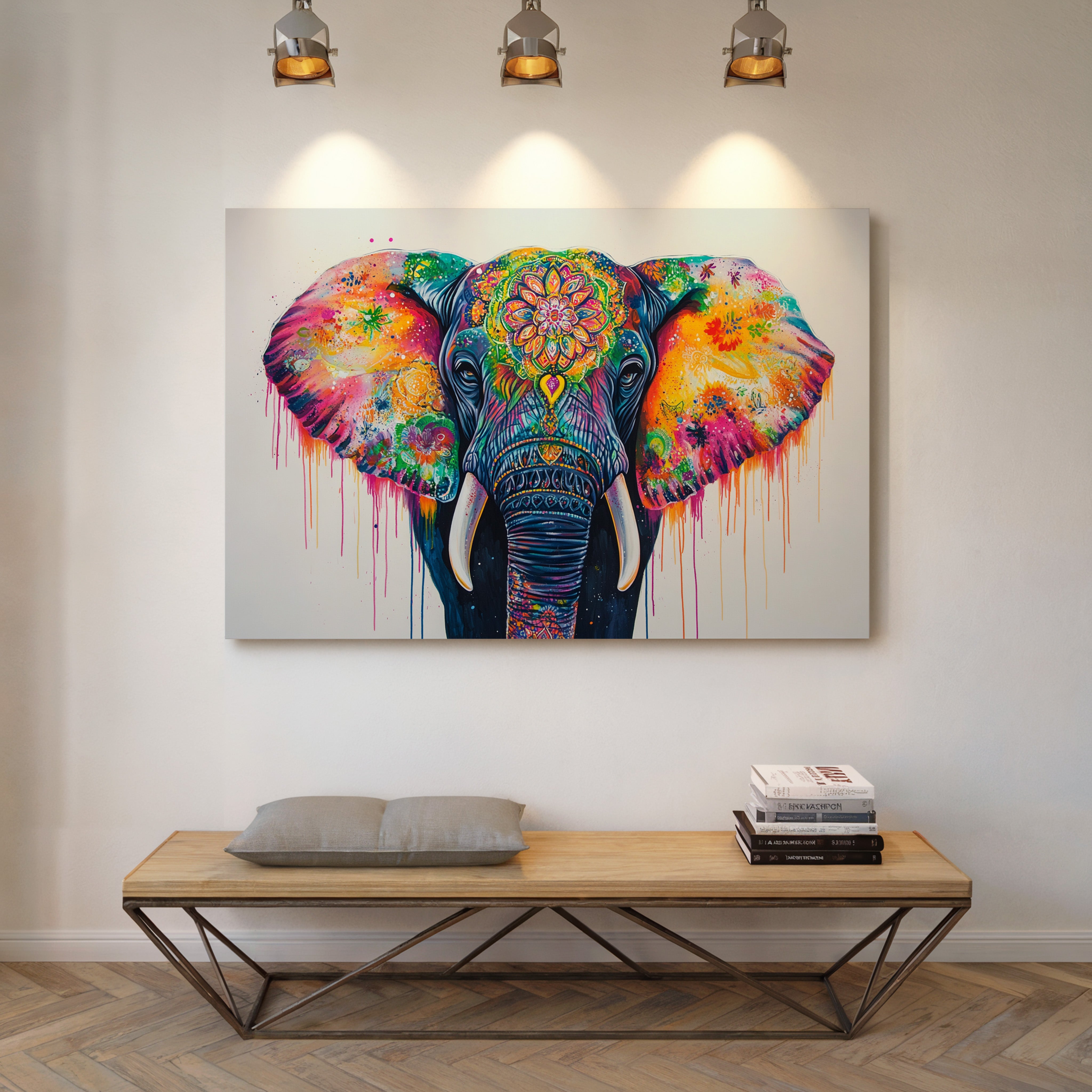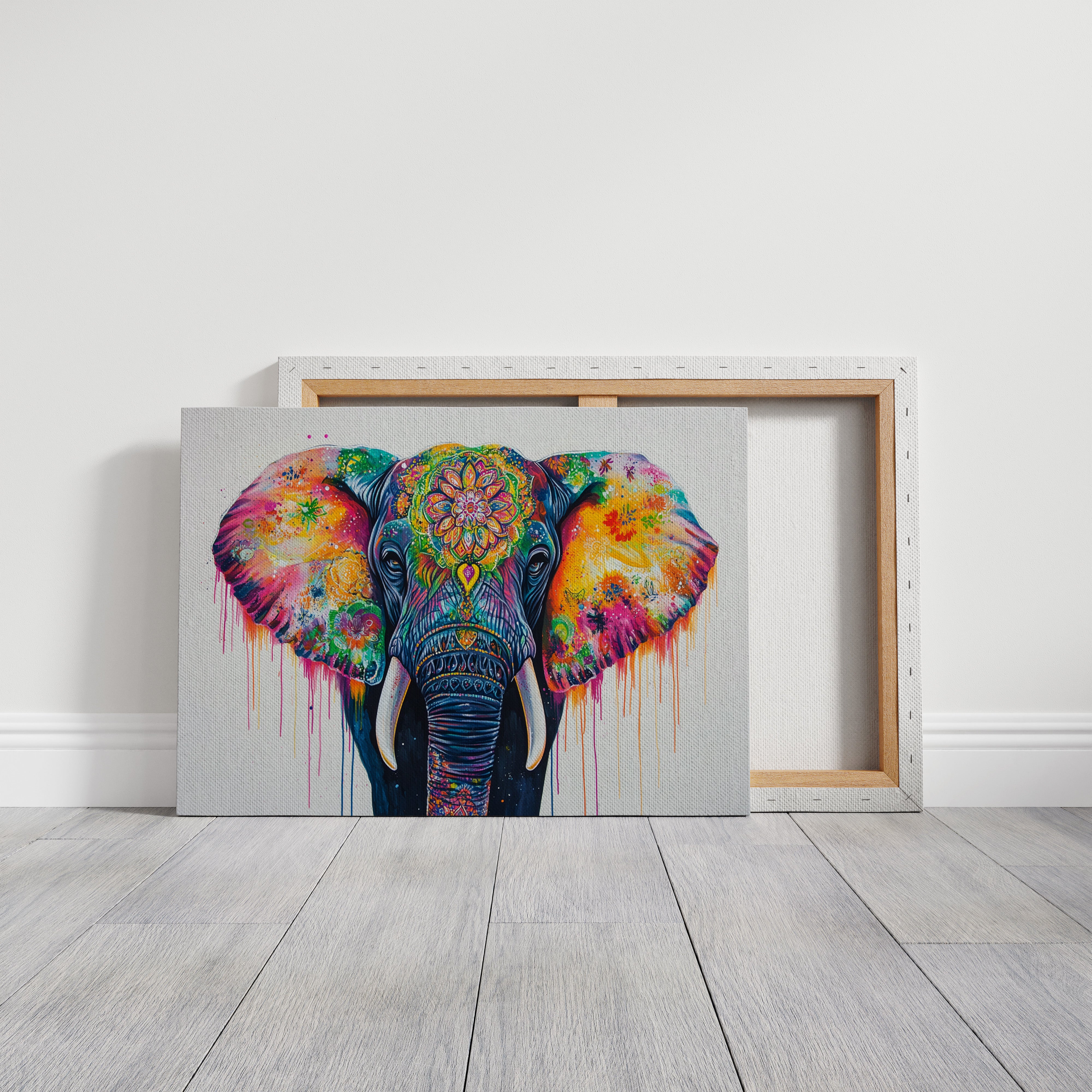 A majestic elephant emerges through an explosion of vibrant colors, its presence both powerful and ethereal. The intricate mandala adorning its forehead radiates spiritual energy, while watercolor-like splashes create cosmic ears that seem to hold entire universes within them. Dripping paint streaks cascade down the composition, suggesting the fluid nature of consciousness and creativity. The deep indigo base of the elephant's skin provides a stunning contrast to the kaleidoscope of pinks, oranges, and emerald greens that dance across its form.