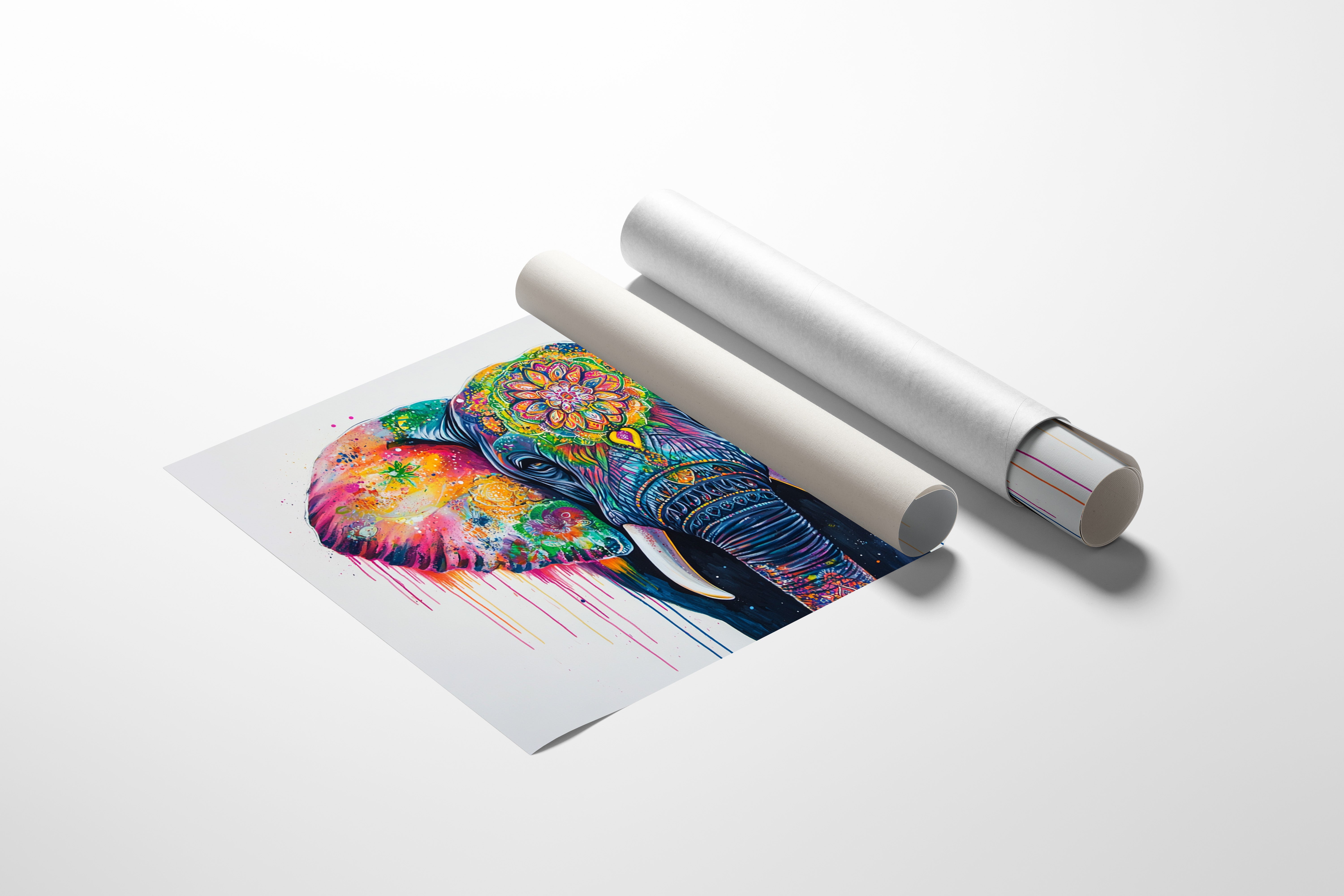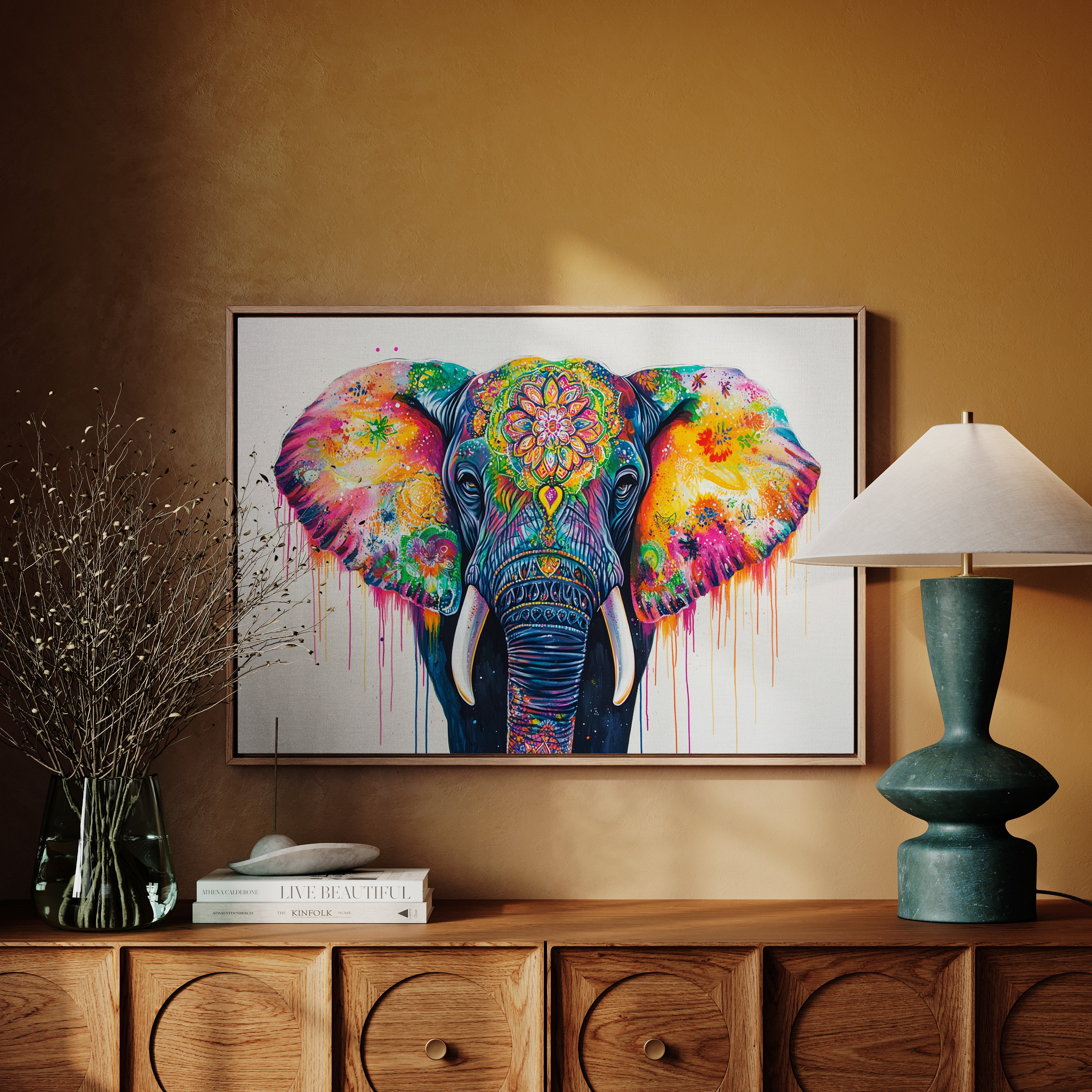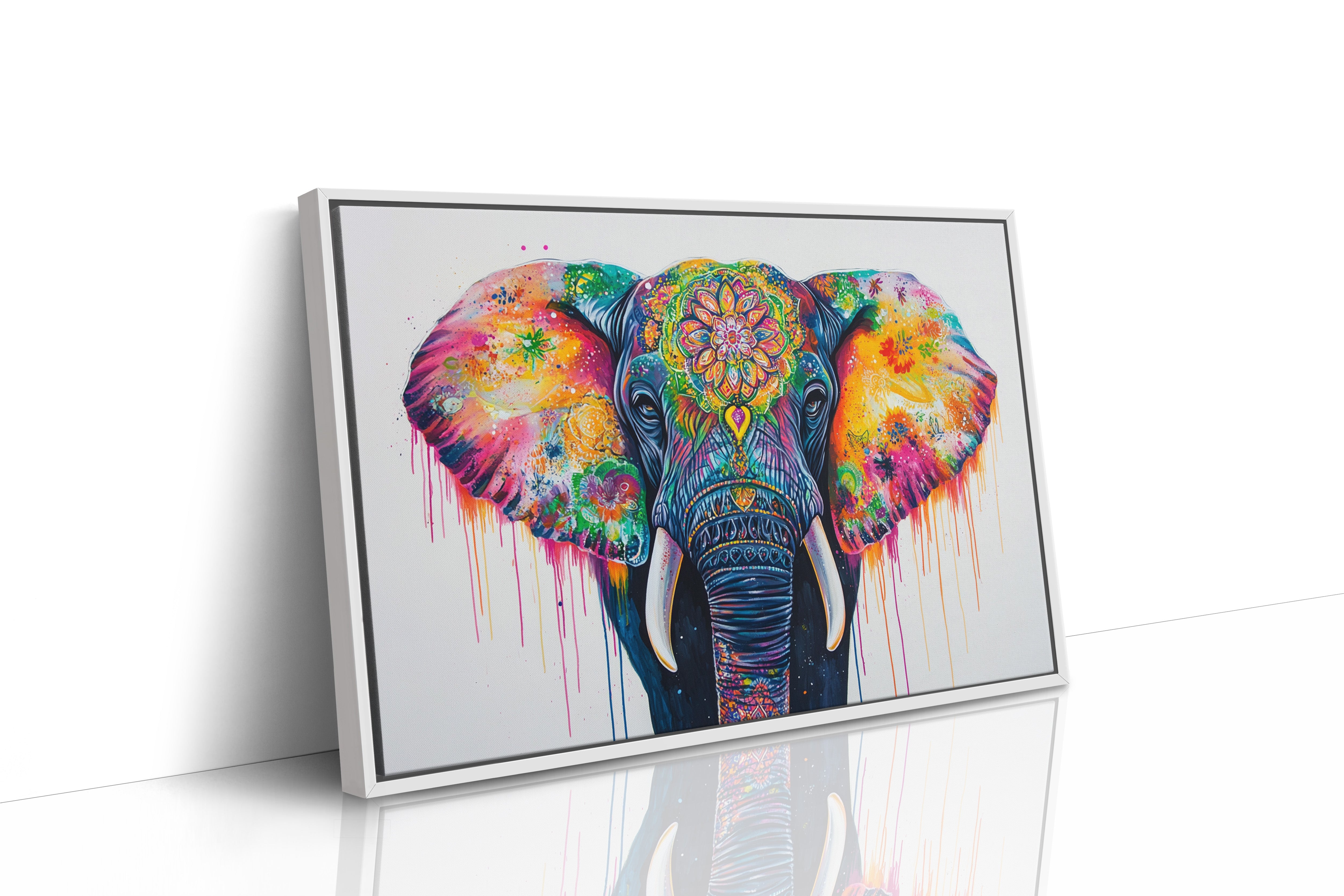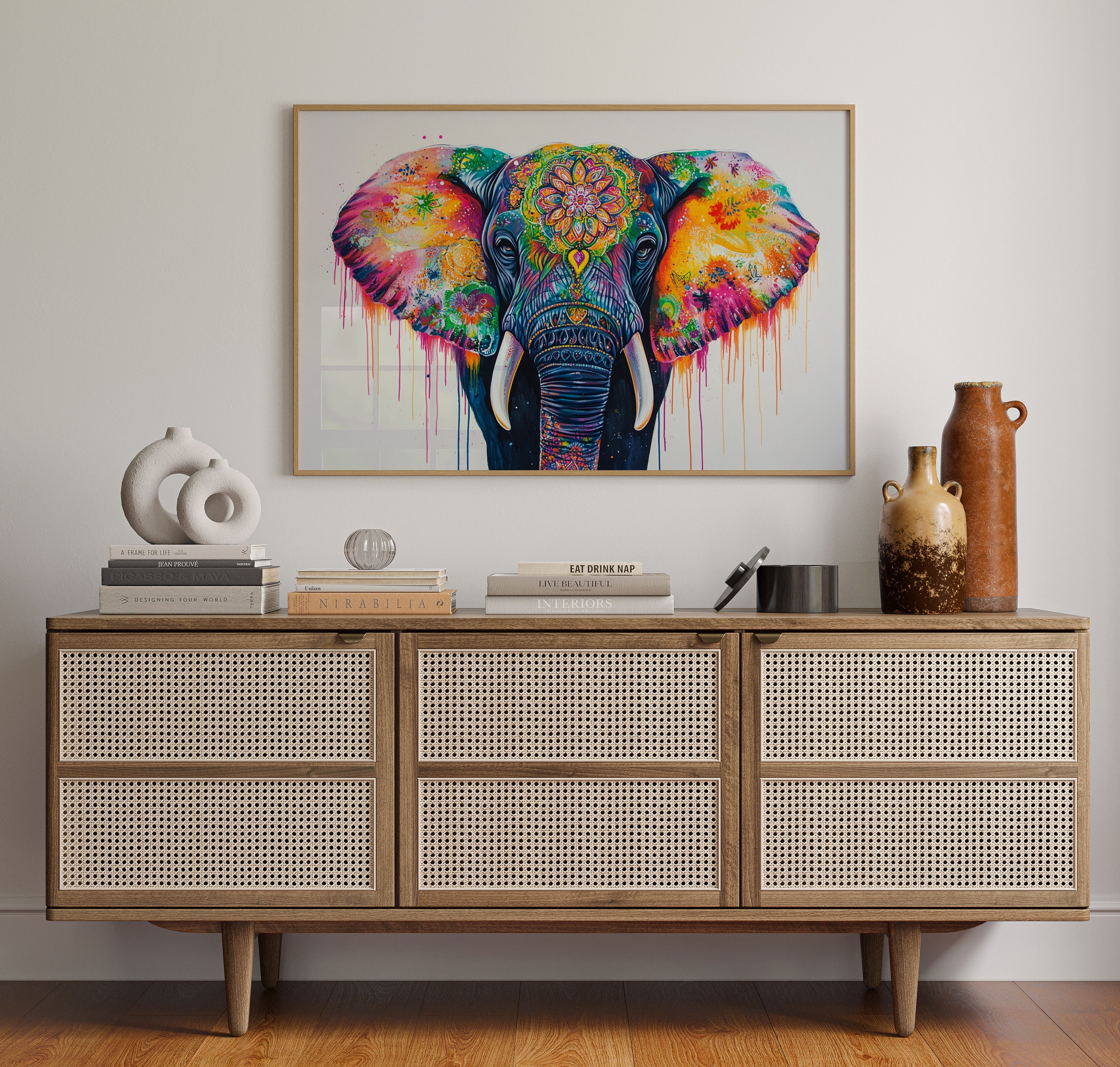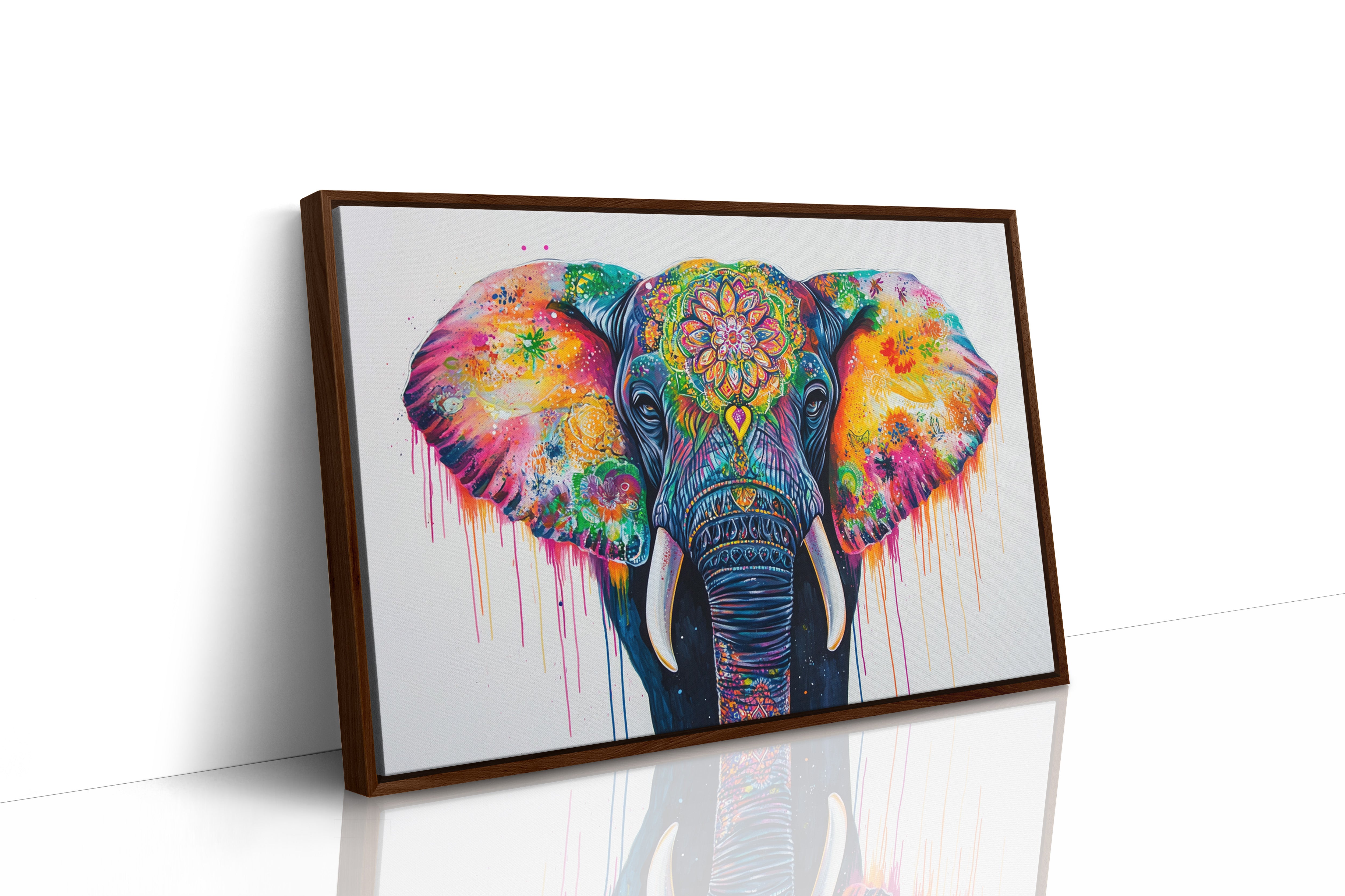 A majestic elephant emerges through an explosion of vibrant colors, its presence both powerful and ethereal. The intricate mandala adorning its forehead radiates spiritual energy, while watercolor-like splashes create cosmic ears that seem to hold entire universes within them. Dripping paint streaks cascade down the composition, suggesting the fluid nature of consciousness and creativity. The deep indigo base of the elephant's skin provides a stunning contrast to the kaleidoscope of pinks, oranges, and emerald greens that dance across its form.