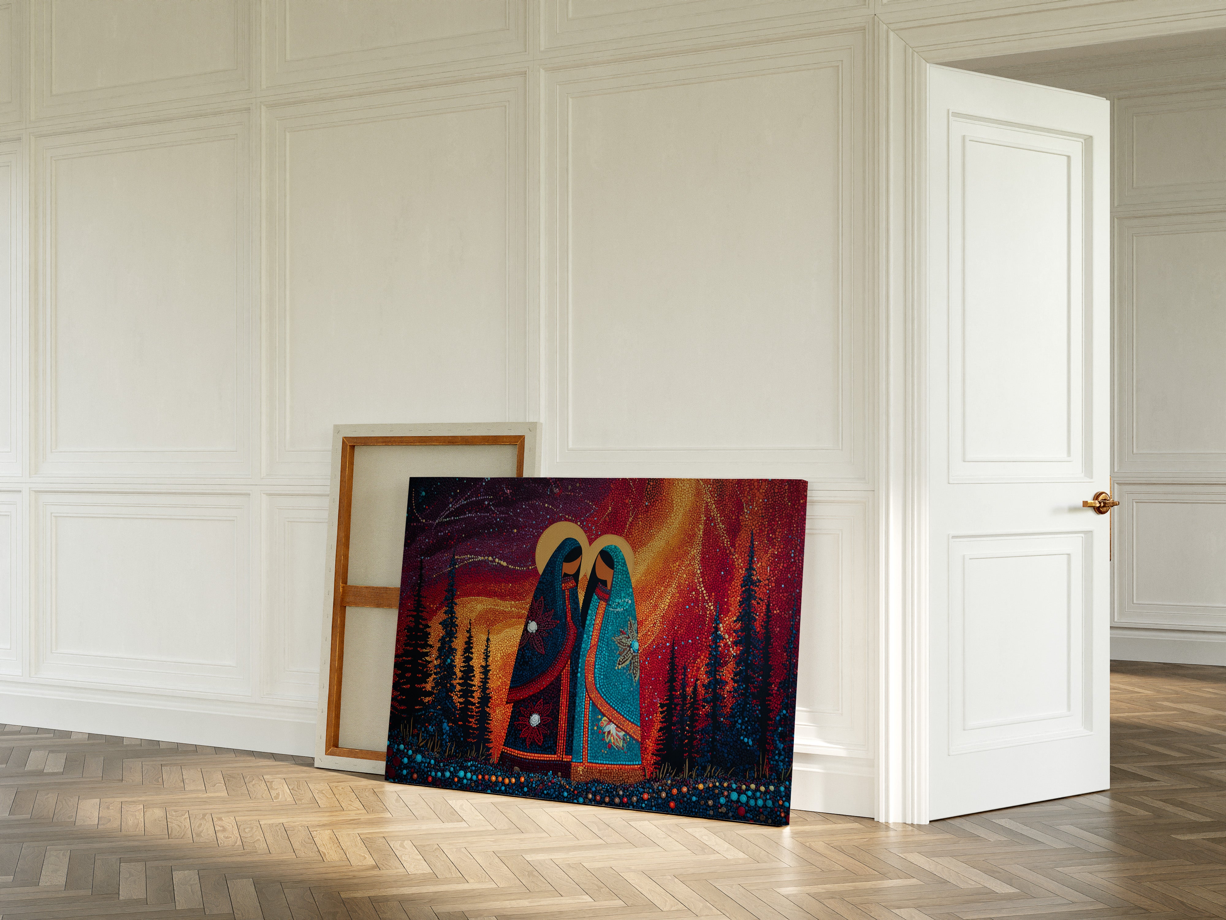 Beneath a blazing aurora sky, dotted patterns weave an ancient story of connection and harmony. Two figures stand in reverent unity, their robes adorned with intricate beadwork in deep turquoise and midnight blue, set against a dramatic backdrop of crimson and gold. The mosaic-like technique creates a mesmerizing tapestry where every dot contributes to the larger narrative of spiritual communion, while silhouetted pines stand sentinel at the edges of this sacred scene. This piece transforms any space into a sanctuary of contemplation and cultural celebration.