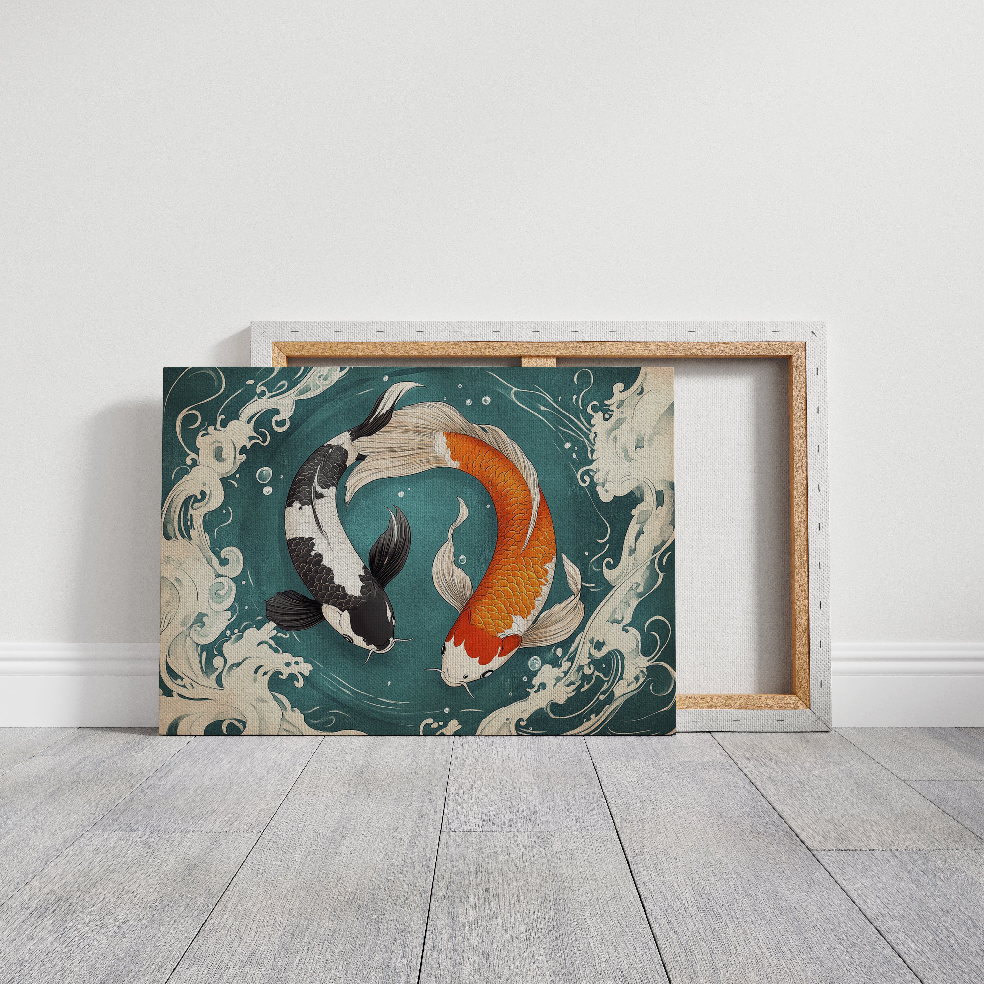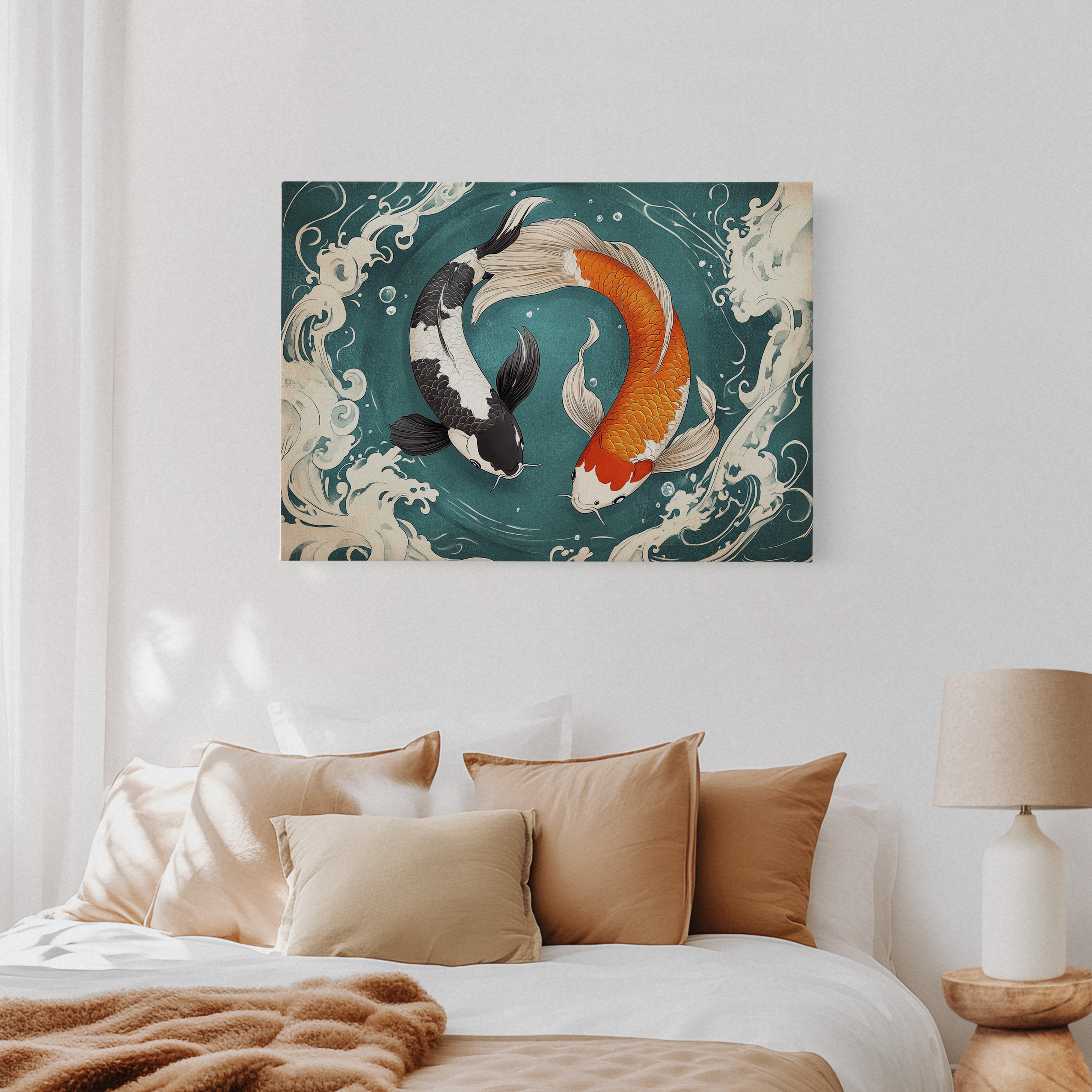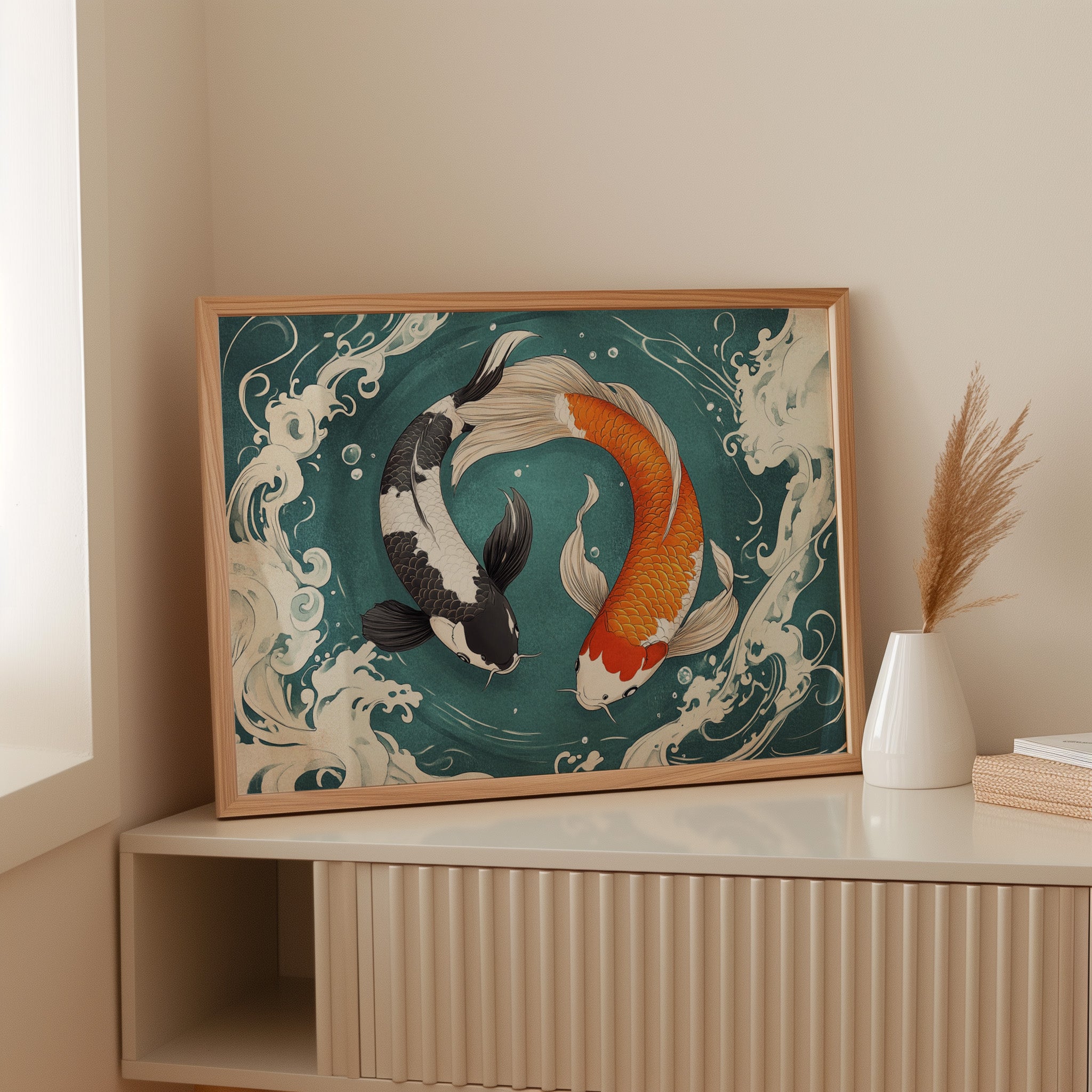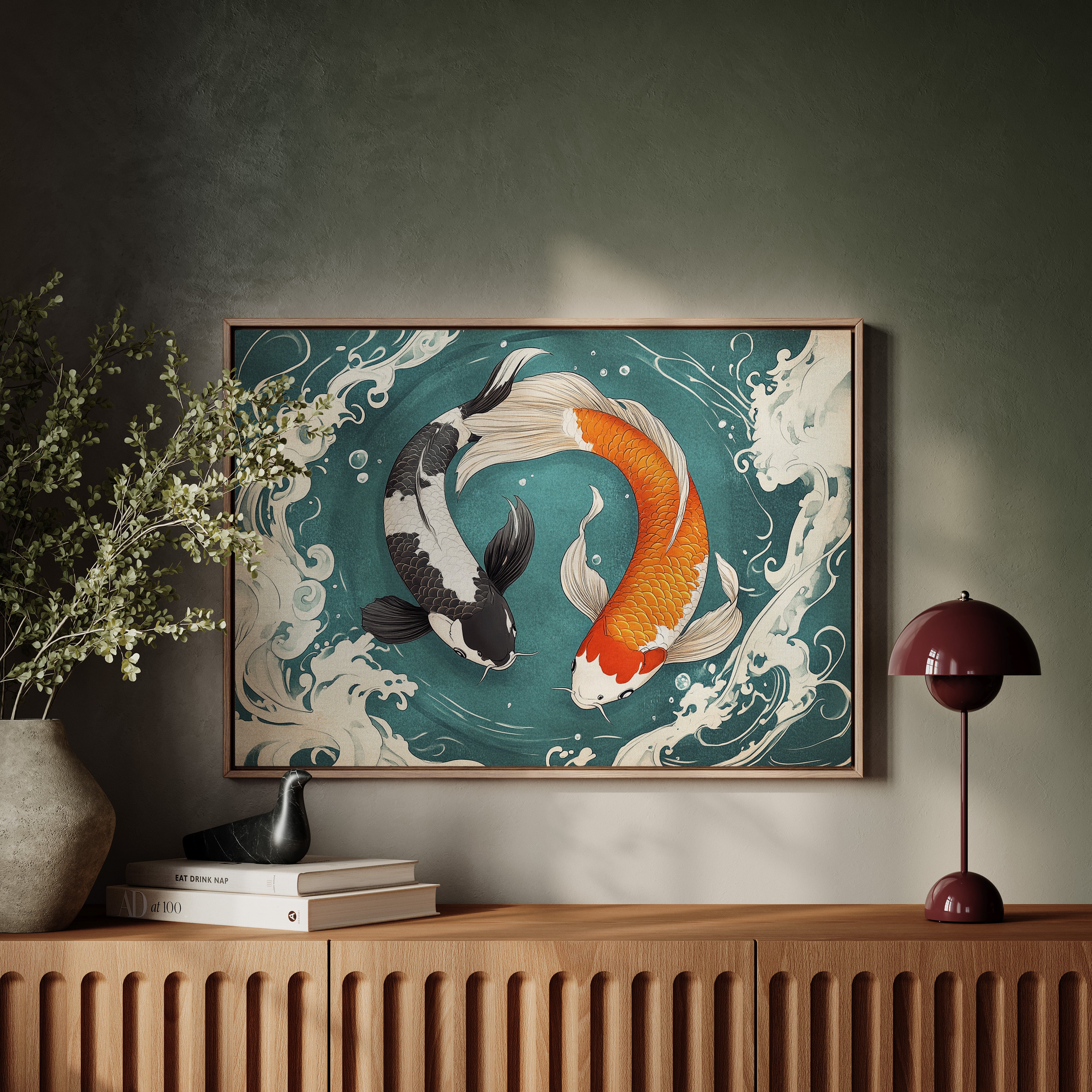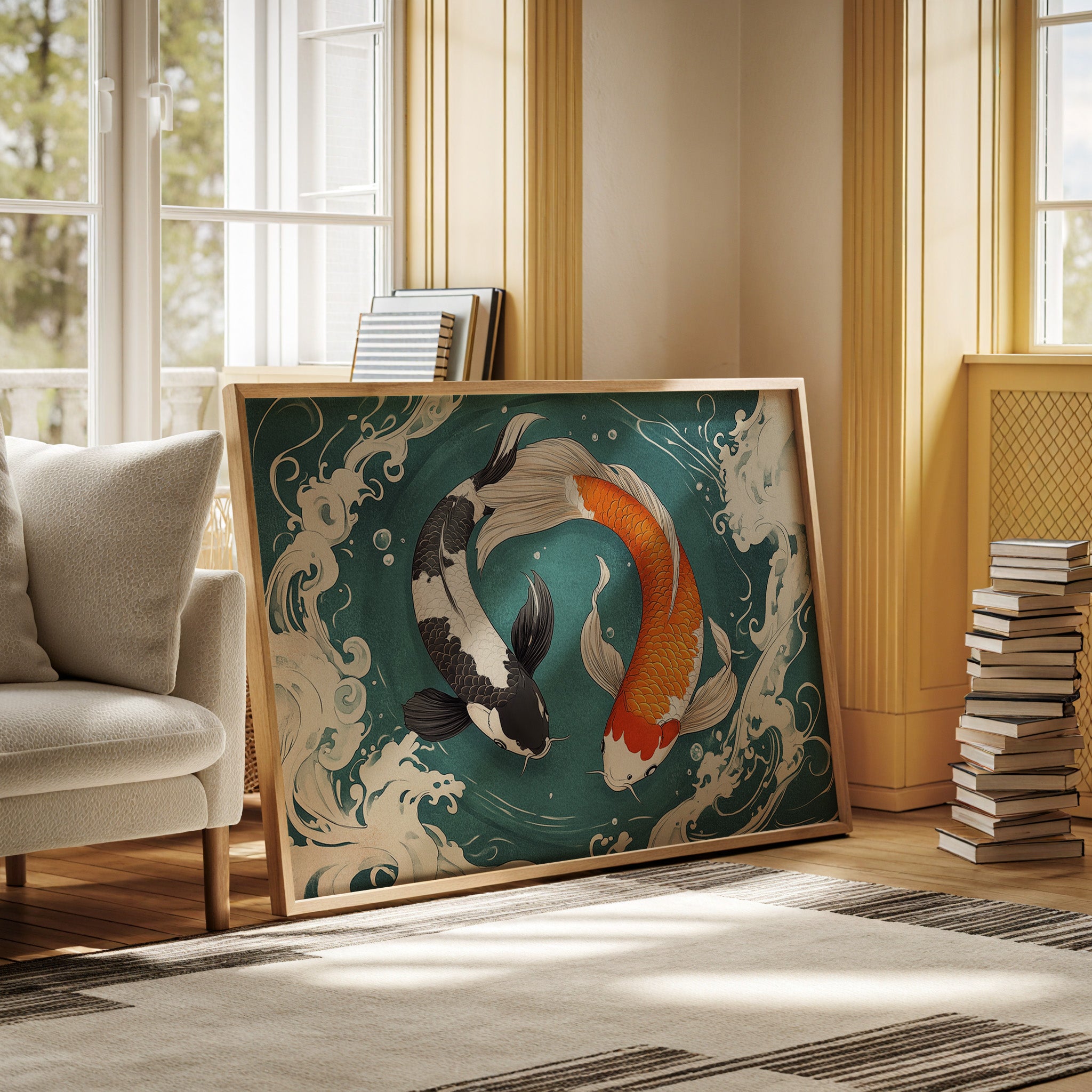 Two koi fish circle in an eternal dance, their scales catching light like polished pearls against deep teal waters. The bold contrast of orange and black fins sweep through stylized waves that curl like ancient scrolls, creating a mesmerizing display of movement and grace. Delicate bubbles rise between the swirling currents, while creamy white foam crashes in traditional Japanese brush strokes, embodying both power and serenity. This piece would bring a sense of flowing tranquility to a meditation room or add an elegant focal point to a modern Asian-inspired dining space.