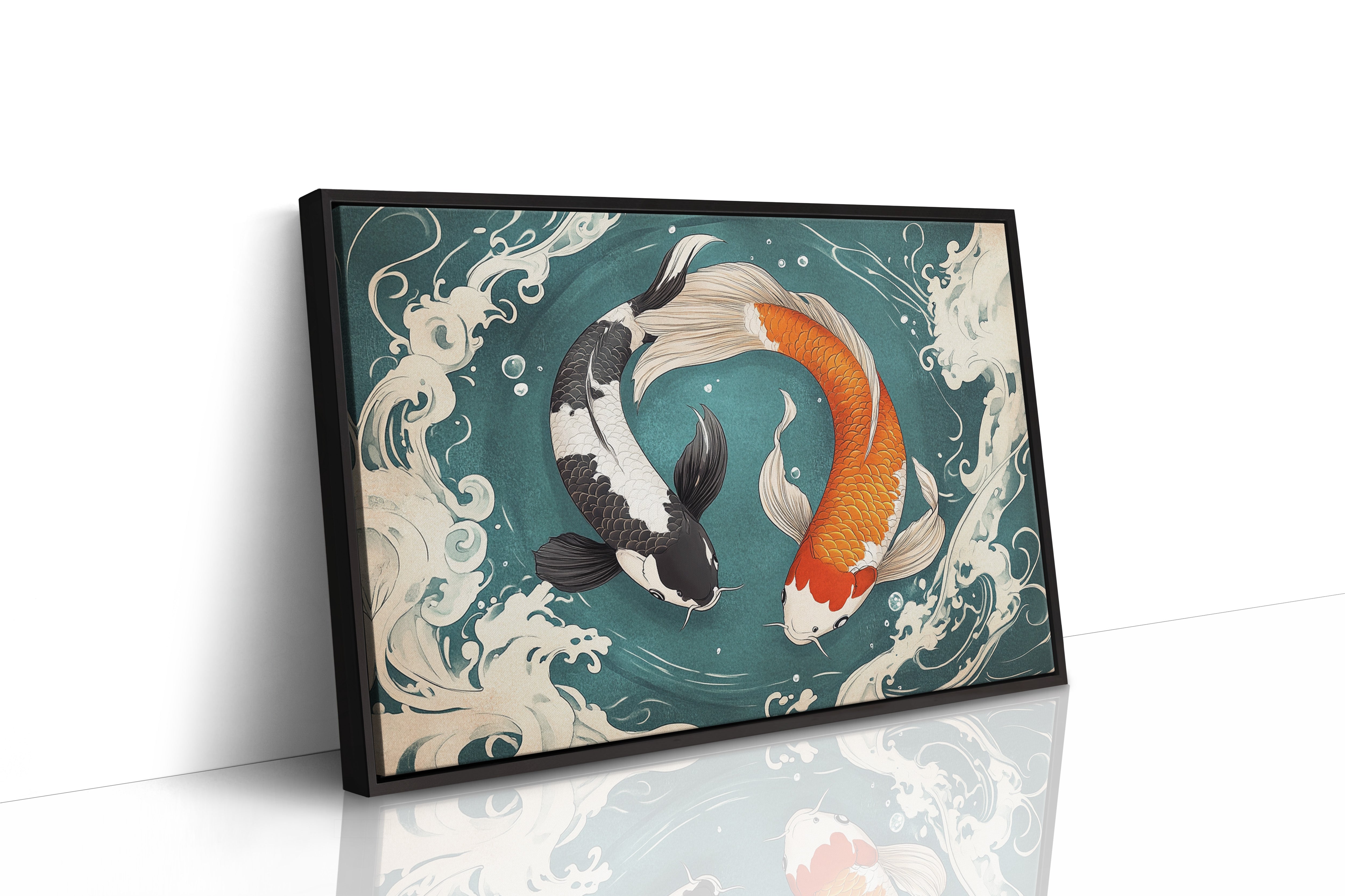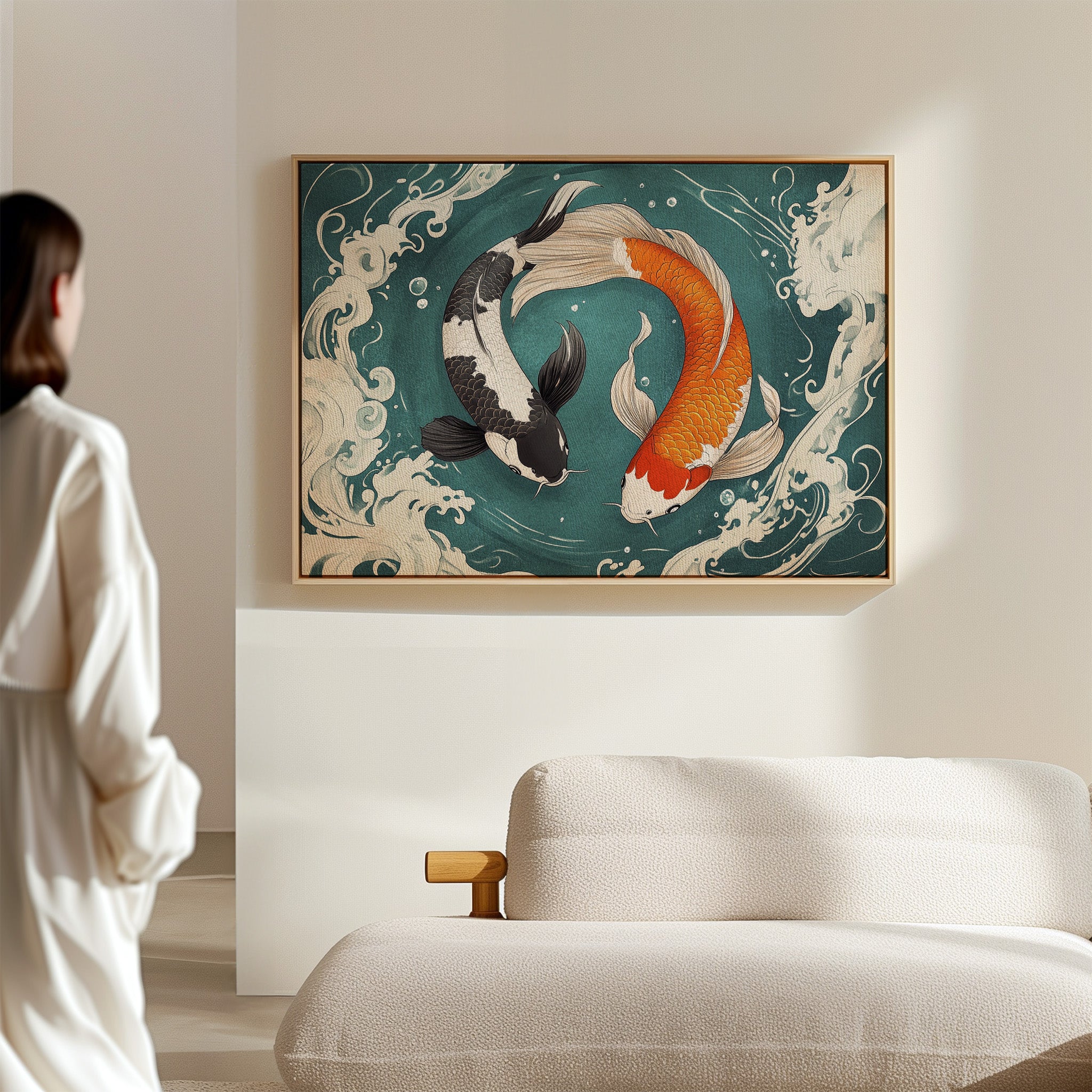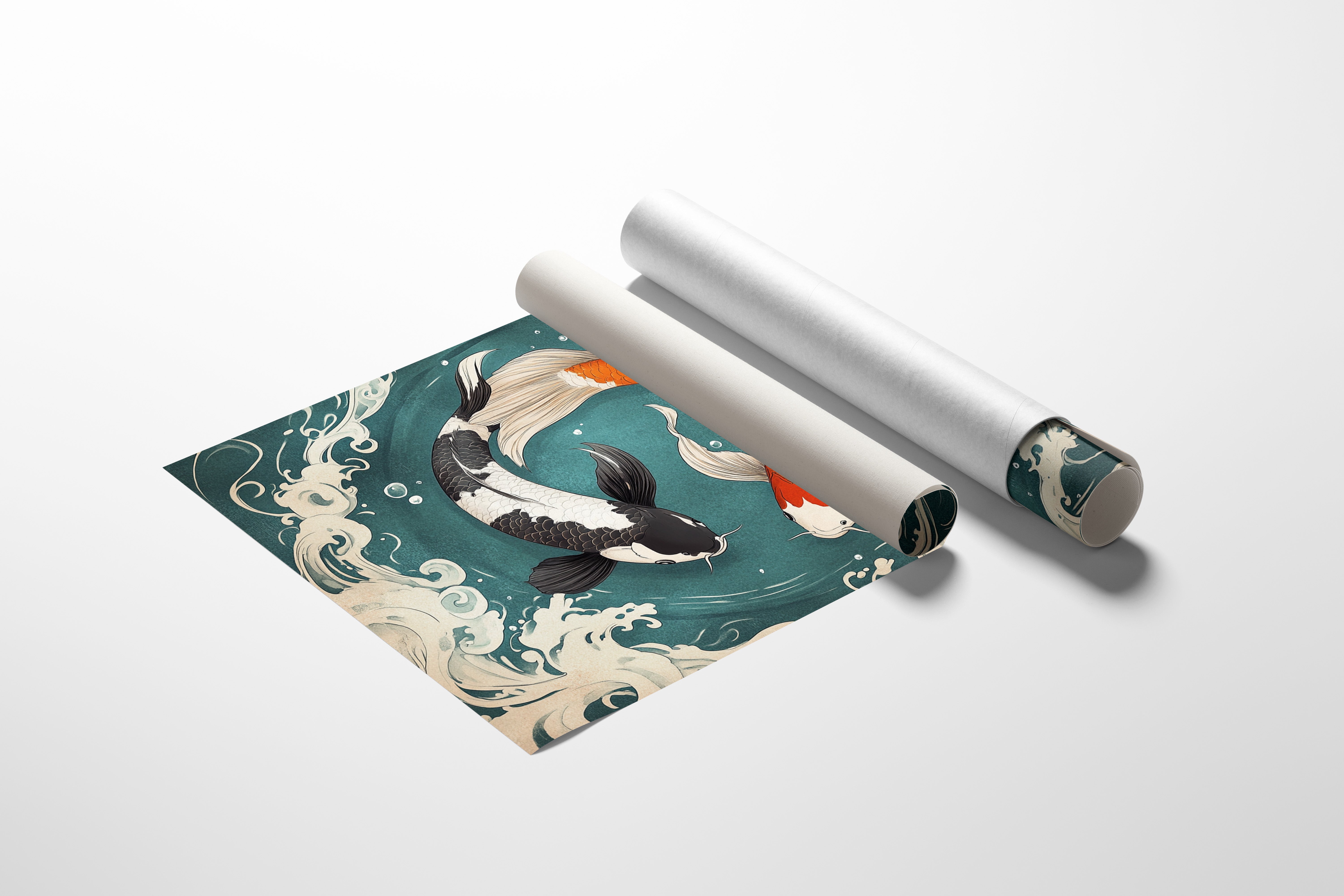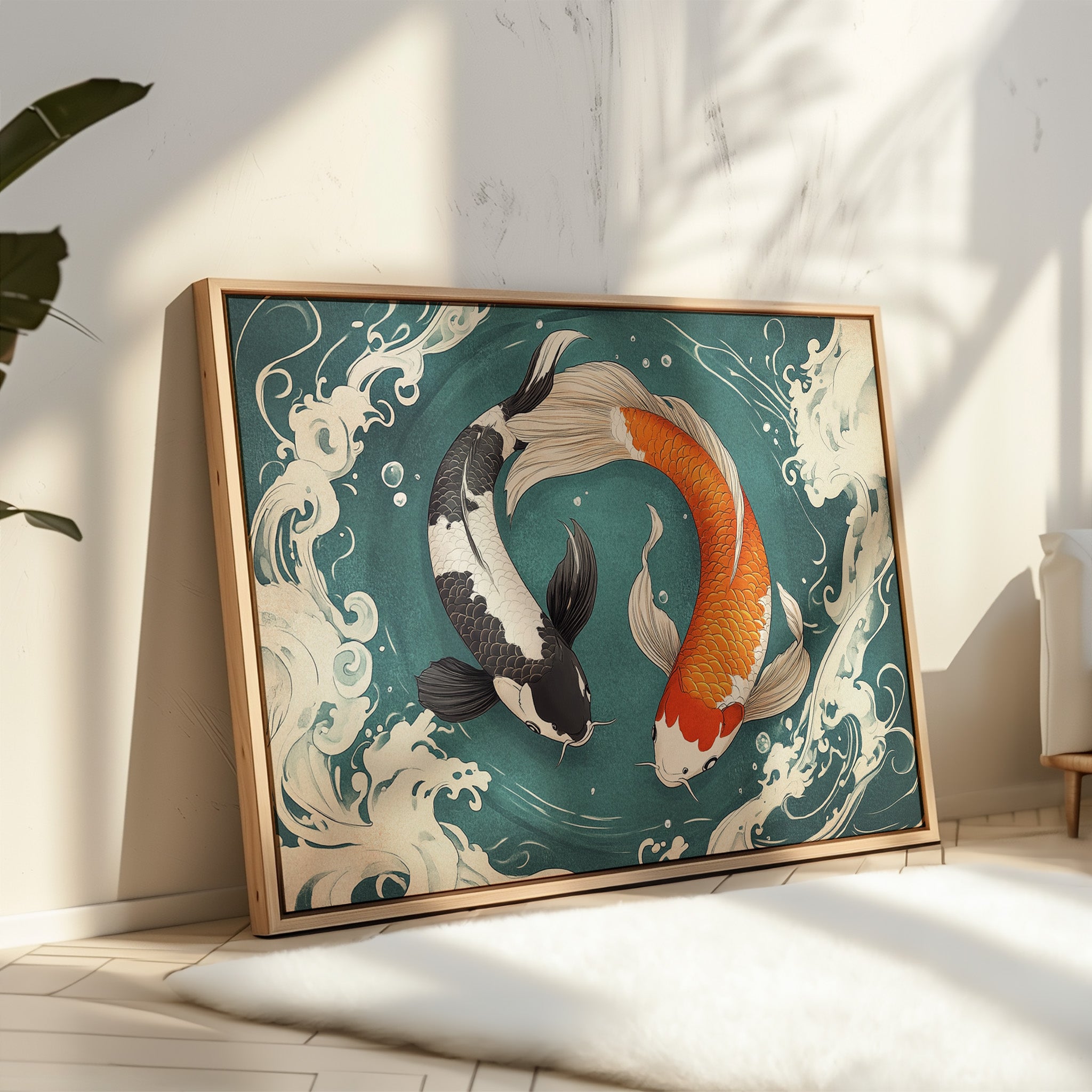 Two koi fish circle in an eternal dance, their scales catching light like polished pearls against deep teal waters. The bold contrast of orange and black fins sweep through stylized waves that curl like ancient scrolls, creating a mesmerizing display of movement and grace. Delicate bubbles rise between the swirling currents, while creamy white foam crashes in traditional Japanese brush strokes, embodying both power and serenity. This piece would bring a sense of flowing tranquility to a meditation room or add an elegant focal point to a modern Asian-inspired dining space.