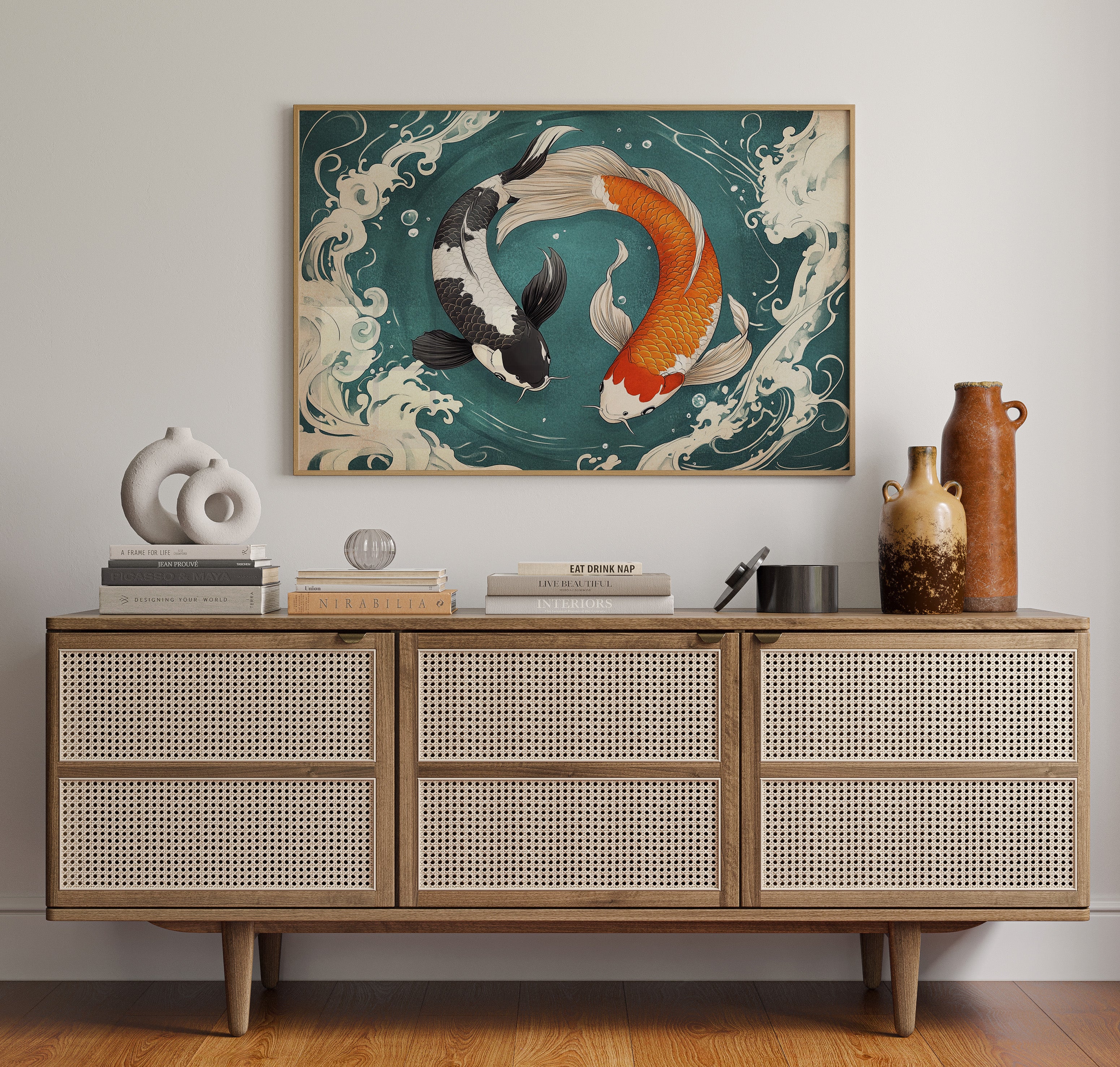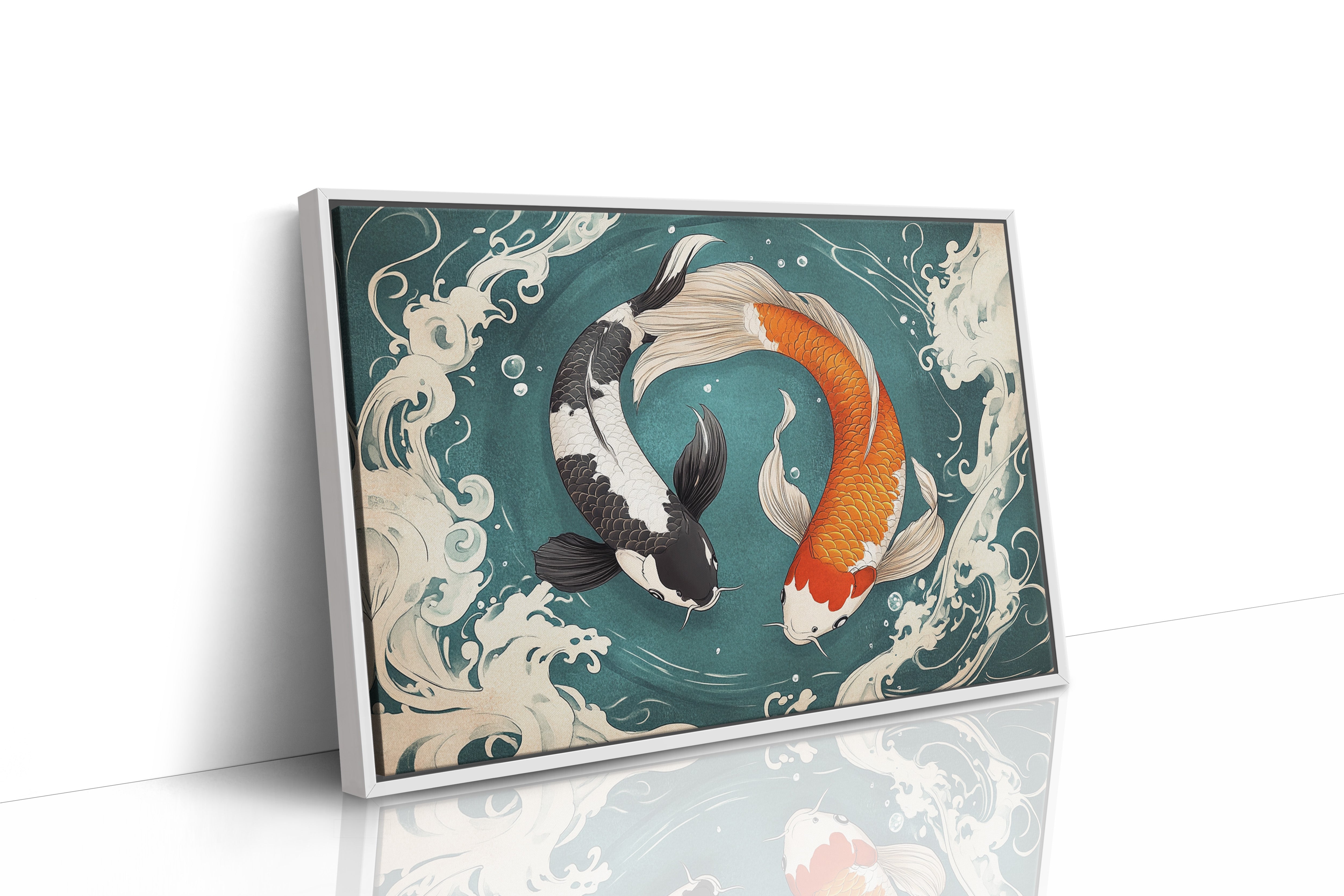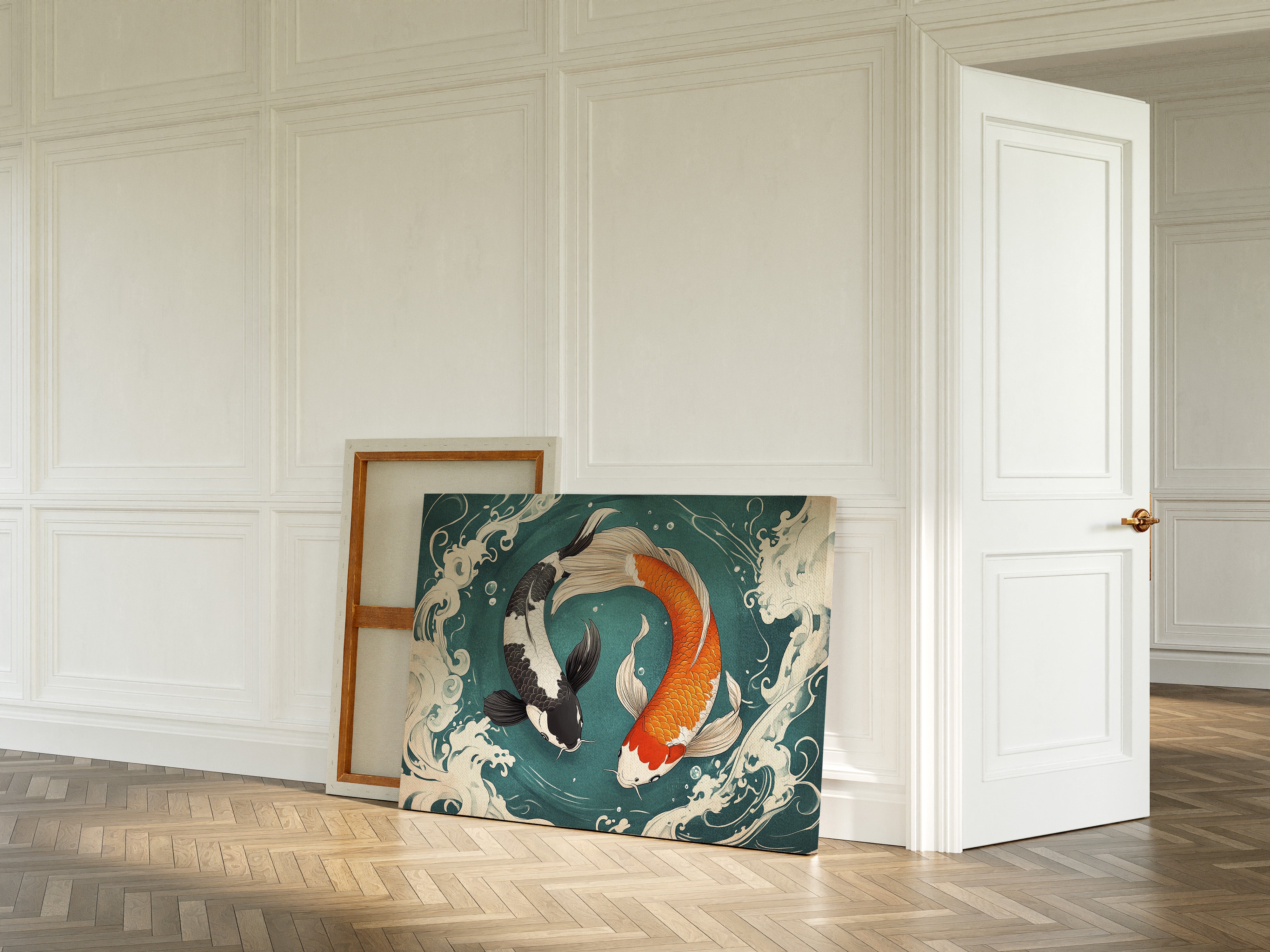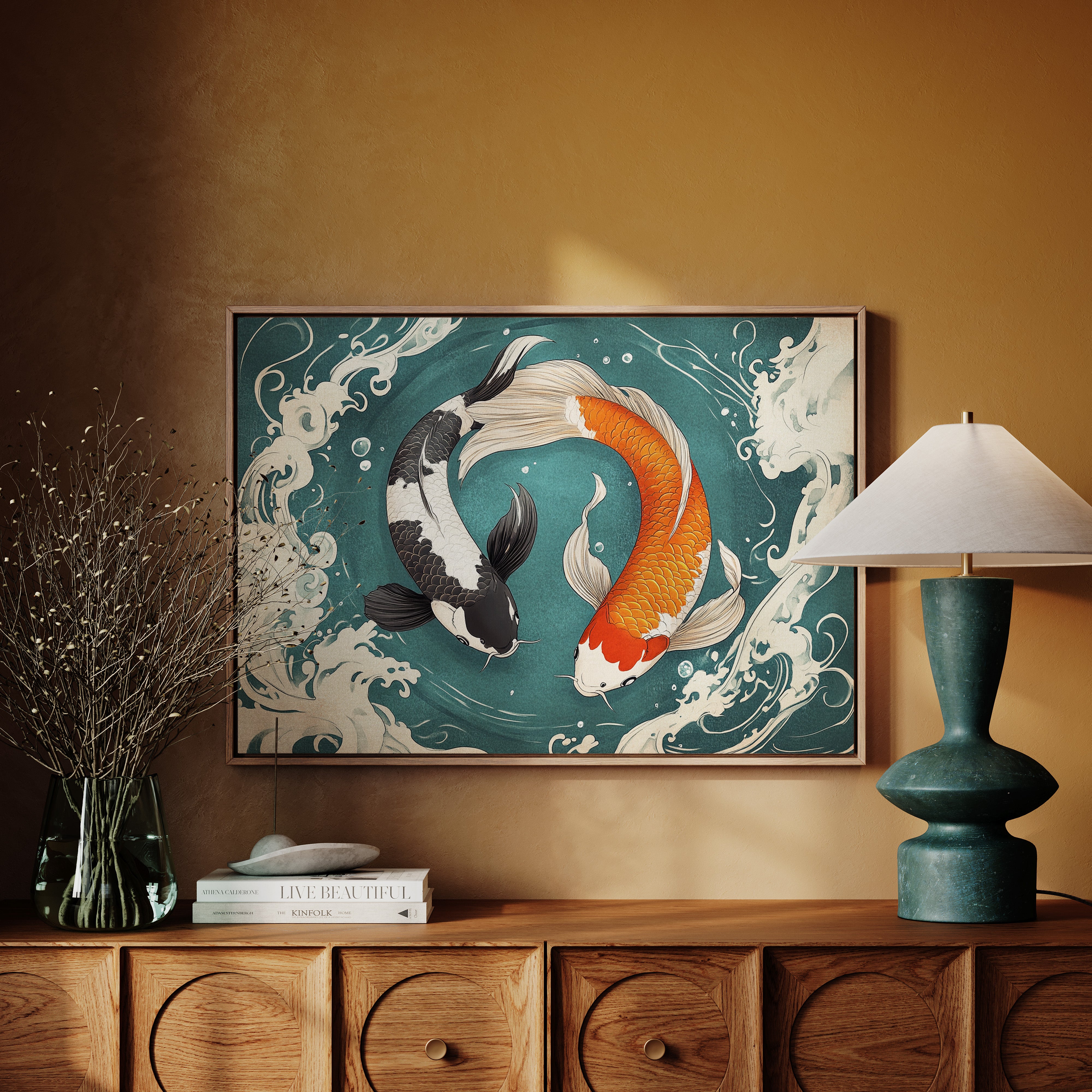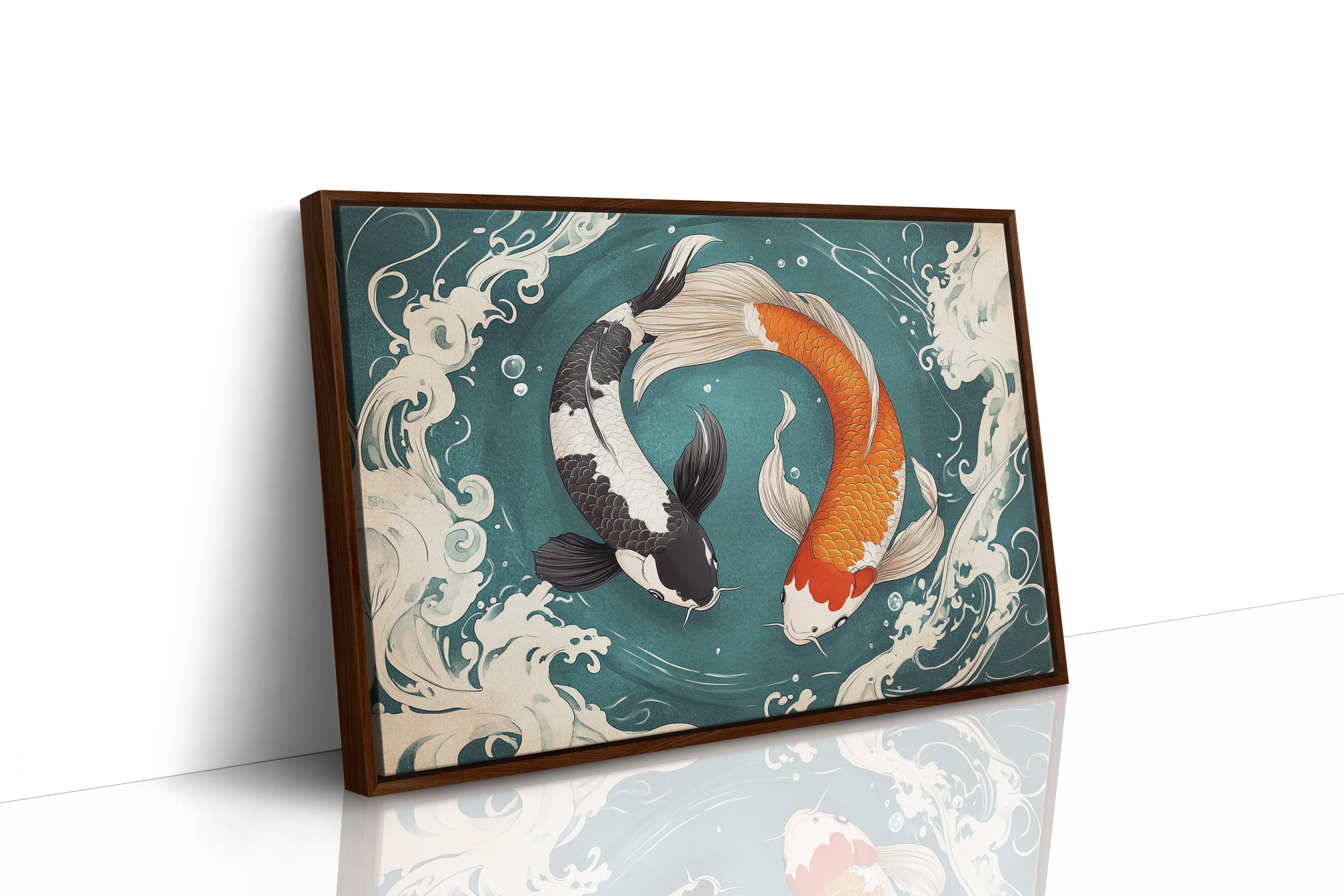Two koi fish circle in an eternal dance, their scales catching light like polished pearls against deep teal waters. The bold contrast of orange and black fins sweep through stylized waves that curl like ancient scrolls, creating a mesmerizing display of movement and grace. Delicate bubbles rise between the swirling currents, while creamy white foam crashes in traditional Japanese brush strokes, embodying both power and serenity. This piece would bring a sense of flowing tranquility to a meditation room or add an elegant focal point to a modern Asian-inspired dining space.