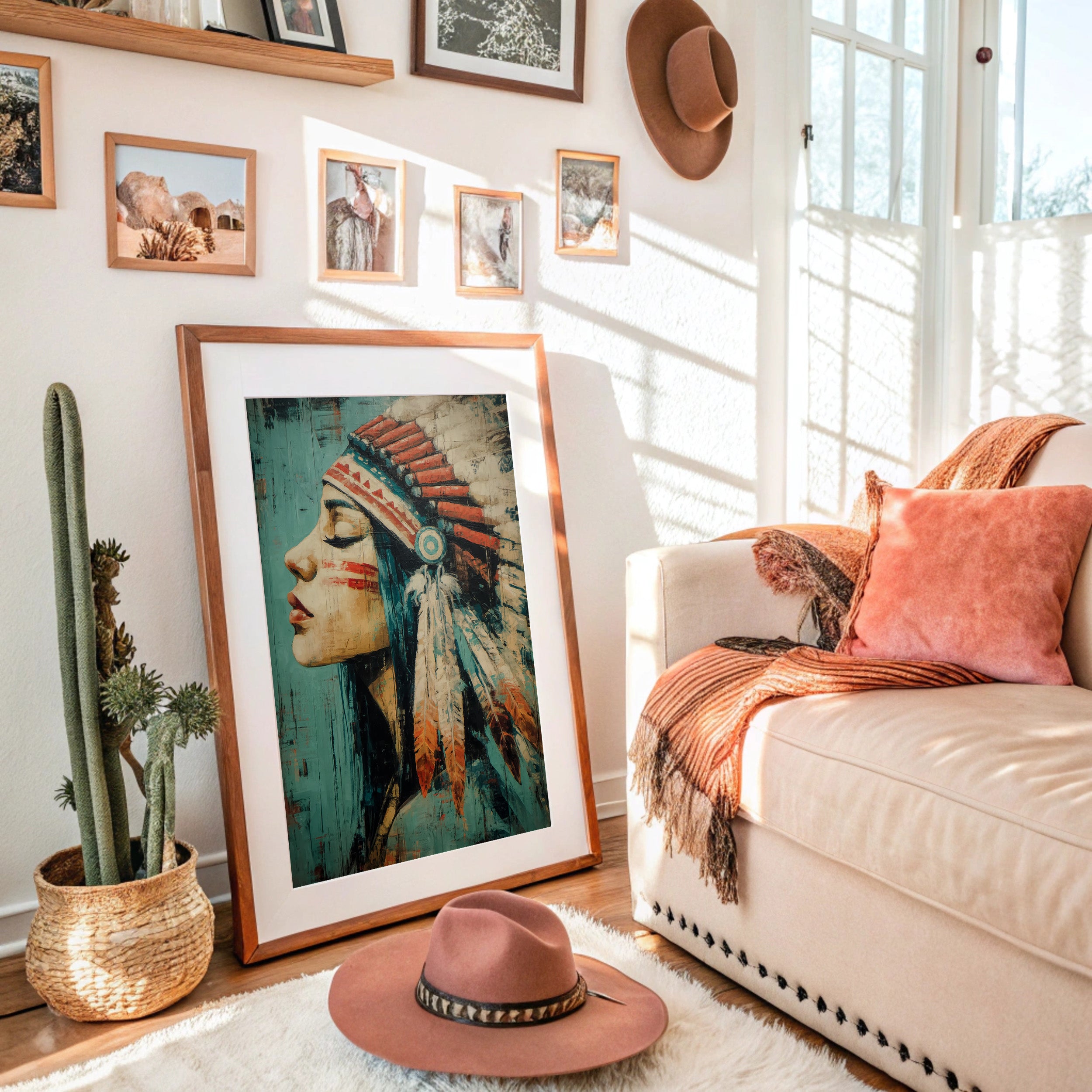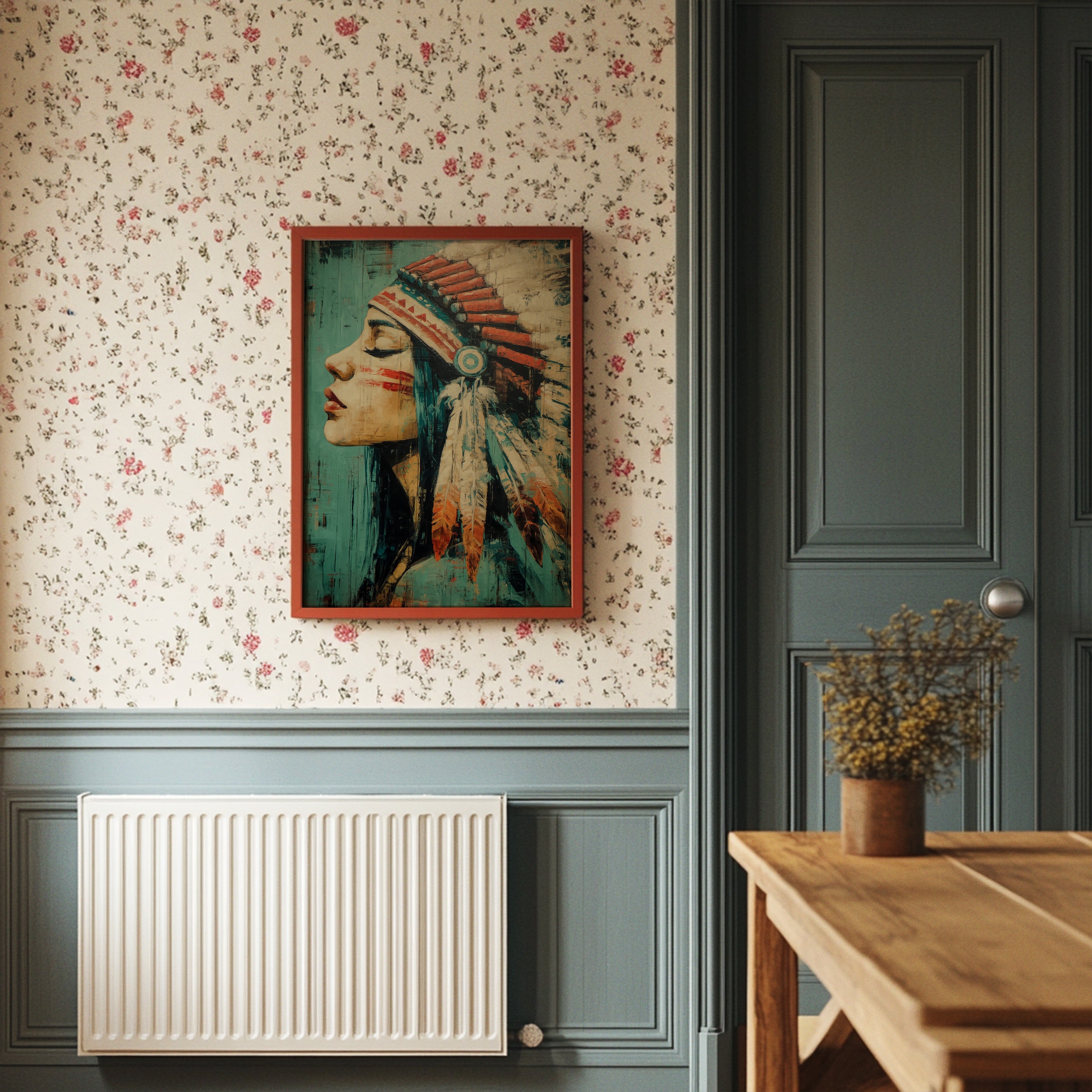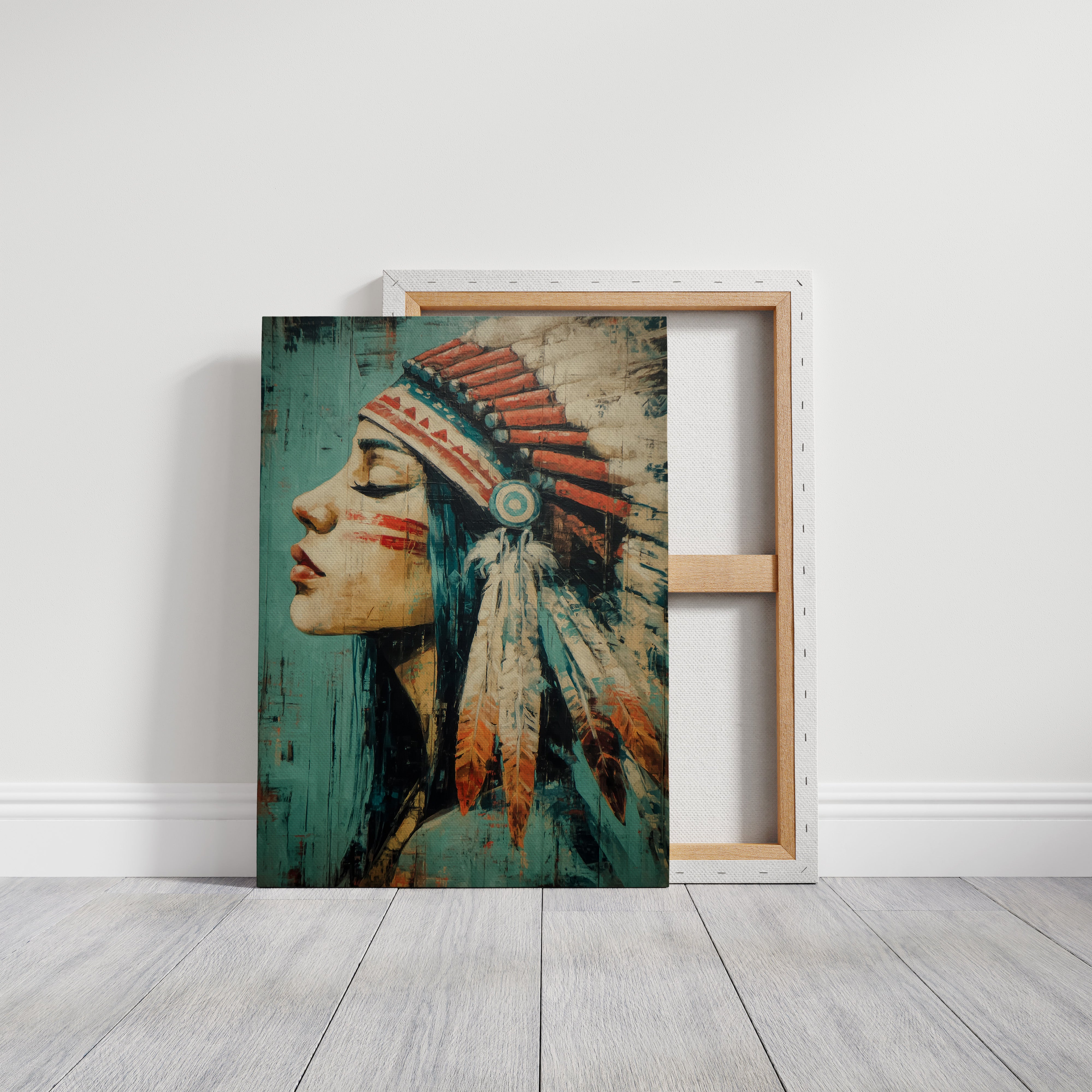 Strength and serenity intertwine in a moment of profound stillness, captured in rich turquoise and burnt orange hues. This piece from our Contemporary collection reimagines traditional indigenous imagery through a modern artistic lens. Textured brushstrokes create a weathered, dimensional quality while bold color blocking and deliberate distressing speak to both timeless wisdom and present-day perspective. The interplay of light and shadow across the profile draws the viewer into a space of reverence and reflection. Perfect for creating a striking focal point in a modern living room or adding soulful presence to a meditation space. Each viewing reveals new details in the thoughtfully layered composition.