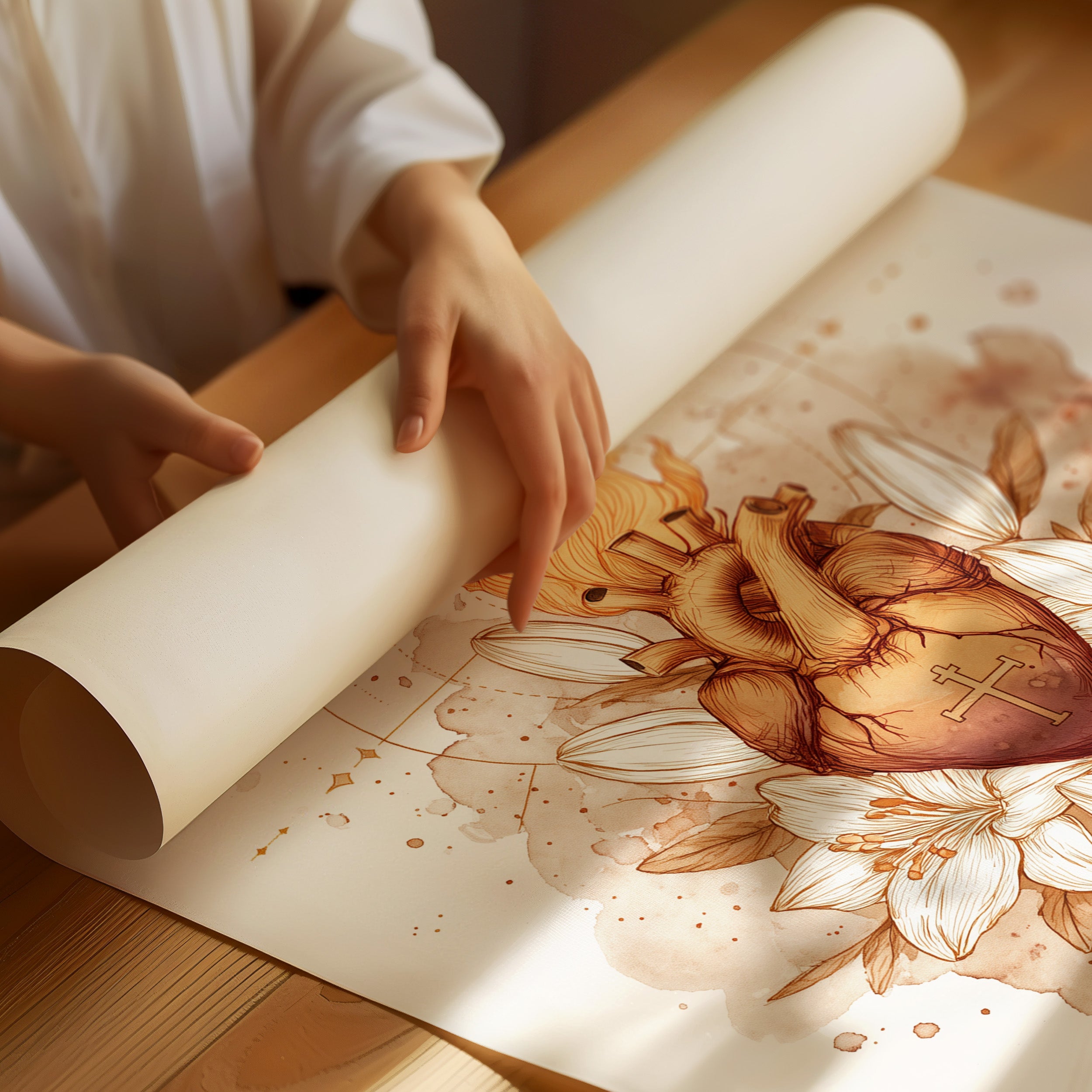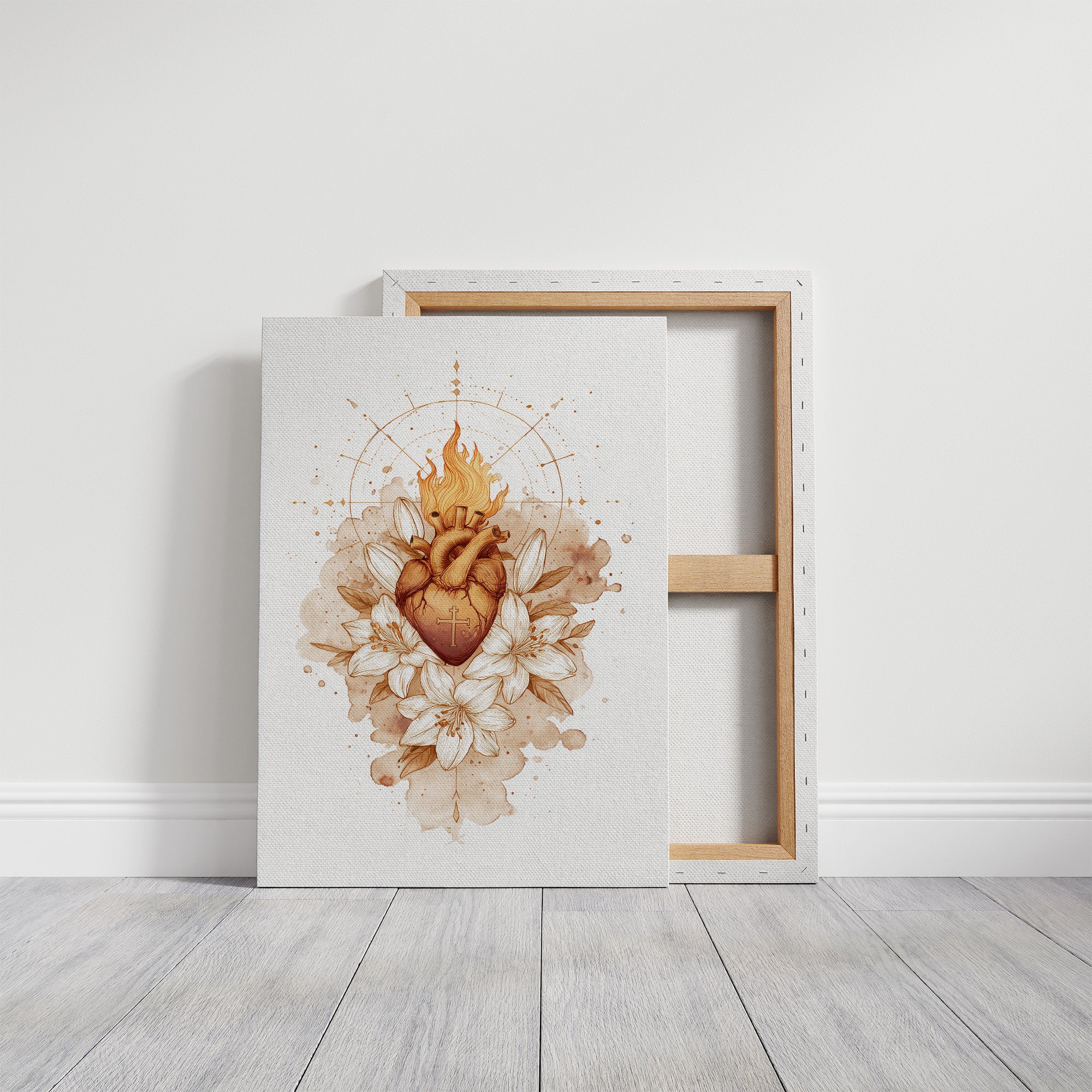 Morning light catches the edges of an anatomical heart ablaze with golden flame, nestled among pristine white lilies. The sepia watercolor splashes create a sacred geometry around the centerpiece, with delicate line work revealing both scientific precision and spiritual devotion. This contemporary illustration merges botanical elegance with symbolic depth, the cross etched into the heart speaking to faith while the circular mandala suggests universal connection. Perfect for a meditation space or reading nook where contemplative beauty inspires daily reflection.