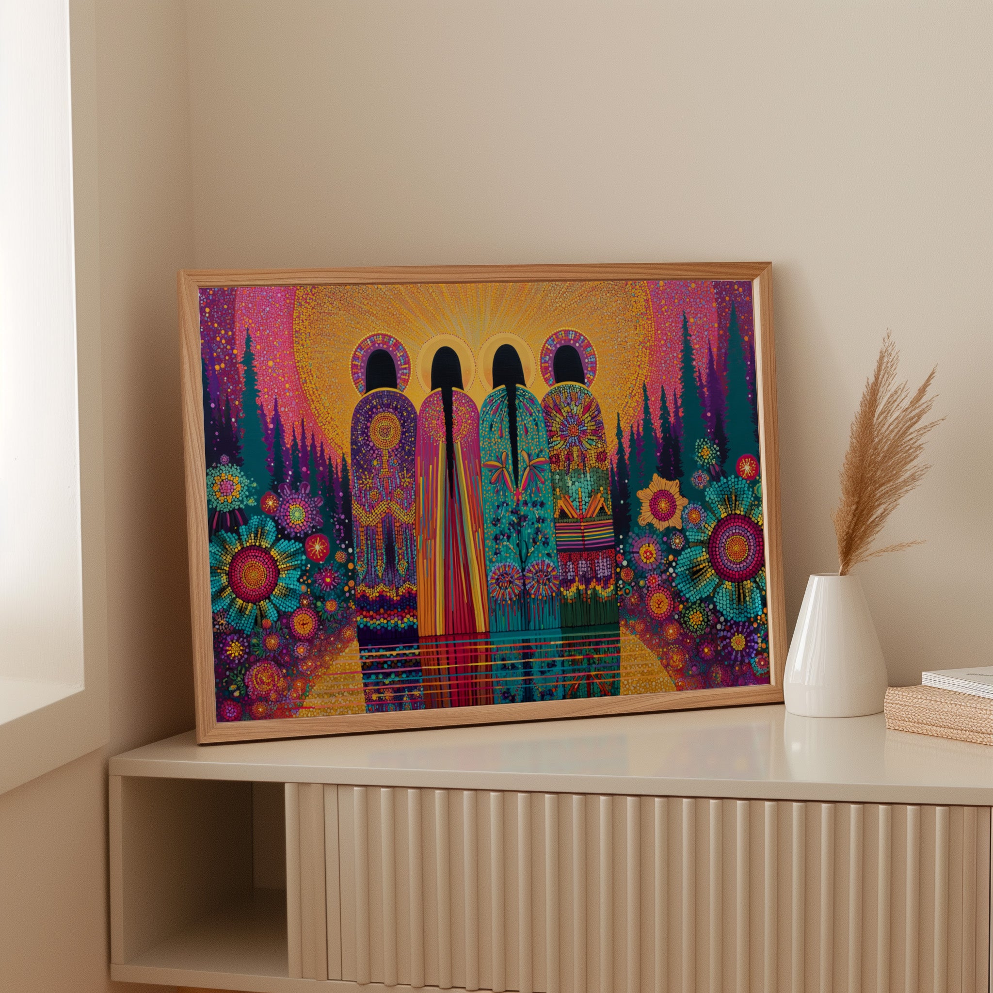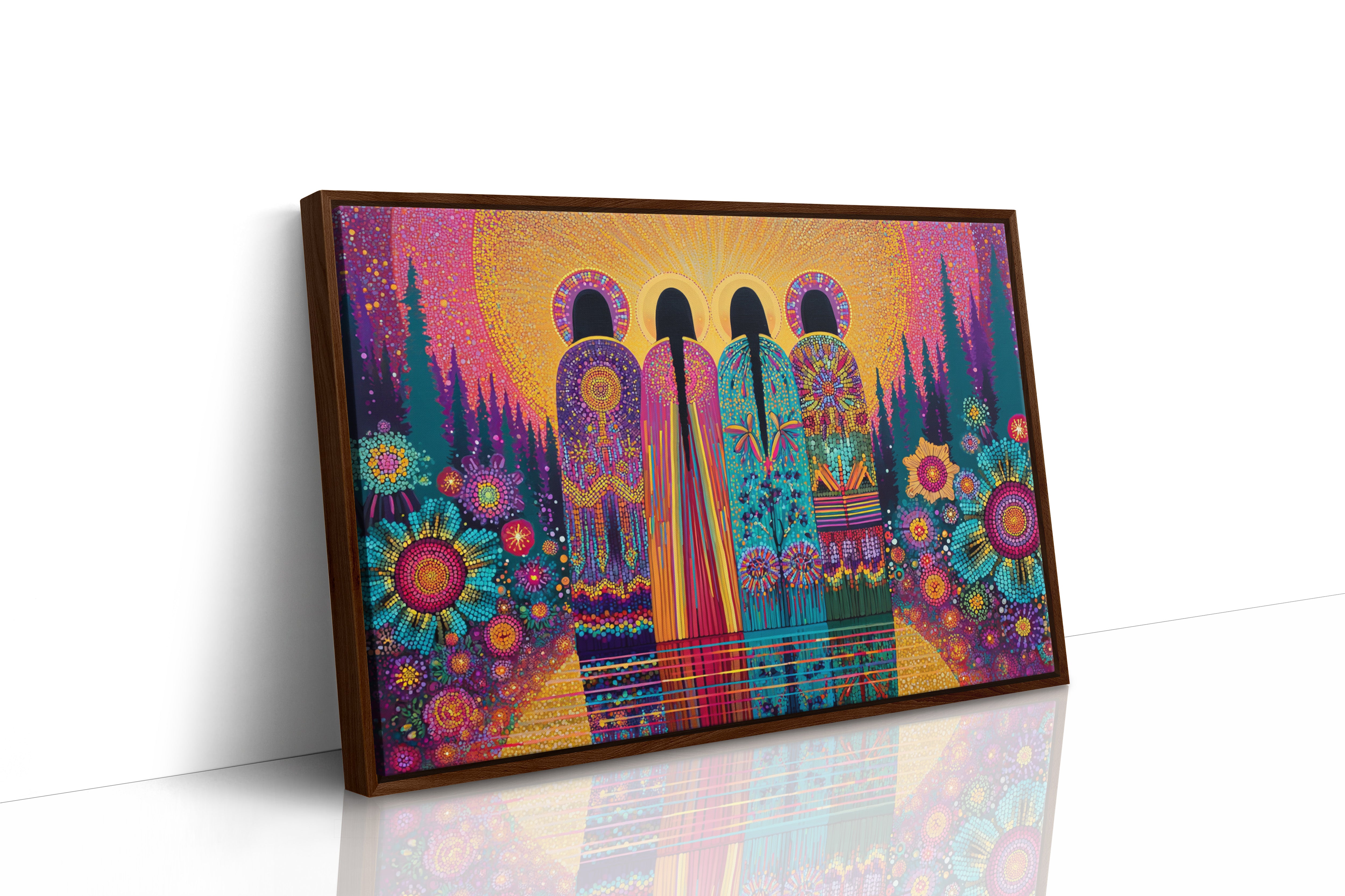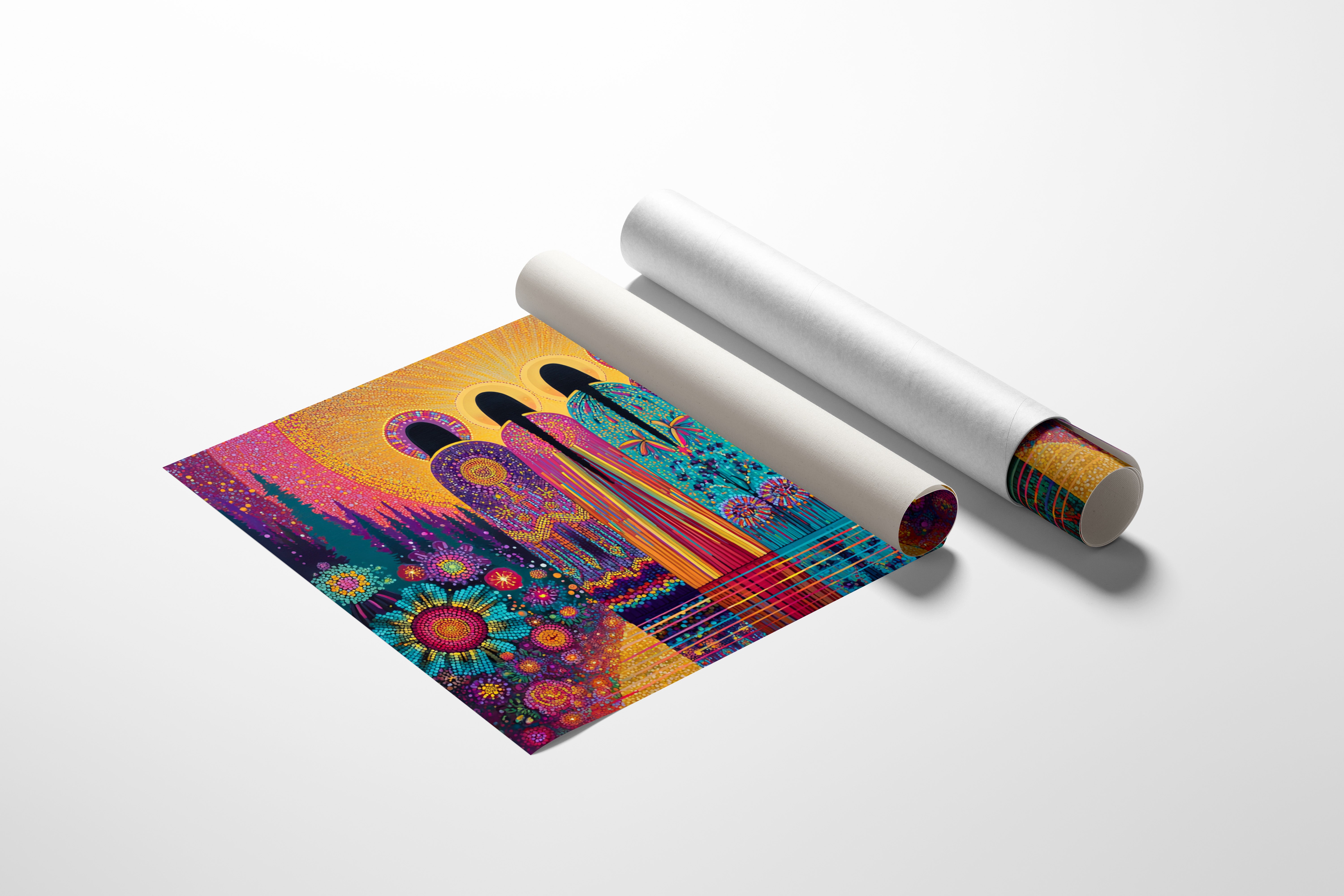 Vibrant dots of light dance through mystical archways, creating a kaleidoscope of color and wonder. The scene unfolds like an enchanted cathedral where nature and architecture merge in harmonious celebration. Rich jewel tones of turquoise, magenta, and gold weave together in a mosaic pattern, while geometric flowers bloom beneath towering evergreens. This piece captures the magical moment when sunlight transforms ordinary spaces into extraordinary sanctuaries. Perfect for meditation rooms, creative spaces, or any area where you want to infuse spiritual energy and artistic inspiration.