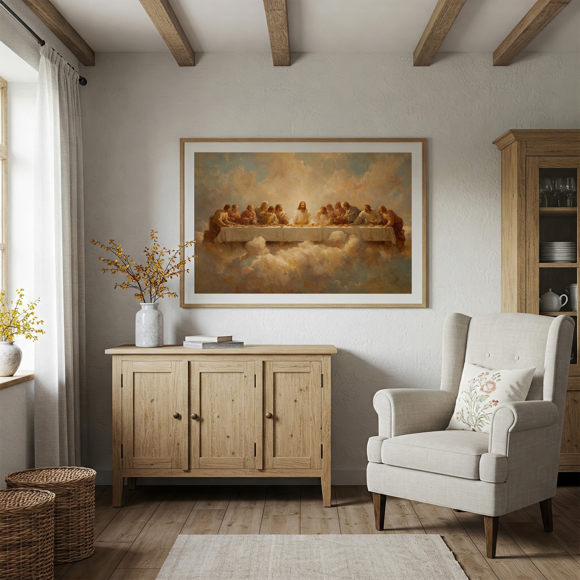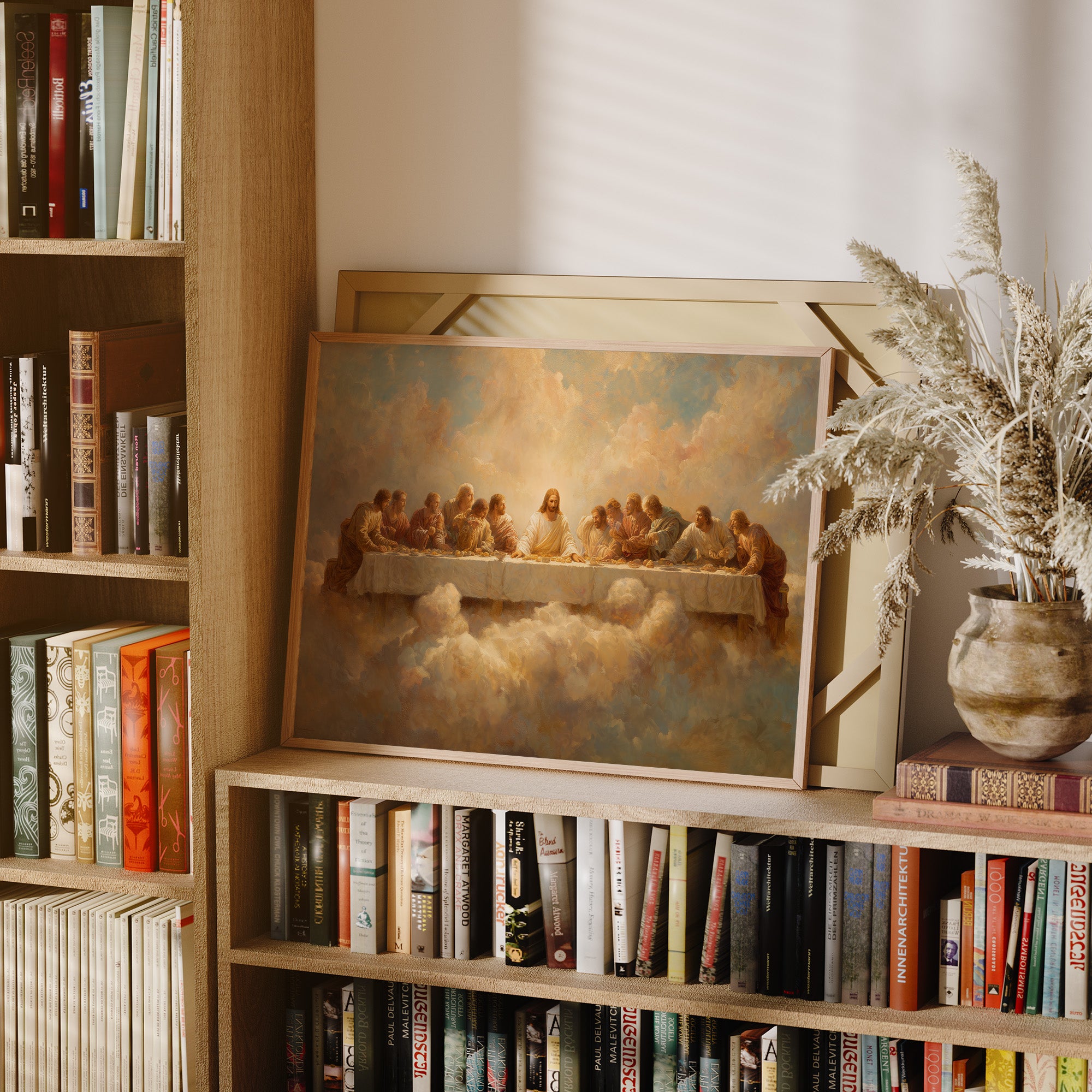 Soft golden light bathes this ethereal scene, creating an atmosphere of reverence and timelessness. The classical painting rests thoughtfully against neutral walls, surrounded by carefully curated books and delicate dried pampas grass. The warm tones and celestial clouds create a sense of elevation, bringing spiritual depth to this contemplative corner of a home.