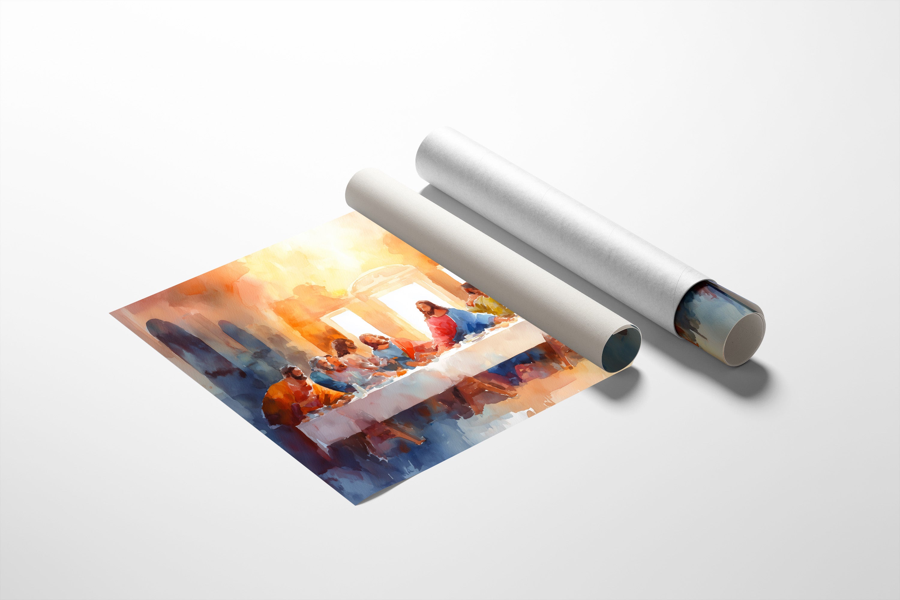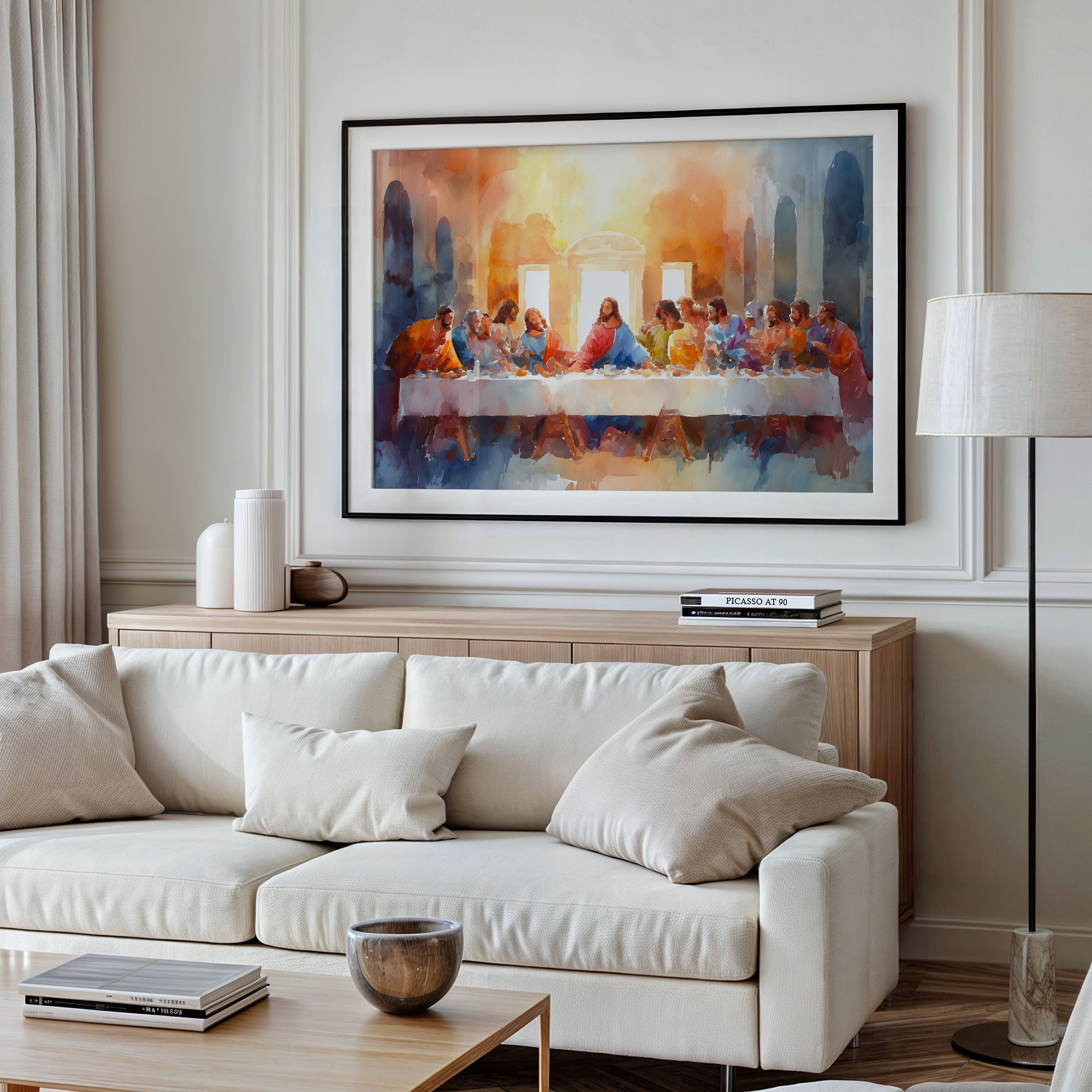 Warm golden light floods through ancient windows, illuminating a timeless scene of communion and connection. Watercolor brushstrokes blend vibrant oranges and blues, creating a luminous atmosphere where figures gather around a long table in shared purpose. This contemporary interpretation rests thoughtfully among collected volumes, bringing spiritual depth and artistic expression to a personal library or reading nook.