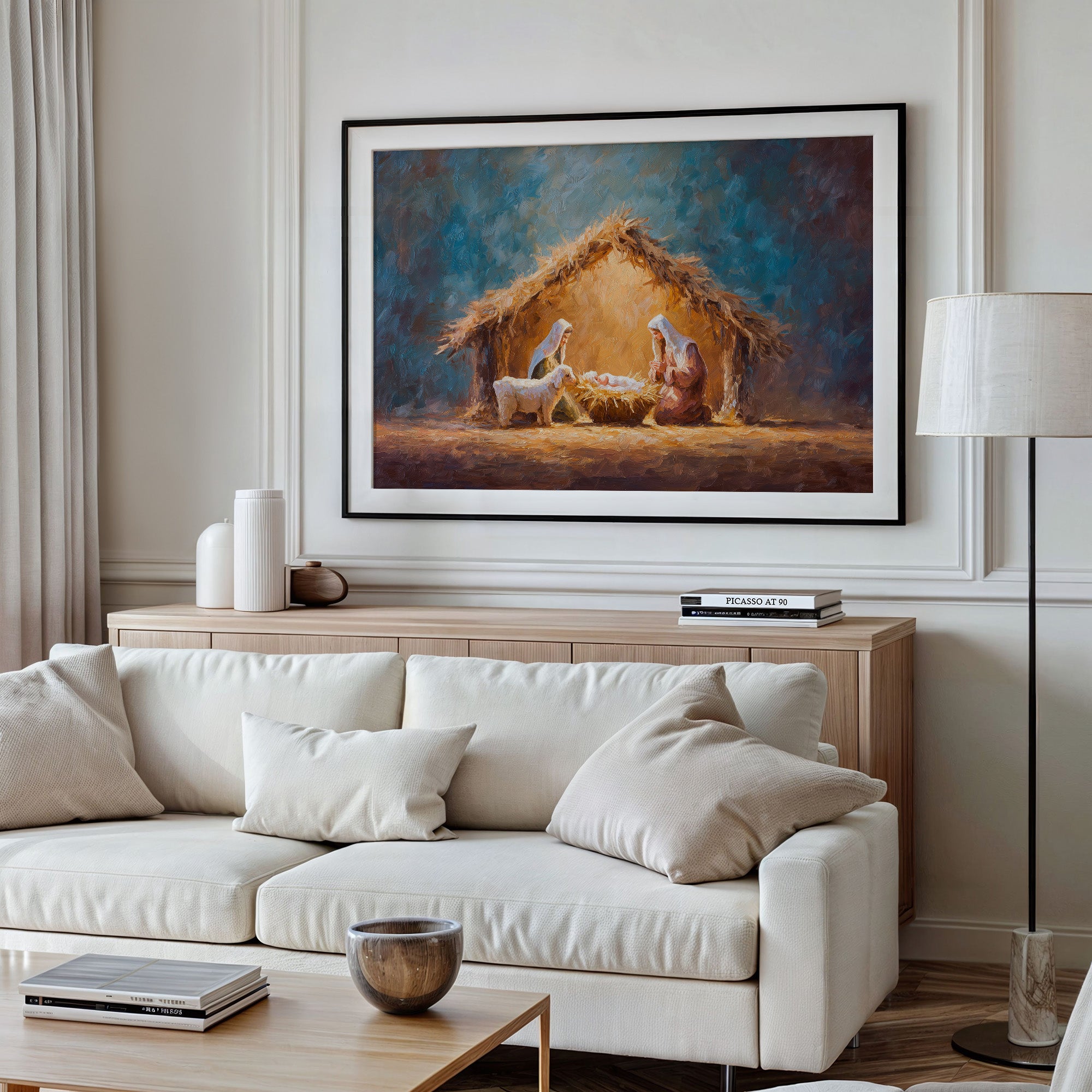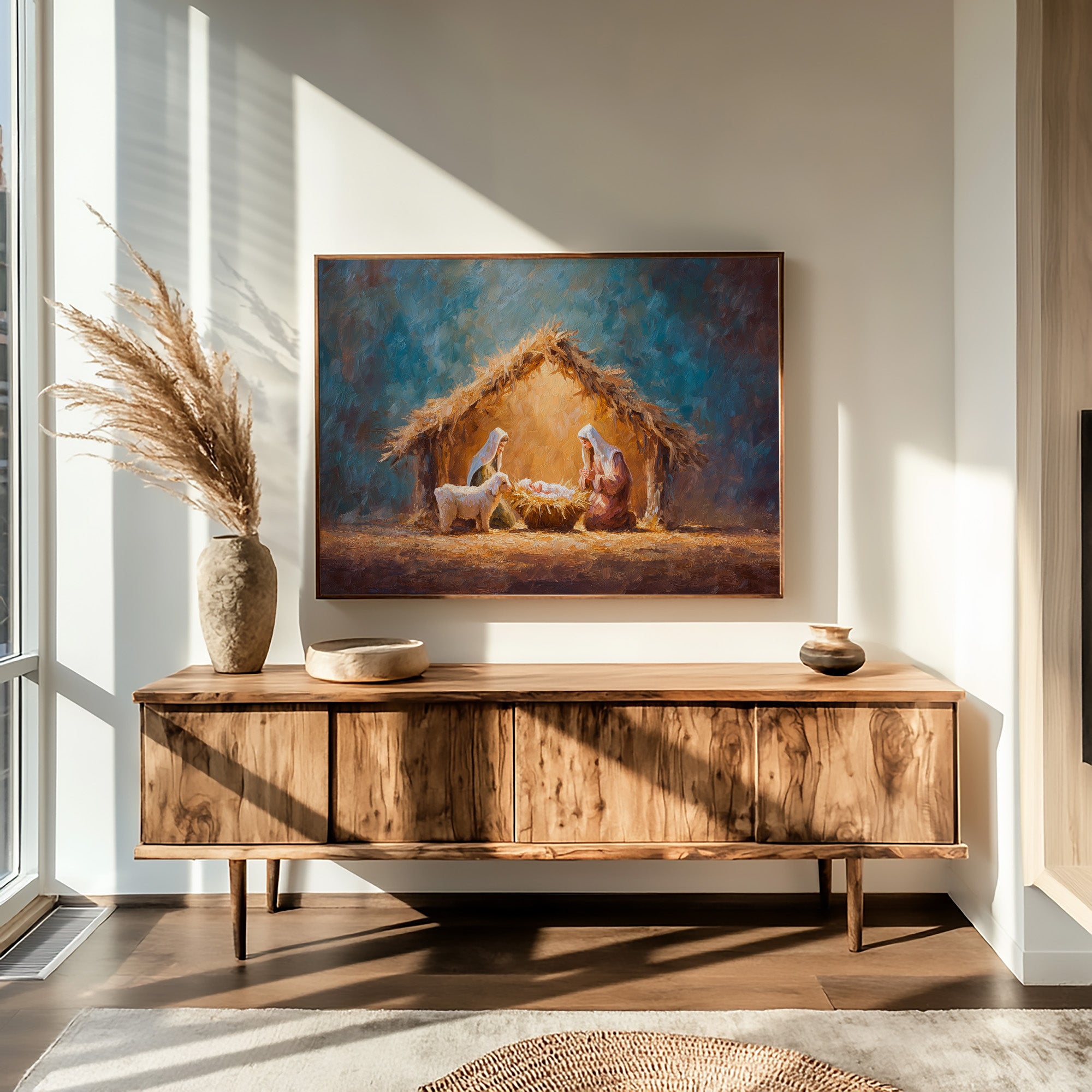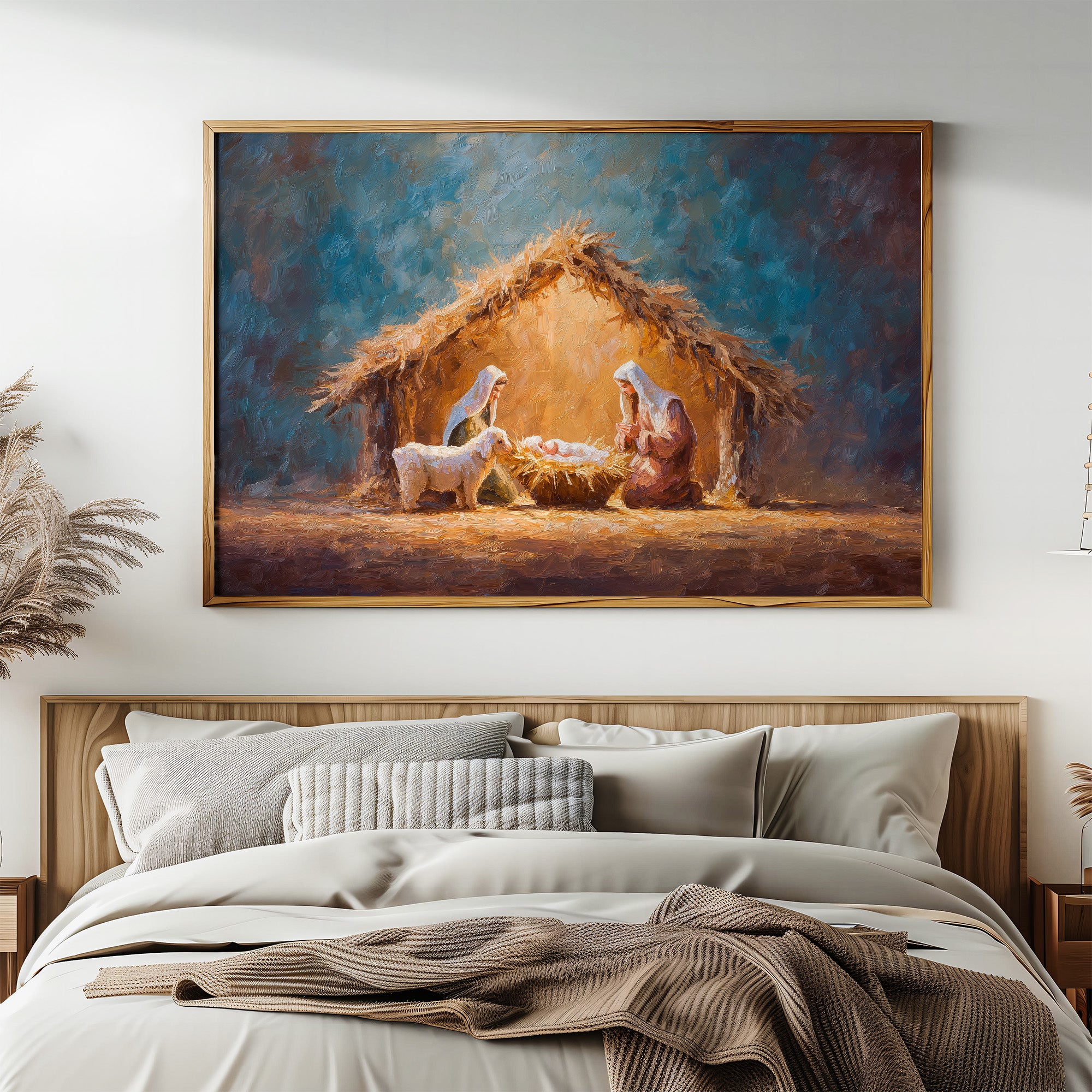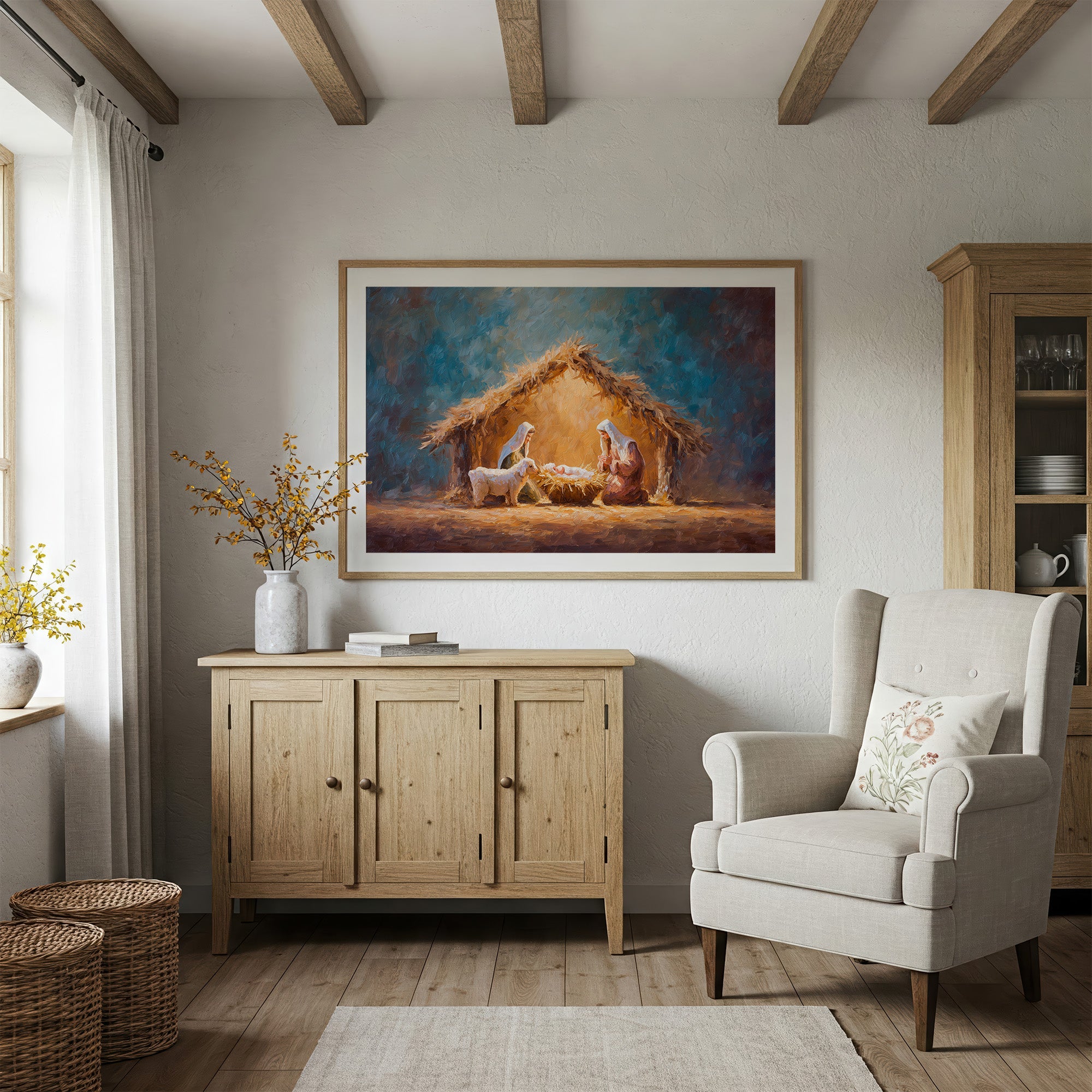 Warmth radiates from the humble stable scene, golden light cradling the holy family in a cocoon of peace. Deep azure surrounds the rustic shelter, creating a celestial contrast with the earthy ochres and ambers of the manger. The artist's brushstrokes capture both reverence and intimacy, inviting viewers to pause in contemplation of this timeless moment. This piece brings spiritual depth and reflective beauty to a reading nook, study, or living space during holiday seasons and throughout the year.