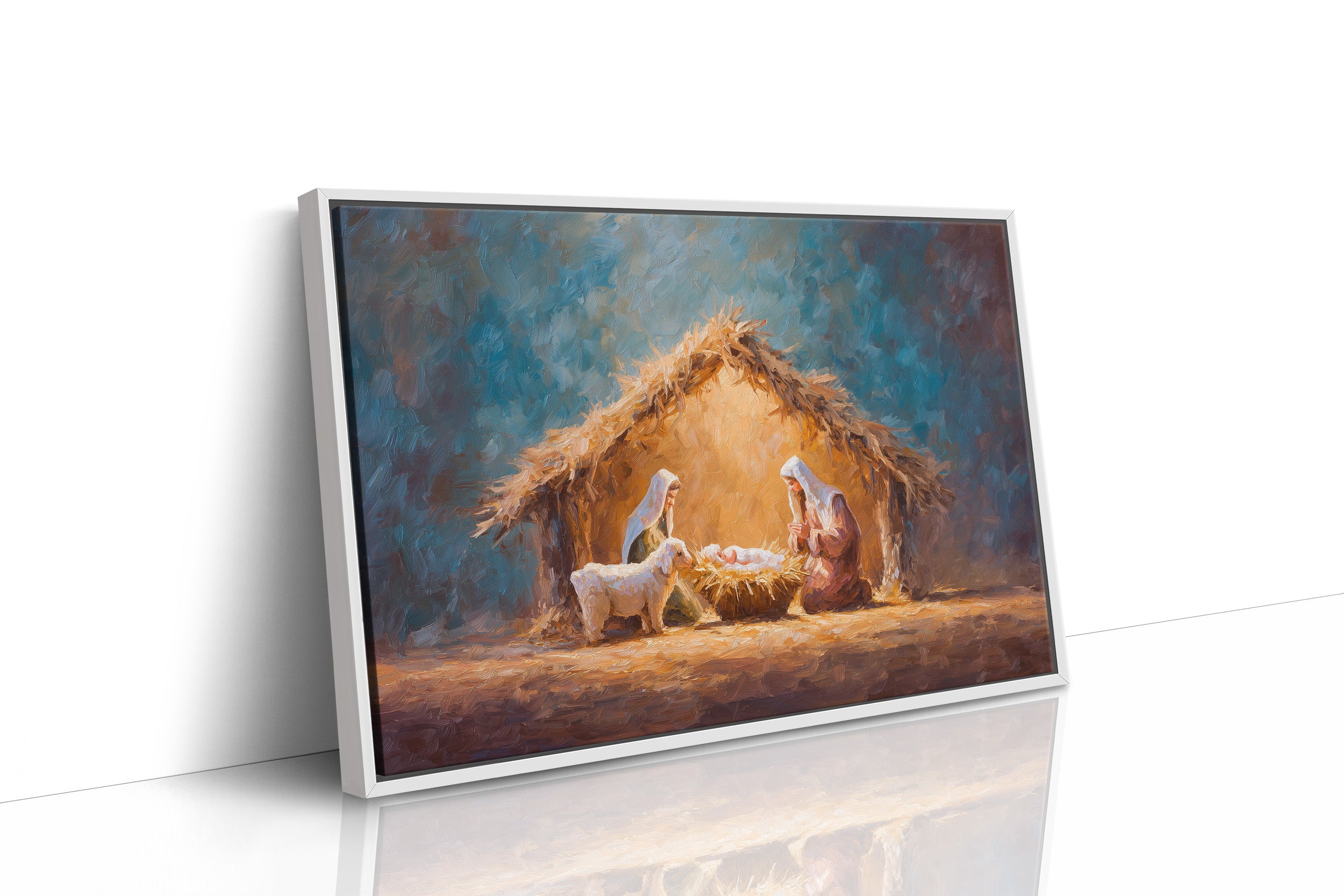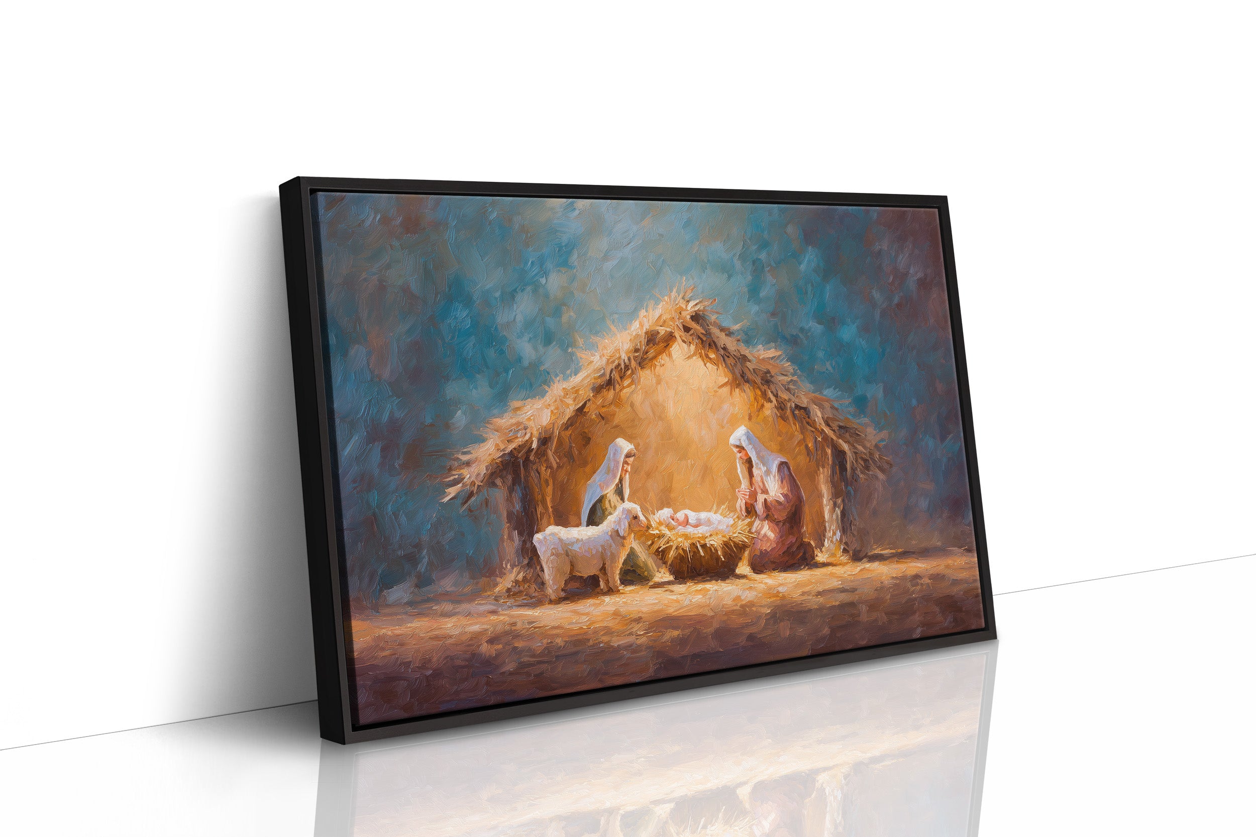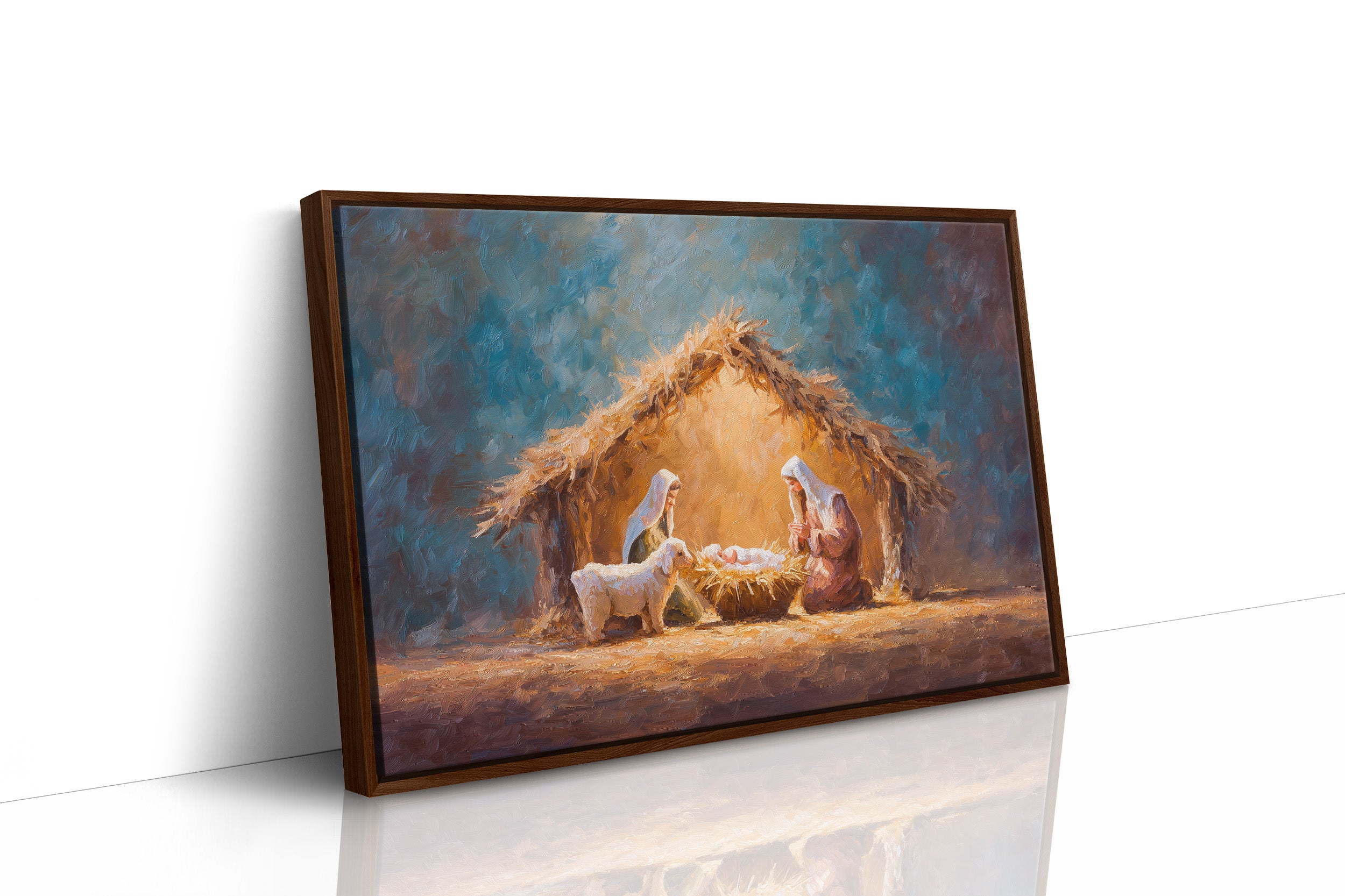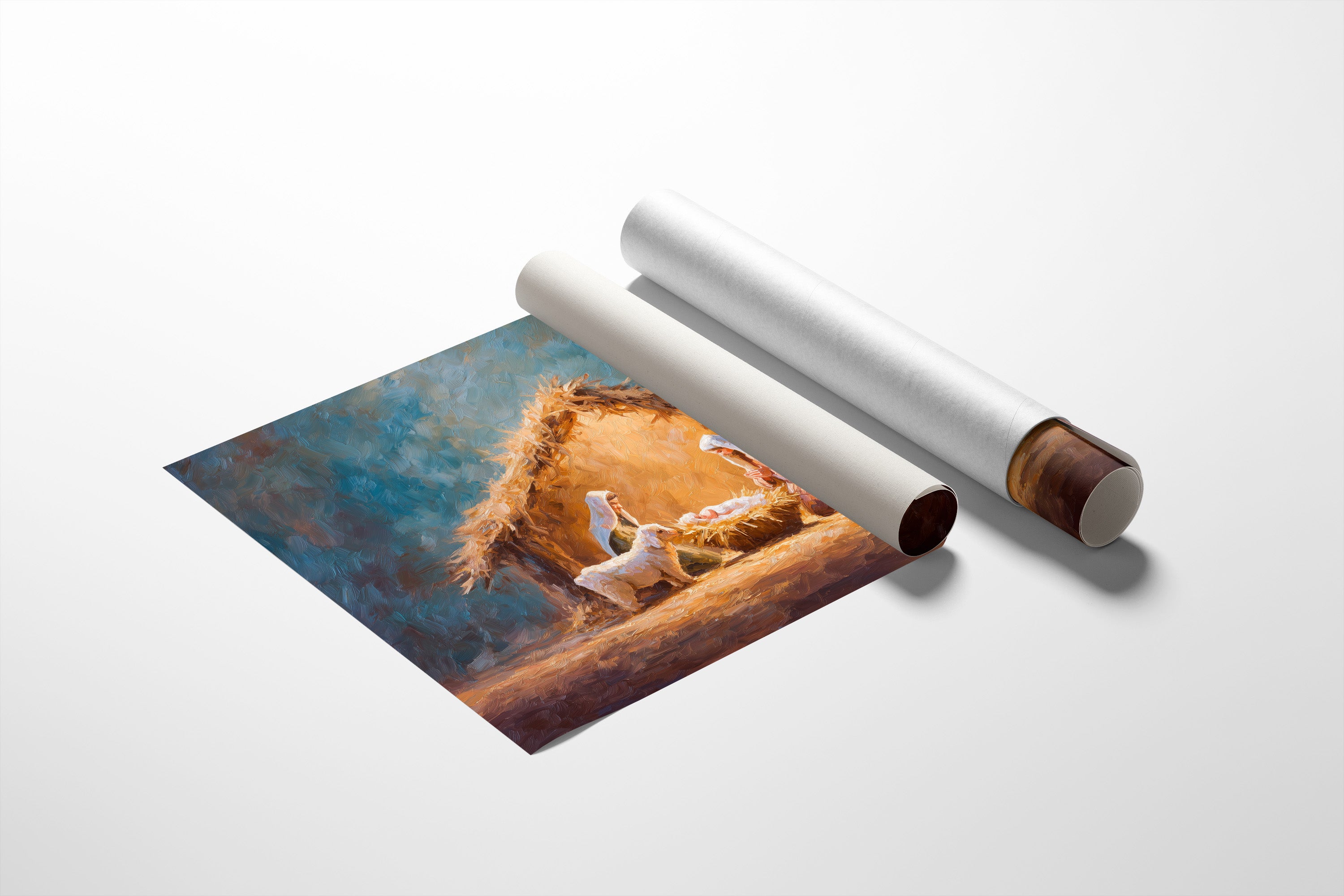 Warmth radiates from the humble stable scene, golden light cradling the holy family in a cocoon of peace. Deep azure surrounds the rustic shelter, creating a celestial contrast with the earthy ochres and ambers of the manger. The artist's brushstrokes capture both reverence and intimacy, inviting viewers to pause in contemplation of this timeless moment. This piece brings spiritual depth and reflective beauty to a reading nook, study, or living space during holiday seasons and throughout the year.
