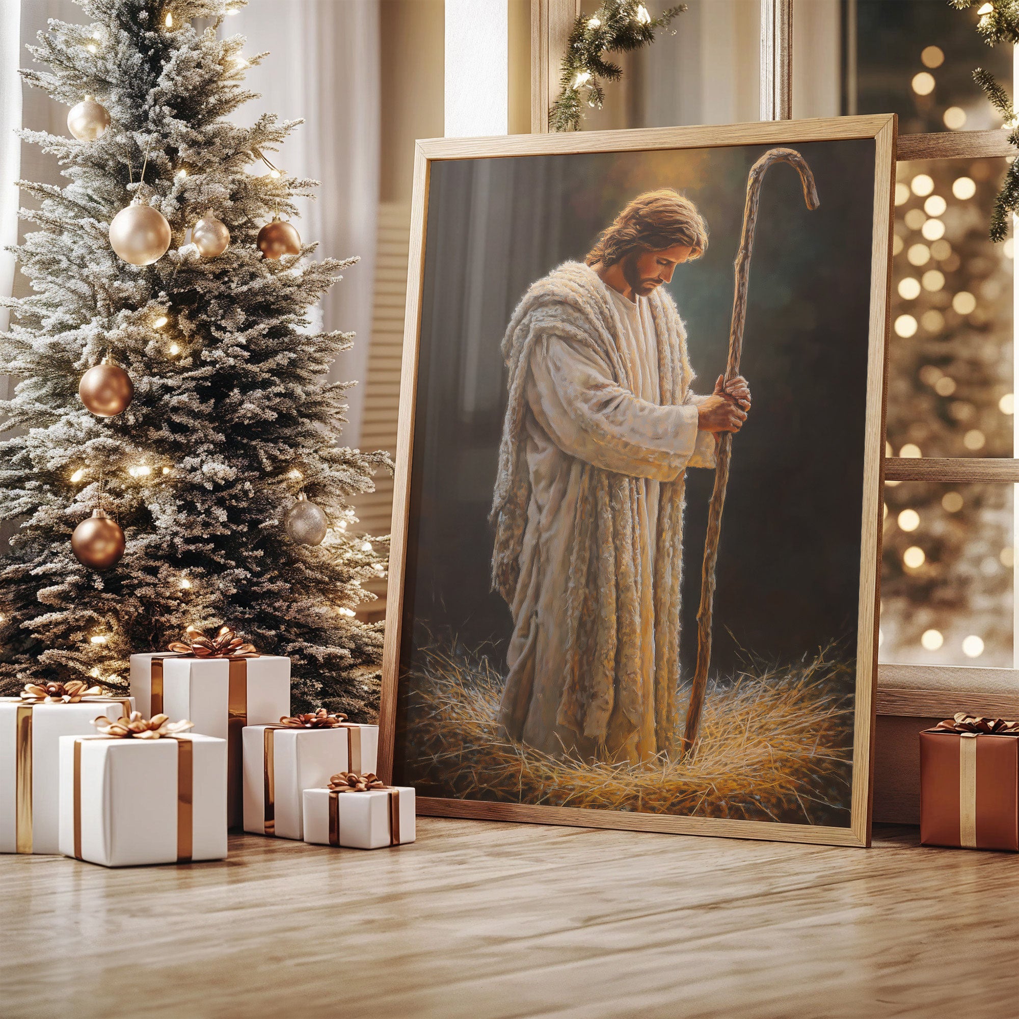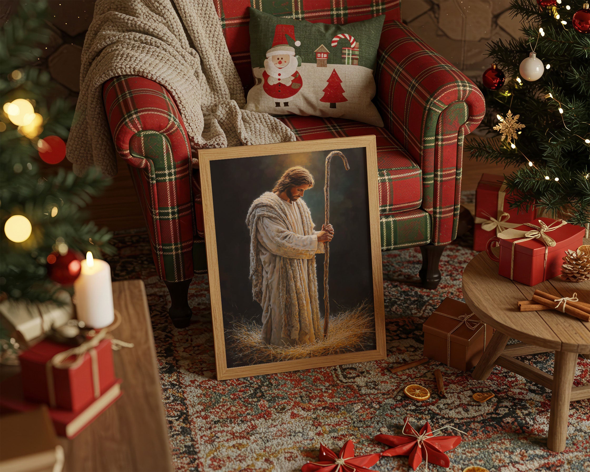 Gentle morning light streams through sheer curtains, casting delicate shadows across a serene corner sanctuary. A striking portrait in warm earth tones creates a focal point above a minimalist wooden bench, while a luminous white Christmas tree glows with quiet radiance. The composition balances modern simplicity with timeless spirituality, creating an atmosphere of peaceful contemplation. This thoughtful arrangement transforms an everyday space into a meditation on light and faith, where natural and artificial illumination dance together in perfect harmony. Perfect for creating a dedicated space of reflection in a modern home, whether in a quiet reading nook or peaceful entryway.