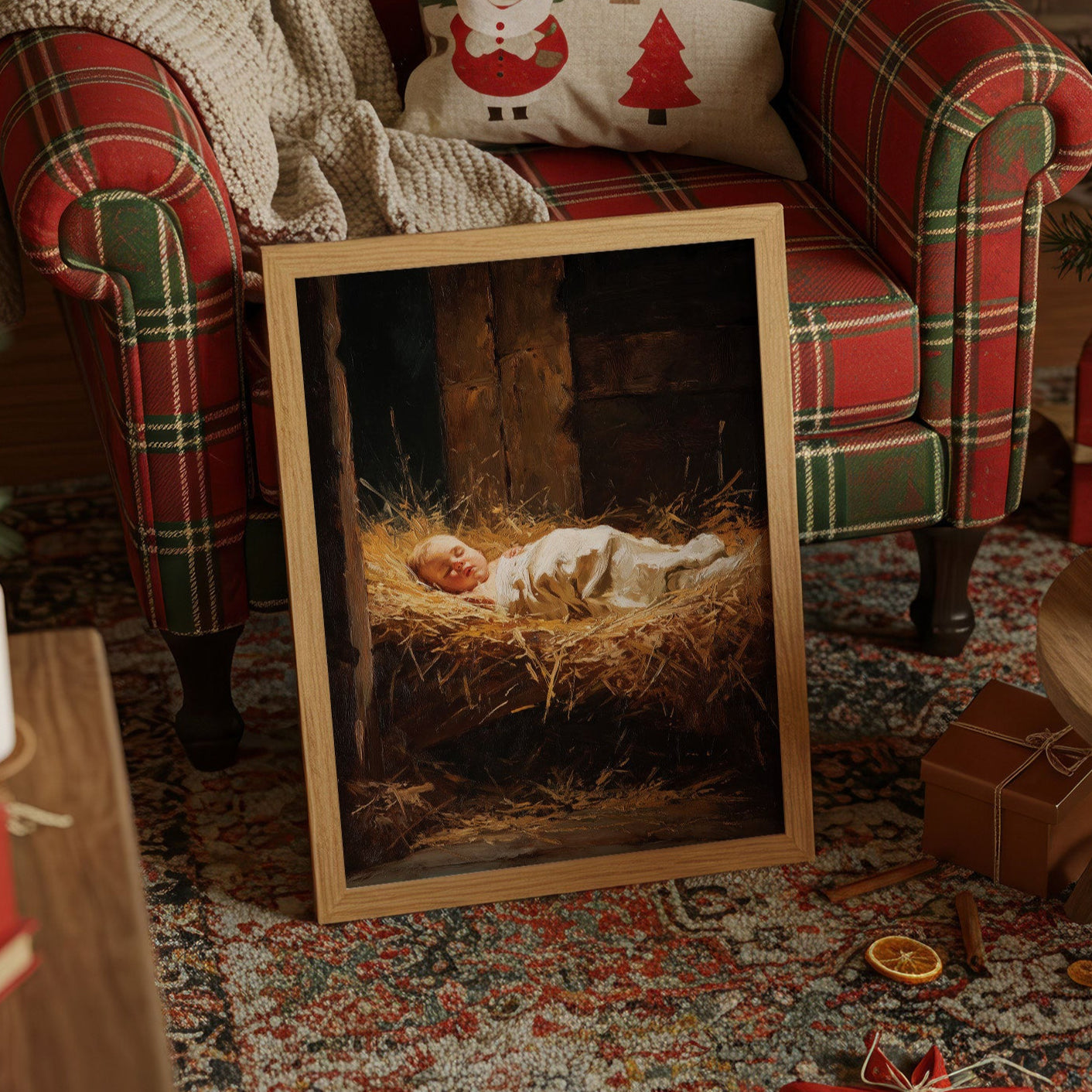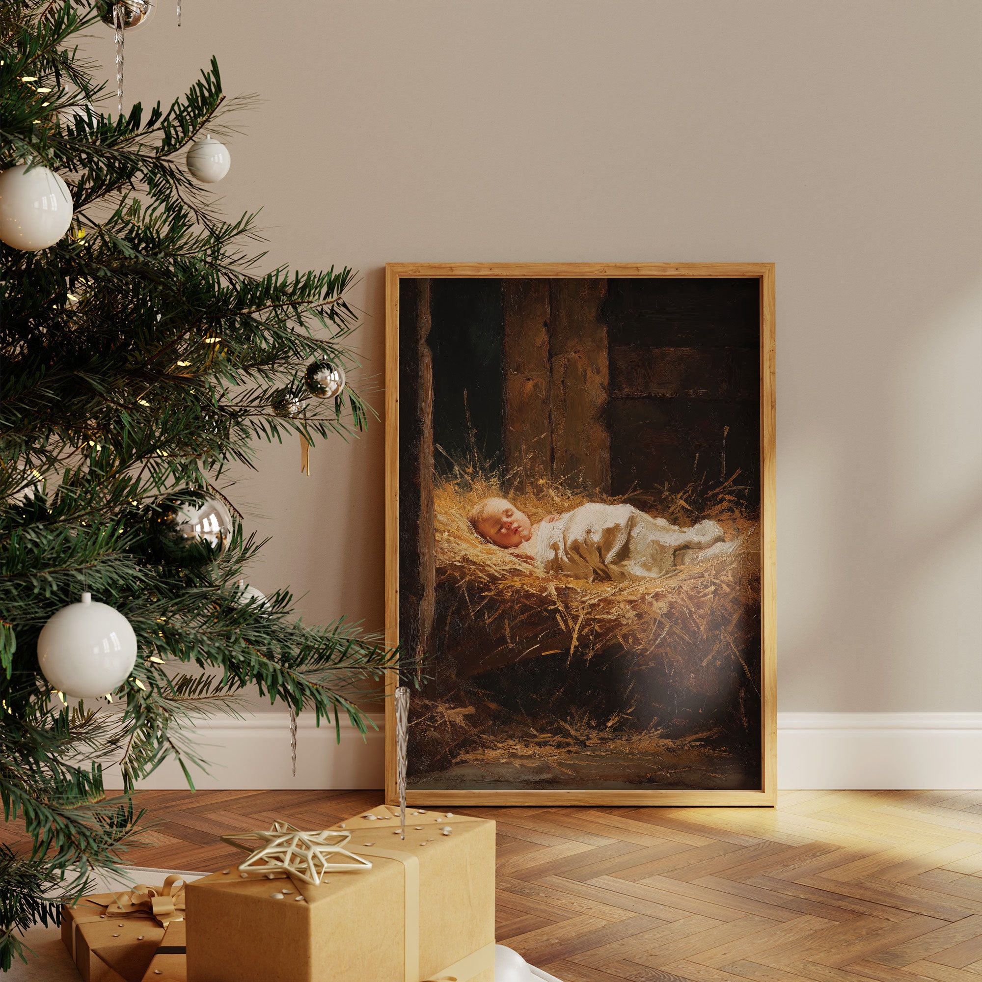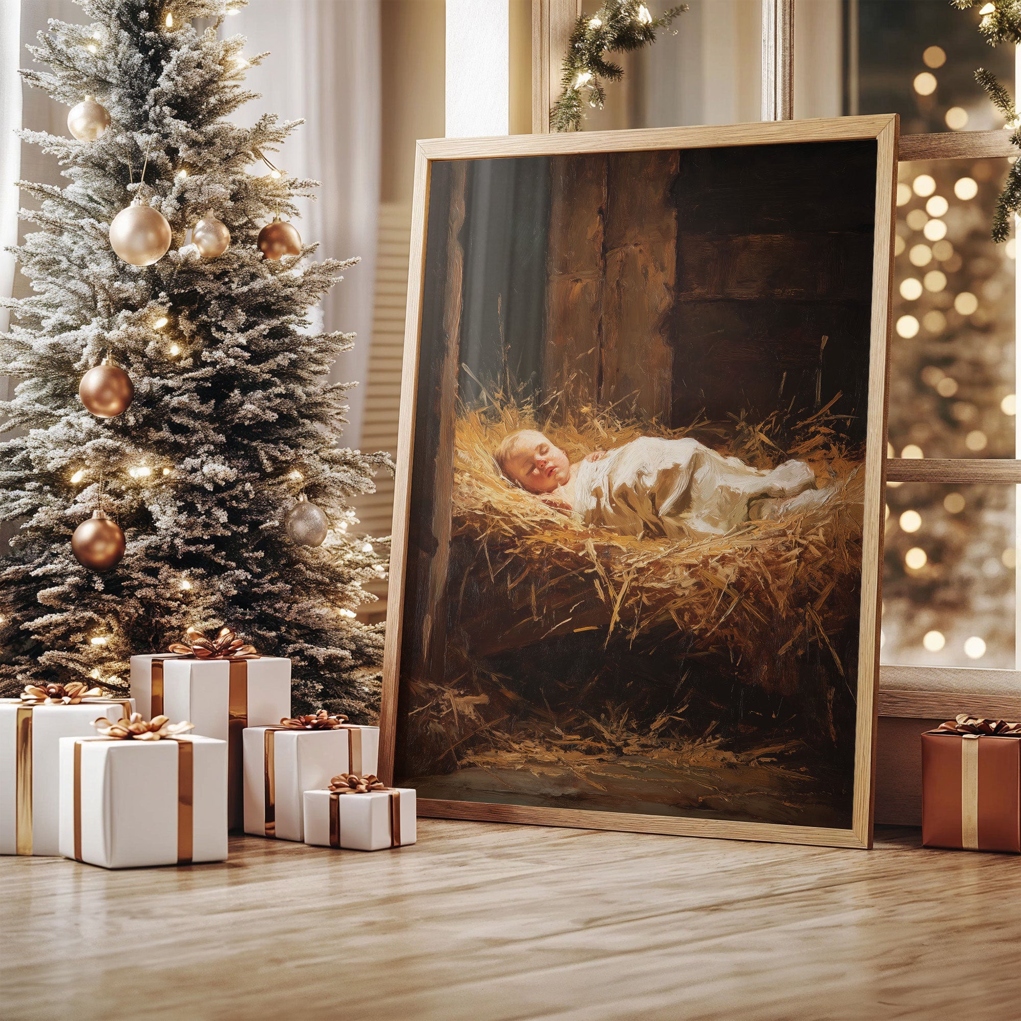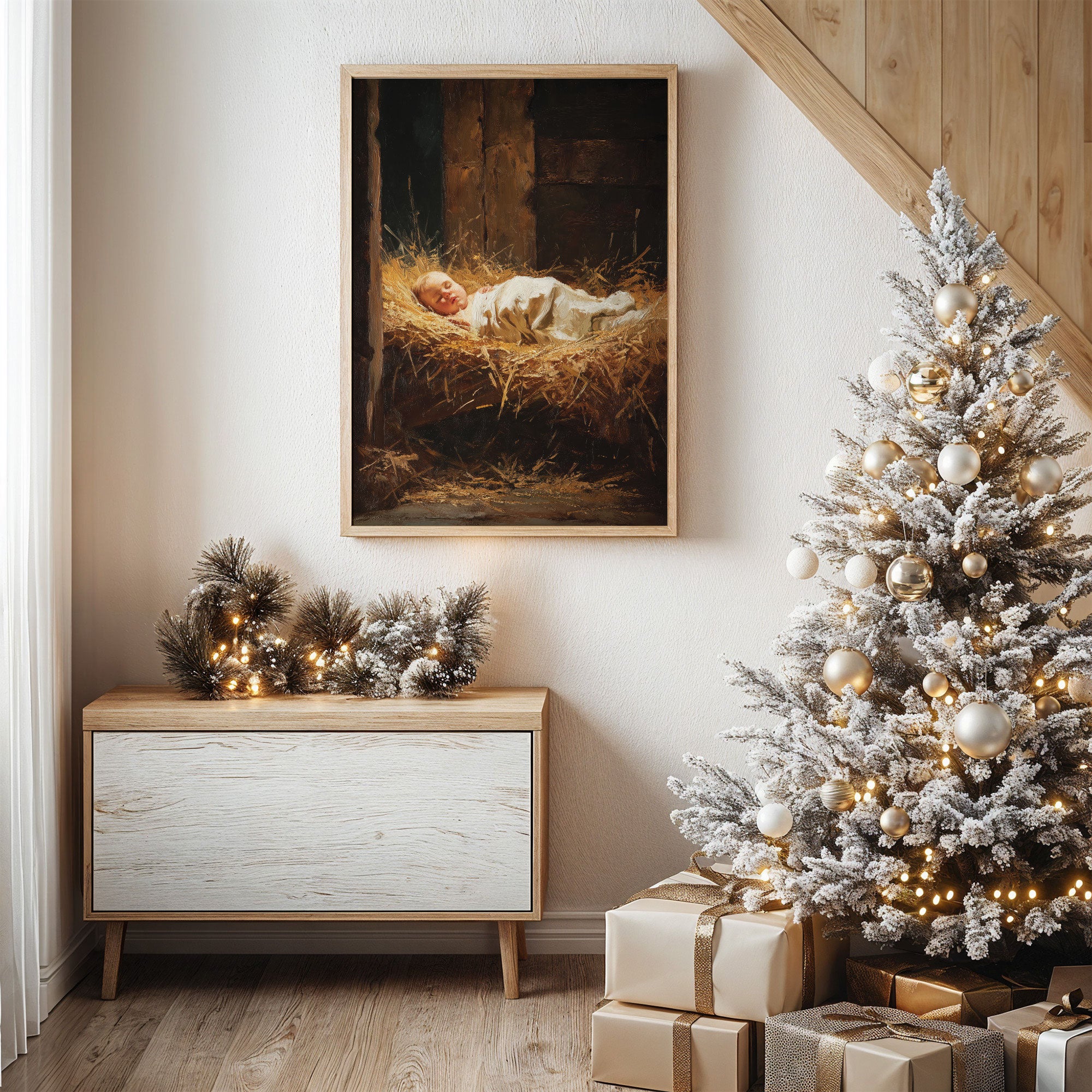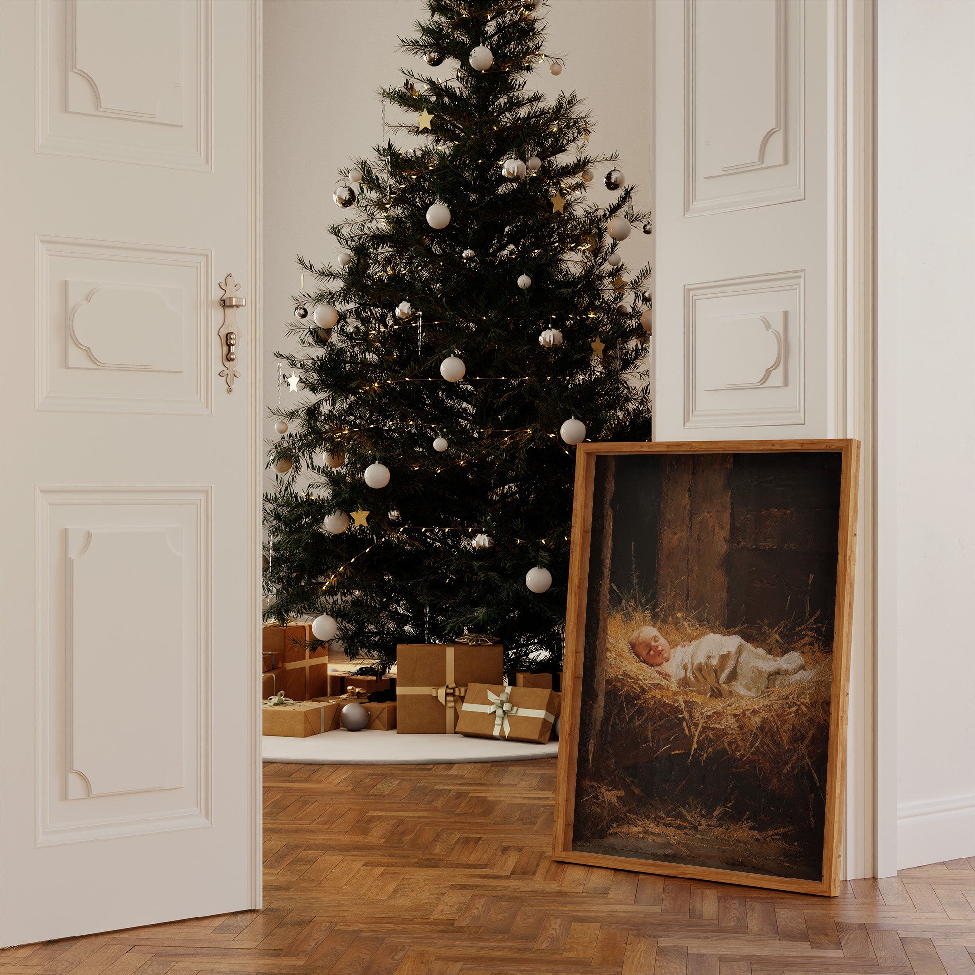 Gentle morning rays filter through sheer curtains, casting ethereal shadows across a serene minimalist space. A striking artwork depicting a peaceful scene in rich earth tones anchors the wall, while a luminous white Christmas tree glows with warm radiance in the corner. The thoughtful composition balances natural wood elements with soft textiles, creating a harmonious blend of traditional symbolism and contemporary design. This tranquil vignette would bring a sense of sacred stillness to any modern living space, perfect for moments of quiet contemplation during the holiday season.