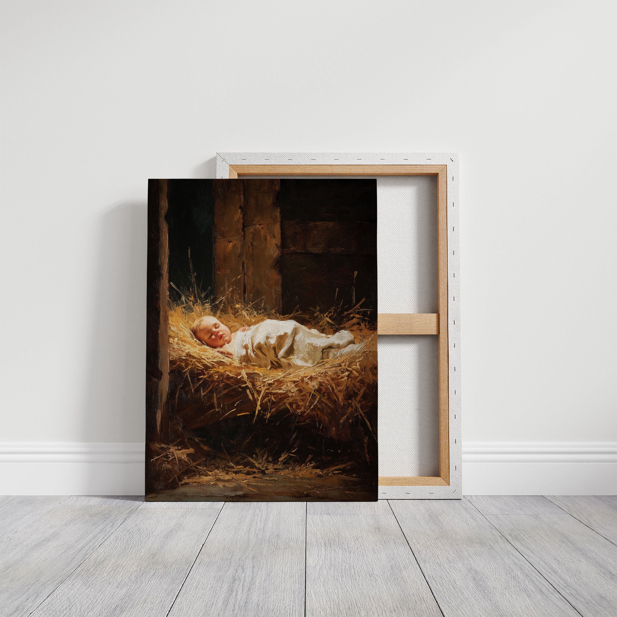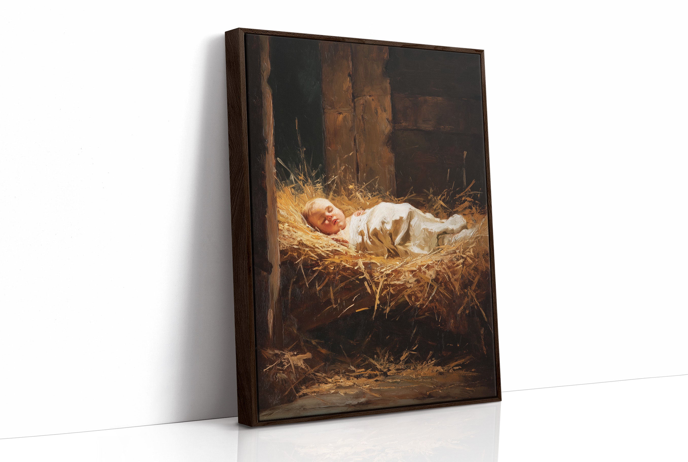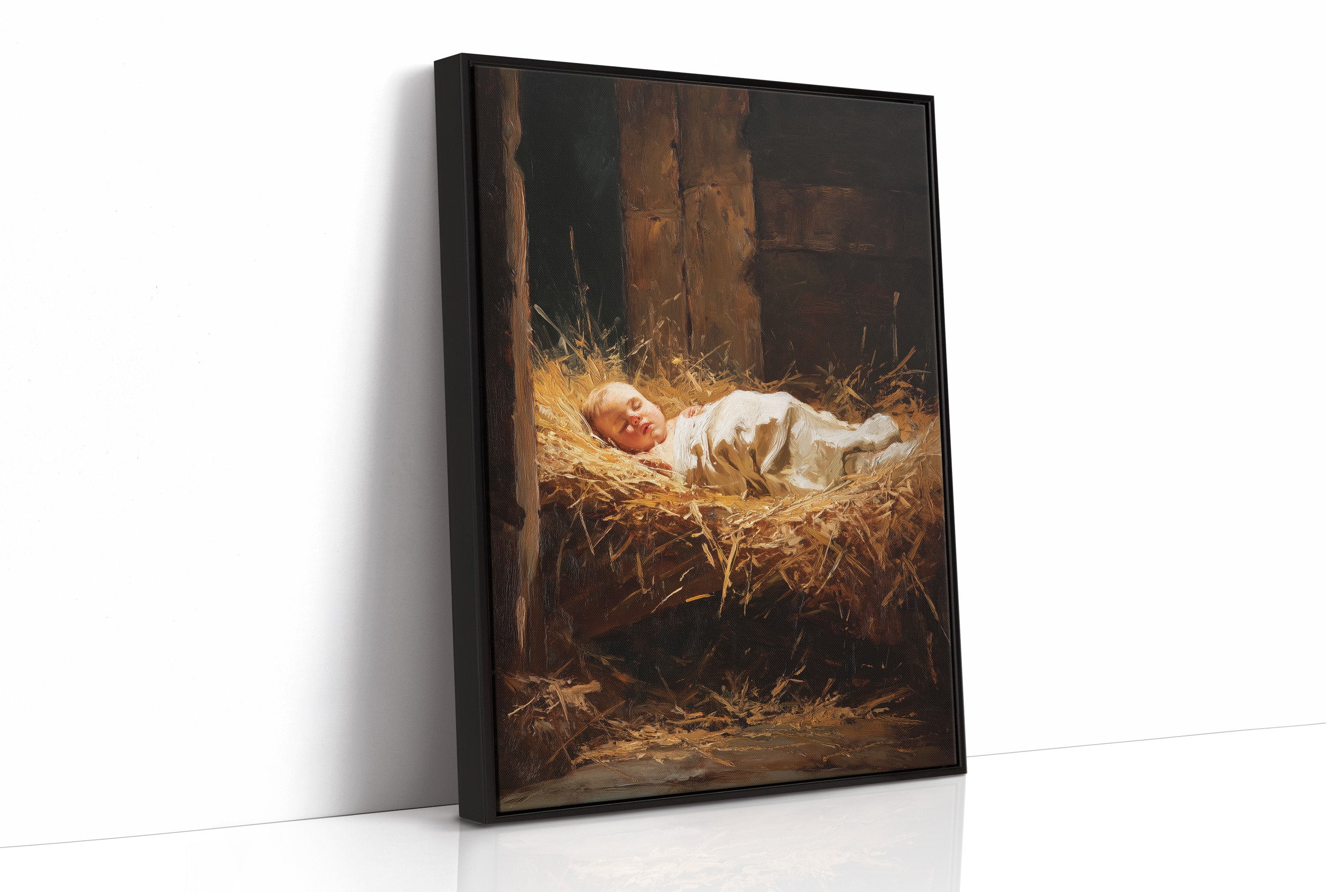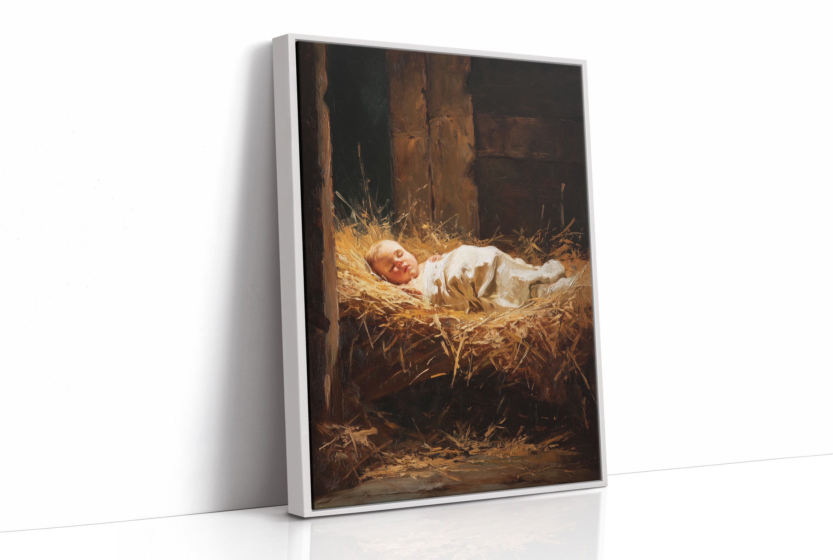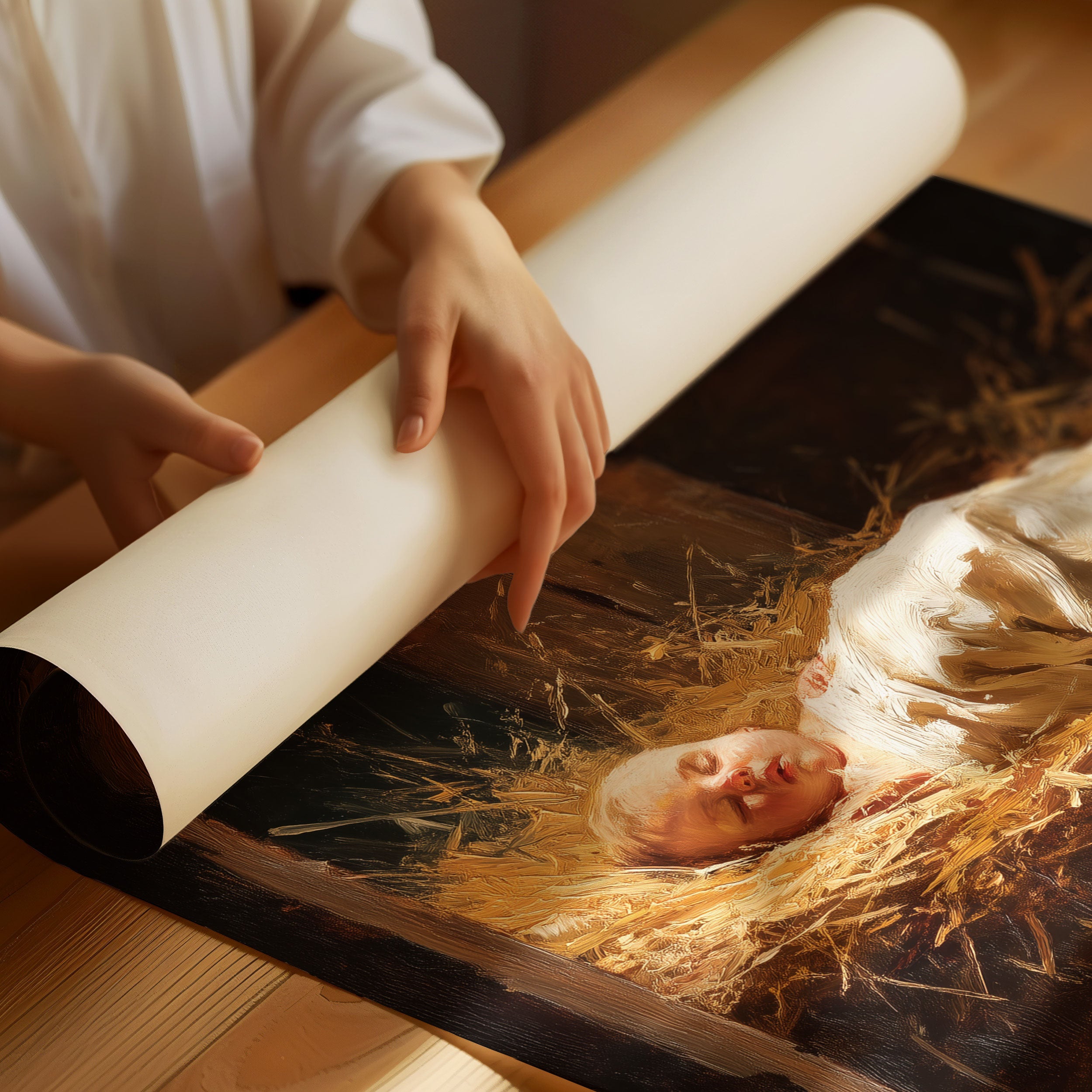 Gentle morning rays filter through sheer curtains, casting ethereal shadows across a serene minimalist space. A striking artwork depicting a peaceful scene in rich earth tones anchors the wall, while a luminous white Christmas tree glows with warm radiance in the corner. The thoughtful composition balances natural wood elements with soft textiles, creating a harmonious blend of traditional symbolism and contemporary design. This tranquil vignette would bring a sense of sacred stillness to any modern living space, perfect for moments of quiet contemplation during the holiday season.