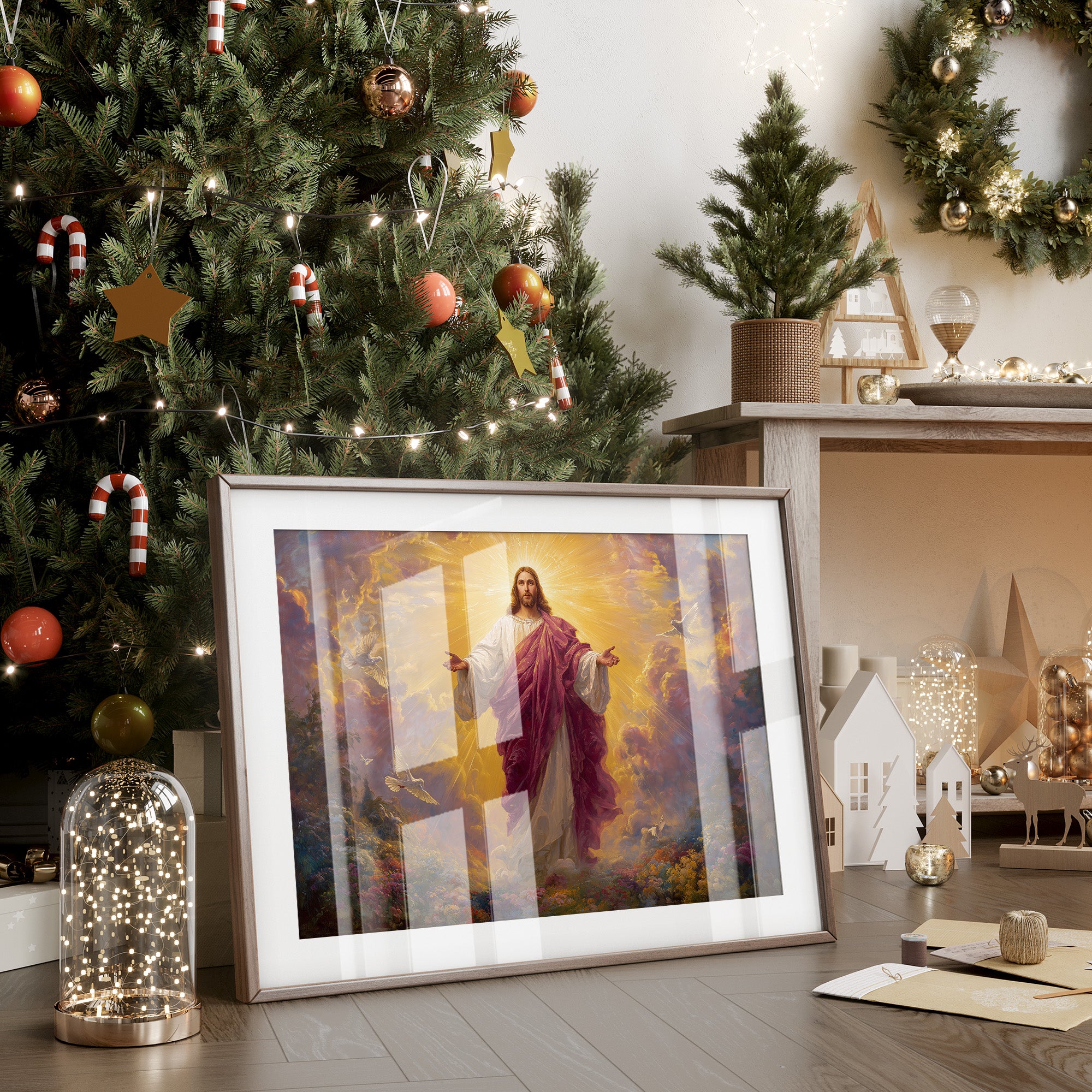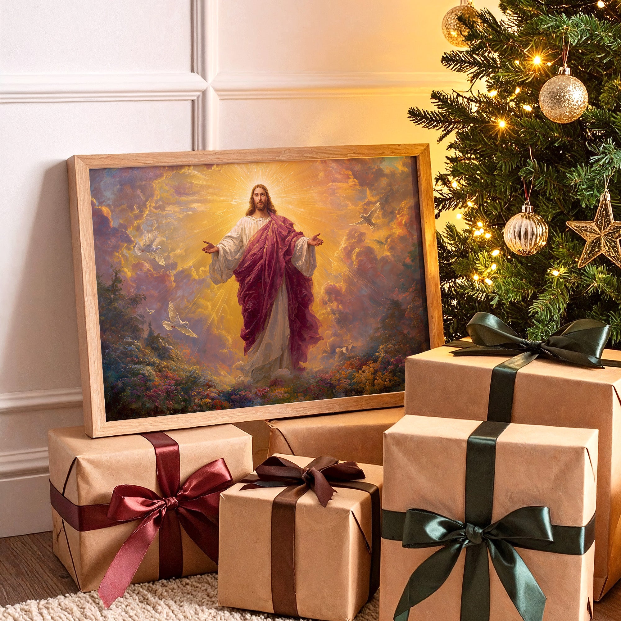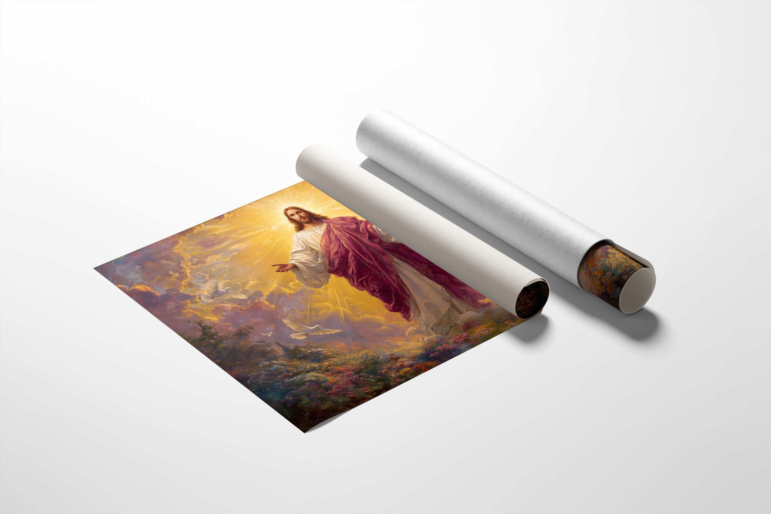 Golden rays pierce through dramatic clouds, casting divine illumination across a celestial landscape. Vibrant purples and crimsons dance with ethereal yellows, creating an atmosphere of transcendent beauty. Delicate flowers bloom beneath, painting the lower portion of the scene in a symphony of natural wonder, while doves soar through the luminous sky. This classical religious artwork finds its perfect place in meditation rooms, prayer spaces, or any area dedicated to spiritual reflection and peaceful contemplation.
