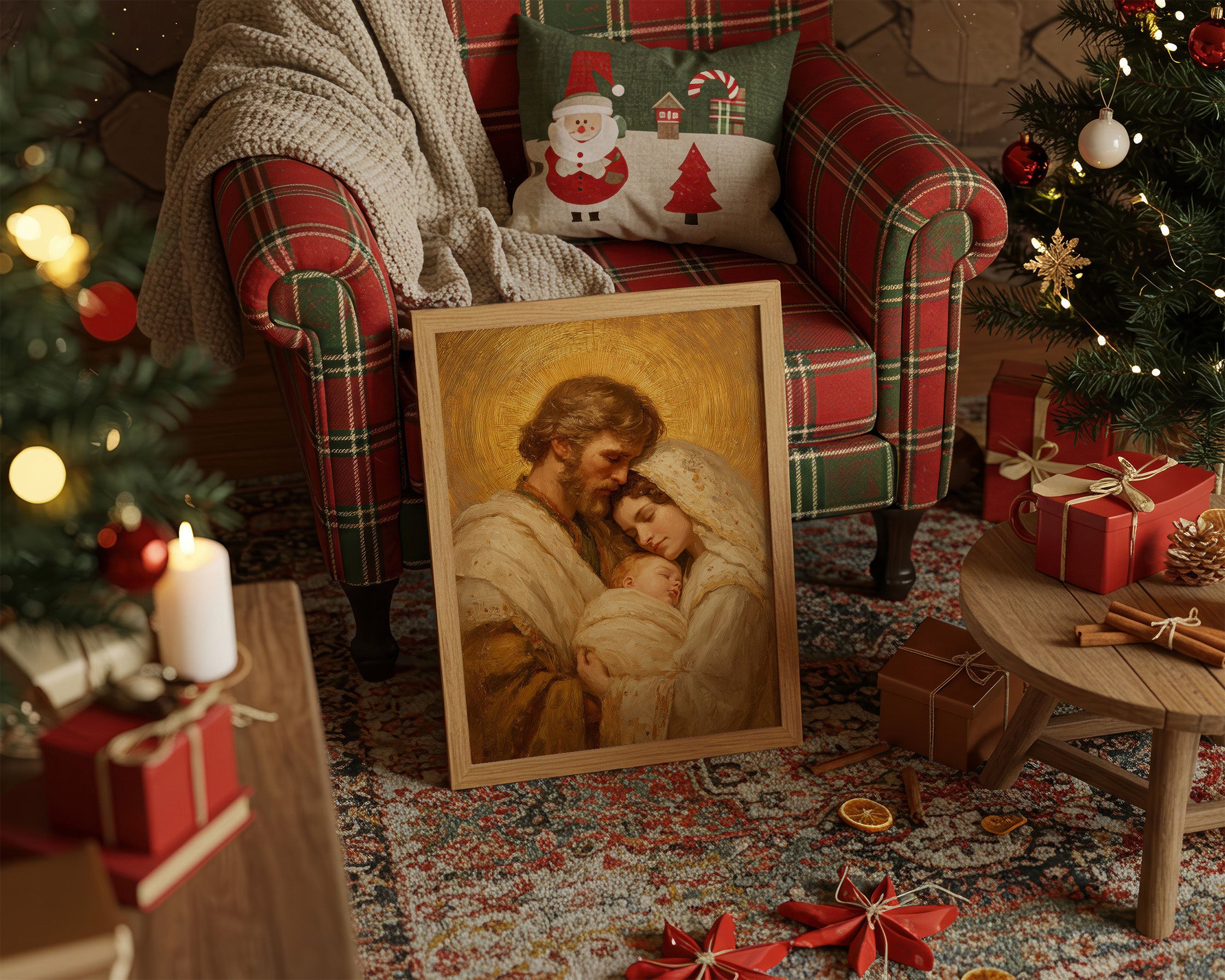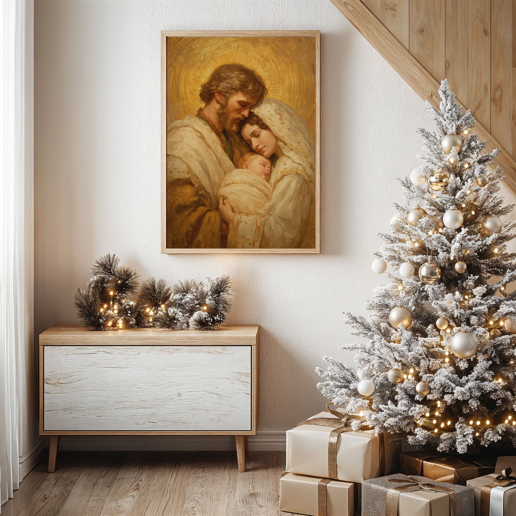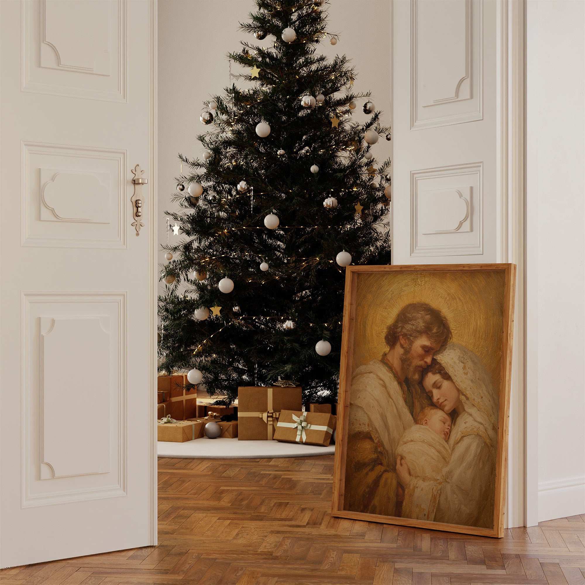 Gentle golden light radiates through a classical painting, casting warmth across a scene of tender devotion. Rich ochre tones and delicate brushstrokes create an atmosphere of profound serenity, complemented by the soft glow of Christmas lights. The contemporary setting marries traditional artistry with modern holiday decor - a flocked tree adorned with metallic ornaments stands sentinel beside wrapped presents in neutral tones. This peaceful corner brings together timeless grace with seasonal celebration.