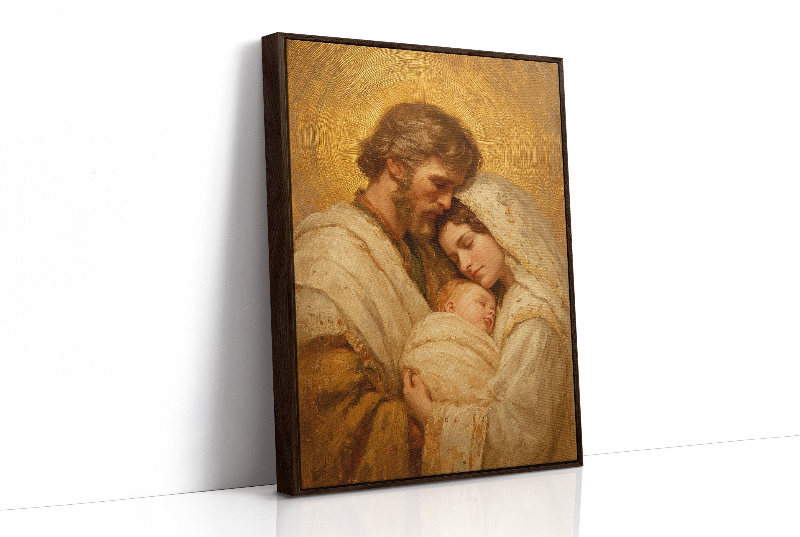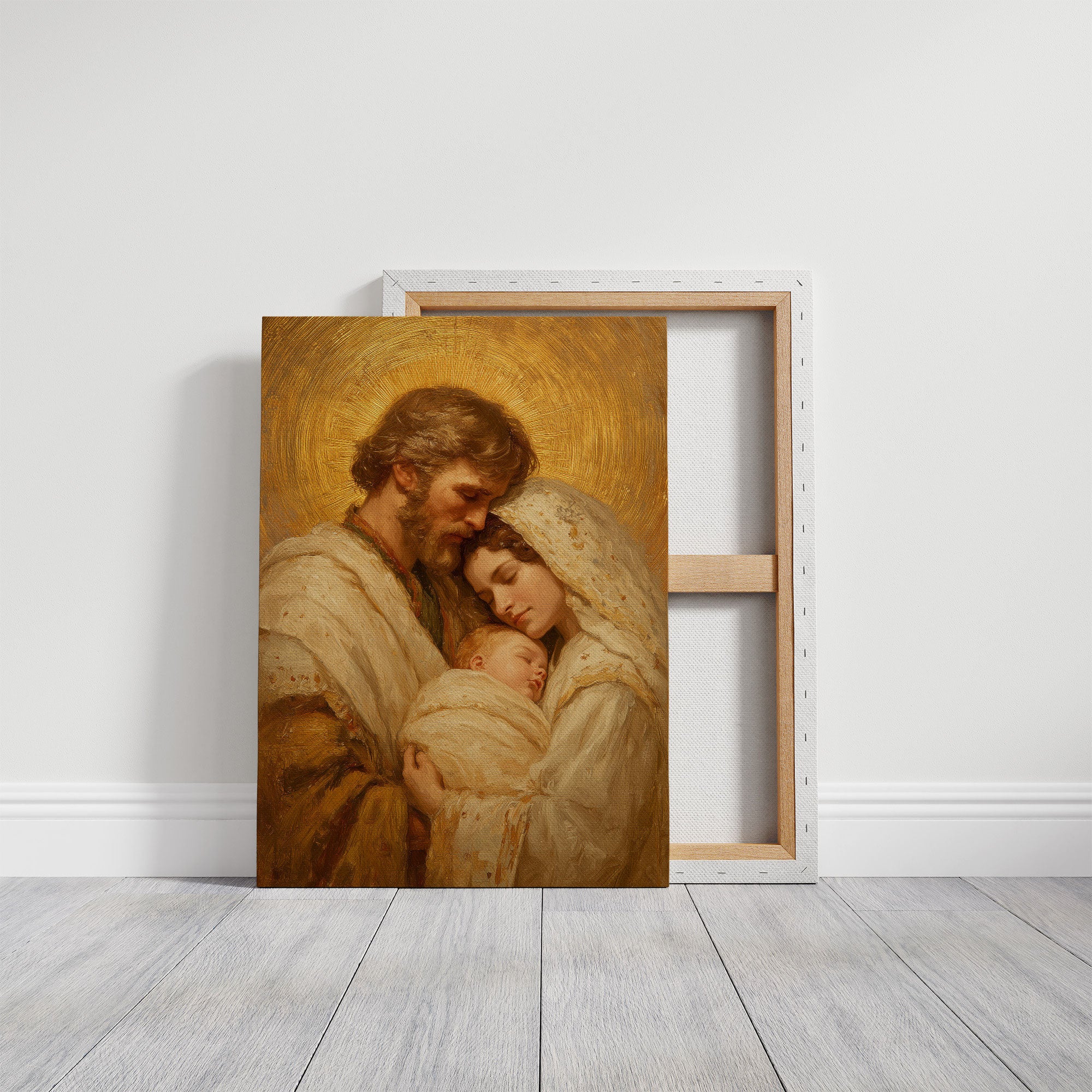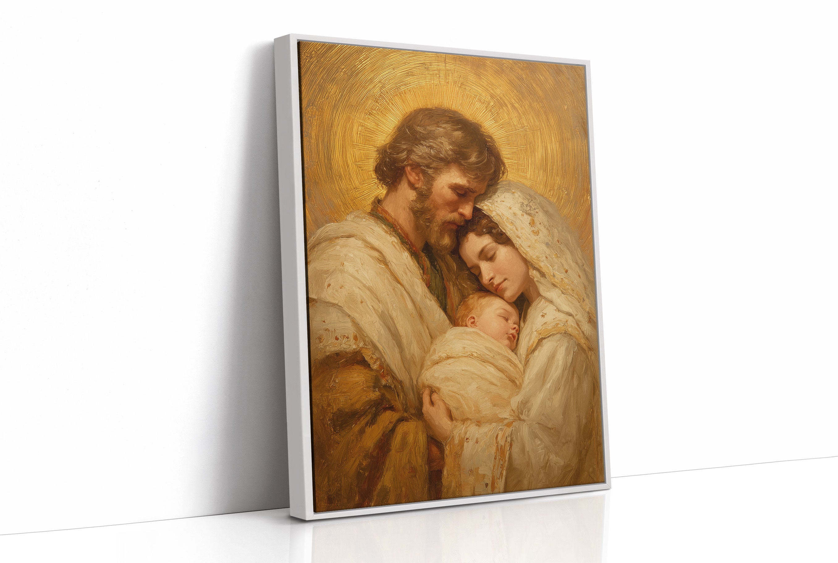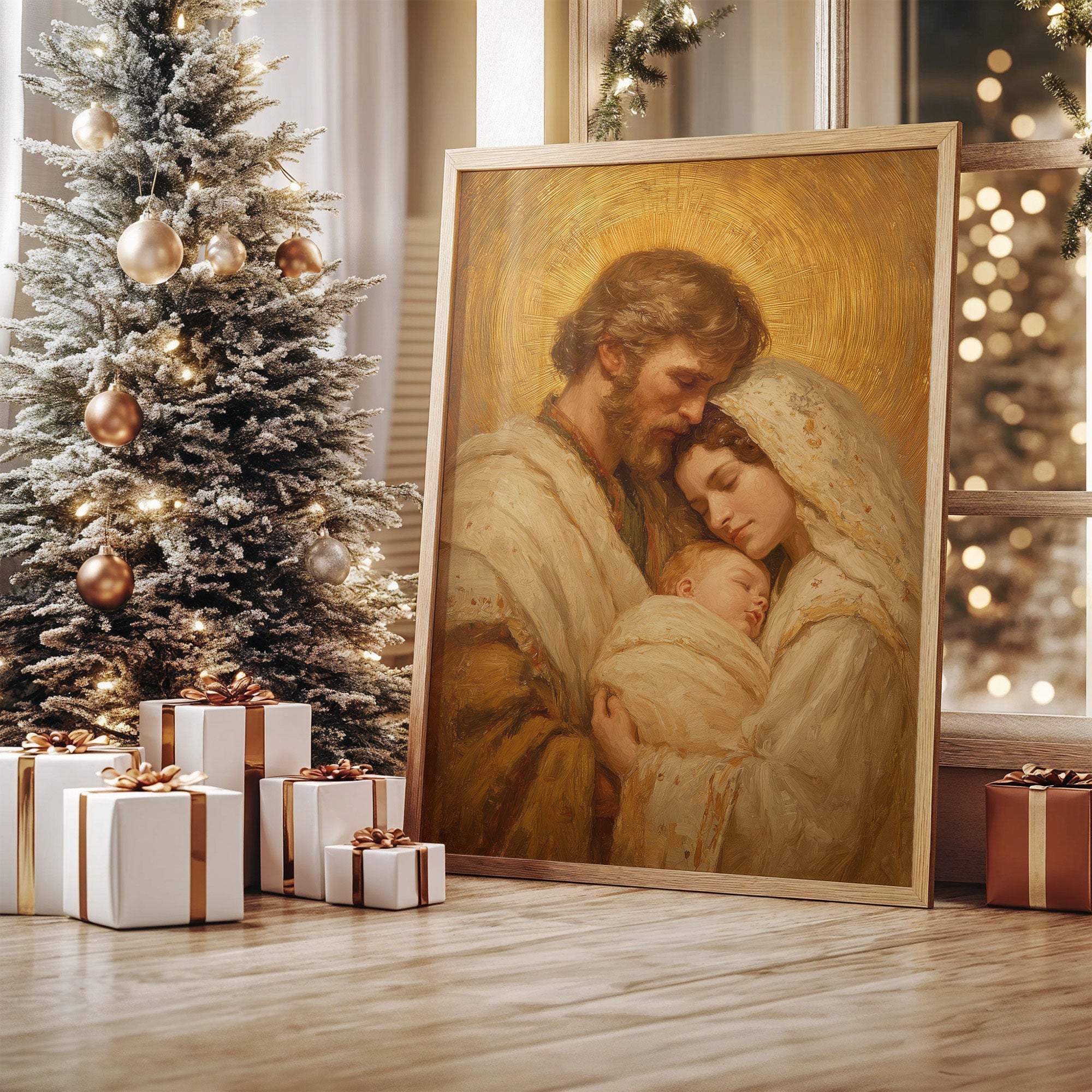 Gentle golden light radiates through a classical painting, casting warmth across a scene of tender devotion. Rich ochre tones and delicate brushstrokes create an atmosphere of profound serenity, complemented by the soft glow of Christmas lights. The contemporary setting marries traditional artistry with modern holiday decor - a flocked tree adorned with metallic ornaments stands sentinel beside wrapped presents in neutral tones. This peaceful corner brings together timeless grace with seasonal celebration.