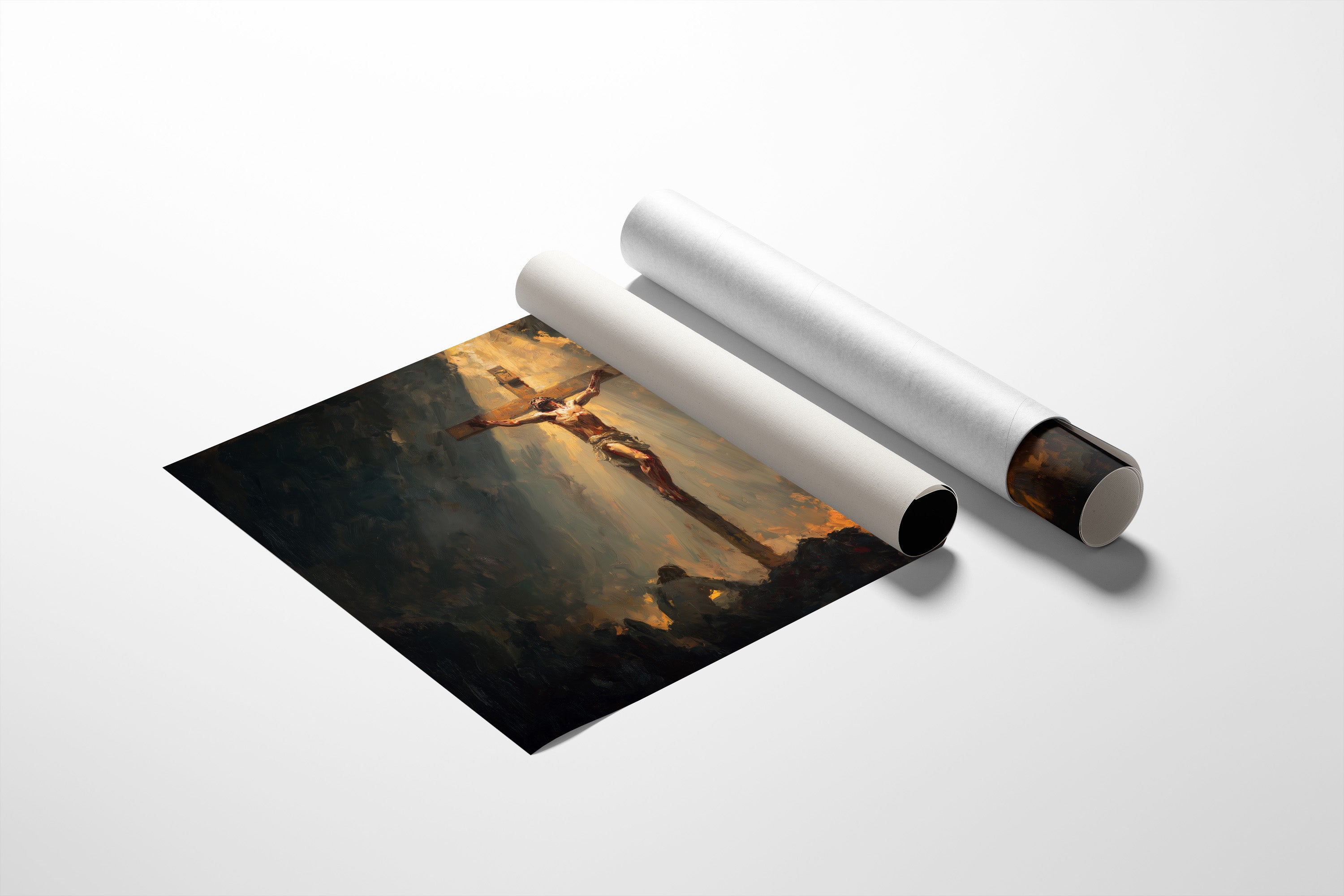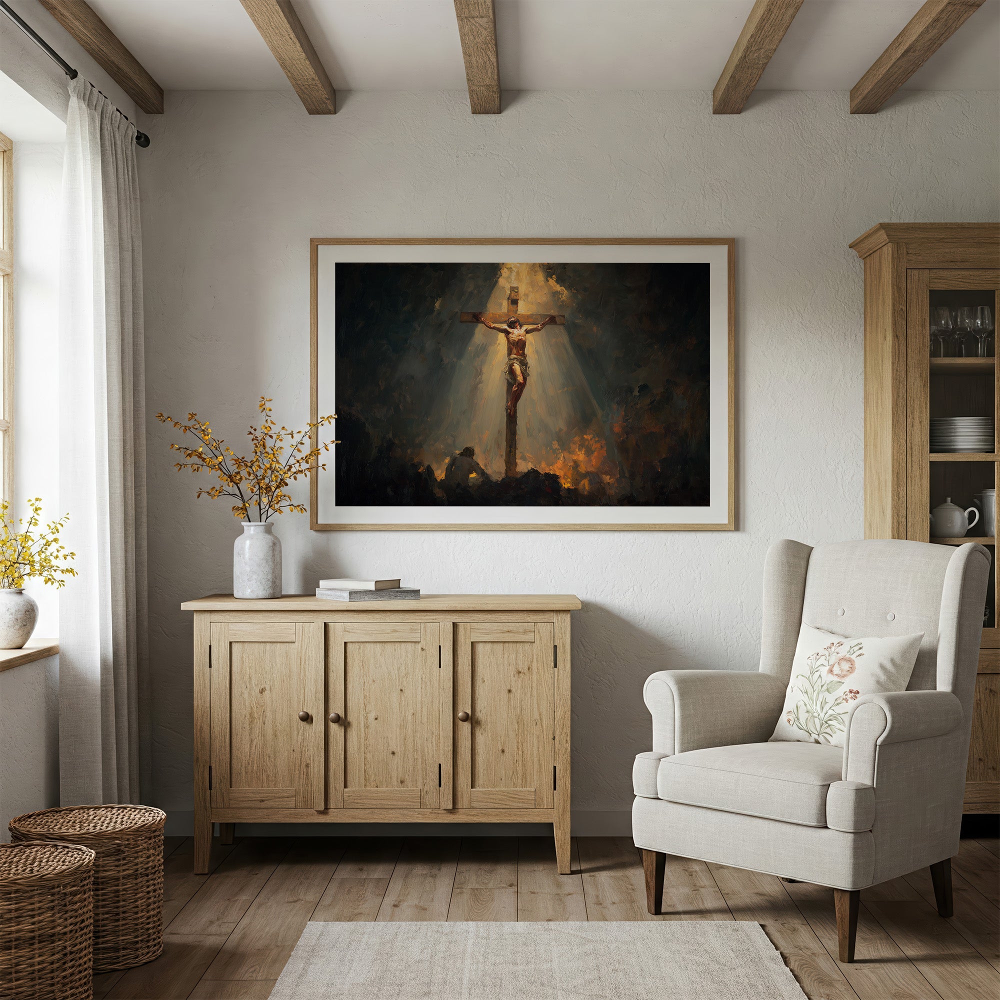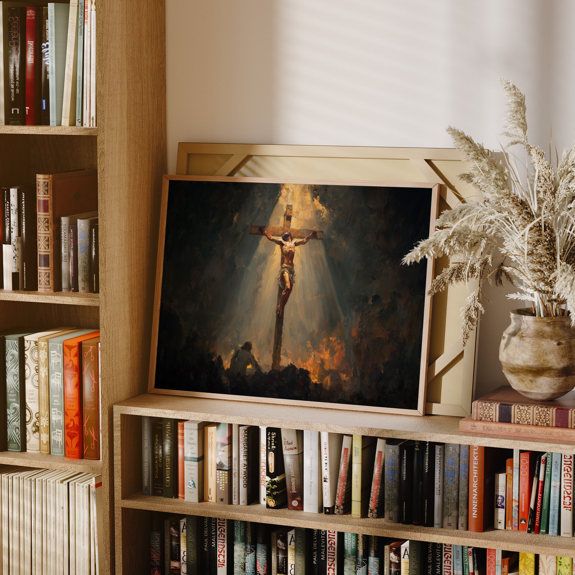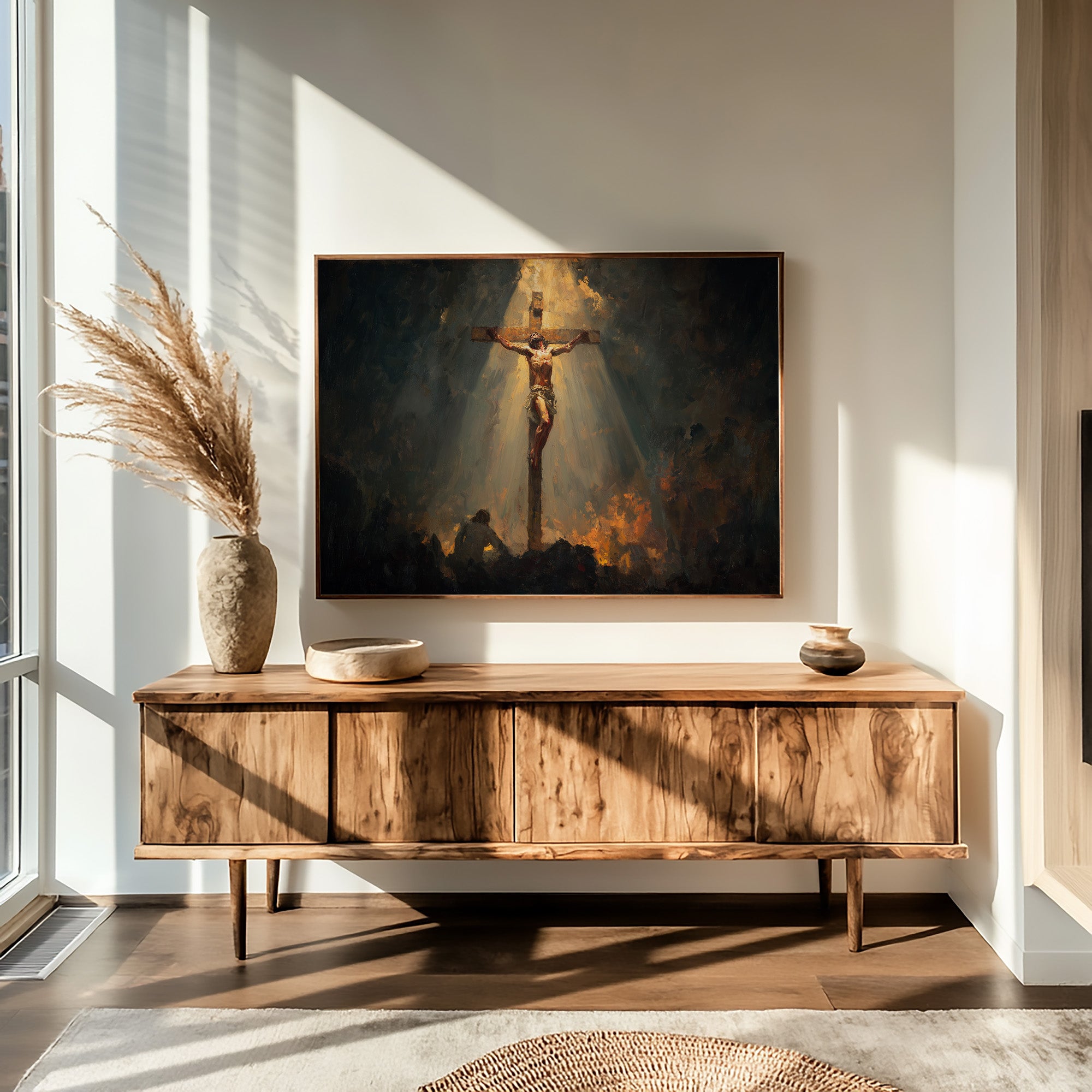 A beam of golden radiance cuts through the shadowed atmosphere, illuminating the crucifixion scene with dramatic intensity. The interplay of light and darkness creates a powerful emotional narrative, with warm amber tones emerging from the somber background to highlight the central figure. This contemplative piece brings spiritual depth to a thoughtful home, perfect for a quiet reading nook or meditation space where its profound imagery can inspire reflection.