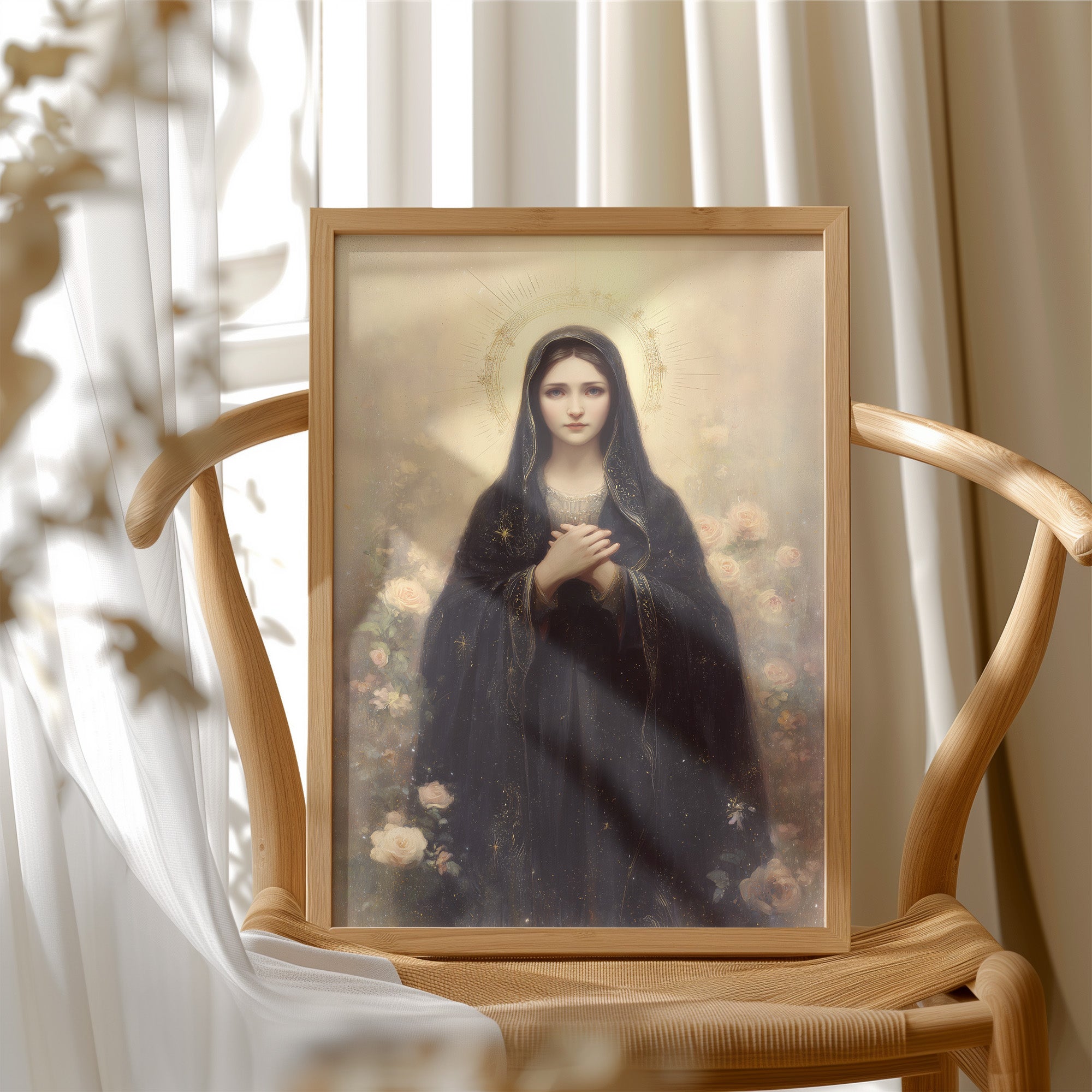A moment of quiet reverence captured in warm morning light, where devotion rests upon weathered wood. The religious portrait, adorned with a halo and surrounded by delicate roses, creates a contemplative atmosphere against the rustic simplicity of the wooden surface. A small cup of coffee waits nearby, suggesting this is a personal space where daily rituals and spiritual reflection intertwine.