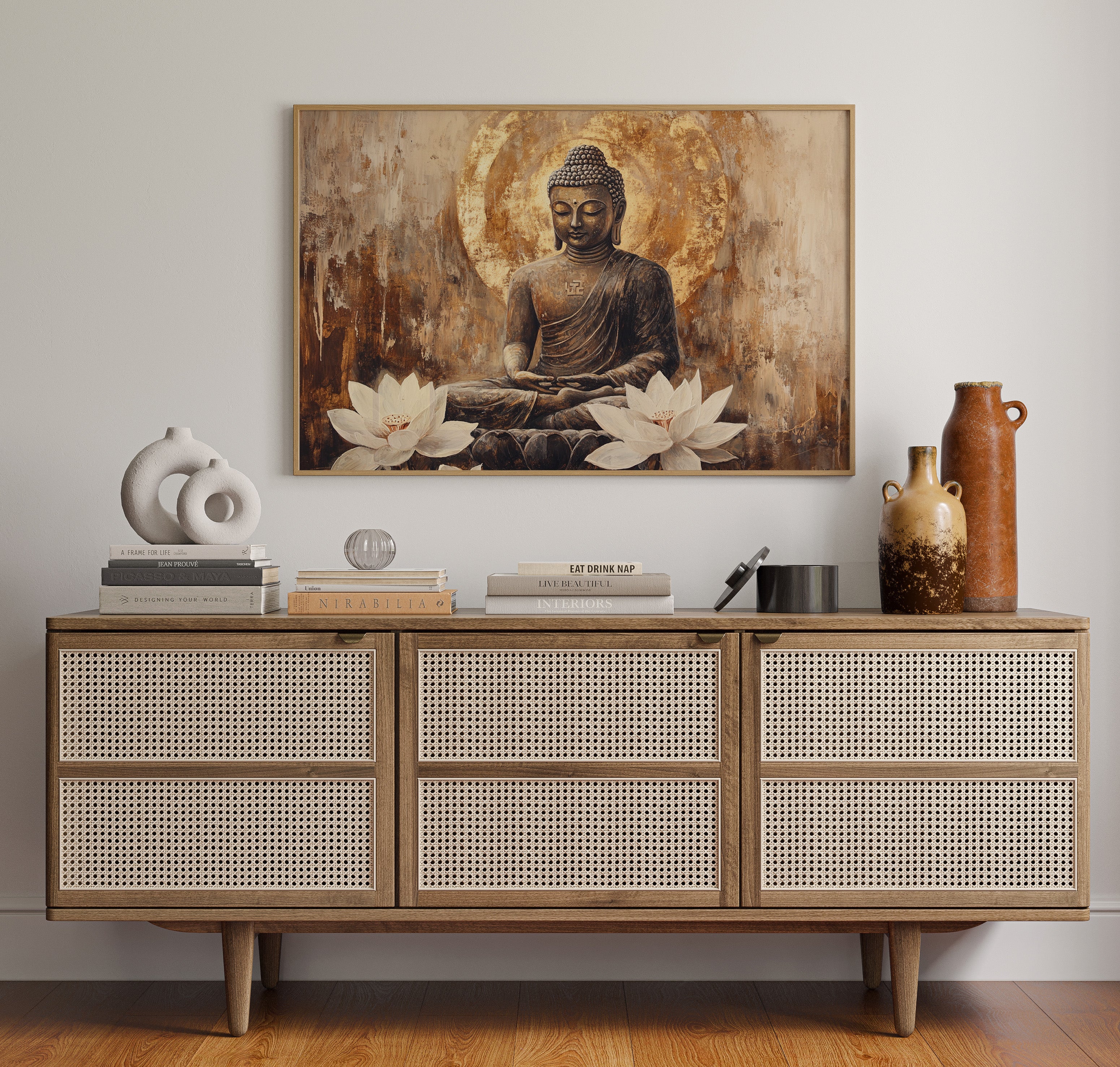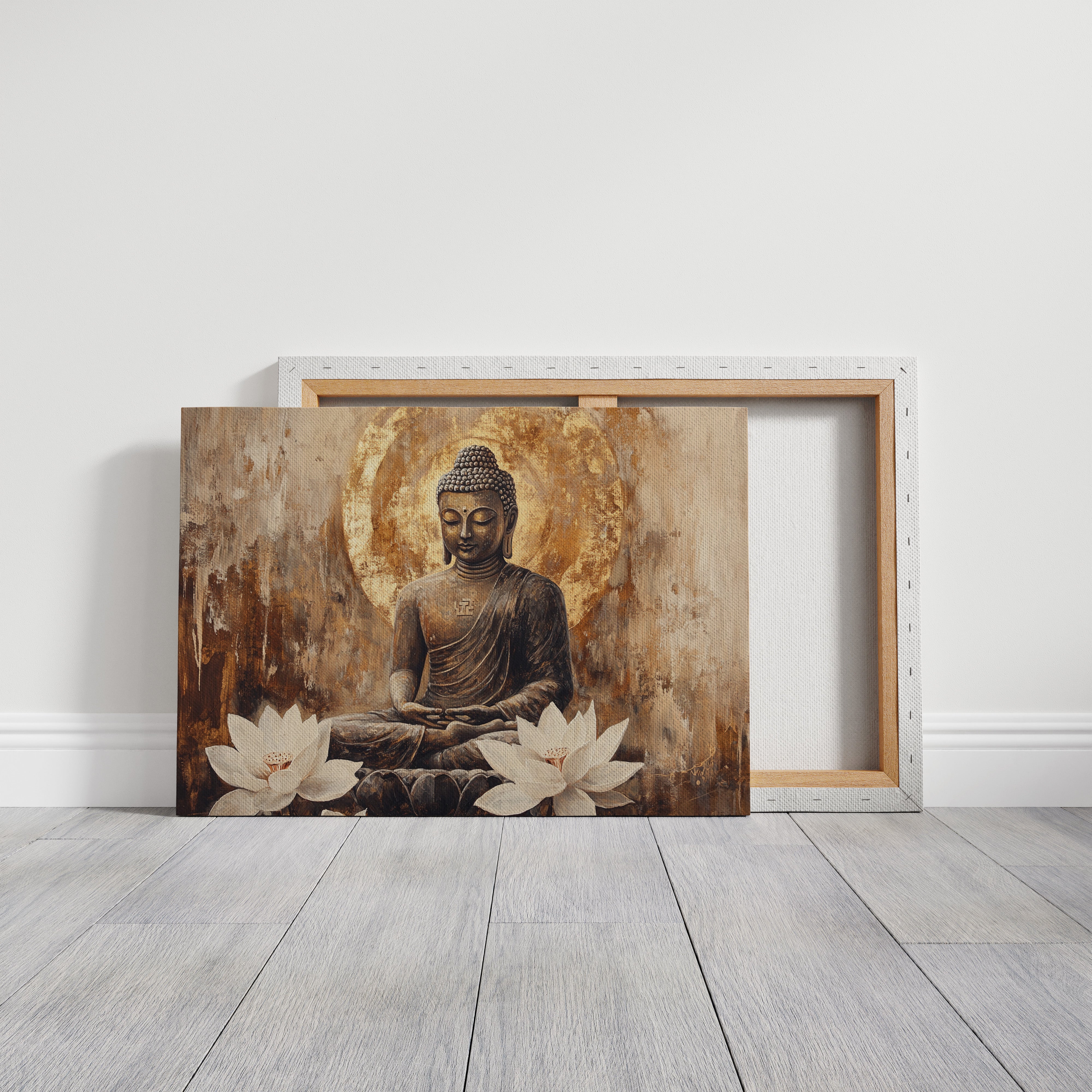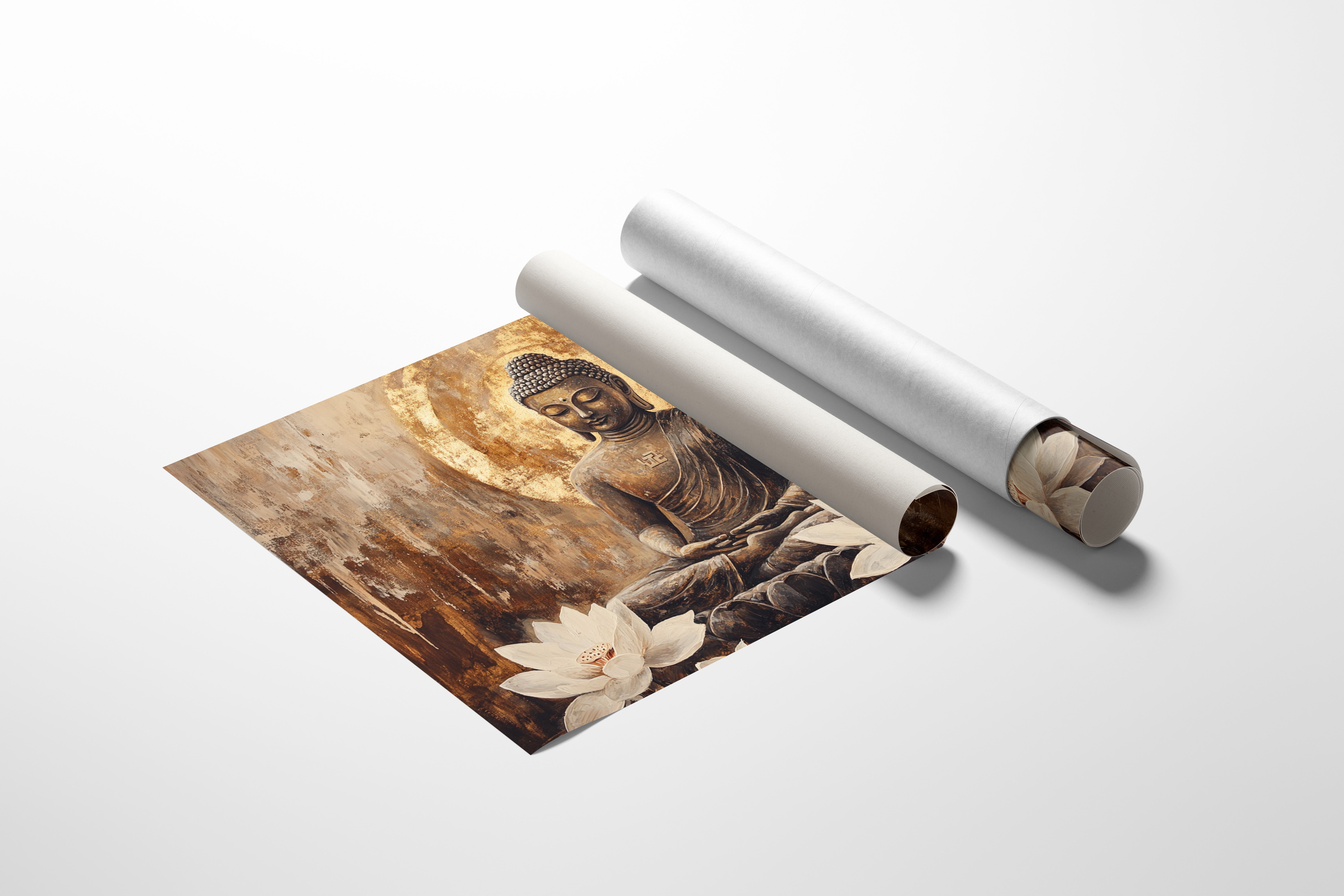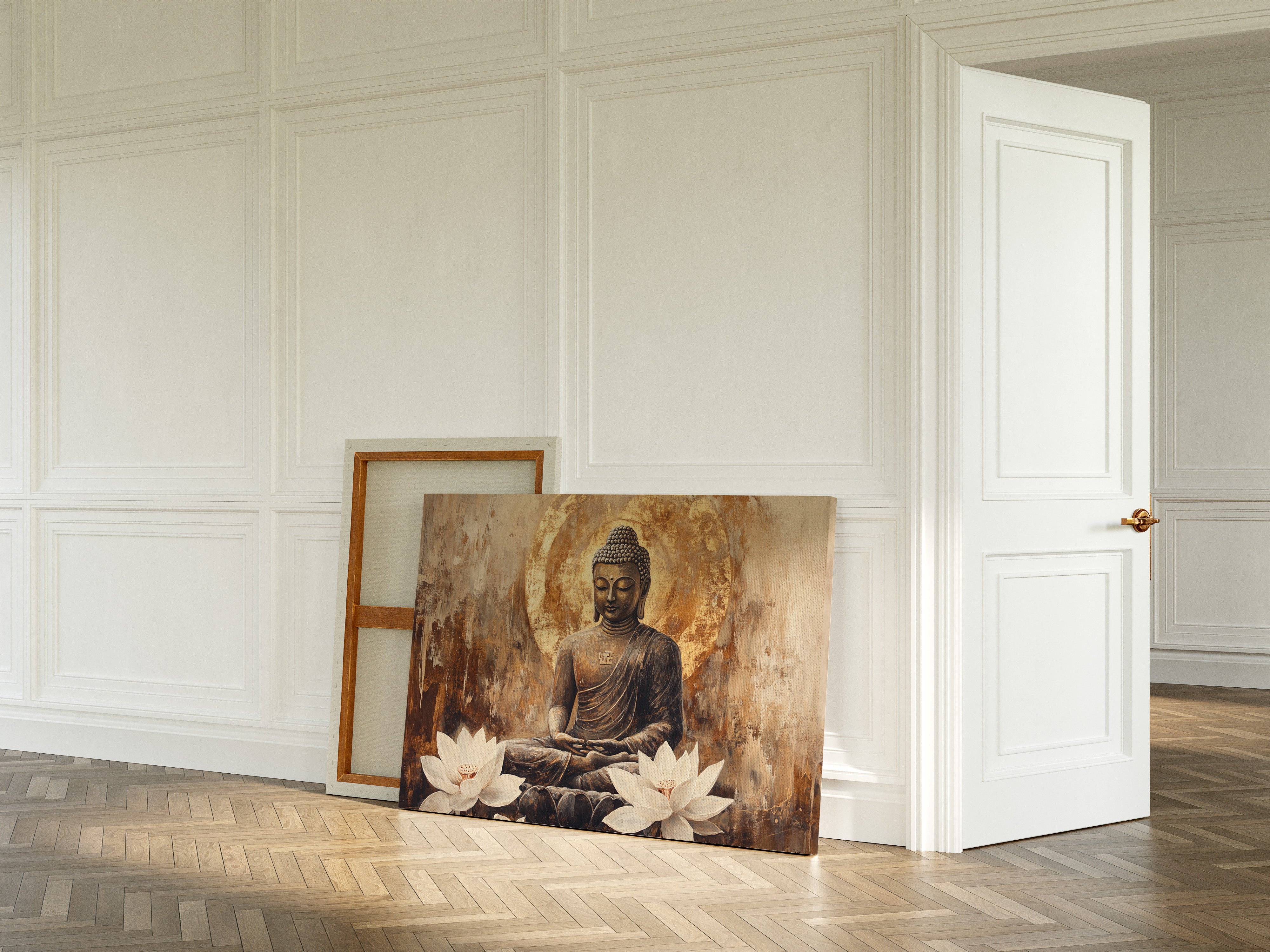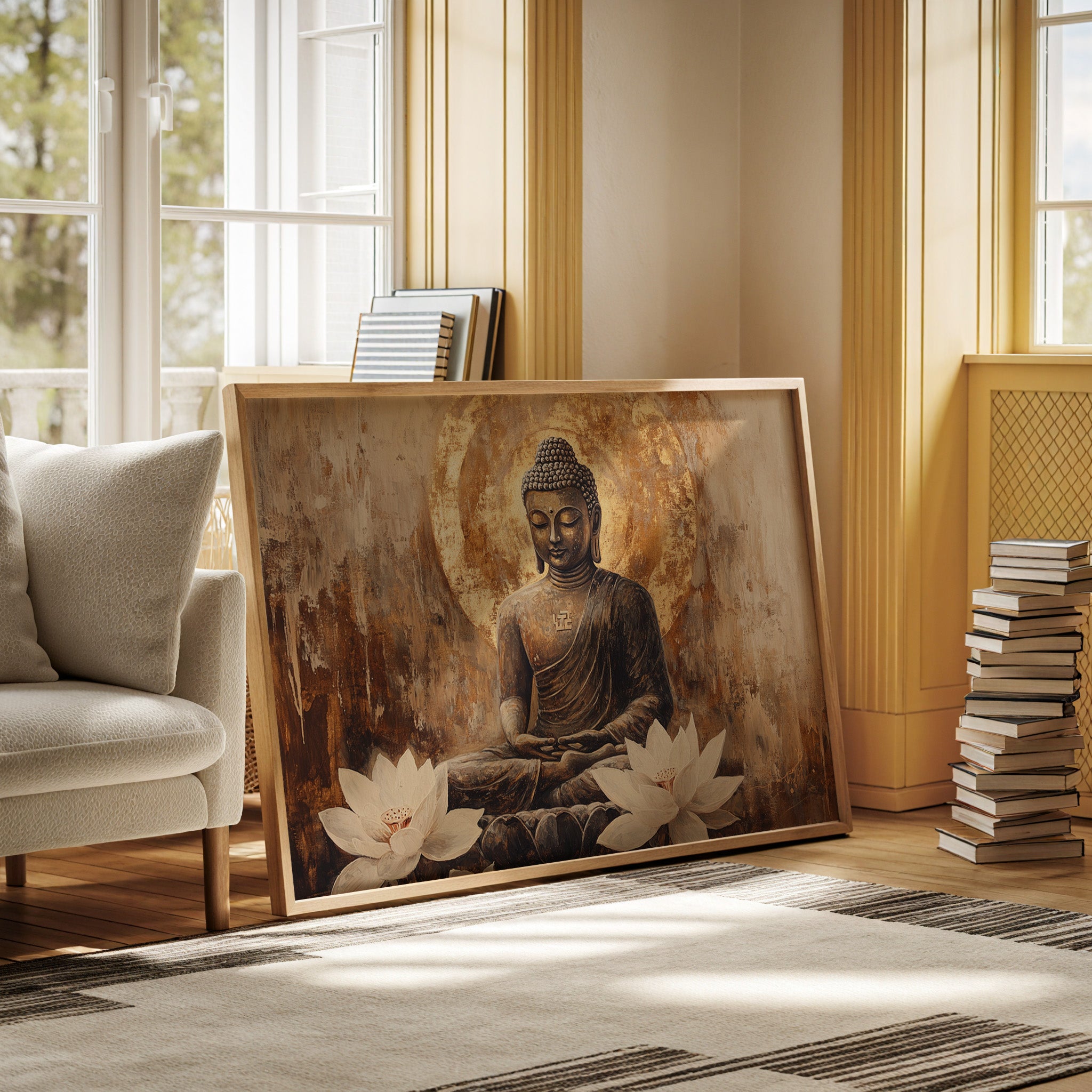 In the gentle glow of a golden aureole, tranquility emanates from an ancient presence. The textured bronze figure sits in eternal meditation, surrounded by the pure white petals of lotus flowers that seem to float in ethereal stillness. Deep earth tones and weathered textures create a sense of timeless wisdom, while the luminous background suggests the first light of dawn breaking through centuries of contemplation. This piece captures the essence of inner peace and spiritual awakening, with its harmonious blend of symbolic elements and serene composition. Perfect for meditation spaces, yoga studios, or as a centering focal point in a minimal modern bedroom where calm and reflection are paramount.
