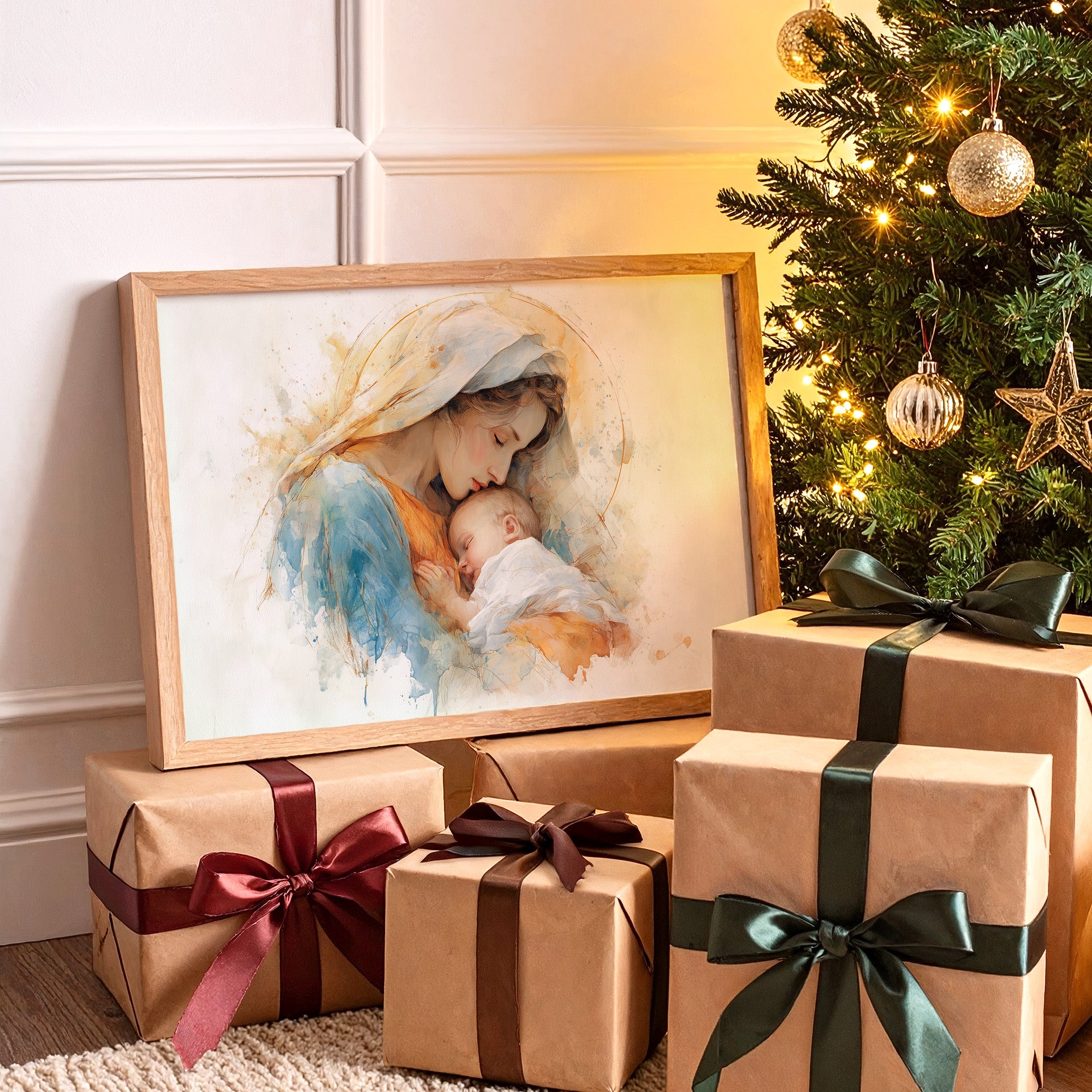 Delicate brushstrokes dance across the canvas, capturing a tender moment in soft blues and warm golds. The watercolor technique creates an ethereal quality, with colors flowing and blending like morning light through stained glass. The composition speaks of unconditional love, rendered in gentle washes that seem to glow from within, while subtle splashes and artistic flourishes add contemporary energy to this timeless scene. This piece would bring a sense of serenity and grace to a quiet reading nook, meditation space, or any room where moments of peaceful reflection are cherished.