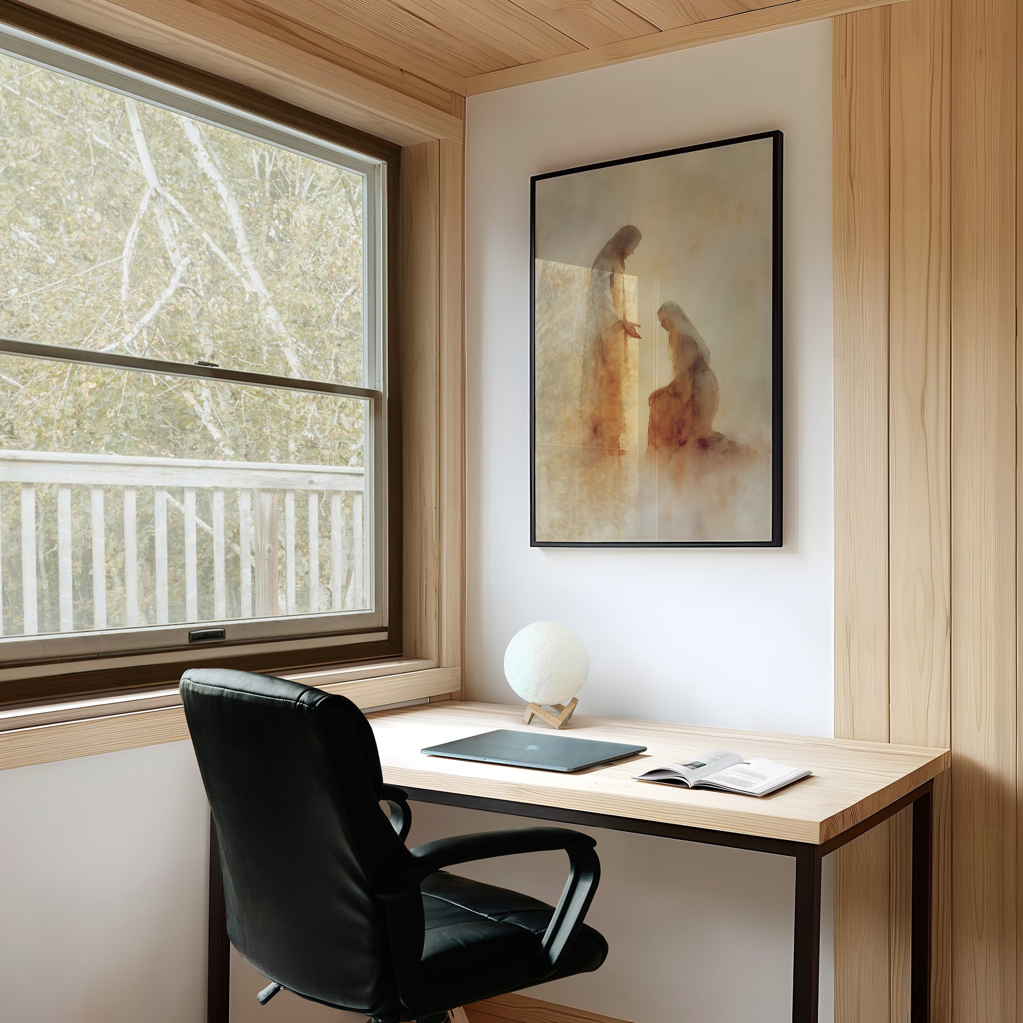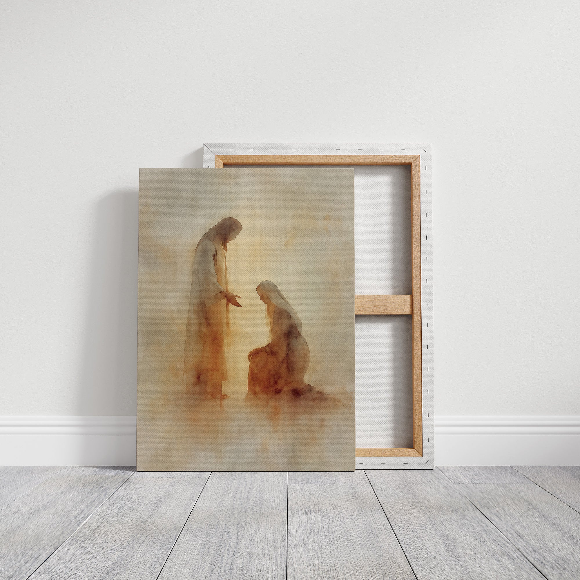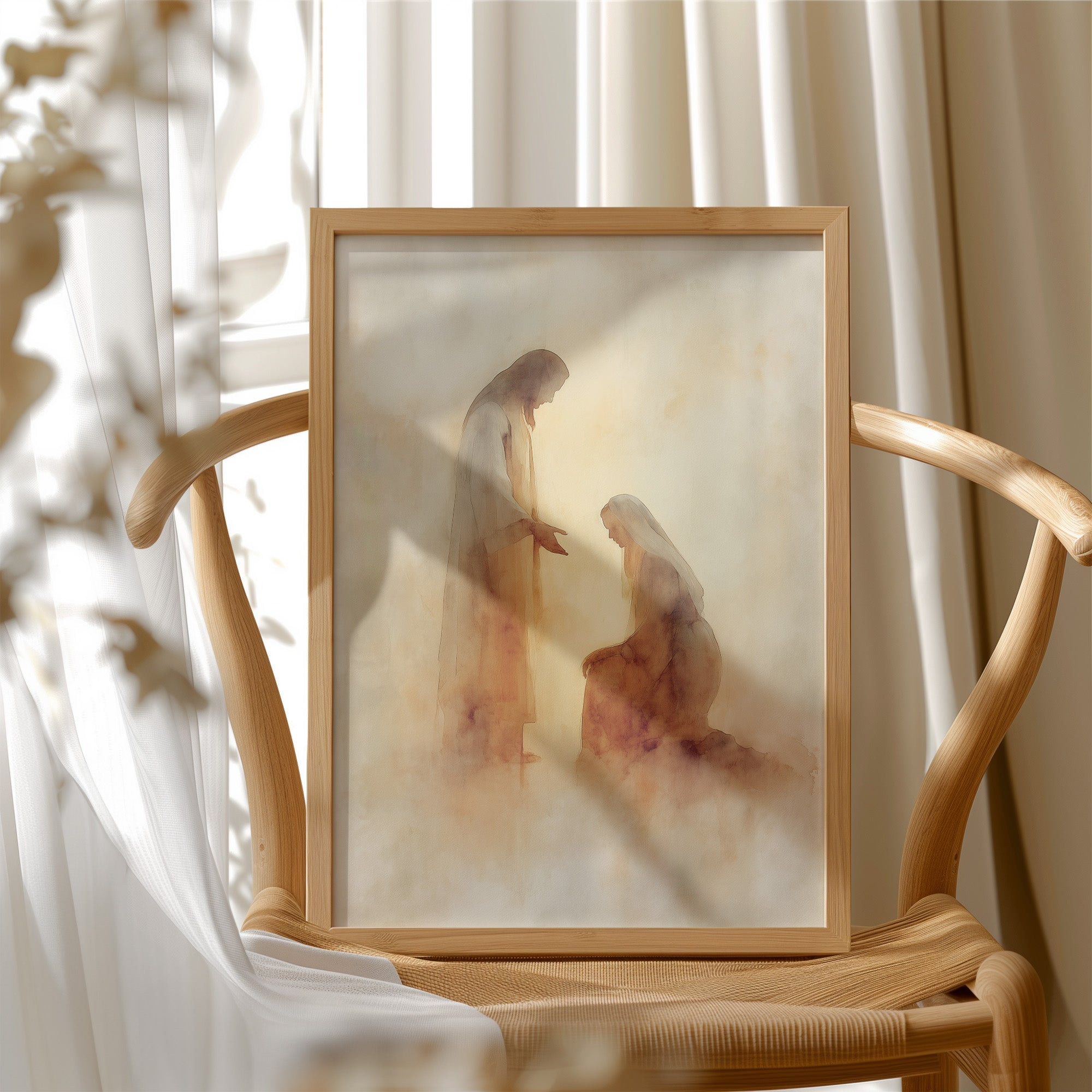 Morning light filters through the scene, casting a warm glow on this ethereal watercolor painting resting on a rustic wooden table. The gentle brushstrokes create two figures meeting in a moment of profound connection, their forms softened into amber and cream tones that seem to radiate from within. The simplicity of the composition invites contemplation, while the surrounding elementsa small plant and coffee cupcreate an intimate, lived-in atmosphere.