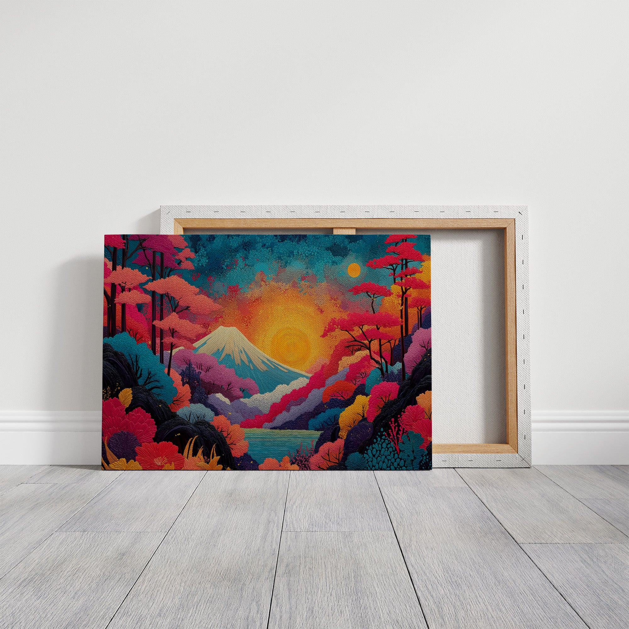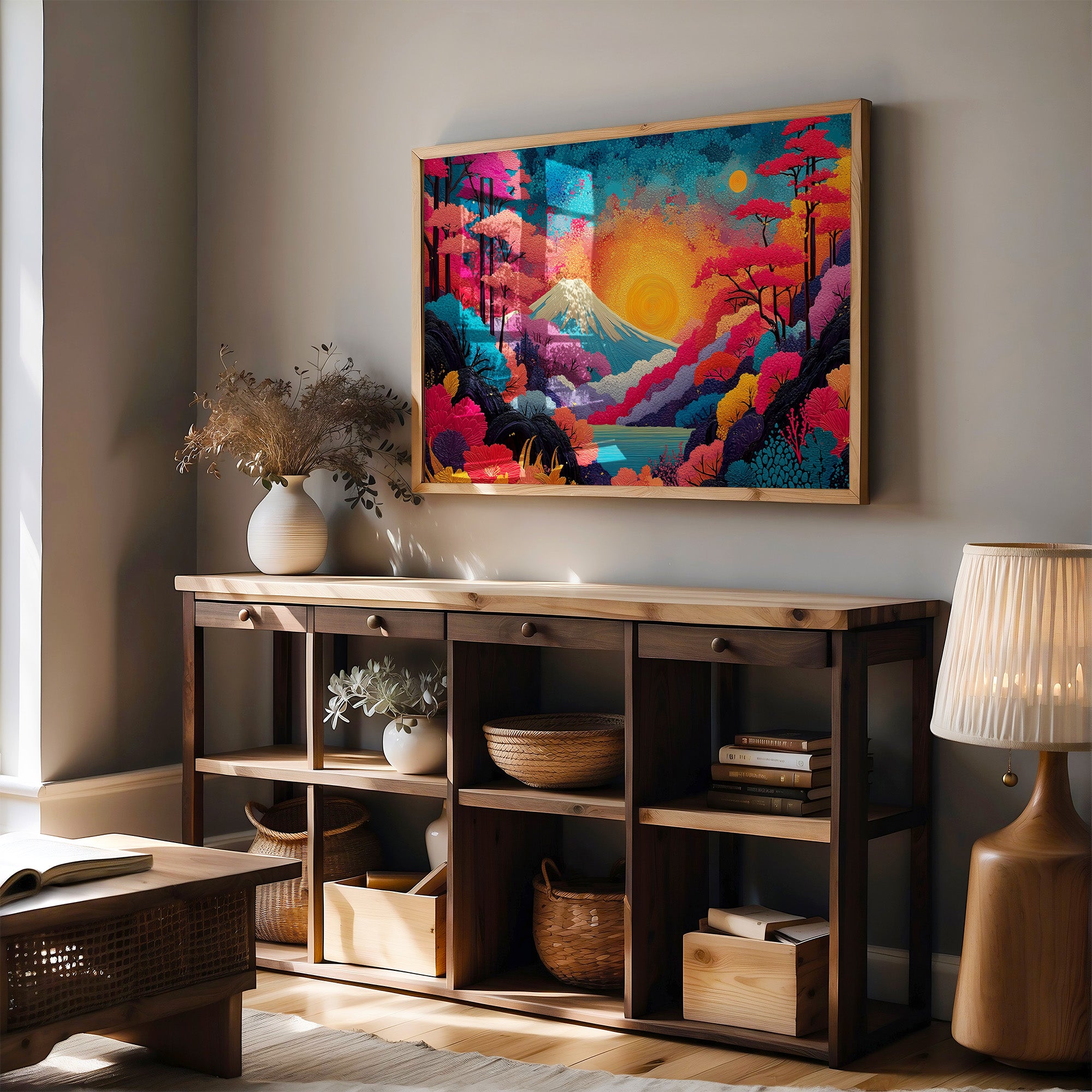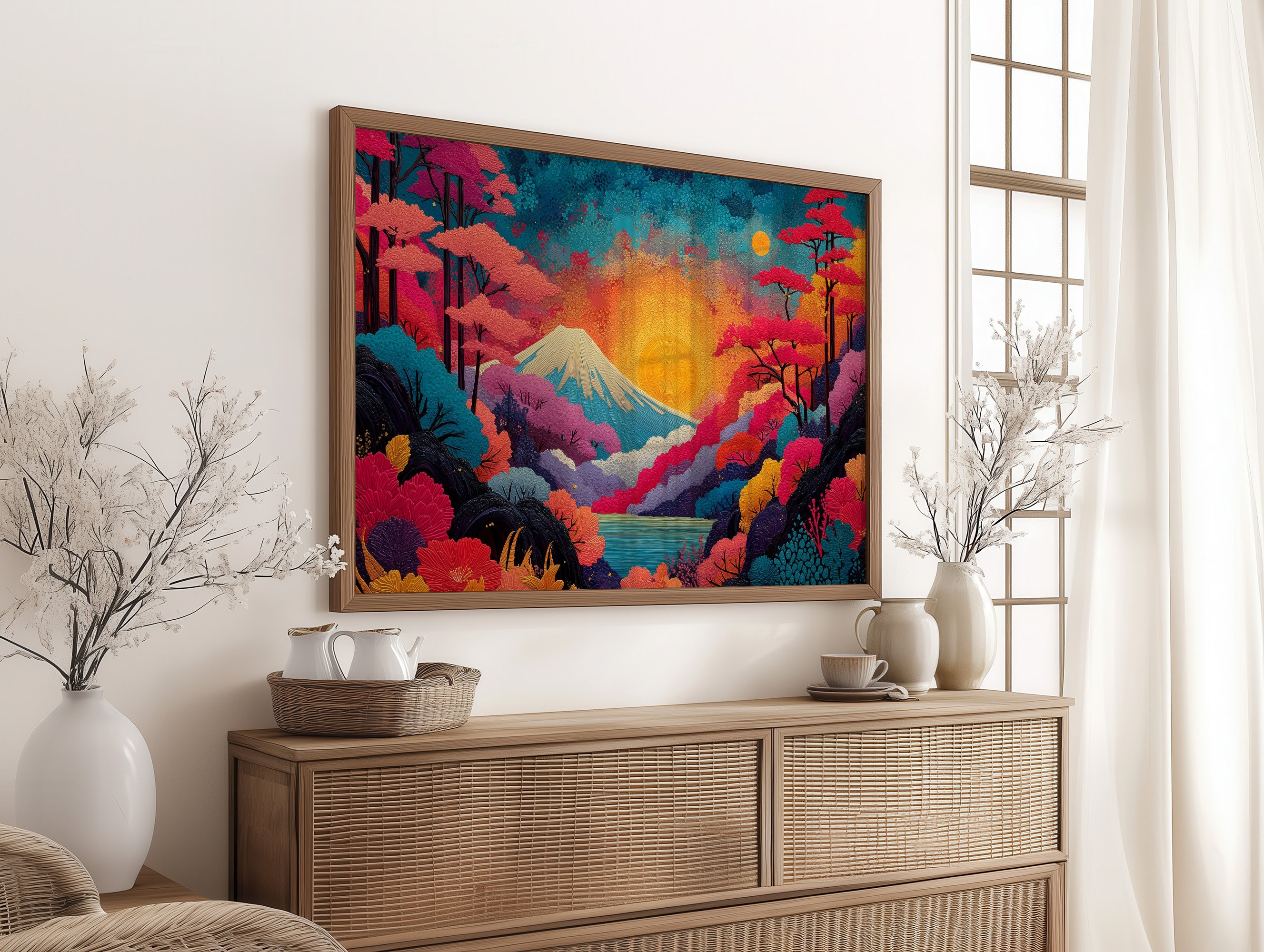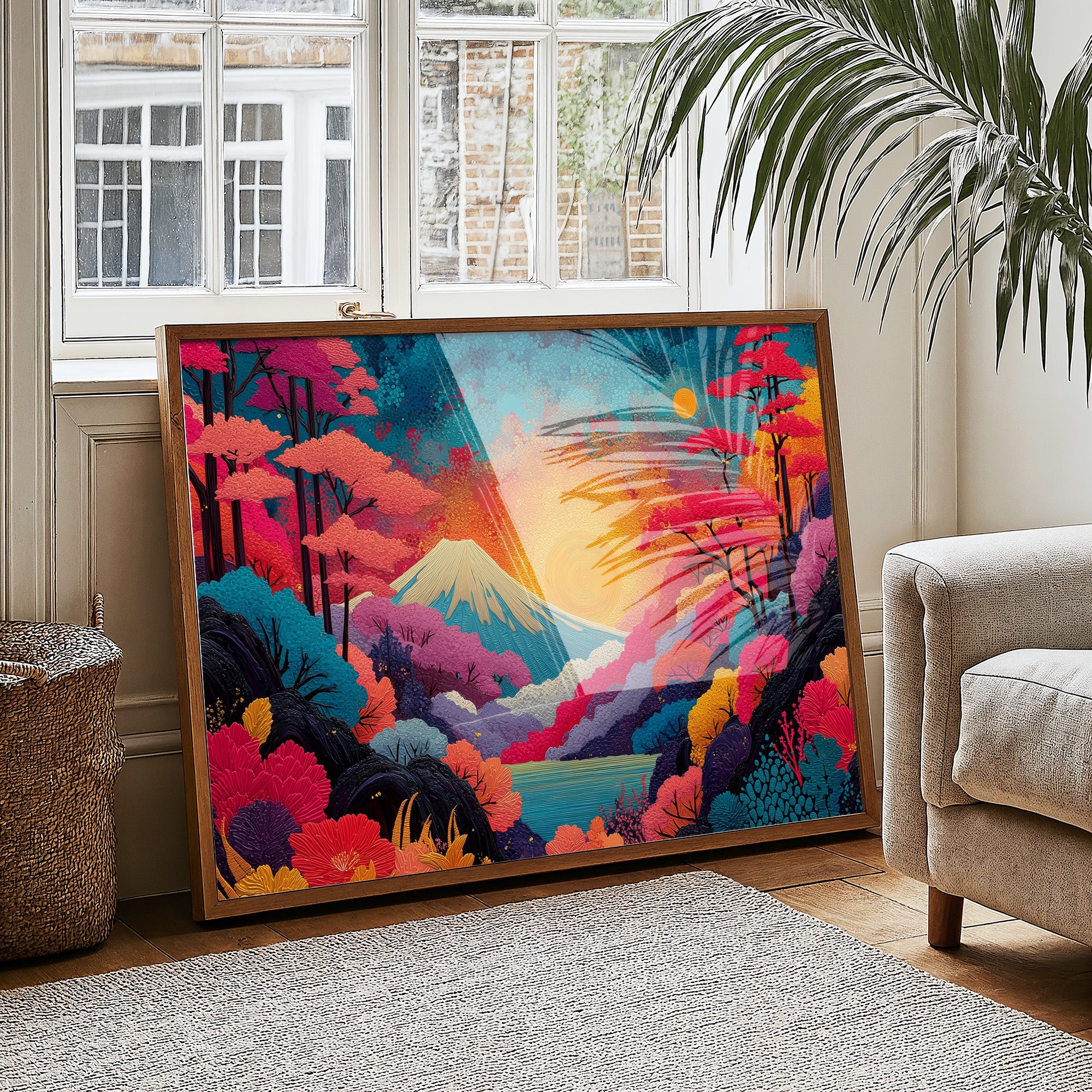 A kaleidoscope of vibrant coral, turquoise, and purple paints a dreamlike Japanese landscape, where Mount Fuji stands sentinel in mystical morning light. The scene pulses with energy as flowering trees and wild botanicals frame the sacred peak, their colors dancing between reality and fantasy in bold, contemporary strokes. A crystalline river winds through the valley, reflecting the golden sunrise while abstract shapes and organic forms create a modern interpretation of traditional Eastern artistry. This statement piece would transform a minimal modern living room or bring bold energy to a meditation space, where its dramatic colors can inspire contemplation and creativity.