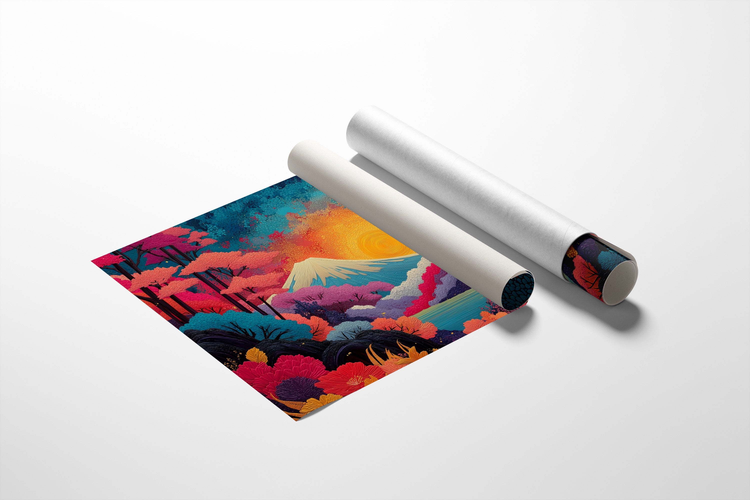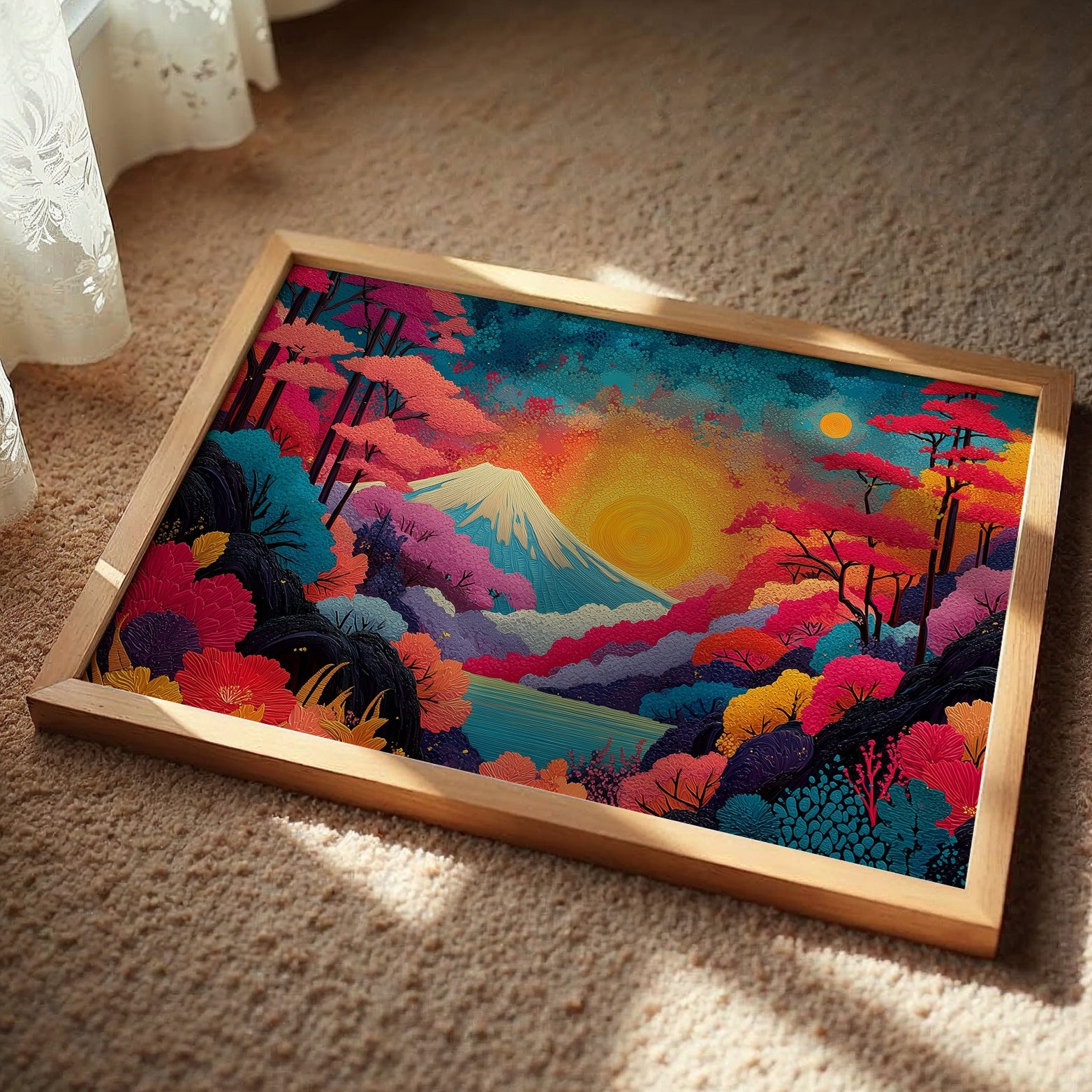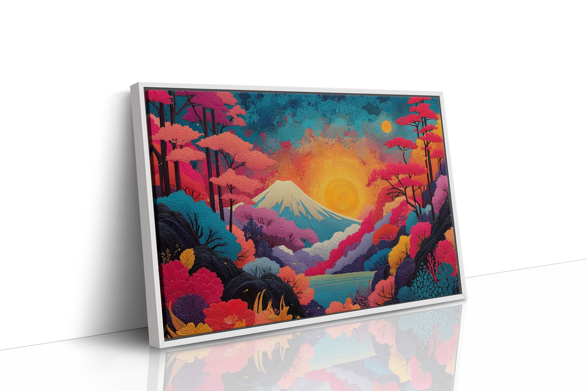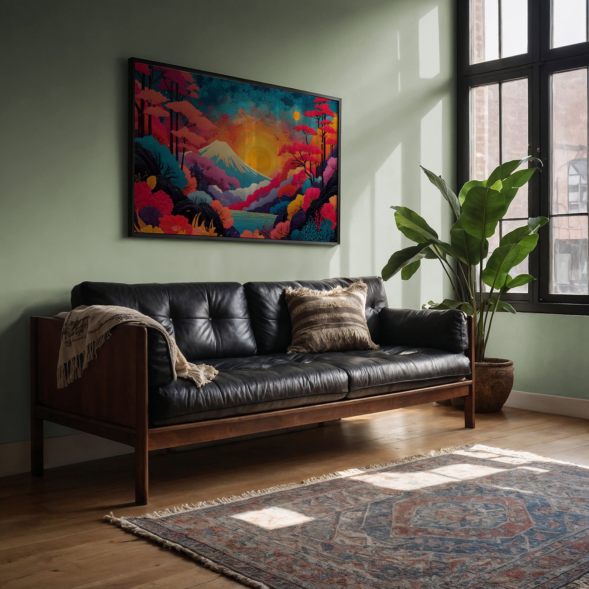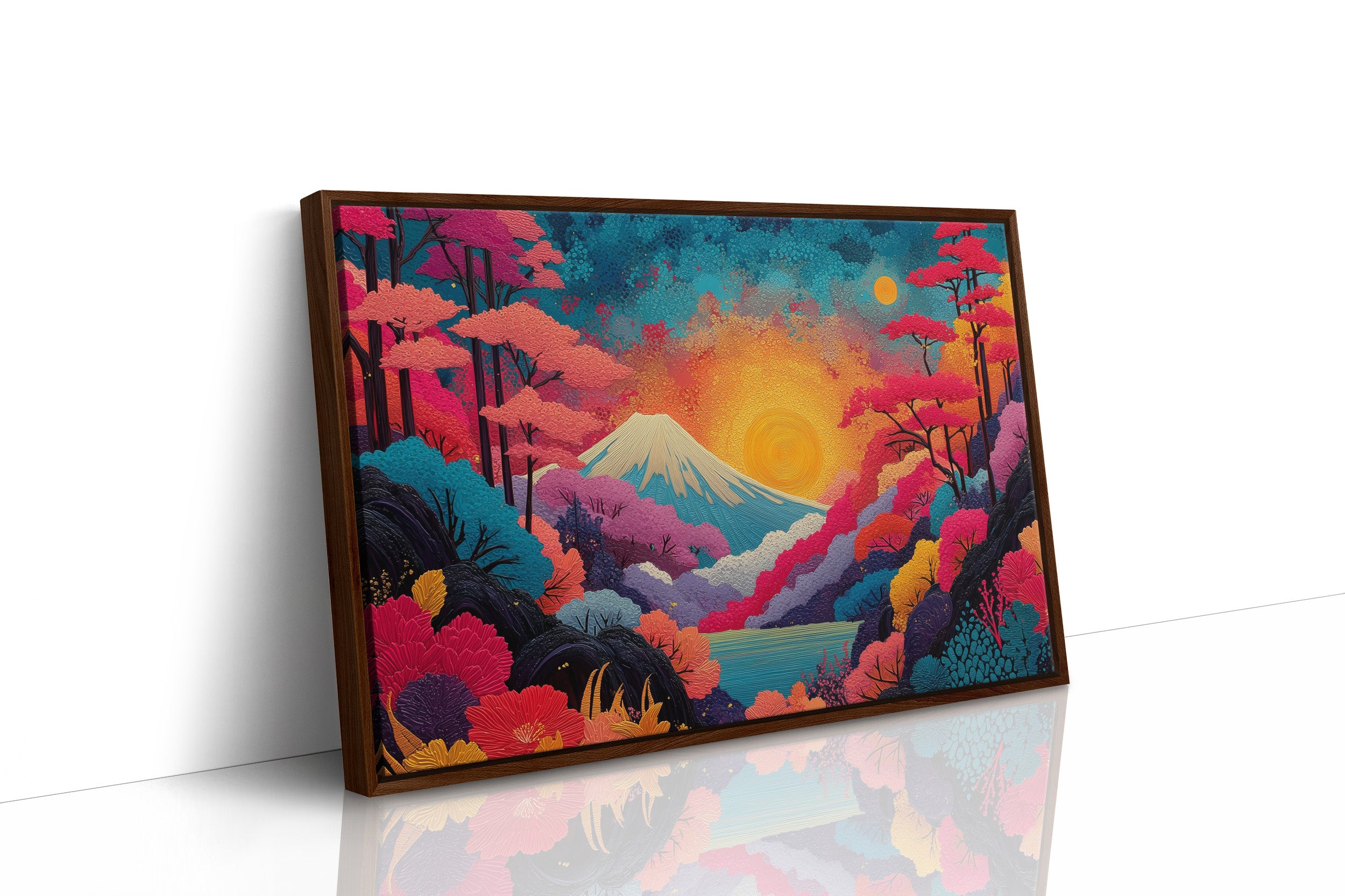 A kaleidoscope of vibrant coral, turquoise, and purple paints a dreamlike Japanese landscape, where Mount Fuji stands sentinel in mystical morning light. The scene pulses with energy as flowering trees and wild botanicals frame the sacred peak, their colors dancing between reality and fantasy in bold, contemporary strokes. A crystalline river winds through the valley, reflecting the golden sunrise while abstract shapes and organic forms create a modern interpretation of traditional Eastern artistry. This statement piece would transform a minimal modern living room or bring bold energy to a meditation space, where its dramatic colors can inspire contemplation and creativity.
