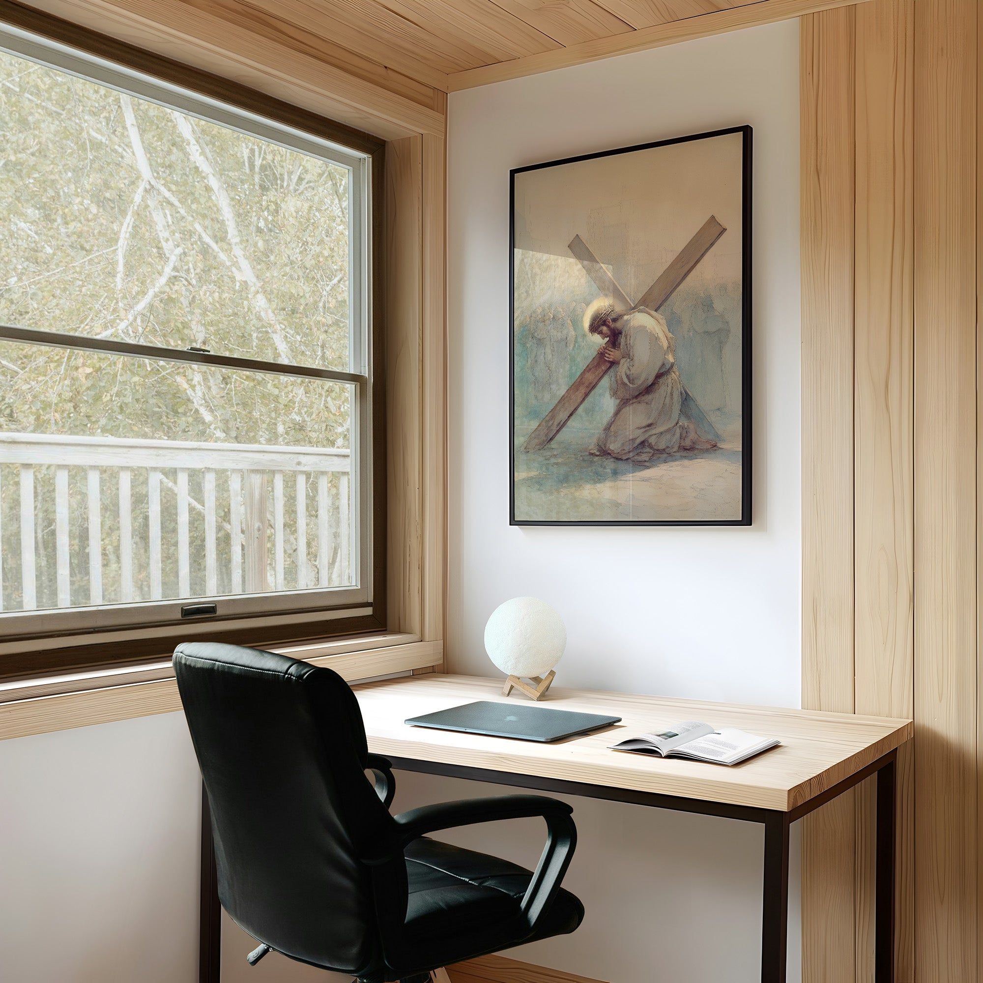 Soft morning light washes over a religious artwork resting on weathered wooden planks. The delicate painting portrays a solemn moment of devotion, rendered in gentle blues and whites against the warm, natural grain of the table. A small cup of coffee sits nearby, while greenery with touches of red frames the scene, creating a contemplative space where faith meets everyday life.