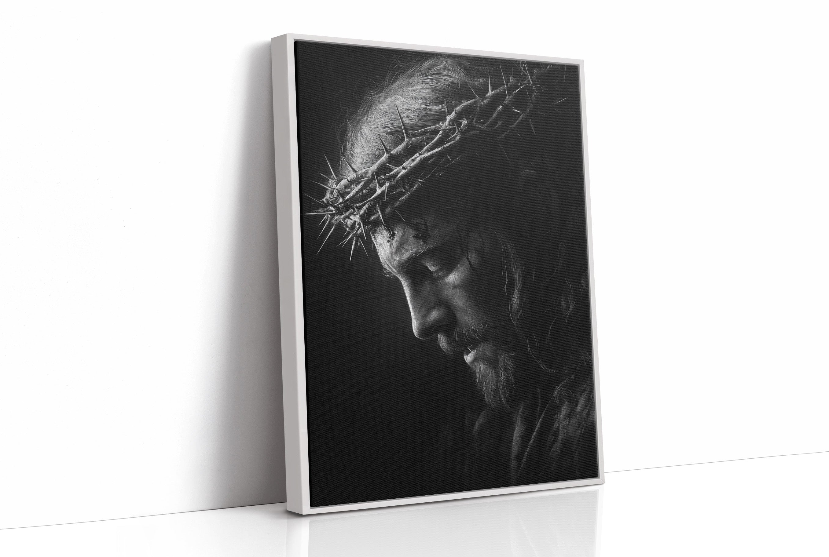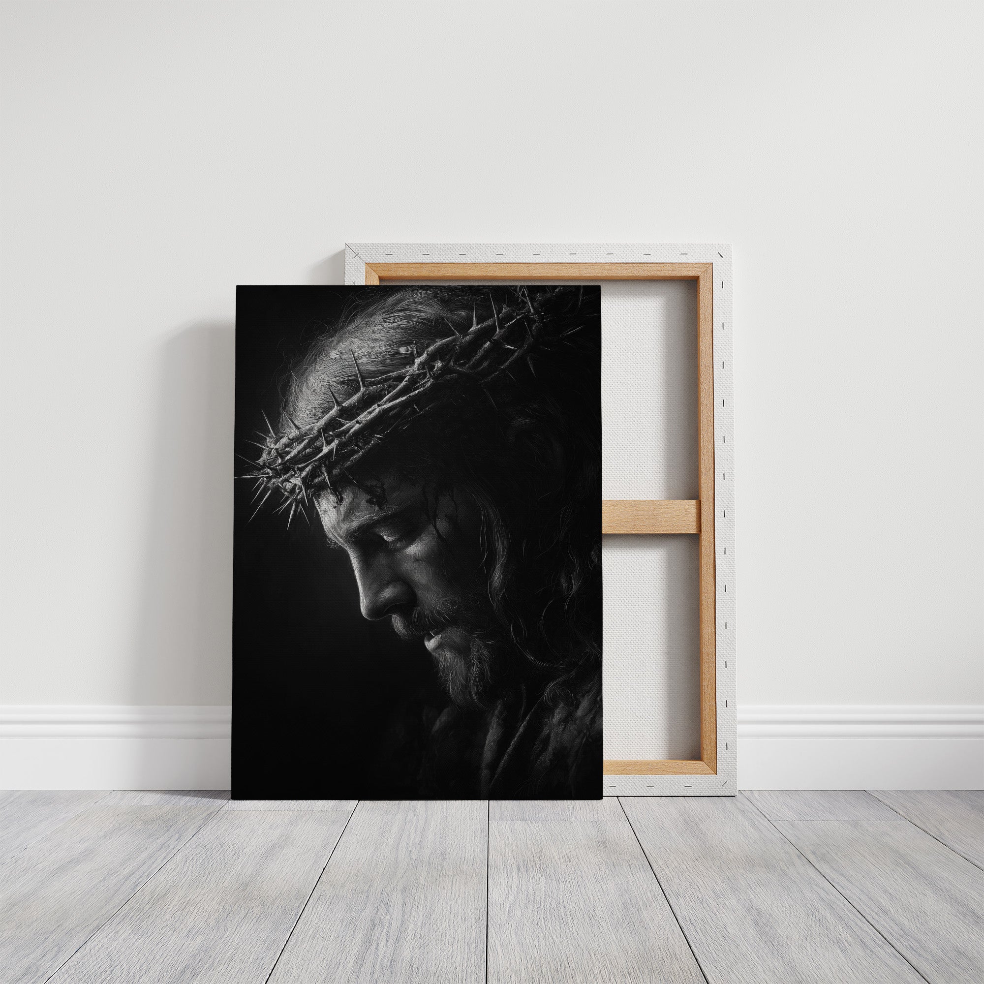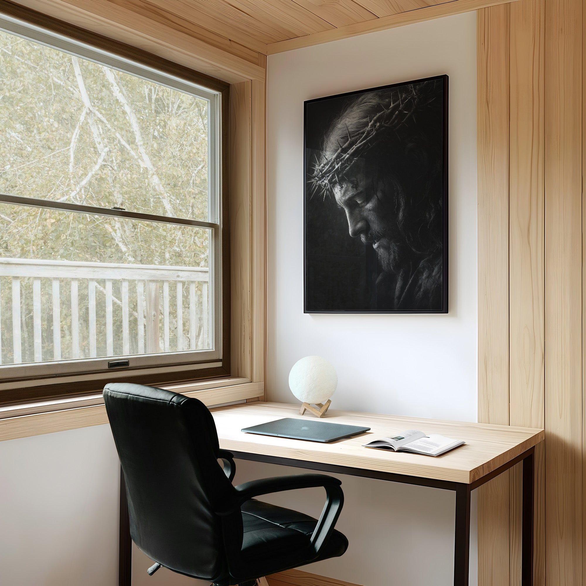 A moment of profound contemplation captured in striking monochrome. The stark contrast between light and shadow creates a haunting meditation on sacrifice and suffering, with each detail meticulously rendered against the darkness. The wooden table beneath offers warmth against the intensity of the image, creating a thoughtful juxtaposition between comfort and contemplation. This piece brings a sense of reverence to any meditation space, prayer room, or thoughtful corner of the home.