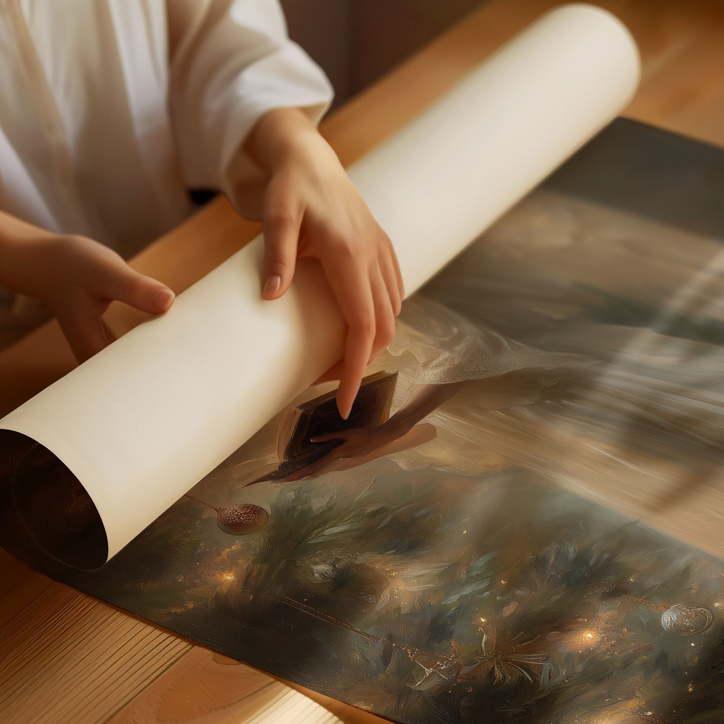 Soft golden light filters through a festive scene, where an ethereal figure reads from an ancient tome amidst floating sparkles of divine illumination. The image captures a moment of celestial serenity, framed by the warm glow of Christmas decorations and the shimmer of frost-dusted pine. A decorated tree stands sentinel nearby, its copper and pearl ornaments echoing the peaceful radiance, while pristinely wrapped presents rest beneath in quiet anticipation. This piece brings together the magical and sacred aspects of the holiday season. Perfect for creating a focal point in living spaces during the holiday season, this image adds a touch of divine grace to traditional Christmas décor. Its warm tones and peaceful composition make it especially suited for spaces where families gather to share their own sacred stories.