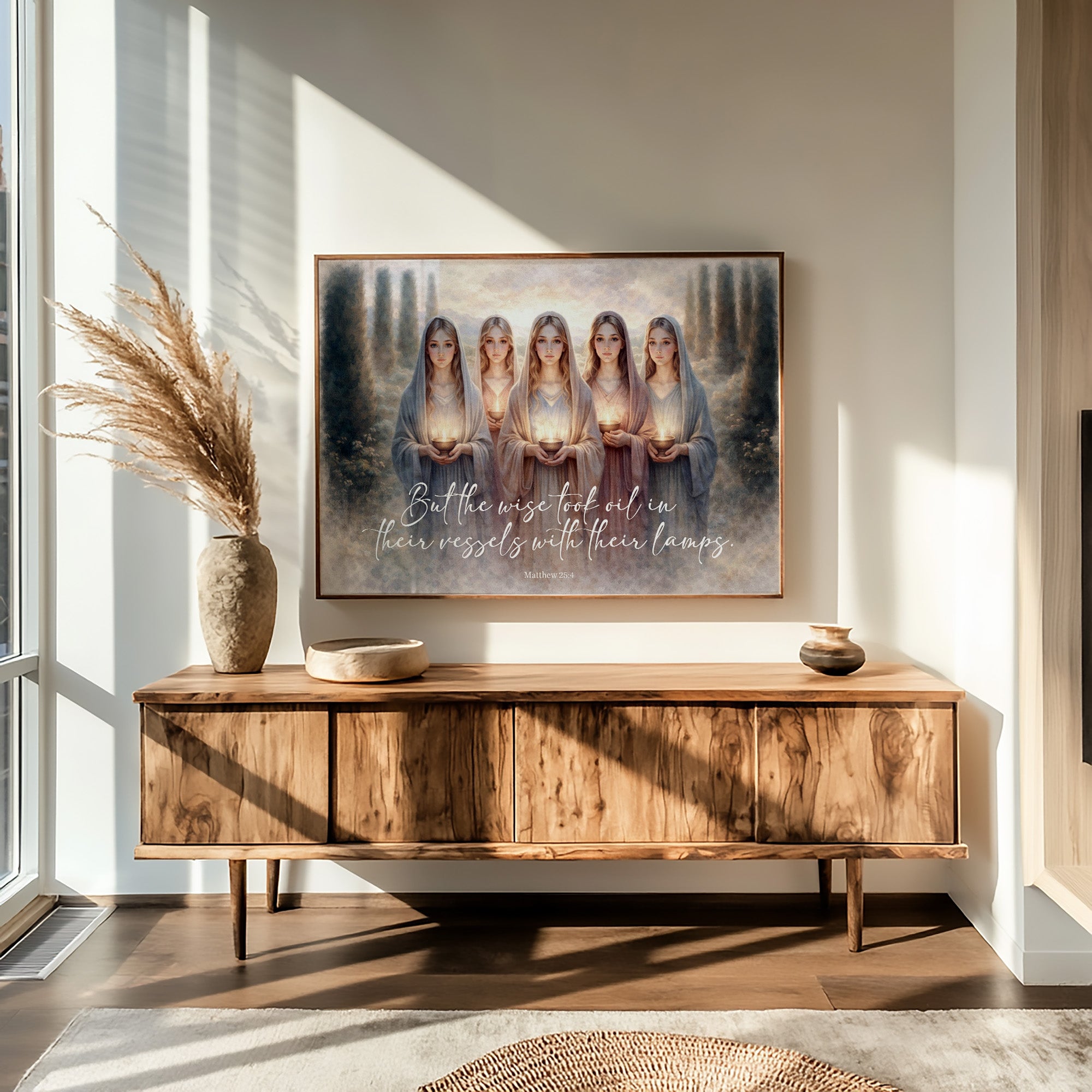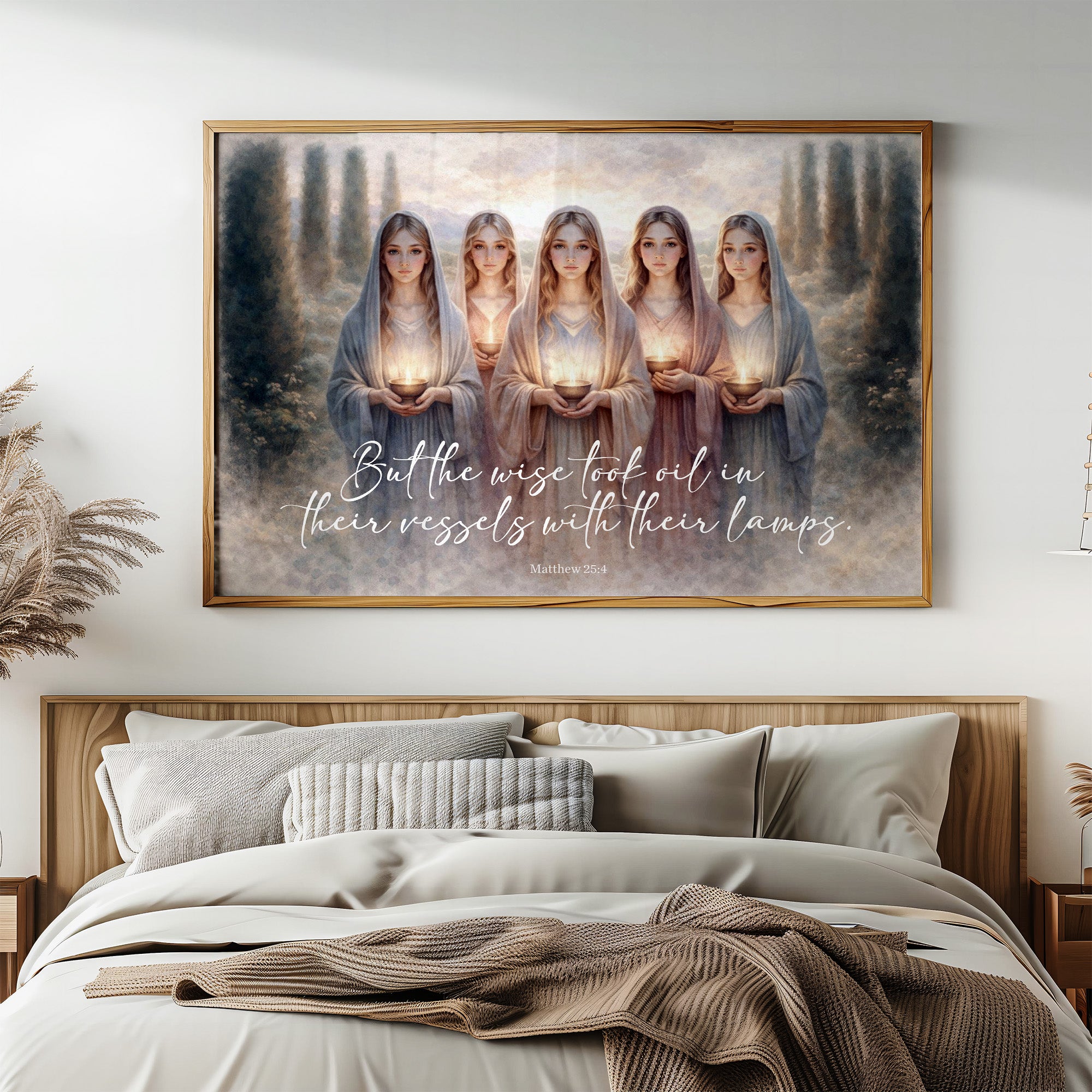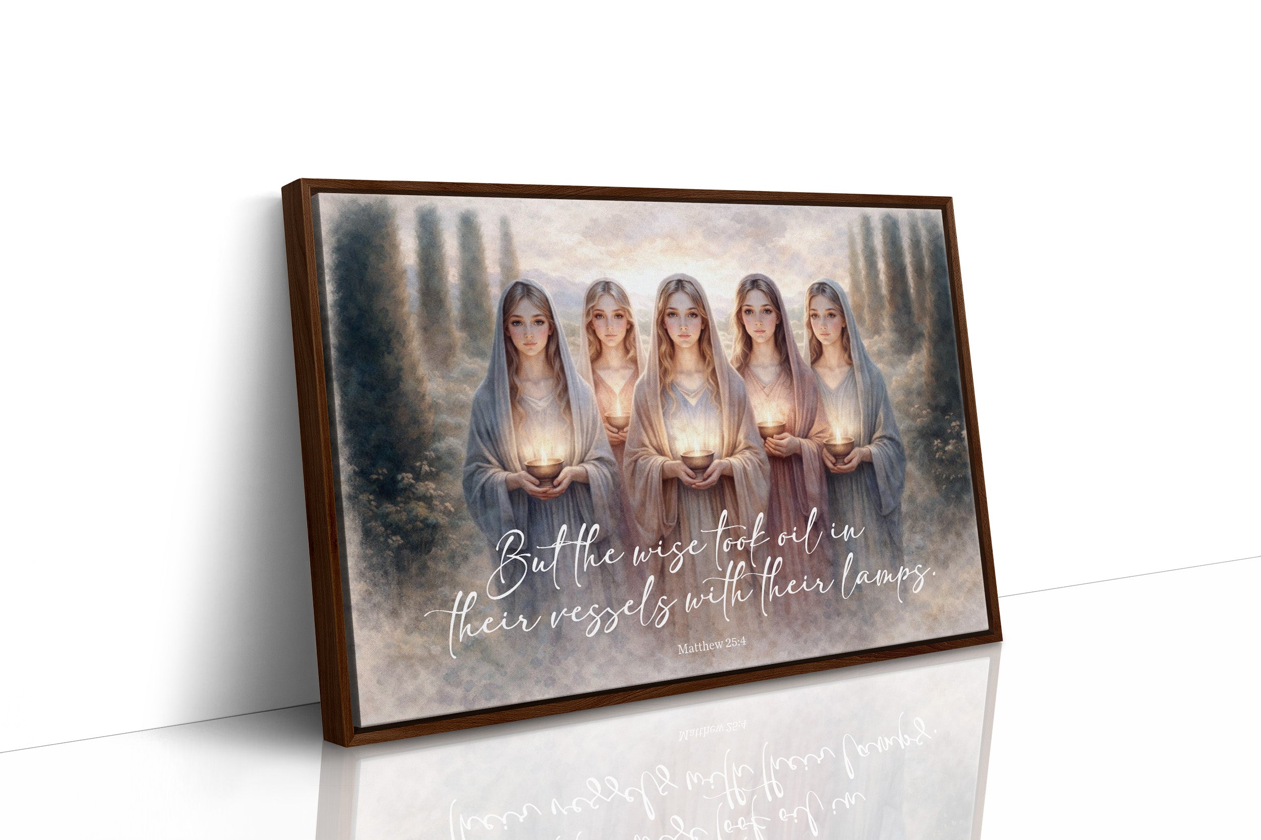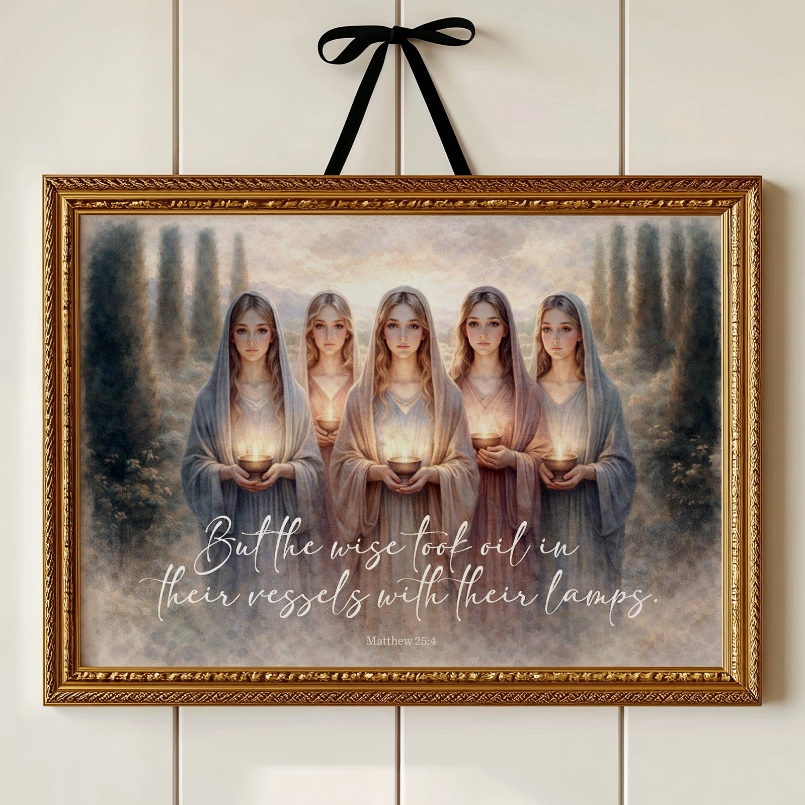 This ethereal artwork depicts five figures in flowing robes standing in a row, each holding a glowing lamp vessel. The painting illustrates the biblical parable of the wise virgins from Matthew 25:4, as indicated by the elegant script at the bottom. Set against a dreamy landscape with cypress-like trees framing the scene, the soft color palette of blues, creams, and golds creates a serene, mystical atmosphere. The golden light emanating from each vessel symbolizes spiritual preparedness and wisdom. The artwork blends contemporary artistic style with religious symbolism, creating a meditative representation of this timeless teaching.