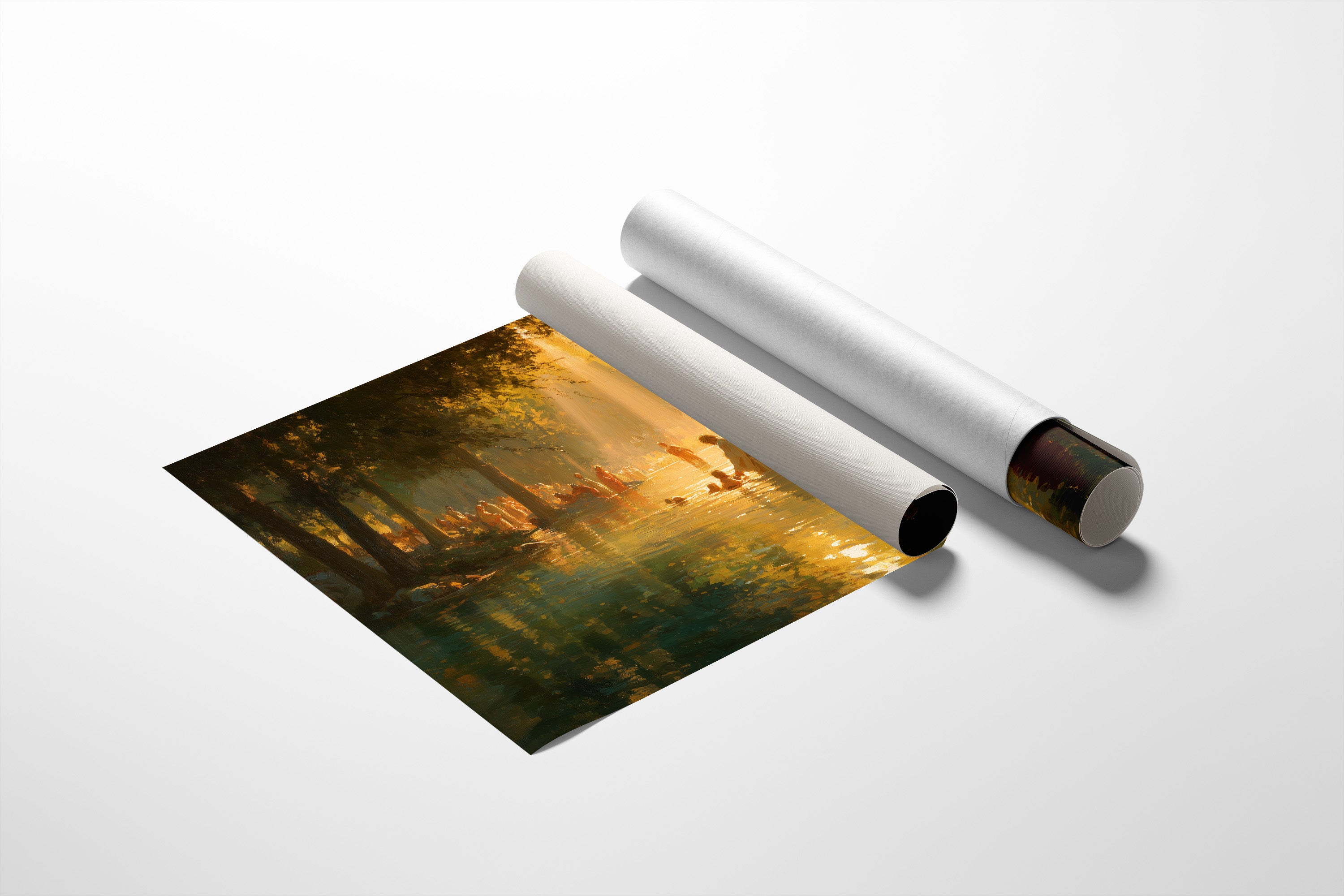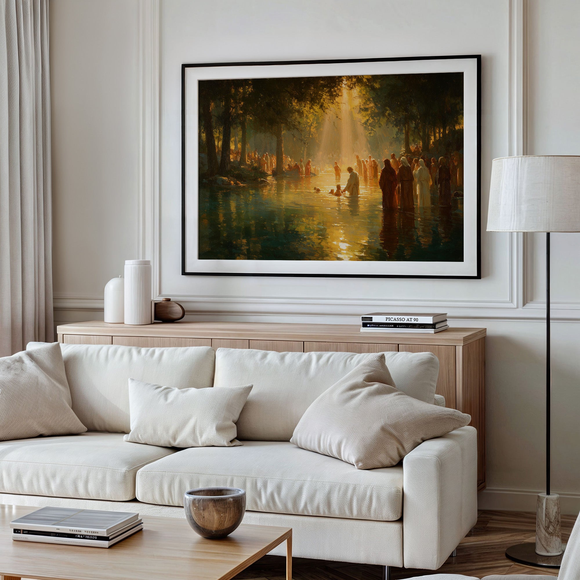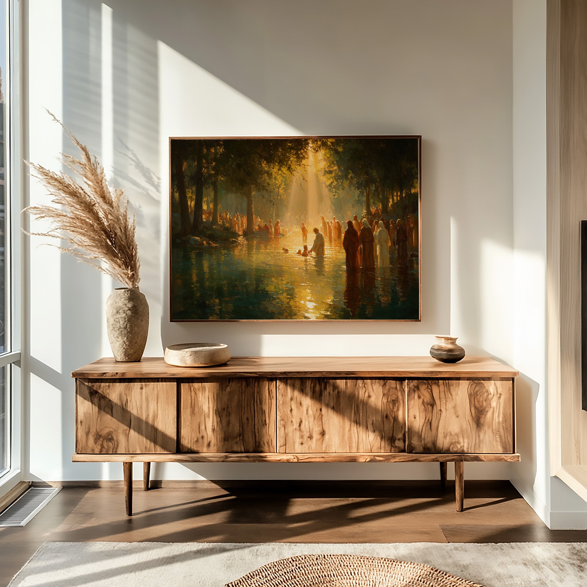 Golden rays pierce through forest canopy, illuminating figures gathered in reverent communion at the water's edge. The tranquil scene captures a moment of profound spiritual connection, where amber light transforms ordinary water into something sacred. The rich palette of emeralds, golds, and deep reds creates a tapestry of devotion against the serene backdrop of nature's cathedral. This contemplative piece brings a sense of peace and reverence to a reading nook, meditation space, or any room where quiet reflection is cherished.