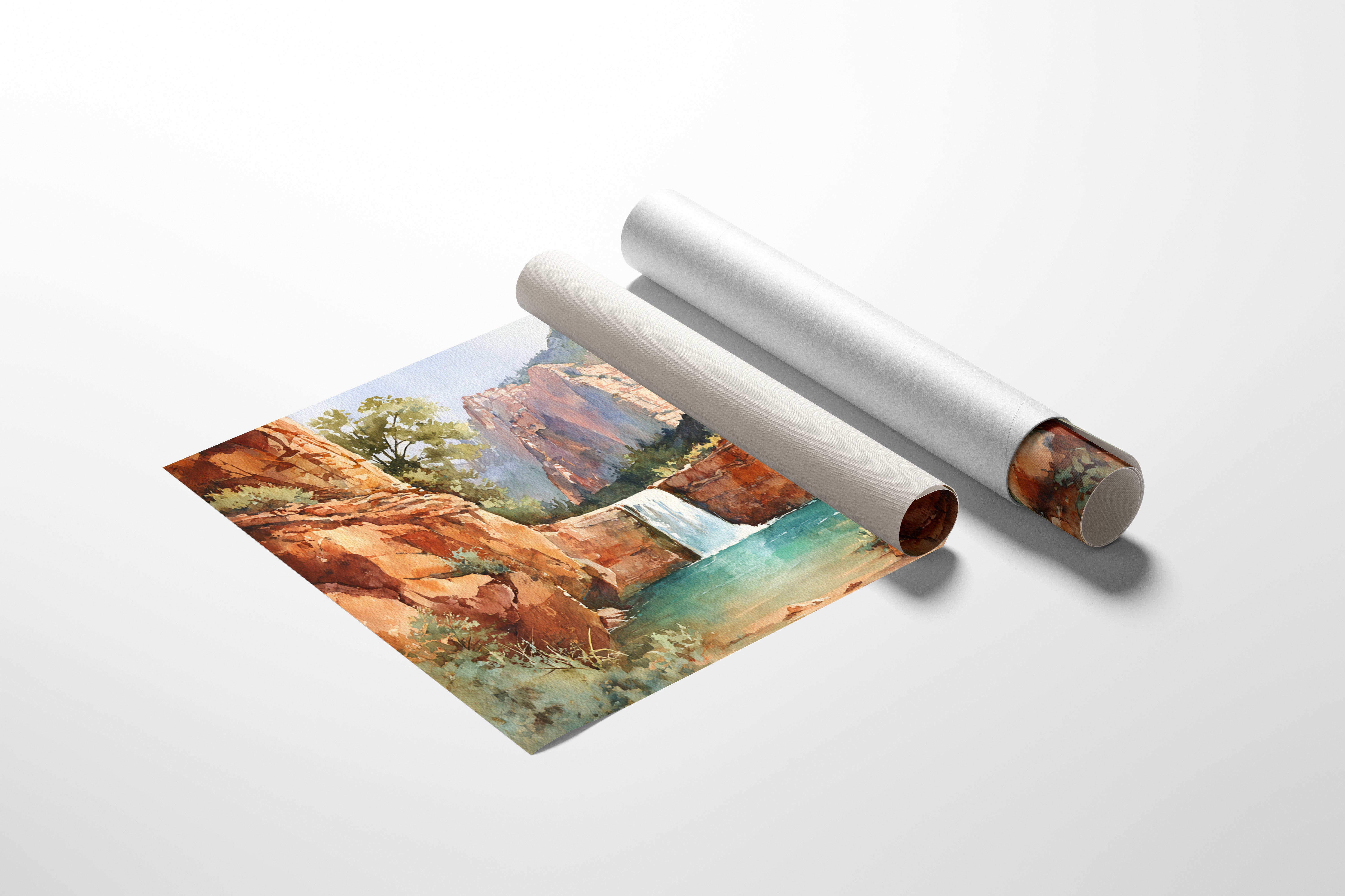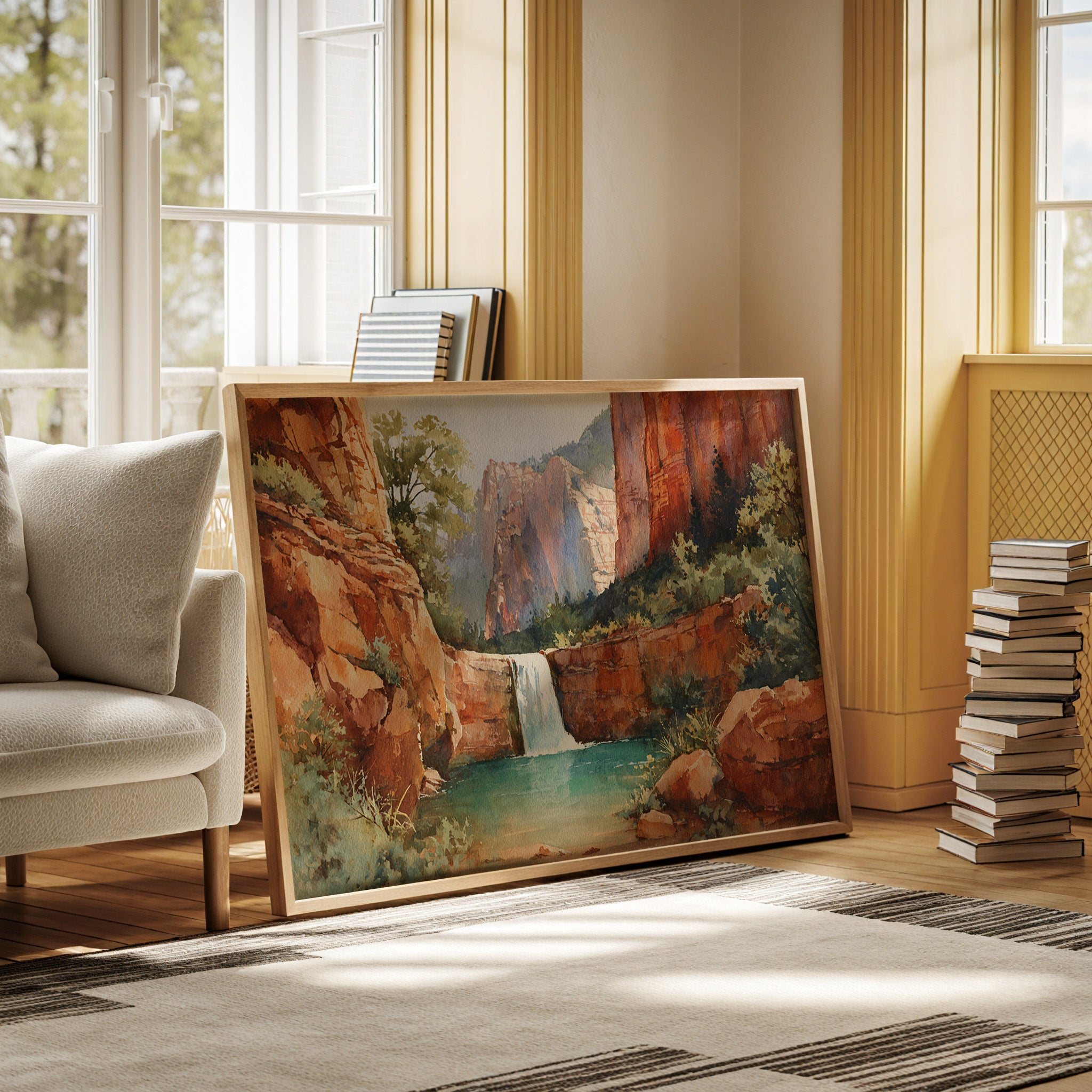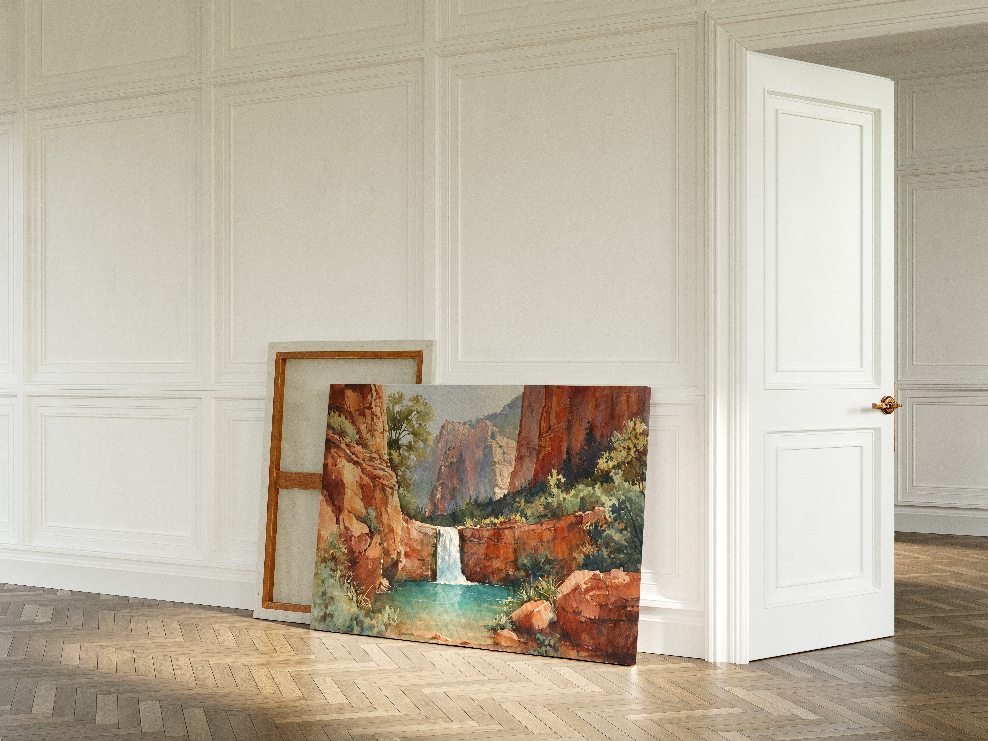 A hidden oasis reveals itself, where crystalline waters plunge from russet canyon walls into a turquoise pool below. The watercolor captures the dramatic interplay of warm sandstone cliffs against cool, mineral-rich waters, while scattered vegetation clings determinedly to rocky crevices. Sunlight filters through the narrow canyon, casting a warm glow on the striated cliff faces and creating a sanctuary of natural beauty. This scene would bring a sense of tranquil majesty to a study, living room, or meditation space, offering a window into one of nature's most serene moments.